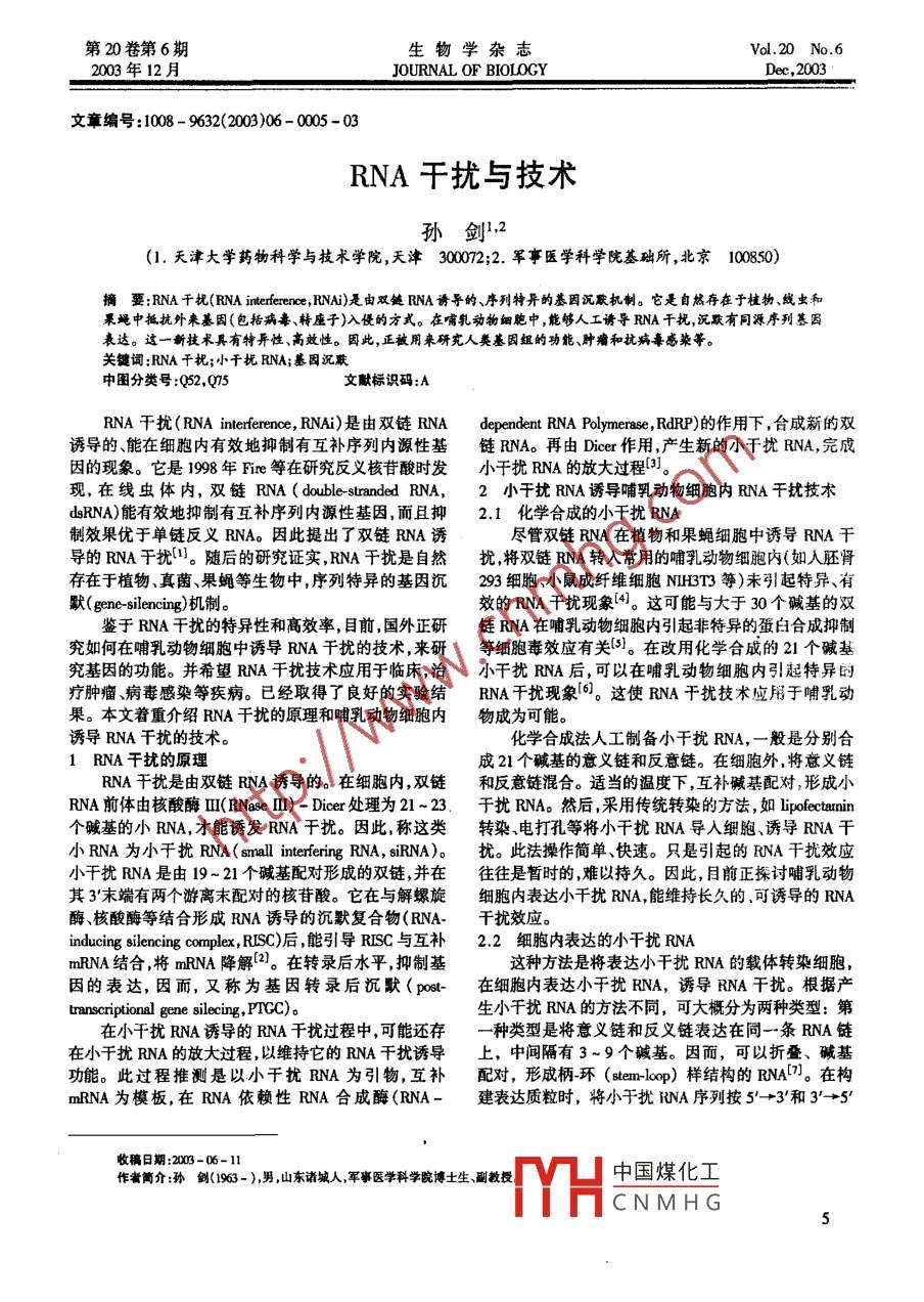 第20卷第6期生物學(xué)雜志Vol.20 No.62003年12月.JOURNAL OF BIOLOCYDe,2003文章編號:1008 - 9632(2003)06 - 0005 - 03RNA干擾與技術(shù)孫劍,2(1. 天津大學(xué)藥物科學(xué)與技術(shù)學(xué)院,天津 300072;2. 軍事醫(yī)學(xué)科學(xué)院基礎(chǔ)所,北京 100850)摘要:RNA 干擾(RNA iterference, RNAi)是由雙鏈RNA誘導(dǎo)的、序列特異的基因沉默機(jī)制。它是自然存在于植物、線蟲和.果蠅中抵抗外來基固(包括病毒、轉(zhuǎn)座子)入侵的方式。在哺乳動(dòng)物細(xì)胞中,能夠人工誘導(dǎo)RNA干擾,沉黷有同源序列基因表達(dá)。這一新技術(shù)具有特異性、高效性。因此,正被用來研究人類基固組的功能腫瘤和抗病毒感染等。關(guān)鍵詞;RNA干擾;小干擾RNA;基因沉默中圖分類號:Q52,Q75文默標(biāo)識(shí)碼:ARNA干擾( RNA interference, RNAi)是由雙鏈RNAdependent RNA Polymerase , RdRP)的作用下,合成新的雙誘導(dǎo)的能在細(xì)胞內(nèi)有效地抑制有互補(bǔ)序列內(nèi)源性基鏈RNA。再由Dicer 作用,產(chǎn)生新的小干擾RNA,完成因的現(xiàn)象。它是1998年Fire 等在研究反義核苷酸時(shí)發(fā)小干擾RNA的放大過程[3]。現(xiàn),在線蟲體內(nèi),雙鏈RNA ( double stranded RNA,2小干擾RNA誘導(dǎo)哺乳動(dòng)物細(xì)胞內(nèi)RNA干擾技術(shù)dsRNA)能有效地抻制有互補(bǔ)序列內(nèi)源性基因,而且抑2.1 化學(xué)合成的小干擾RNA制效果優(yōu)于單鏈反義RNA。因此提出了雙鏈RNA誘盡管雙鏈RNA在植物和果蠅細(xì)胞中誘導(dǎo)RNA干導(dǎo)的RNA干擾(。隨后的研究證實(shí),RNA干擾是自然擾將雙鏈RNA轉(zhuǎn)入常用的哺乳動(dòng)物細(xì)胞內(nèi)(如人胚腎存在于植物、真菌、果蠅等生物中,序列特異的基因沉293細(xì)胞、小鼠成纖維細(xì)胞NH3T3等)未引起特異、有默( gene-silencing)機(jī)制。效的RNA干擾現(xiàn)象[4]。這可能與大于30個(gè)堿基的雙鑒于RNA干擾的特異性和高效率,目前,國外正研鏈RNA在哺乳動(dòng)物細(xì)胞內(nèi)引起非特異的蛋白合成抑制究如何在哺乳動(dòng)物細(xì)胞中誘導(dǎo)RNA干擾的技術(shù),來研等細(xì)胞毒效應(yīng)有關(guān)[5]。在改用化學(xué)合成的21個(gè)堿基究基因的功能。并希望RNA干擾技術(shù)應(yīng)用于臨床,治小干擾RNA后,可以在哺乳動(dòng)物細(xì)胞內(nèi)引起特異的療腫瘤、病毒感染等疾病。已經(jīng)取得了良好的實(shí)驗(yàn)結(jié)RNA干擾現(xiàn)象06。這使RNA干擾技術(shù)應(yīng)用于哺乳動(dòng)果。本文著重介紹RNA千擾的原理和哺乳動(dòng)物細(xì)胞內(nèi)物成為可能。誘導(dǎo)RNA干擾的技術(shù)。化學(xué)合成法人工制備小干擾RNA,一般是分別合RNA干擾的原理成21個(gè)堿基的意義鏈和反意鏈。在細(xì)胞外,將意義鏈RNA干擾是由雙鏈RNA誘導(dǎo)的。在細(xì)胞內(nèi),雙鏈和反意鏈混合。適當(dāng)?shù)臏囟认?互補(bǔ)堿基配對形成小RNA前體由核酸酶II(RNase II) - Dicer處理為21 ~23干擾RNA。然后,采用傳統(tǒng)轉(zhuǎn)染的方法,如lipfectarnin個(gè)堿基的小RNA,才能誘發(fā)RNA干擾。因此,稱這類轉(zhuǎn)染、電打孔等將小干擾RNA導(dǎo)入細(xì)胞、誘導(dǎo)RNA干小RNA為小干擾RNA( smalll interfering RNA, siRNA)。擾。此法操作簡單、快速。只是引起的RNA干擾效應(yīng)小干擾RNA是由19~ 21個(gè)堿基配對形成的雙鏈,并在往往是暫時(shí)的,難以持久。因此,目前正探討哺乳動(dòng)物其3'末端有兩個(gè)游離末配對的核苷酸。它在與解螺旋細(xì)胞內(nèi)表達(dá)小干擾RNA,能維持長久的.可誘導(dǎo)的RNA酶、核酸酶等結(jié)合形成RNA誘導(dǎo)的沉默復(fù)合物(RNA-干擾效應(yīng)。inducing silencing complex, RISC)后,能引導(dǎo)RISC與互補(bǔ)2.2 細(xì)胞內(nèi)表達(dá)的小干擾RNAmRNA結(jié)合將mRNA降解[2]。在轉(zhuǎn)錄后水平,抑制基這種方法是將表達(dá)小干擾RNA的載體轉(zhuǎn)染細(xì)胞,因的表達(dá),因而,又稱為基因轉(zhuǎn)錄后沉默(pot-在細(xì)胞內(nèi)表達(dá)小干擾RNA,誘導(dǎo)RNA干擾。根據(jù)產(chǎn)transcriptional gene silecing, PTGC)。生小干擾RNA的方法不同,可大概分為兩種類型:第在小干擾RNA誘導(dǎo)的RNA干擾過程中,可能還存-種類型是將意義鏈和反義鏈表達(dá)在同一條RNA鏈在小千擾RNA的放大過程,以維持它的RNA干擾誘導(dǎo)上,中間隔有3~9個(gè)堿基。因而,可以折疊、堿基.功能。此過程推測是以小于擾RNA為引物,互補(bǔ)配對,形成柄=環(huán)(stem-loop) 樣結(jié)構(gòu)的RNA[7]。 在構(gòu)mRNA為模板,在RNA依賴性RNA合成酶(RNA-建表達(dá)質(zhì)粒時(shí),將小干擾RNA序列按5'→3'和3'→5'收稿日期:2003-06-11作者筒介:孫鍘(1963- ),男,山東諸城人,軍事醫(yī)學(xué)科學(xué)院博士生、副教授中國煤化工TYHCNMHG5第20卷第6期生物學(xué)雜志Vol.20 No.62003年12月JOURNAL OF BIOLOGYDec ,2003的方向插入質(zhì)粒。因此,轉(zhuǎn)錄的RNA產(chǎn)物是意義鏈-.過堿基互補(bǔ)形成雙鏈的小干擾RNA{8]。在構(gòu)建表達(dá)質(zhì)隔-反義鏈。第二種類型是將意義鏈和反義鏈表達(dá)在粒時(shí),意義鏈和反義鏈序列分別插人同一質(zhì)粒上的兩不同的RNA鏈。然后,在細(xì)胞內(nèi),意義鏈和反義鏈通個(gè)表達(dá)盒(圖1)。promoter_Antisense] C Sensc_C AmtisenseJ-5'一+ 3'3'←5']轉(zhuǎn)錄轉(zhuǎn)錄轉(zhuǎn)錄后堿基配對SenseAntisense堿基配對柄環(huán)樣RNA小千擾RNA圖1兩種在細(xì)胞內(nèi)表達(dá)小干擾 RNA的方法示意圄Figu