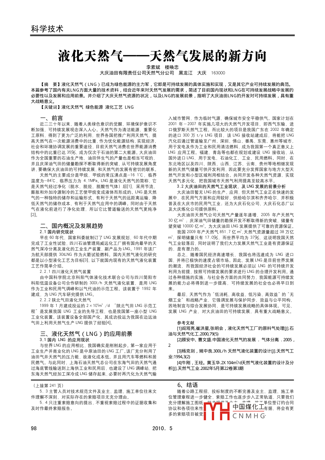 科學技術液化天然氣—天然氣發(fā)展的新方向李素斌樓喚忠大慶油田有限責任公司天然氣分公司黑龍江大慶163000【摘要】液化天然氣(LNG)已成為綠色能源的主力軍,它即是可持續(xù)發(fā)展的具體實施和實現(xiàn),又是其它產(chǎn)業(yè)可持續(xù)發(fā)展的典范。本篇參考了國內(nèi)有關LNG方面大量的技術資料,結(jié)合近年來對天然氣發(fā)展的需求,簡述了目前國內(nèi)現(xiàn)狀和LNG在可持續(xù)發(fā)展戰(zhàn)略中發(fā)展的必要性以及發(fā)展和應用前景。并介紹了大慶天然氣資源的狀況,以及LNG的發(fā)展前景,指明了大慶油田LNG的開發(fā)對可持續(xù)發(fā)展,具有重大戰(zhàn)略意義【關鍵詞】液化天然氣綠色能源液化工藝LNG前言入城市管網(wǎng),作為臨時氣源,確保城市安全平穩(wěn)供氣。國家計劃在近二三十年以來,隨著人類綠色意識的覺醒,環(huán)境保護意識不2001年-2007年實施幾項大的天然氣開發(fā)項目,即西氣東輸,進斷加強,可持續(xù)發(fā)展觀念深入人心。天然氣作為清潔能源,重要化口俄羅斯天然氣工程。而比較大的項目是我國廣東在2002年確定工原料,得到了更為廣泛的利用,世界各國把推廣利用天然氣,提的進口300萬t/γLNG項目,該LNG接收站建成后,將能把LNG高天然氣在一次能源消費中的比重,作為優(yōu)化能源結(jié)構(gòu),實現(xiàn)經(jīng)濟、汽化后通過管道輸至廣州、深圳、佛山、番禺、東莞、惠州等城市社會和環(huán)境協(xié)調(diào)發(fā)展的重要途徑。目前天然氣消費在世界能源消費用于發(fā)電及作為工業(yè)和民用清潔燃料.成為我國第一個真正意義上結(jié)構(gòu)中的比重已達35%,成為僅次于石油的第二大能源。大慶油田NG應用工程。福建、青島等也都在規(guī)劃或建設LNG接收站,從作為全國重要的石油生產(chǎn)地,油田伴生氣的產(chǎn)量也是相當可觀的國外進口LNG,用于發(fā)電、石油化工、工業(yè)、民用燃料。同時,在并且慶深油氣田的儲量勘探不斷取得新的突破,從可持續(xù)發(fā)展角度東北地區(qū)以及四川、陜西,山西,江蘇、云南、貴州等地相繼發(fā)現(xiàn)講要確保大慶油田的可持續(xù)發(fā)展,和天然氣的發(fā)展有密切的聯(lián)系新的天然氣儲量可供開發(fā)利用,因此要充分發(fā)揮國家與地方大型天天然氣的主要成分是甲烷,甲烷的常壓沸點是-161℃,臨界然氣開發(fā)和小型區(qū)域利用相結(jié)合。共同開發(fā)各種天然氣資源,實現(xiàn)度為-84C,臨界壓力為4.1MPa是液化天然氣的簡稱,它天然氣多元化,把我國城市天然氣利用提高至較高水平是天然氣經(jīng)過凈化(脫水,脫烴性氣體〉后[1].采用節(jié)流3.2大慶油田的天然氣工業(yè)現(xiàn)狀,及LNG發(fā)展的前景分析膨脹和外加冷源制冷的工藝使甲烷變成液體而形成的。LNG是天然大慶油田暫無LNG的生產(chǎn)、應用,但天然氣工業(yè)正在快速的發(fā)氣的一種獨特的儲存和運輸形式,有利于天然氣的遠距離運輸、降展中,在民用氣方面和應用較好,供給哈爾濱和齊齊哈爾,并積極低天然氣的儲存成本、有利于天然氣應用中的調(diào)峰。同時由于天然普及在大慶市的民用氣工業(yè):還為大慶石化公司、大慶石化總廠以氣在液化前進行了凈化處理,所以它比管道輸送的天然氣更純凈及大慶煉化公司提供原料。大慶油田天然氣公司天然氣產(chǎn)量逐年遞增,2005年產(chǎn)天然氣30億m;慶深油氣田儲量的勘探開發(fā)不斷取得新的突破,儲量有二、國內(nèi)概況及發(fā)展趨勢望突破1000億m3。為大慶油田LNG發(fā)展提供了可靠的資源保證。2.1國內(nèi)研究現(xiàn)狀我國2009年產(chǎn)天然氣851.7億m,天然氣資源量超過38萬億早在60年代,國家科委就制訂了LNG發(fā)展規(guī)劃,60年代中期m,探明儲量只有17.0%,而世界平均為37%,這說明我國天然完成了工業(yè)性試驗,四川石油管理局威遠化工廠擁有國內(nèi)最早的天氣工業(yè)較落后,同時說明了我們大力發(fā)展天然氣工業(yè)是有資源保證然氣深冷分離及液化的工業(yè)生產(chǎn)裝置.副產(chǎn)品為LNG。1991年該廠的,是有潛力的為航天部提供30LNG作為火箭試驗燃料。國內(nèi)天然氣液化的研究總之,隨著國民經(jīng)濟高速增長,我國也將迅速成為LNG進口都是以小型液化工藝為目標3].以下就國內(nèi)現(xiàn)有的天然氣液化裝置國,并將已極快的速度占領市場。因此,發(fā)展LNG是目前世界發(fā)展工藝作簡單介的潮流,而我國經(jīng)濟社會的可持續(xù)發(fā)展必須以LNG的可持續(xù)開發(fā)2.2.1四川液化天然氣裝置利用為前提,按照可持續(xù)發(fā)展的要求進行LNG的合理開發(fā)利用。通知的由中國科學院北京科陽氣體液化技術聯(lián)合公司與四川簡陽市過各種措施的實施,與社會各方面的共同努力我國能源可持續(xù)發(fā)1低溫設備公司合作研制的300h天然氣液化裝置,是用LNG展的能力必將得到進一步提高,可持續(xù)發(fā)展的社會也必將早作為工業(yè)和民用氣調(diào)峰和以氣代油的示范工程。該裝置于1992年來建成,為LNG汽車研究提供LNG最后。天然氣作為“低消耗、高收益,低污染,高效益”的“無2.2.2陜北氣田液化天然氣煙工業(yè)”和戰(zhàn)略產(chǎn)業(yè),它強調(diào)發(fā)展與保護同步、效益與公平同構(gòu)99年1月建成投運的2×10m/d“陜北氣田LNG示范工因地制宜與綜合發(fā)展協(xi