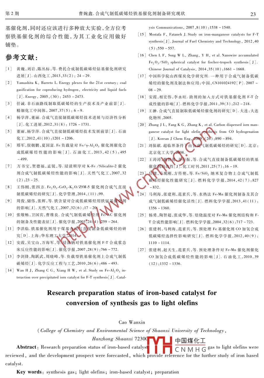 第30卷第2期合成技術(shù)及應(yīng)用Vol 30 No. 22015年6月SYNTHETIC TECHNOLOGY AND APPLICATIONJun.2015專題誰論述合成氣制低碳烯烴鐵基催化劑制備研究現(xiàn)狀曹婉鑫(陜西理工學(xué)院化學(xué)與環(huán)境科學(xué)學(xué)院,陜西漢中723000)摘要:論述了合成氣制低碳烯烴鐵基催化劑的研究現(xiàn)狀,并對(duì)未來的發(fā)展前景進(jìn)行展望,以期為鐵基催化劑的進(jìn)一步研究提供參考。關(guān)鍵詞:合成氣低碳烯烴鐵基催化劑制備中圖分類號(hào):TQ2l1文獻(xiàn)標(biāo)識(shí)碼:A文章編號(hào):1006-334X(2015)024002004乙烯、丙烯等低碳烯烴是衡量一個(gè)國(guó)家化學(xué)工體的選擇對(duì)催化劑的各項(xiàng)性能也有重要的影響。目業(yè)發(fā)展水平的重要指標(biāo),還是合成其他有機(jī)化工產(chǎn)前報(bào)道的鐵基催化劑的制備方法包括傳統(tǒng)的浸漬品的關(guān)鍵中間體。隨著國(guó)民經(jīng)濟(jì)的增長(zhǎng),低碳烯烴法、共沉淀法、溶膠-凝膠法和一些新型的催化劑制的需求量越來越大,通過石油化工生產(chǎn)低碳烯烴逐備技術(shù)。漸出現(xiàn)供求矛盾。煤、天然氣或生物質(zhì)(纖維素、半1浸漬法纖維素、木質(zhì)素等)經(jīng)過化學(xué)反應(yīng)生成的合成氣(CO浸漬法是用浸泡的方法將鐵鹽吸附到載體中和H2)是非石油路線制備低碳烯烴的可行途徑。合待浸泡完全或達(dá)到平衡后除去剩余溶液,再經(jīng)過干成氣制備低碳烯烴,具有工藝路線短、設(shè)備投資少、燥、煅燒、活化等一系列后處理即得催化劑,制備工資源利用率高等特點(diǎn),引起了高度的關(guān)注-4。低藝簡(jiǎn)單成本低廉,因此是最常用的催化劑制備方碳烯烴主要依靠石油裂解產(chǎn)生,在世界石油能源緊法。邢軍等°采用浸漬法制備了不同F(xiàn)e負(fù)載量的張的局勢(shì)下,大力開發(fā)以合成氣為原料制備低碳烯Fe/y-A2O3催化劑,在285℃、2.5MPa、氣態(tài)空速烴具有重要的戰(zhàn)略意義。4000h、n(H2):n(CO)=2的條件下,隨Fe負(fù)載合成氣制低碳烯烴具有較好的原料供應(yīng)保障,量的增加,Fe/γ-Al2O3催化劑的CO加氫活性先增與傳統(tǒng)蒸汽裂解和經(jīng)甲醇制烯烴工藝相比,具有原加后降低,在Fe負(fù)載量(質(zhì)量含量)為16%時(shí)活性料價(jià)格便宜的優(yōu)勢(shì),并副產(chǎn)高價(jià)值油品,在經(jīng)濟(jì)性上最高具有較強(qiáng)的競(jìng)爭(zhēng)力。費(fèi)托( Fischer-Tropsch)合成催化劑制備過程中助劑和活性成分的浸漬順序法是合成氣制備低碳烯烴的主要方法,但存在產(chǎn)物對(duì)催化劑的性能也有一定的影響。研究表明,K和分布較寬、選擇性低、原料CO易分解等問題,給低Fe元素在 Silicalite2載體上的浸漬順序的不同會(huì)給碳烯烴的制備帶來了困擾。合適的催化劑可以提高催化劑的氫還原性能以及表面酸堿性帶來差異。低碳烯烴生成率,是影響低碳烯烴得率的主要因素。CO加氫評(píng)價(jià)實(shí)驗(yàn)發(fā)現(xiàn),先在 Silicalite-2上浸漬上K鐵基催化劑的使用效果及經(jīng)濟(jì)性較好,是目前較常助劑然后再浸漬Fe,相對(duì)其它的浸漬順序更有利于用的合成氣制低碳烯烴催化劑。制備過程中載體及降低催化劑表面的酸性,從而提高反應(yīng)產(chǎn)物中低碳助劑的加入能更好的提高鐵基催化劑的穩(wěn)定性及選烯烴的選擇性。以鐵鈰的氧化物為活性組分,擇性,制備好的催化劑在使用前還需進(jìn)一步活化來K2O為助劑,ZSM5分子篩為載體,用浸漬法制備的提高催化劑的性能。隨著合成氣制低碳烯烴技術(shù)的鐵基負(fù)載型催化劑在微反-色譜裝置中對(duì)合成氣直成熟,鐵基催化劑的制備也面臨著更多的挑戰(zhàn)。接中國(guó)煤化工56.6%81。以MgO作CNMHG同F(xiàn)e含量的FeMn/1鐵基催化劑的制備為軾MgO催化劑的比表面積對(duì)反應(yīng)活性有重要影響。鐵基催化劑的成功制備是其在合成氣制低碳烯隨著Fe含量增加,FeMn間相互作用增強(qiáng),形成了難烴中達(dá)到良好應(yīng)用效果的關(guān)鍵步驟,采用不同方法收稿日期:2015-03-17制備的鐵基催化劑催化效果也有所不同,助劑及載作者簡(jiǎn)介:曹婉鑫(194),女,陜西渭南人,化工專業(yè)本科在讀第2期曹婉鑫.合成氣制低碳烯烴鐵基催化劑制備研究現(xiàn)狀于還原的FeMn固溶體,當(dāng)鐵負(fù)載量為9%時(shí),催化化劑為原料,用改進(jìn)的有機(jī)胺蒸氣相傳輸轉(zhuǎn)化法,得劑的活性和低碳烯烴選擇性最佳到了負(fù)載高分散鐵的交織氧化硅納米線球體催化劑超聲波輔助浸漬法制備的鐵基催化劑在空速(NW-FS),并用于費(fèi)托合成反應(yīng)。在所制納米線催600h,壓力1.5MPa和溫度320℃條件下,CO轉(zhuǎn)化劑中,原料催化劑中氧化硅在氧化鐵誘導(dǎo)下成功化率可達(dá)97.4%,C2~C4選擇性可達(dá)68.0%,烯烴地轉(zhuǎn)變成納米線交織微球載體,而氧化鐵組分則高的選擇性較單獨(dú)使用浸漬法制備的催化劑提高了度分散在氧化硅納米線上。在費(fèi)托合成中,納米線10%左右。電子型助劑K的加入能降低鐵的電子鐵硅催化劑由于其特殊的堆積結(jié)構(gòu)所導(dǎo)致的較低的親和能,還可大大抑制低碳烯烴的烷基化,從而提高擴(kuò)散阻力和高的鐵活性組分分散度,提髙了低碳烯催化劑的活性和選擇性。浸漬法制備的Fe-Mn/烴尤其是乙烯的選擇性。SiO2催化劑隨著錳含量的增加氧化鐵晶粒尺寸迅沉淀劑的