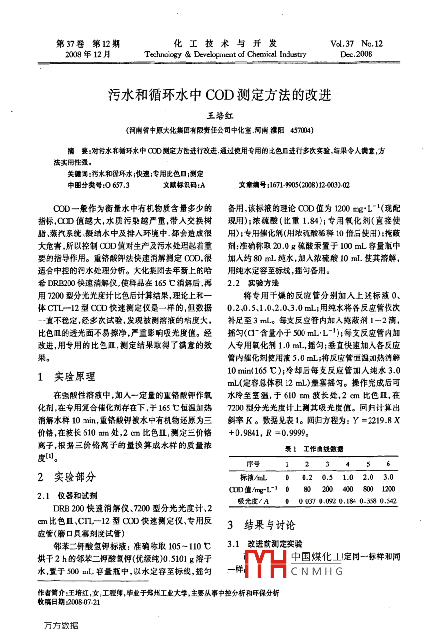 第37卷第12期化工技術(shù)與開(kāi)發(fā)vol 37 No 122008年12月Technology Development of Chemical IndustryDec.2008污水和循環(huán)水中COD測(cè)定方法的改進(jìn)王培紅(河南省中原大化集團(tuán)有限責(zé)任公司中化室河南濮陽(yáng)457004)摘要:對(duì)污水和循環(huán)水中QOD測(cè)定方法進(jìn)行改進(jìn)通過(guò)使用專用的比色皿進(jìn)行多次實(shí)驗(yàn),結(jié)果令人滿意方法實(shí)用性強(qiáng)。關(guān)鍵詞:污水和循環(huán)水;快速;專用比色皿;測(cè)定中圖分類號(hào):06573文獻(xiàn)標(biāo)識(shí)碼:A文章編號(hào):1671-9905(2008)12003002COD一般作為衡量水中有機(jī)物質(zhì)含量多少的備用,該標(biāo)液的理論OOD值為1200mgL-(現(xiàn)配指標(biāo),OOD值越大,水質(zhì)污染越嚴(yán)重,帶入交換樹(shù)現(xiàn)用);濃硫酸(比重1.84);專用氧化劑(直接使脂、燕汽系統(tǒng)、凝結(jié)水中及排入環(huán)境中,都會(huì)造成很用);專用催化劑(用濃硫酸稀釋10倍后使用);掩蔽大危害,所以控制OOD值對(duì)生產(chǎn)及污水處理起著重劑:準(zhǔn)確稱取20.0g硫酸汞置于100mL容量瓶中要的指導(dǎo)作用。重鉻酸鉀法快速消解測(cè)定OOD,很加入約80mL純水,加入濃硫酸10mL使其溶解適合中控的污水處理分析。大化集團(tuán)去年新上的哈用純水定容至標(biāo)線搖勻備用。希DRB00快速消解儀,使樣品在165℃消解后,再22實(shí)驗(yàn)方法用7200型分光光度計(jì)比色后計(jì)算結(jié)果,理論上和一將專用干燥的反應(yīng)管分別加入上述標(biāo)液0、體CTL-12型OOD快速測(cè)定儀是一樣的,但數(shù)據(jù)020.5、1.0、2030mL;用純水將各反應(yīng)管依次直不穩(wěn)定,經(jīng)多次試驗(yàn),發(fā)現(xiàn)被測(cè)溶液的粘度大,補(bǔ)足至3mL。每支反應(yīng)管內(nèi)加入掩蔽劑1~2滴比色皿的透光面不易擦凈嚴(yán)重影響吸光度值。經(jīng)搖勻(Q含量小于500mLL-1);每支反應(yīng)管內(nèi)加改進(jìn),用專用的比色皿,測(cè)定結(jié)果取得了滿意的效專用氧化劑10mL,搖勻;垂直快速加入各反應(yīng)果管內(nèi)催化劑使用液50mL;將反應(yīng)管恒溫加熱消解1實(shí)驗(yàn)原理10min(165℃);冷卻后每支反應(yīng)管加入純水30mL(定容總體積12mL)蓋塞搖勻。操作完成后可在強(qiáng)酸性溶液中,加入一定量的重鉻酸鉀作氧水冷至室溫,于610mm波長(zhǎng)處,2cm比色皿,在化劑,在專用復(fù)合催化劑存在下,于165℃恒溫加熱7200型分光光度計(jì)上測(cè)其吸光度值?;貧w計(jì)算出消解水樣10min,重鉻酸鉀被水中有機(jī)物還原為三斜率K。數(shù)據(jù)見(jiàn)表1?;貧w方程為:Y=22198X價(jià)鉻,在波長(zhǎng)610m處,2cm比色皿,測(cè)定三價(jià)鉻+0.9841,R=0.999離子,根據(jù)三價(jià)鉻離子的量換算成水樣的質(zhì)量濃表1工作曲線數(shù)據(jù)度1序號(hào)2實(shí)驗(yàn)部分標(biāo)液/mL00.20.51.02.0302.1儀器和試劑OOD值/mngL10802004008001200吸光度/A00.0370.0920.1840.3580.542DRB200快速消解儀、7200型分光光度計(jì)、2cm比色皿CIL-12型00快速測(cè)定儀專用反3結(jié)果與討論應(yīng)管(磨口具塞刻度試管)鄰苯二鉀酸氫鉀標(biāo)液:準(zhǔn)確稱取105-110℃3.1改進(jìn)前測(cè)定實(shí)驗(yàn)烘干2h的鄰苯二鉀酸氫鉀(優(yōu)級(jí)純)0.5101g溶于中國(guó)煤化工定同一標(biāo)樣和同水,置于500mL容量瓶中,以水定容至標(biāo)線,搖勻CNMHG作者簡(jiǎn)介:王培紅,女,工程師畢業(yè)于鄭州工業(yè)大學(xué),主要從事中控分析和環(huán)保分析收稿日期:20080721第12期王培紅等:污水和循環(huán)水中OOD測(cè)定方法的改進(jìn)表2改進(jìn)前測(cè)定結(jié)果高銅A同一樣品次數(shù)12豪3改進(jìn)后測(cè)定結(jié)果標(biāo)樣吸光度A0.1860.22302050.184倒入同一樣品次數(shù)1同一樣品吸光度A0.3010.2830.3000.311同一標(biāo)樣吸光度A0.1890.18901880.189總之,重新倒入一次樣品或取出比色皿重擦透同一樣品吸光度A0.30500.3050.304光面一次,測(cè)定值總會(huì)有變化造成了數(shù)據(jù)的精密度33對(duì)照實(shí)驗(yàn)結(jié)果極差。對(duì)照實(shí)驗(yàn)結(jié)果見(jiàn)表4。3.2改進(jìn)后測(cè)定實(shí)驗(yàn)衰4經(jīng)多次實(shí)驗(yàn)考慮到溶液粘度大置換時(shí)會(huì)粘在序號(hào)比色皿的透光面上洗瓶洗凈外側(cè)也無(wú)濟(jì)于事數(shù)據(jù)C1型0快速測(cè)40.28310.520.5依樣不穩(wěn)定,最后發(fā)現(xiàn)將一組比色皿洗凈,編上號(hào)DRB00快速消解用蒸餾水測(cè)出其皿差值然后將這組專用的比色皿后7200分光光度40386.7108.8213.2控干或用吹風(fēng)機(jī)吹干,再將與上面濃度一樣的標(biāo)樣和樣品,小心地倒入備好的2cm比色皿中,切記不由表4可知,4種不同濃度的樣品,用改進(jìn)后的用置換,所以透光面也不受污染,放入分光光度計(jì)上方法測(cè)定同原測(cè)定結(jié)果十分接近基本吻合。比色數(shù)據(jù)見(jiàn)表3。由數(shù)據(jù)可以說(shuō)明用改進(jìn)后的方34精密度和回收率實(shí)驗(yàn)法測(cè)定,數(shù)據(jù)的穩(wěn)定性非常好,精密度得到了很大提精密度實(shí)驗(yàn)和回收率實(shí)驗(yàn)測(cè)定結(jié)果見(jiàn)表5。表5精密度和回收率實(shí)驗(yàn)結(jié)果_樣品編號(hào)4次測(cè)定平均值mgu標(biāo)準(zhǔn)偏差/%加標(biāo)量細(xì)mgL加標(biāo)后結(jié)果/wL回收率/%46.30.3685.69920.5010120.680.41655.7由表5可知,4種不同濃度的樣品,用改進(jìn)后的改進(j