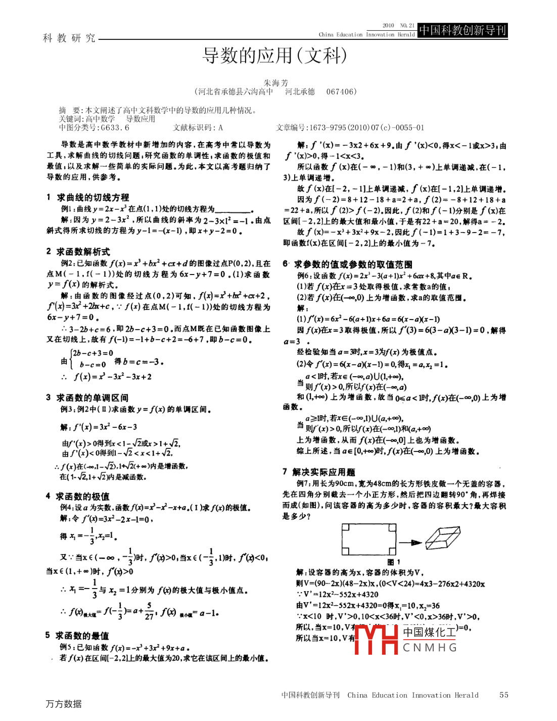科教研究0中國(guó)科教創(chuàng)新導(dǎo)刊導(dǎo)數(shù)的應(yīng)用(文科)海芳(河北省承德縣六溝高中河北承德067406摘要:本文闡述了高中文科數(shù)學(xué)中的導(dǎo)數(shù)的應(yīng)用幾種情況。關(guān)鍵詞:高中數(shù)學(xué)導(dǎo)數(shù)應(yīng)用中圖分類號(hào):G633.6文獻(xiàn)標(biāo)識(shí)碼:A文章編號(hào):1673-9795(2010)07(c)-0055-01導(dǎo)數(shù)是高中數(shù)學(xué)教材中新增加的內(nèi)容,在高考中常以導(dǎo)數(shù)為解:f∫'(x)=-3x2+6x+9由∫'(x)<0,得x<-1或x>3;由工具,求解曲線的切線問(wèn)題研究函數(shù)的單調(diào)性;求函數(shù)的極值和∫'(x)>0,得-1f(-2)因此,∫(2)和f(-1)分別是∫(x)在解因?yàn)閥=2-3x2,所以曲線的斜率為2-3×12=-1由點(diǎn)區(qū)間-2,2]上的最大值和最小值,于是有22+a=20,解得a=-2,斜式得所求切線的方程為y-1=-(x-1),即x+y-2=0。故∫(x)=-x+3x2+9X-2,因此∫(-1)=1+3-9-2=-7即函數(shù)f(x)在區(qū)間[-2,2]上的最小值為-7。2求函數(shù)解析式例2:已知函數(shù)f(x)=x3+bx2+cx+d的圖像過(guò)點(diǎn)P(0,2),且在6求參數(shù)的值或參數(shù)的取值范圍點(diǎn)M(-1,f(-1))處的切線方程為6x-y+7=0,(1)求函數(shù)例6:設(shè)函數(shù)∫(x)=2x2-3(a+1)x2+6ax+8其中a∈Ry=f(x)的解析式(1)若f(x)在x=3處取得極值求常數(shù)a的值,解:由函數(shù)的圖像經(jīng)過(guò)點(diǎn)(0,2)可知,f(x)=x+b2+a+2(2)若f(x)在(∞,0)上為增函數(shù),求a的取值范圍f(x)=3x2+2mk+c,;f(x)在點(diǎn)M(-1,(-1)處的切線方程為解(1)∫(x)=6x2-6(a+)x+6=6(x-aXx-1)∴3-2b+c=6,即2b-c+3=0。而點(diǎn)M既在已知函數(shù)圖像上因∫(x)在x=3取得極值,所以∫(3)=6(3-a)3-1)=0,解得又在切線上,故有∫(-1)=-1+b-c+2=-6+7,即b-c=0。c+3=0經(jīng)檢驗(yàn)知當(dāng)a=3時(shí),x=3為/(x)為極值點(diǎn)。由b-c=0得b=c=-3(2)令f(x)=6(x-a)(x-1)=0得x=ax2=1∫(x)則∫(x)>0所以f(x)在(-∞,a3求函數(shù)的單調(diào)區(qū)間和(+∞)上為增函數(shù)故當(dāng)0≤a<時(shí),f(x)在(-,0)上為增例3:例2中(Ⅱ)求函數(shù)y=f(x)的單調(diào)區(qū)間函數(shù)。a≥時(shí),若x∈(-∞)U(a+∞),解:f(x)=3x2-6x-3則f(x)>0所以f(x)在(-∞)和a+∞由f(x)>0得到<1-√或x1+√2,上為增函數(shù),從而f(x)在(∞O]上也為增函數(shù)由f(x)<0得到-v20,當(dāng)x∈(31)時(shí),f(<0囝1當(dāng)x∈(1,+∞)時(shí),∫(x>0解:設(shè)容器的高為x,容器的體積為則V=(902x)(48-2xx,(00,1036時(shí),v>0,所以,當(dāng)x=10,V5求函數(shù)的最值所以當(dāng)x=10,V有H中國(guó)煤化工)0例5:已知函數(shù)f(x)=-x2+3x2+9x+aCNMHG若f(x)在區(qū)間-2,2l上的最大值為20,求它在該區(qū)間上的最小值中國(guó)科教創(chuàng)新導(dǎo)刊 China Education innovation herald55