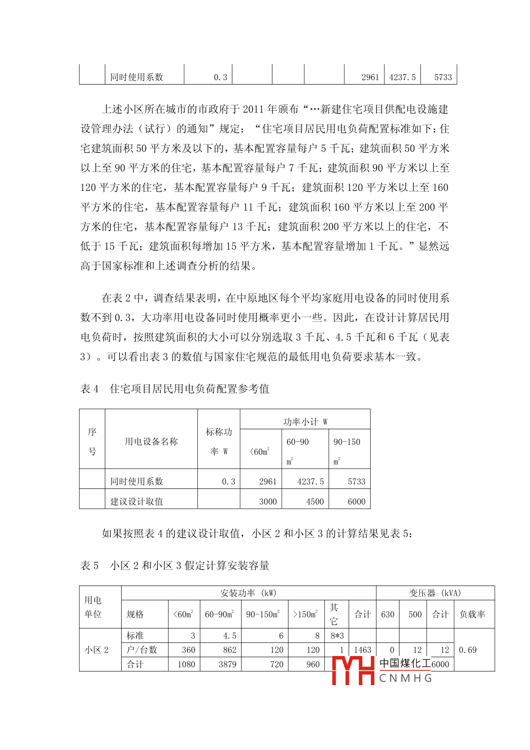 住宅用電與節(jié)能張將重慶大學電氣學院重慶4101331摘要根據(jù)國家節(jié)能政策并結合最新《住宅建筑電氣設計規(guī)范》JGJ242-2011要求,針對一些地區(qū)片面放大住宅用電負荷情況,通過對中原地區(qū)一些典型住宅小區(qū)的用電負荷調(diào)查分析,提出符合實際情況和節(jié)約能源的住宅小區(qū)用電負荷設計選取的建議。關鍵詞住宅用電負荷變壓器負載率節(jié)能中途分類號:S2104文獻標識碼:A文章編號:《住宅建筑電氣設計規(guī)范》JGJ242-2011對不同面積的住宅最低用電負荷作出了明確規(guī)定:“建筑面積《60m,3kw:60m<建筑面積《90m,4kW;90m<建筑面積《150m,6kW;建筑面積>150m,6kW+超出部分(按40~50W/m2計算)。”通過對中原地區(qū)幾個典型規(guī)模小區(qū)實際住戶用電情況的調(diào)査,結合住宅建筑電氣設計標準的發(fā)展史(住宅負荷指標:70年代,2W/m;80年代,10W/m;90年代,10wW/m;2000年后50~60W/m3),談談住宅、住宅小區(qū)用電負荷計算與節(jié)能的關系1、住宅小區(qū)調(diào)查情況小區(qū)1某省會城市單位多層(5-7層,無電梯)住宅小區(qū),為70~80年代興建的住宅小區(qū),總建筑面積約33300m,總戶數(shù)508,小區(qū)入住率95%。住戶用電實際配置標準(按當時的規(guī)范規(guī)定)如下:建筑面積60m以下,202戶,1.5kW,戶內(nèi)配電箱主進斷路器為In=20A,電表5(20)A;60m<建筑面積《90m2,284戶,2kW,戶內(nèi)配電箱主進斷路器為In=25A,電表5(20)A:90m2<建筑面積《150m2,12戶,2.5kW,戶內(nèi)配電箱主進斷路H中國煤化工40)CNMHGA。從變電所到每幢住宅樓有一路~220/380V電源(根據(jù)不同單元數(shù),所用的電纜大小不等),每個單元(18戶)主進斷路器In=100A。住宅變壓器安裝容量630kVA(單位負荷指標約為18.9VA/m),運行20多年,平均負載率在81%左右,高峰時段也無過負荷跳閘事故。若要滿足現(xiàn)行《住宅建筑電氣設計規(guī)范》要求,按照需要系數(shù)法計算,住宅變壓器安裝容量需要2*630kVA,計算負載率在83%。小區(qū)2同上城市某高層住宅小區(qū),為2001-2004年建成的小區(qū),建筑層數(shù)1232層(建筑高度<100m),總建筑面積314290m,其中住宅建筑面積245000m2,總戶數(shù)1463戶,小區(qū)入住率80%左右。戶型比例分別為建筑面積60m以下,360戶,戶內(nèi)配電箱主進斷路器為In=40A,電表10(40)A;60m<建筑面積《90m,862戶,戶內(nèi)配電箱主進斷路器為In=50A,電表15(60)A;90m<建筑面積《150m2,120戶,戶內(nèi)配電箱主進斷路器為In=63A,電表15(60)A;建筑面積》150m2,120戶,戶內(nèi)配路器In=80A電表電箱主進斷20(80)A;建筑面積>150m2,考慮戶式中央空調(diào),戶內(nèi)配路器為三相In=63A,電表電箱主進斷15(60)A(按照建設單位等方面對高檔小區(qū)的要求,每戶用電配置容量分別為單相6kW,8kW,10kW,12kW和三相8kW,另有樓王1戶,建筑面積600m2,按三相12kW配電)。按每且單元分段電纜(每段不超過10層)進線,In=315~400A。住宅變壓器總安裝容量9020kVA(單位負荷指標約為28.7VA/m2),住宅變電所均設置在高層住宅樓地下室,其中容量為630kVA變壓器4臺,容量為500kVA變壓器13臺,設計變壓器負載率為75%。(根據(jù)當?shù)毓╇姴块T的要求,住戶按照38VA/m2計算,變壓器總安裝容量為9310kVA,計算負載率約72.7%。)實際調(diào)查發(fā)現(xiàn),變壓器負載率平均約為35.6%,即使考慮另外20%全部入住,負載率為44.5%,不足50%小區(qū)3中國煤化工CNMHG同上城市西區(qū)的一個多層住宅小區(qū),2006年按照國家“70-90”政策要求建設。小區(qū)共有住戶1092戶,住宅總建筑面積96900平方米,其中90平方米及其以下住宅占75.1%?,F(xiàn)小區(qū)入住率達到85%戶型比例分別為建筑面積60m以下,280戶,用電負荷4kW,戶內(nèi)配電箱主進斷路器為In=32A,電表10(40)A:60m建筑面積《90m2,520戶,用電負荷6kW,戶內(nèi)配電箱主進斷路器為In=40A,電表10(40)A;90m《<建筑面積《150m2,292戶,用電負荷8kW,戶內(nèi)配電箱主進斷路器為In=50A,電表15(60)A。每個單元(12戶)獨立進線,主進斷路器In=100~160A設計住宅變壓器總安裝容量3000A(單位負荷指標約為31.0VA/m2),選用容量為500kVA的箱式變電站6臺,設計變壓器負載率為81%。(住戶按照每平方米0.03VA設計,低于當?shù)毓╇姴块T每平方米0.038VA要求)實際調(diào)查發(fā)現(xiàn),變壓器負載率平均約為35%,即使考慮另外15%全部入住,載率為41.2%,不足表1小區(qū)2和小區(qū)3實際安裝容量統(tǒng)計用電安裝功率(kW)變壓器(kVA)單位「規(guī)格60m60-90m90150150m其它合計630500合計負載率小區(qū)/標準88*3戶/臺數(shù)36012011463170.75合計21606896120014402411720252065009020小區(qū)標準戶/臺數(shù)28052000000a60.81合計1203120120030002、變壓器損耗和成本分析以SCB10系列10kV級無勵磁調(diào)壓干式變壓器為例,500kVA、630kVA和800kVA三種住宅小區(qū)常用規(guī)格的損耗在負荷率40%、50%、65%和75%情況下的綜合功率損耗分析見表2。(本計算的技術參數(shù)參考一家公司10kV級無勵磁調(diào)壓干式變壓器系列產(chǎn)品說明書,計算公式略)表2變壓器損耗分析表中國煤化工CNMHG序號負載率功率損耗千瓦年耗電千瓦時容量500kVA630kVA800kVA500VA40%22698.7226359.431269.828592.9634096.73998950%23708.427574.2532707.2534146.240778.3847889.8865%25222.9229396.5334863.4342476.0650800.8959748.8475%26232.63061.383630.8848029.357482.5667654.81從上表可以計算出:單臺干式變壓器,容量每提高1個數(shù)量規(guī)格,功率損耗增加16.1%~18.6%,年損耗耗電量增加1.2%~19.7%。某制造公司的SCB10網(wǎng)上報價:500kVA