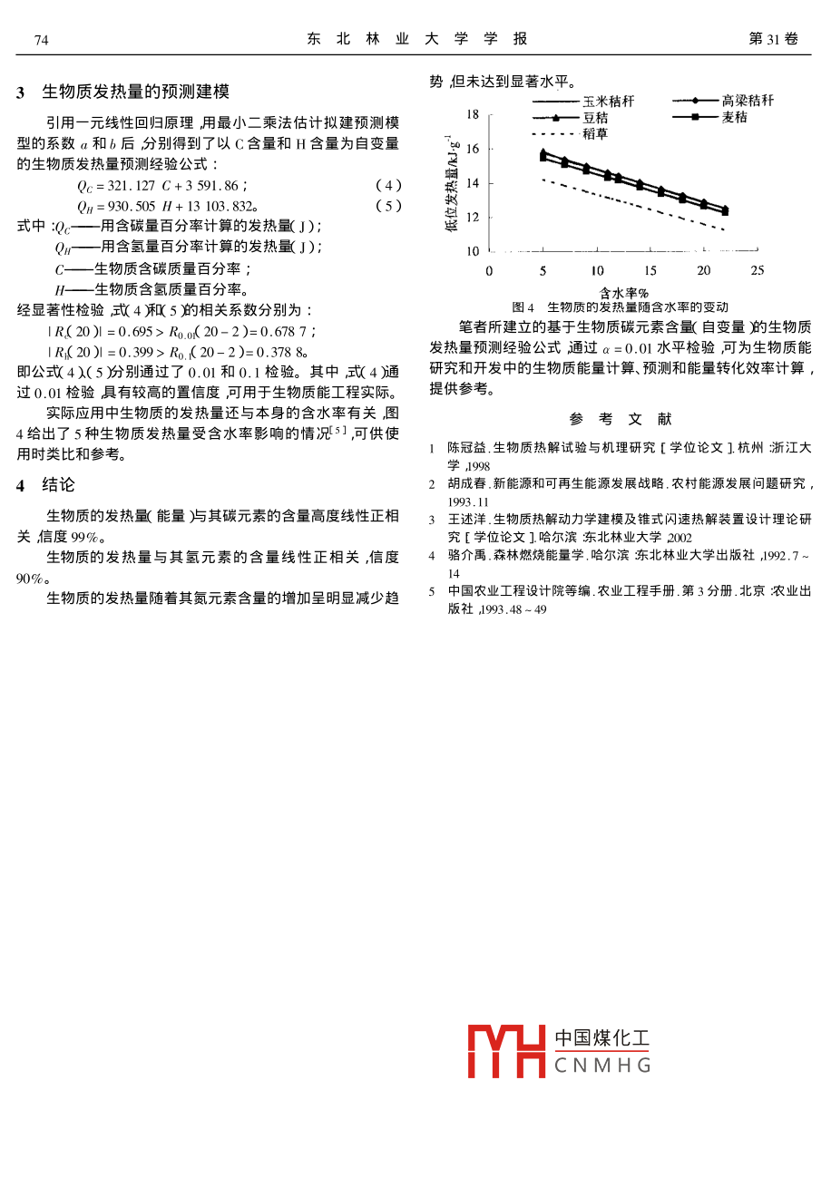 第31卷第2期東北林業(yè)大學(xué)學(xué)報(bào)Vol. 31 No. 22003年3月OURNAL OF NORTHEAST FORESTRY UNIVERSITYMar,2003生物質(zhì)的能量預(yù)測(cè)及建模1)王述洋譚文英趙殊王立娟劉建孫仁山(東北林業(yè)大學(xué)哈爾濱l5040)摘要選擇20種中國(guó)草本、木本生物質(zhì)為試樣粉碎至0.8-1.2mm在110±5)C條件下連續(xù)干燥12h以上取岀后立即進(jìn)行C、HN元素含量和發(fā)熱量測(cè)定并根據(jù)測(cè)定結(jié)果分別建立了基于C、H元素含量的能量預(yù)測(cè)經(jīng)驗(yàn)公式該公式分別通過了α=0.01和α=0.1檢驗(yàn)。研究表明生物質(zhì)的能量大小與其CH元素的含量呈線性正比關(guān)系泩生物質(zhì)的發(fā)熱量隨著其氮元素含量的增加呈明顯減少趨勢(shì)但未達(dá)到顯著水平關(guān)鍵詞生物質(zhì)能量測(cè)定能量預(yù)測(cè)建模分類號(hào)TK6The Predict of Biomass Energy and the Establishment of Modeling/Wang Shuyang, Tan Wenying Zhao Shu Wang LijuanLiu Jian, Sun Renshar( Northeast Forestry University, Harbin 150040, P. R. China )/Journal of Northeast Forestry University2003,3K2).-72~74In this thesis the authors choose 20 kinds of Chinese herbaceous and woody biomass as samples smash to 0.8-1.2 mm sizeand continually dry above 12 hours in the condition of 110+ 5 )C then immediately measure the content and the heat quantityof the element of C, H,N. According to the measurement result established the energy predict experiential formulations basethe content of the element of C and H, and passed respectively the checkout of a=0. 01 and a=0. 1. The research indicatesthat the relationship between biomass energy quantity and the content of C and H shows linearly direct ratio and the heat quantityhas an obvious reducing tendency along with the adding content of the n element, but it doesn t achieve the marked levelKey words Biomass Energy measurement Energy predict Establishment of modeling不論是生物質(zhì)熱解氣化還是熱解液化都需要事先估算生物質(zhì)能來源于生物質(zhì)主要指直接或間接地通過綠色植所用生物質(zhì)原料充分燃燒時(shí)所能釋放岀的全部能量。以前人物的光合作用把太陽能轉(zhuǎn)化為化學(xué)能后固定和貯藏在生物質(zhì)們主要用氧彈式熱量分析儀來測(cè)定生物質(zhì)的能量(即發(fā)熱(包括動(dòng)物體內(nèi)的能量。廣義地講生物質(zhì)還包括由綠色植物量)這種方法既費(fèi)時(shí)、又耗資而且需要有良好的儀器和實(shí)派生旳各種生物質(zhì)如有機(jī)生活垃圾、有機(jī)物廢水、人畜糞便和驗(yàn)室條件。而事實(shí)上任何一種生物質(zhì)的發(fā)熱量必然與它的各種水生植物如藻類、浮萍、水葫蘆、水風(fēng)信子等)含碳量和含氬量有關(guān)而科學(xué)技術(shù)發(fā)展到今天絕大部分生物從組成成分看生物質(zhì)主要由纖維素、半纖維素、木質(zhì)素質(zhì)的化學(xué)成分已被測(cè)定并可從相關(guān)資料中查取。因此如果以及灰分等成分組成。對(duì)木材而言,CH、O、N的含量一般分能將生物質(zhì)的發(fā)熱量與其碳、氬元素的含量相互聯(lián)系起來建別為52%、6.3%、40.5%、0.4%左右纖維素、木質(zhì)素與半纖立一種簡(jiǎn)捷方便的生物質(zhì)發(fā)熱量預(yù)測(cè)經(jīng)驗(yàn)公式必將對(duì)推廣維素一般分別占43%、35%和22%2。農(nóng)作物類生物質(zhì)的纖和普及生物質(zhì)能利用技術(shù)提供方便維素木質(zhì)素與半纖維素各組分的具體含量見表p。筆者在國(guó)家863″計(jì)劃支持下試圖通過對(duì)常見的20種表1生物質(zhì)成分分析質(zhì)量百分比db)生物質(zhì)發(fā)熱量及碳?xì)搴繙y(cè)試和建摸研究建立起生物質(zhì)發(fā)生物質(zhì)類型纖維素半纖維素木質(zhì)素萃取物惰性灰熱量預(yù)測(cè)估計(jì)經(jīng)驗(yàn)公式以期為生產(chǎn)實(shí)際中快速查閱和計(jì)算甘蔗渣41.323.818.313.72.9生物質(zhì)的發(fā)熱量及能量轉(zhuǎn)化率提供便捷手段和參考方法。椰樹殼6.38.30.7生物質(zhì)的物質(zhì)組成及其分布玉米棒40.316.615.42.8玉米桿42.7所謂生物質(zhì)是指有機(jī)物中除礦物燃料外的所有來源于動(dòng)棉花網(wǎng)廢物7.8植物而又能夠再生的物質(zhì)。筆者研究所涉及的生物質(zhì)主要指落地花生17,9各種林業(yè)剩余物、薪柴和各種農(nóng)作物的根、莖、葉及谷物殼皮谷殼等如玉米秸桿、豆秸、稻殼、玉米芯、各種樹木的樹皮、樹枝、稻殼31.314.3423.5樹葉等經(jīng)光合作用而產(chǎn)生的各種有機(jī)體。在各種可再生能源稻桿13.613.119.8中生物質(zhì)是儲(chǔ)存太陽能的一種惟一可再生的炭源可轉(zhuǎn)化成小麥桿30.513.411.2常規(guī)的固態(tài)、液態(tài)和氣態(tài)燃料d表示干生物質(zhì)( Dry biomass或 Dry base1)國(guó)家863“高技術(shù)(200144514060)國(guó)家自然科學(xué)基金2中國(guó)煤化工測(cè)定(30170758X948″國(guó)外先進(jìn)農(nóng)業(yè)技術(shù)引進(jìn)(2001-28)黑龍江省自然科學(xué)基金項(xiàng)目(SJD-011鄭分內(nèi)容CNMHG定的。但就其發(fā)熱量測(cè)定第一作者簡(jiǎn)介汪述洋男,1958年3月生東北林業(yè)大學(xué)機(jī)電工研究而言假定其含水量不變則影響生物質(zhì)發(fā)熱量的因素主程學(xué)院教授要是生物質(zhì)的元素成分具體主要體現(xiàn)在生物質(zhì)的碳、氫、氮、收稿日期2002年12月4日。氧等元素的含量。因此,首先應(yīng)對(duì)所選生物質(zhì)的碳、氫、氮、氧責(zé)任編輯張
