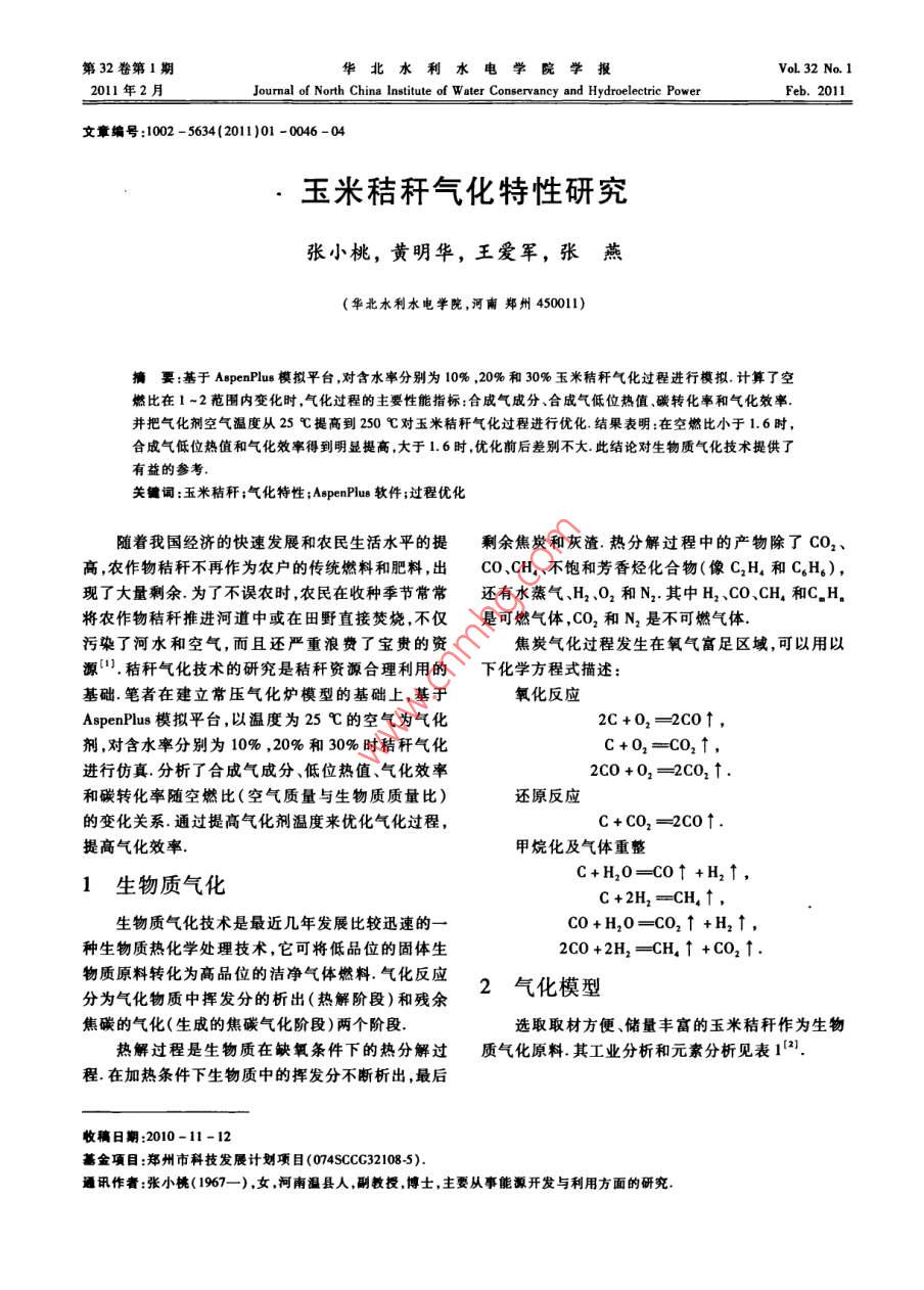 第32卷第1期華北水利水電學院學報VoL32 No.12011年2月.Journal of North China Institute of W ater Conservancy and Hyrolectrie PowerFeb. 2011文章編號:1002 - 5634(2011)01 -0046 -04玉米秸稈氣化特性研究張小桃,黃明華,王愛軍,張燕(華北水利水電學院,河南鄭州450011)摘要:基于 AspenPlus模擬平臺,對含水率分別為10% ,20%和30%玉米秸稈氣化過程進行模擬. 計算了空燃比在1-2范圍內(nèi)變化時,氣化過程的主要性能指標:合成氣成分、合成氣低位熱值、碳轉(zhuǎn)化事和氣化效事.并把氣化劑空氣溫度從25 C提高到250 C對玉米秸稈氣化過程進行優(yōu)化.結(jié)果表明:在空燃比小于1.6時,合成氣低位熱值和氣化效率得到明顯提高,大于1. 6時,優(yōu)化前后差別不大此結(jié)論對生物質(zhì)氣化技術(shù)提供了有益的參考.關鍵詞:玉米秸稈;氣化特性;AepenPlus軟件;過程優(yōu)化隨著我國經(jīng)濟的快速發(fā)展和農(nóng)民生活水平的提剩余焦炭和灰渣.熱分解過程中的產(chǎn)物除了CO2、.高,農(nóng)作物秸稈不再作為農(nóng)戶的傳統(tǒng)燃料和肥料,出CO、CH不飽和芳香烴化合物(像C2H,和C,H。),現(xiàn)了大量剩余.為了不誤農(nóng)時,農(nóng)民在收種季節(jié)常常還有水蒸氣、H, 02和N2其中H2、CO、CH和C.H.將農(nóng)作物秸稈推進河道中或在田野直接焚燒,不僅.是可燃氣體,CO2和N,是不可燃氣體.污染了河水和空氣,而且還嚴重浪費了寶貴的資焦炭氣化過程發(fā)生在氧氣富足區(qū)域,可以用以源".秸稈氣化技術(shù)的研究是秸稈資源合理利用的下化學方程式描述:基礎.筆者在建立常壓氣化爐模型的基礎上,基于氧化反應AspenPlus模擬平臺,以溫度為25 C的空氣為氣化2C +02= =2CO↑,劑,對含水率分別為10% ,20%和30%時秸稈氣化C+02=CO2↑,進行仿真.分析了合成氣成分、低位熱值、氣化效率2C0+0, = =2C02↑.和碳轉(zhuǎn)化率隨空燃比(空氣質(zhì)量與生物質(zhì)質(zhì)量比)還原反應的變化關系.通過提高氣化劑溫度來優(yōu)化氣化過程,C +CO, = =2C0↑.提高氣化效率.甲烷化及氣體重整C+H20=CO↑+H2↑,1生物質(zhì)氣化C +2H2 =CH2↑,生物質(zhì)氣化技術(shù)是最近幾年發(fā)展比較迅速的一-CO+H20=CO2↑+H2↑,種生物質(zhì)熱化學處理技術(shù),它可將低品位的固體生2C0 +2H,-CH2↑+CO2↑.物質(zhì)原料轉(zhuǎn)化為高品位的潔凈氣體燃料.氣化反應2氣化模型分為氣化物質(zhì)中揮發(fā)分的析出(熱解階段)和殘余焦碳的氣化(生成的焦碳氣化階段)兩個階段.選取取材方便、儲量豐富的玉米秸稈作為生物熱解過程是生物質(zhì)在缺氧條件下的熱分解過質(zhì)氣化原料.其工業(yè)分析和元素分析見表12].程.在加熱條件下生物質(zhì)中的揮發(fā)分不斷析出,最后收稿日期:2010-11-12荔金項目:鄭州市科技發(fā)展計劃項目(074SCC32108-5).通訊作者:張小桃(1967- -),女,河南溫縣人,副教授,博士,主要從事能源開發(fā)與利用方面的研究.第32卷第1期張小桃,等:玉米秸稈 氣化特性研究47表1生物質(zhì)原料的工 業(yè)分析和元素分析工業(yè)分析/%元素分析/%原料水分灰分揮發(fā)分H玉米秸5.9371.9517.7549. 955.9743.120.830.13注:元素分析是在干燥、無灰分生物質(zhì)成分基礎上.用AepenPlus建模時,用到的主要反應模塊為單調(diào)遞增;H,和CH,含量單調(diào)遞減;C0含量先增RYield和RCibbe'3-41 ,氣化模型如圖1所示.大后減小;H,0含量先減小后增大;CO2含量的減小梯度則不斷趨于平緩.t Q-DECOMP為了研究水分對玉米秸稈氣化合成氣成分的影DECOMPGASIFY響,特比較含水率分別為10%和30%的玉米秸稈氣RYIELDINBURNERRGIBBS化合成氣中主要氣體成分CO、H2、CO2和H20隨空燃比的變化,結(jié)果如圖3所示從圖3可以看出,水BIOMASSAIR}[ PRODUCT ]分含量低的玉米秸稈氣化后合成氣中主要可燃成分圈1生物質(zhì)氣化模型CO和H2的總含量總高于含水分高的玉米秸稈氣化后合成氣中CO和H2的含量,而CO,和H20的生物質(zhì)原料和空氣分別進入RYield和RGibbs總含量總小于含水分高的玉米秸稈氣化后合成氣中模塊,其中生物質(zhì)原料為非常規(guī)組分( NC). DE-CO2和H20的含量.可見于燥玉米秸稈原料,可使COMP模塊是將生物質(zhì)原料(非常規(guī)物質(zhì),NC)分解合成氣中可燃成分增加.為單元素分子和灰分,并將裂解熱導入GASIFY模塊. GASIFY模塊運用最小Cibbs自由能的方法計算+ 10%( CO;+H,);★10%(CO:+H,.O)s0,士 30%( CO+H,); - t 30%( CO, +H ,0)出氣化爐出口合成氣組成和溫度.理想化模型的假設條件為"):①氣化爐處于穩(wěn)定運行狀態(tài),所有參數(shù)不隨時間發(fā)生變化;②氣化劑與生物質(zhì)顆粒在爐內(nèi)瞬間完全混合;③生物質(zhì)中的10 1.11.2131.4151.61.71.81.920H,O,N,S全部轉(zhuǎn)為氣相,而C隨條件的變化不完全空燃比轉(zhuǎn)化;④氣化爐內(nèi)的壓力相同,無壓力降;⑤生物質(zhì)圈3合成氣中主要成分隨空燃比的變化中的灰分為惰性物質(zhì),在氣化過程中不參與反應;⑥生物質(zhì)的顆粒溫度均勻,無梯度;⑦所有氣相反應3.2合成氣低位熱值隨空燃比的變化關系速度都很快,且達到了平衡;⑧氣化過程中的熱損失氣體低位熱值是指標準狀態(tài)下,單位體積氣體忽略不計.中可燃物熱值的總和.生物質(zhì)氣化所得的氣體燃料3模擬結(jié)果與討論的低位熱值由下式計算LHV = 126CO + 108H, + 359CH. + 665C.H。,3.1合成氣成分隨空燃比 的變化關系式中:LHV為氣體低位熱值, kJ/m';CO, H2, CH, .圖2為含水率為10%的玉米秸稈氣化后合成C.H。分別為CO,H2,CH.及