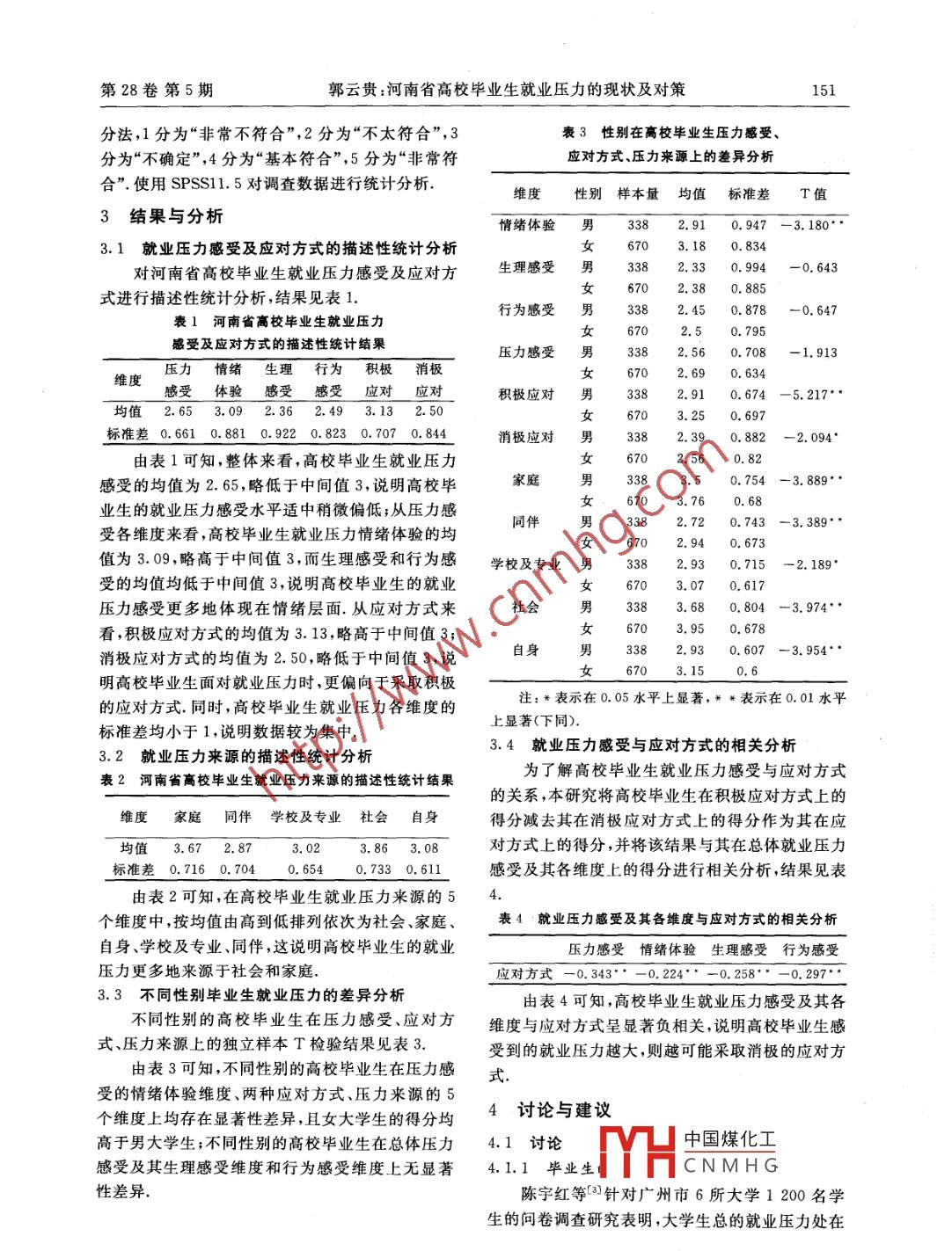 第28卷第5期周口師范學(xué)院學(xué)報2011年9月Vol.28 No. 5Journal of Zhoukou Normal UniversitySep. 2011河南省高校畢業(yè)生就業(yè)壓力的現(xiàn)狀及對策郭云貴(周口師范學(xué)院經(jīng)濟(jì)管理系,河南周口466001)摘要:使用“高校畢業(yè)生就業(yè)壓力調(diào)查問卷”對河南省內(nèi)6所高校的畢業(yè)生進(jìn)行問卷調(diào)查,結(jié)果發(fā)現(xiàn):高校畢業(yè)生的就業(yè)壓力感受水平適中稍微偏低,且更多地體現(xiàn)在情緒層面;高校畢業(yè)生在面對就業(yè)壓力時,更偏向于采取積極的應(yīng)對方式;高校畢業(yè)生就業(yè)壓力的來源按重要性依次為社會、家庭、自身、學(xué)校及專業(yè)、同伴;女畢.業(yè)生在壓力感受的情緒體驗(yàn)維度、兩種應(yīng)對方式、壓力來源的5個維度上的得分均顯著高于男畢業(yè)生;高校畢業(yè)生就業(yè)壓力感受及其各維度與應(yīng)對方式呈顯著負(fù)相關(guān).關(guān)鍵詞:高校畢業(yè)生;就業(yè)壓力;現(xiàn)狀中圖分類號: B84文獻(xiàn)標(biāo)志碼: A文章 編號: 1671 - 9476(2011)05 -0150 - 04對就業(yè)壓力,也可以為高校實(shí)施就業(yè)心理輔導(dǎo)和就問題的提出河南是我國第一人口大省,也是我國第一教育業(yè)指導(dǎo)提供-定的理論指導(dǎo),還可以為政府出臺相關(guān)政策提供參考依據(jù).人口大省.近年來,伴隨著我國高等教育事業(yè)的快2研究對象與工具速發(fā)展,河南省的高等教育規(guī)模逐步擴(kuò)大,高校畢業(yè)生數(shù)量也逐年增加.根據(jù)河南省副省長史濟(jì)春在為了解河南省高校畢業(yè)生就業(yè)壓力的現(xiàn)狀,本河南省十一屆人大四次會議舉行的首場記者招待研究于2010年9月對河南省內(nèi)6所高校(鄭州輕會.上披露的信息,2010年河南省的應(yīng)屆高校畢業(yè)工業(yè)學(xué)院、周口師范學(xué)院、南陽師范學(xué)院、鄭州大學(xué)生接近40萬人,2011年將達(dá)到44.6萬人,加上往升達(dá)經(jīng)貿(mào)管理學(xué)院、周口職業(yè)技術(shù)學(xué)院、河南商業(yè)年沒有就業(yè)的10萬人,2011年河南省需要就業(yè)的高等??茖W(xué)校)的畢業(yè)班學(xué)生進(jìn)行了問卷調(diào)查,共應(yīng)往屆高校畢業(yè)生將達(dá)到55萬人,占將要就業(yè)人發(fā)放問卷1 200份,回收有效問卷1 008份,有效回員總數(shù)的四分之一.而河南省的經(jīng)濟(jì)結(jié)構(gòu)與就業(yè)需收率為84.0%. 在有效問卷中,男生338份,占求不相適應(yīng),河南正處于工業(yè)快速發(fā)展階段,需要33. 5%;女生670份,占66. 5%.大量普工和技術(shù)人才,河南省的高端服務(wù)業(yè)發(fā)展比本研究使用的“高校畢業(yè)生就業(yè)壓力調(diào)查問較落后,對高層次人才需求比較少[1.可見,2011卷”主要參考北京青年壓力管理服務(wù)中心編制的年河南省高校畢業(yè)生就業(yè)形勢依然嚴(yán)峻,畢業(yè)生的“2010大學(xué)生就業(yè)壓力調(diào)查問卷”及吳文峰等[2]編就業(yè)壓力依然巨大.制的“大學(xué)生就業(yè)壓力問卷”而編制的,包括壓力感心理學(xué)研究表明,心理壓力是生活品質(zhì)與身心受 、應(yīng)對方式、壓力來源三大部分,共30個項(xiàng)目.其健康的威脅,更是引起心理障礙的一個重要原因.中,壓力感受部分包括情緒體驗(yàn)、生理感受、行為感就業(yè)壓力是心理壓力的一-種.當(dāng)前高校畢業(yè)生承受受3個維度,共6個項(xiàng)目;應(yīng)對方式部分包括積極的巨大就業(yè)壓力不僅影響其順利就業(yè),更嚴(yán)重威脅應(yīng)對、消極應(yīng)對2個維度,共4個項(xiàng)目;壓力來源部其身心健康.因此,對河南省高校畢業(yè)生就業(yè)壓力分包括家庭、同伴、學(xué)校及專業(yè)、社會、自身5個維的現(xiàn)狀等問題進(jìn)行研究,并提出緩解畢業(yè)生就業(yè)壓度,共20個項(xiàng)目.信度分析結(jié)果表明該問卷的內(nèi)部力的對策,有助于畢業(yè)生尋求更好的途徑和方法應(yīng)-致性a系數(shù)為0.825.問卷均采用李克特5點(diǎn)計(jì)收稿日期:2011-06-28中國煤化工基金項(xiàng)目:2010年度河南省政府決策研究招標(biāo)課題“高校畢業(yè)生就業(yè)壓力與社.MHCN M H G段性研究成果作者簡介:郭云貴(1981- ),男,湖南常寧人,講師,碩士,主要從事人力資源管理、管理心理學(xué)研究。第28卷第5期郭云貴:河南省高校畢業(yè)生就業(yè)壓力的現(xiàn)狀及對策151分法,1分為“非常不符合”,2分為“不太符合”,3表3性別在高校畢 業(yè)生壓力感受、分為“不確定”,4分為“基本符合”,5分為“非常符應(yīng)對方式、壓力來源上的差異分析合”。使用SPSS11.5對調(diào)查數(shù)據(jù)進(jìn)行統(tǒng)計(jì)分析.維度性別樣本量均值標(biāo)準(zhǔn)差T值3結(jié)果與分析情緒體驗(yàn)?zāi)?82.91 0. 947一 3. 180**3.1就業(yè)壓力感受及應(yīng)對方式的描述性統(tǒng)計(jì)分析女3. 180. 834對河南省高校畢業(yè)生就業(yè)壓力感受及應(yīng)對方生理感受男3382. 330.994 - 0.6436702.38 0. 885式進(jìn)行描述性統(tǒng)計(jì)分析,結(jié)果見表1.行為感受男338 2.45 0.878 - 0. 647表1河南省高校 畢業(yè)生就業(yè)壓力6702.5 0. 795感受及應(yīng)對方式的描述性統(tǒng)計(jì)結(jié)果壓力感受男0. 708- 1.913壓力情緒生理行為積極消極6702. 690. 634感受體驗(yàn)感受感受應(yīng)對應(yīng)對積極應(yīng)對男3382.91 0.674 - 5. 217