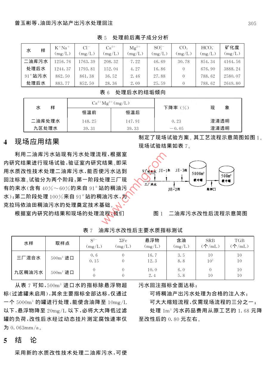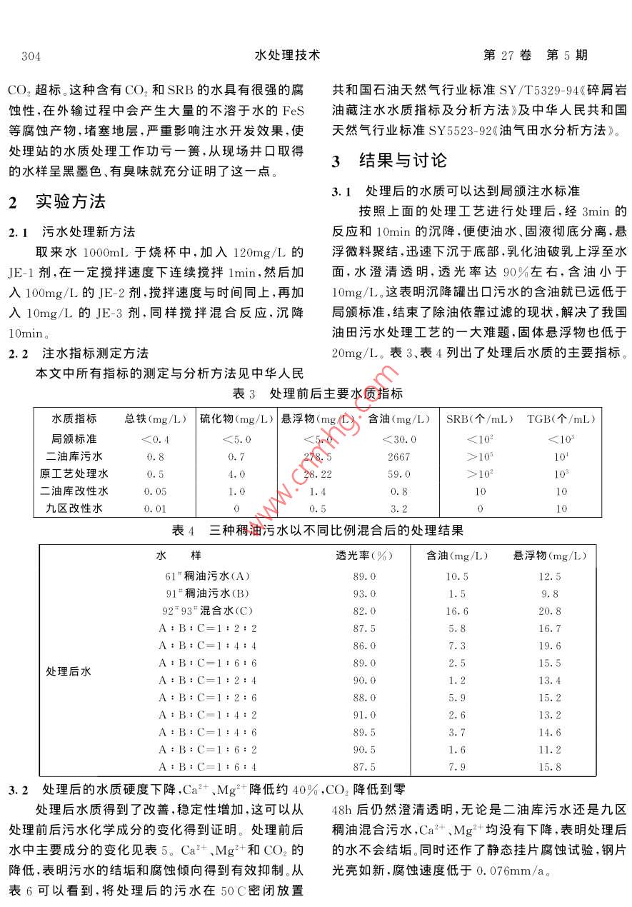 第27卷第5期水處理技術(shù)ol. 27 No 52001年10月TECHNOLOGY OF WATER TREATMENTOct.,2001油田污水站產(chǎn)出污水處理回注曾玉彬,傅紹斌,周正昆1,張學(xué)魯2,朱澤民2,張東平2,顧克慶2,洪波(1.江漢石油學(xué)院石油工程系,湖北荊州434102;2.新疆石油管理局.新疆克拉瑪依83400摘要:針對克拉瑪依油田二油庫污水站污水處理回注注水不達標(biāo)的現(xiàn)狀,本文采用水質(zhì)改性技術(shù)處理二油庫污水,并在現(xiàn)場試驗成功,能使污水處理達標(biāo)回注,并能處理稠油產(chǎn)岀污水。關(guān)鍵詞:油田產(chǎn)出污水;水質(zhì)改性技術(shù);凈化水質(zhì);穩(wěn)定水性中圖分類號:X741文獻標(biāo)識碼:B文章編號:1000-3770(2001)05-0303-03二油庫污水站注水水質(zhì)現(xiàn)狀二油庫的注入水源為產(chǎn)出污水,其中九區(qū)稠油污水(蒸汽后的產(chǎn)出污水)約60%,三廠稀油污水約1.I產(chǎn)出污水的性質(zhì)40%,其產(chǎn)出污水性質(zhì)見表1表1二油庫來水主要性質(zhì)水樣名稱溫度(C)pH總礦化度Ca2+Mg2+HCO3含油TGB(mg/L)(mg/1)(mg/L)(mg/L)(個/mL)(個/mL)二油庫混合水457.34011.9266,1720.0293.510九區(qū)稠油污水7.02701.539.31788.62175.2>10°1.2原工藝處理效果二油庫污水經(jīng)原水處理工藝處理后,處理效果見表2。表2二油庫原工藝污水處理濾后水水質(zhì)數(shù)據(jù)項自溶解氧SRB含油總鐵懸浮物(mg/L)(mg/L) (mg/L)(7/mL)(mg/L)(mg/L)(mg/L)局頒標(biāo)準(zhǔn)0.35.0≤102≤30.0≤0.4≤5.0≥10223.402.07.0×10222.90.26.96.0×10133.1103.5平均值0.709.0×1033.2431.826.0×1011.530.423.535.807.0×10310.3131.0從表2我們可以得到如下初步結(jié)論:(1)原工藝表明濾前水含油比這更高,必將使過濾罐中的濾料處理后部分指標(biāo)可達到局頒標(biāo)準(zhǔn);(2)主要水質(zhì)指標(biāo)失效,使過濾無法正常運行,導(dǎo)致現(xiàn)場不得不終止過懸浮物含量大于3mg/L,最高達13mg/L,平均值濾,直接將沉降后的水泵入注水系統(tǒng);(4)流程太長,超標(biāo)約10倍;(3)濾后水含油仍然高達約3mg/,污水在站內(nèi)停留時間超過3d,使細菌容易繁殖;(5)304水處理技術(shù)第27卷第5期CO2超標(biāo)。這種含有CO2和SRB的水具有很強的腐共和國石油天然氣行業(yè)標(biāo)準(zhǔn)SY/T5329-94《碎屑巖蝕性在外輸過程中會產(chǎn)生大量的不溶于水的FeS油藏注水水質(zhì)指標(biāo)及分析方法》及中華人民共和國等腐蝕產(chǎn)物,堵塞地層,嚴(yán)重影響注水開發(fā)效果,使天然氣行業(yè)標(biāo)準(zhǔn)SY5523-92《油氣田水分析方法》。處理站的水質(zhì)處理工作功虧一簣,從現(xiàn)場井口取得的水樣呈黑墨色、有臭味就充分證明了這一點3結(jié)果與討論2實驗方法3.1處理后的水質(zhì)可以達到局頒注水標(biāo)準(zhǔn)按照上面的處理工藝進行處理后,經(jīng)3min的2.1污水處理新方法反應(yīng)和10min的沉降,便使油水、固液徹底分離,懸取來水1omL于燒杯中,加入120mg/L的浮微料聚結(jié),迅速下沉于底部,乳化油破乳上浮至水JE1劑,在一定攪拌速度下連續(xù)攪拌1min,然后加面,水澄清透明,透光率達90%左右,含油小于入1omg/L的JE-2劑,攪拌速度與時間同上,再加1mg/L這表明沉降罐出口污水的含油就已遠低于入1ωmg/L的E-3劑,同樣攪拌混合反應(yīng),沉降局頒標(biāo)準(zhǔn),結(jié)束了除油依靠過濾的現(xiàn)狀解決了我國l0min。油田污水處理工藝的一大難題,固體懸浮物也低于2.2注水指標(biāo)測定方法20mg/L。表3、表4列出了處理后水質(zhì)的主要指標(biāo)。本文中所有指標(biāo)的測定與分析方法見中華人民表3處理前后主要水質(zhì)指標(biāo)水質(zhì)指標(biāo)總鐵(mg/L)硫化物(mg/L)懸浮物(mg/L)含油(mg/L)SRB(個/mL)TGB(個/mL)局頒標(biāo)準(zhǔn)二油庫污水0.80.7278.52667>105原工藝處理水>10二油庫改性水1.40.8九區(qū)改性水0.010.53.210表4三種稠油污水以不同比例混合后的處理結(jié)果水樣透光率(%)含油(mg/)懸浮物(mg/L)61稠油污水(A)89.012.51稠油污水(B)93.09.89293混合水(C)82.016.60.8A:B:C=1:2:216.7A:B:C=1:4:4A:B:C=1:6:62.5處理后水A:B:C=1:2:4A:B:C=1:2:6A:B:C=1:4:6A:B:C=1:6:211.23.2處理后的水質(zhì)硬度下降,Ca2、Mg2+降低約40%,CO2降低到零處理后水質(zhì)得到了改善,穩(wěn)定性增加,這可以從48h后仍然澄清透明,無論是二油庫污水還是九區(qū)處理前后污水化學(xué)成分的變化得到證明。處理前后稠油混合污水,Ca2-、Mg2均沒有下降,表明處理后水中主要成分的變化見表5。Ca2+、Mg2+和CO2的的水不會結(jié)垢同時還作了靜態(tài)掛片腐蝕試驗,鋼片降低,表明污水的結(jié)垢和腐蝕傾向得到有效抑制。從光亮如新,腐蝕速度低于0.076mm/a。表6可以看到,將處理后的污水在50C密閉放置曾玉彬等,油田污水站產(chǎn)出污水處理回注305表5處理前后離子成分分析K NatMgk f(mg/L)(mg/L)(mg/L)(mg/L)(mg/L)(mg/L)HCO3礦化度二油庫污水1256.761763.39208.327.2246.6930.78854.344164.56處理后水1244.371793.81152.04676.9038882491“站污水862.50861.3836.522,4627.8788.622580.0處理后水883.77852.5028.3625.59788.622649.80表6處理后水的結(jié)垢傾向Ca2+Mg+(mg/L)水樣下降率(%)現(xiàn)象恒溫前恒溫后二油庫處理水148.2147.91澄清透明九區(qū)處理水39.3139.33澄清透明4現(xiàn)場應(yīng)用結(jié)果制定了現(xiàn)場試驗方案。其工藝流程示意簡圖如圖1?,F(xiàn)場試驗結(jié)果如表7。利用二油庫污水站現(xiàn)有污水處理流程,根據(jù)室內(nèi)研究結(jié)果進行現(xiàn)場試驗,驗證室內(nèi)研究結(jié)果。即采