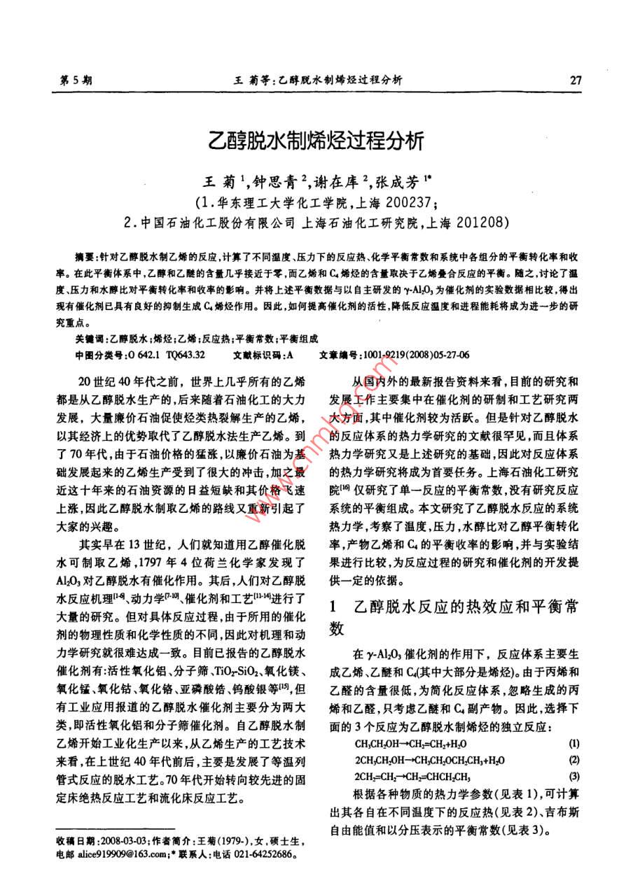 第5期王菊等:乙醇脫水制烯烴過程分析27乙醇脫水制烯烴過程分析王菊',鐘思青2,謝在庫",張成芳1(1.華東理工大學化工學院,上海200237;2.中國石油化工股份有限公司上海石油化工研究院,上海201208)摘要:針對乙醇脫水制乙烯的反應(yīng),計算了不同溫度、壓力下的反應(yīng)熱、化學平衡常數(shù)和系統(tǒng)中各組分的平衡轉(zhuǎn)化率和收率。在此平衡體系中,乙醇和乙醚的含量幾乎接近于零,而乙烯和C4烯烴的含量取決于乙烯疊合反應(yīng)的平衡。隨之,討論了溫度、壓力和水醇比對平衡轉(zhuǎn)化率和收率的影響。并將上述平衡數(shù)據(jù)與以自主研發(fā)的r-AL2O,為催化劑的實驗數(shù)據(jù)相比較,得出現(xiàn)有催化劑已具有良好的抑制生成C烯烴作用。因此,如何提高催化劑的活性,降低反應(yīng)溫度和進程能耗將成為進一步的研究重點。關(guān)鍵誦:乙醇脫水;烯烴;乙烯;反應(yīng)熱;平衡常數(shù);平衡組成中團分類號:0642.1 TQ643.32文獻標識碼:A文章編號1001-919(2008)05-27-0620世紀40年代之前,世界上幾乎所有的乙烯從國內(nèi)外的最新報告資料來看,目前的研究和都是從乙醇脫水生產(chǎn)的,后來隨著石油化工的大力發(fā)展工作主要集中在催化劑的研制和工藝研究兩發(fā)展,大量廉價石油促使烴類熱裂解生產(chǎn)的乙烯,大方面,其中催化劑較為活躍。但是針對乙醇脫水以其經(jīng)濟.上的優(yōu)勢取代了乙醇脫水法生產(chǎn)乙烯。到的反應(yīng)體系的熱力學研究的文獻很罕見,而且體系了70年代,由于石油價格的猛漲,以廉價石油為基熱力學研究又是上述研究的基礎(chǔ),因此對反應(yīng)體系礎(chǔ)發(fā)展起來的乙烯生產(chǎn)受到了很大的沖擊,加之最的熱力學研究將成為首要任務(wù)。上海石油化工研究近這十年來的石油資源的日益短缺和其價格飛速院呵僅研究了單一反應(yīng)的平衡常數(shù),沒有研究反應(yīng)上漲,因此乙醇脫水制取乙烯的路線又重新引起了系統(tǒng)的平衡組成。本文研究了乙醇脫水反應(yīng)的系統(tǒng)大家的興趣。熱力學,考察了溫度,壓力,水醇比對乙醇平衡轉(zhuǎn)化其實早在13世紀,人們就知道用乙醇催化脫率,產(chǎn)物乙烯和Cs的平衡收率的影響,并與實驗結(jié)水可制取乙烯,1797年4位荷蘭化學家發(fā)現(xiàn)了果進行比較,為反應(yīng)過程的研究和催化劑的開發(fā)提Al2O3對乙醇脫水有催化作用。其后,人們對乙醇脫供一定的依據(jù)。水反應(yīng)機理"呵、動力學[.0、催化劑和工藝叫明進行了1乙醇脫水反應(yīng)的熱效應(yīng)和平衡常大量的研究。但對具體反應(yīng)過程,由于所用的催化劑的物理性質(zhì)和化學性質(zhì)的不同,因此對機理和動數(shù)力學研究就很難達成- -致。目前已報告的乙醇脫水在y-Al2O3催化劑的作用下,反應(yīng)體系主要生催化劑有:活性氧化鋁、分子篩、TiO-SiO2、氧化鎂、成乙烯乙醚和C(其中大部分是烯烴)。由于丙烯和氧化錳、氧化鈷、氧化鉻、亞磷酸鋯、鎢酸銀等呵,但乙醛的含量很低,為簡化反應(yīng)體系,忽略生成的丙有工業(yè)應(yīng)用報道的乙醇脫水催化劑主要分為兩大烯和乙醛,只考慮乙醚和C副產(chǎn)物。因此,選擇下類,即活性氧化鋁和分子篩催化劑。自乙醇脫水制面的3個反應(yīng)為乙醇脫水制烯烴的獨立反應(yīng):乙烯開始工業(yè)化生產(chǎn)以來,從乙烯生產(chǎn)的工藝技術(shù)CH,CH.0H- +CH.=CH2+H2O(1來看,在上世紀40年代前后,主要是發(fā)展了等溫列2CH,CH0H→CH,CH2OCH,CH,+H2O(2管式反應(yīng)的脫水工藝。70年代開始轉(zhuǎn)向較先進的固2CH=CH2- +CH2=CHCHCH,(3定床絕熱反應(yīng)工藝和流化床反應(yīng)工藝。根據(jù)各種物質(zhì)的熱力學參數(shù)(見表1),可計算出其各自在不同溫度下的反應(yīng)熱(見表2)、吉布斯自由能值和以分壓表示的平衡常數(shù)(見表3)。收稿日期:2008-03-03;作者簡介:王菊(1979-),女,碩士生,電郵alice919909@163.com;*聯(lián)系人:電話021-64252686.28天然氣化工2008年第33卷表1各個物質(zhì)的熱力學數(shù)據(jù)K°。根據(jù)各反應(yīng)在不同溫度下標準吉布斯自由能,Table 1 Tbermodynamic data of various components可計算出不同溫度下的各反應(yīng)的平衡常數(shù),結(jié)果見物質(zhì)名稱OdFP OG' Cp =a+bT+eP+dT1.mol".K*'表3。kJ.mol*.Kt mol*-Kt a bx10* cx10* dx10*表3不同溫度下的反應(yīng)吉布斯自由能值和平衡常數(shù)CH,CH2OH( -235.70 -168.92 9.043 214.746 -84.168 1.378Table 3 Gibbs energies values and equilibrium constantCH=CH2(@52.5068.38 3.818 157.080 -81.648 17.606at diterent temperatureH2O (g)-242.76229.49 32344 1.930 10.588 -3.608OrG AJ. mol.K+K,(CHCH)0g -253.18122.81 21.491 336.924 -103.866 -9.387TrK^H (g)"-0.12671.57 -3.003 354.312 199.668 4.772(1)2) (3) Kn=-Ppre K,=5*為計算方便,C以1-丁烯為代表;數(shù)據(jù)來源于文獻[17]553 -25.143 -6.855 -31.009 2.37x1024.44847.81在乙醇脫水反應(yīng)過程中,其等壓反應(yīng)熱Q,=573 -27.759 -6.309 -28.334 3.39x1023.76382.24-OH,根據(jù)Kirhhf定律:(3H -)=Cp反應(yīng)焙變593 -30.377 -5.766 -25.661 4.73x1023.22181.91613 -32.995 -5.2272 -22.989 6.47x1022.7990.89△.H可從定壓熱容差OCp的積分求得,而OCp=633 -35.615 4.691 -20.319 8.68x1022.4447.47△a+ ObT+ OcT+ Od7,則O,H=Ho+ Oa+(Ob/2)7&+653 -38.234 4.157 -17.651 1.14x102.1525.80(Oc/3)T*+(Od/4)T。將T=298.15K,由標準摩爾生成673 -40.8533 -3.627 -14.984 1.48x101.9114.55焓算得的反應(yīng)標準焓變帶人上式,可求得積分常數(shù)693 - 43.472 -3.098 -12.319