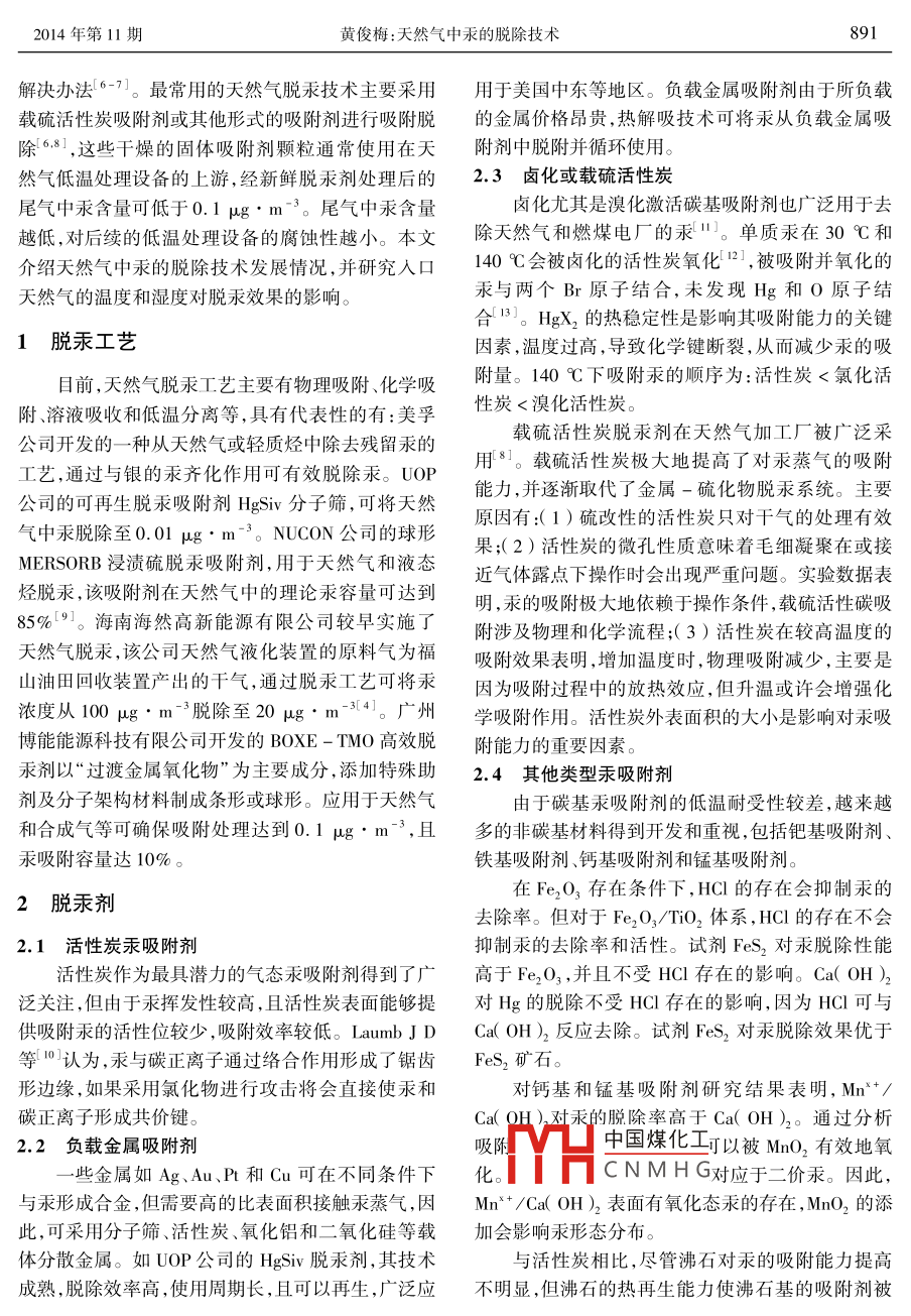 2014年11月工業(yè)催化第22卷第1期INDUSTRIAL CATALYSIS環(huán)境保護與催化天然氣中汞的脫除技術(shù)黃俊梅(上海市閔行區(qū)環(huán)境監(jiān)測站,上海201100)摘要:鑒于環(huán)保、設(shè)備安全以及人身健康的要求,有效脫除天然氣中汞的應(yīng)用技術(shù)日漸受到重視。簡述了物理吸附、化學(xué)吸附、溶液吸收和低溫分離等具有代表性的夭然氣脫汞的工芑進展。對活性炭汞吸附劑、負(fù)載金屬吸附劑、鹵化或載硫活性炭和其他類型汞吸附劑在天然氣中汞脫除的應(yīng)用進展進行了闡述。研究了入口天然氣的溫度和濕度對脫汞效果的影響,較低的溫度和濕度有利于汞的脫除。關(guān)鍵詞:能源化學(xué);天然氣;汞;脫汞工藝;脫汞劑doi:10.3969/j.isn.1008-1143.2014.11.017中圖分類號:TQ517.5;TQ426.99文獻標(biāo)識碼:A文章編號:1008-1143(2014)108903Progress in mercury removal technologies for natural gasHUANG JunmeiShanghai Minhang Enviromental Monitoring Station, Shanghai 201100, ChinaAbstract: The application techniques of effective removal of mercury in natural gas have received muchattention due to the requirements for environmental protection, equipment safety and human health. In thispaper, the advance in several typical removal technologies of mercury in natural gas such as physicaladsorption, chemical adsorption, solution absorption and low temperature separation was briefly reviewedThe application progress in the existing mercury removalagentsfor the removal of mercury in natural gasincluding active carbon mercury adsorbents, supported metal adsorbents, halogenated or sulfur loadingcarbon and other mercury adsorbents, was summaried. The influence of temperature and humidity ofnatural gas in inlet on the effect of mercury removal was investigated. It was pointed out that low temperature and humidity were benificial to mercury removalKey words: energy chemical; natural gas; mercury demercuration process; mercury removal agentdoi:10.3969/j.isn.1008-1143.2014.11.017CLC number: TQ517 5: TQ426 99 Document code: A Article ID: 1008-1143( 2014 )11-0890-03天然氣燃燒后無廢渣和廢水產(chǎn)生,相對于煤炭的健康問題,同時也會導(dǎo)致天然氣處理過程中的催和石油等能源具有使用安全、熱值髙及潔凈等優(yōu)勢,化劑中毒、腐蝕設(shè)備以及污染環(huán)境。即使很少量的近年來,其開采和需求量急劇上升。但很多天然氣汞也會對天然氣低溫處理過程中的鋁合金設(shè)備產(chǎn)生田均存在汞,濃度通常在(1~200)gg:m-3,有的腐中國煤個件下,由于汞誘發(fā)的鋁高達(dá)1000μg·mCNMH汞及其化合物均為劇毒物質(zhì),不僅會引起嚴(yán)重且按水八們T是公認(rèn)的較為可行的收稿日期:2014-06-06作者簡介:黃俊梅,1971年生,工程師,分析室主任,從事環(huán)境監(jiān)測。2014年第11期黃俊梅:天然氣中汞的脫除技術(shù)解決辦法6-7。最常用的天然氣脫汞技術(shù)主要采用用于美國中東等地區(qū)。負(fù)載金屬吸附劑由于所負(fù)載載硫活性炭吸附劑或其他形式的吸附劑進行吸附脫的金屬價格昂貴,熱解吸技術(shù)可將汞從負(fù)載金屬吸除8,這些干燥的固體吸附劑顆粒通常使用在天附劑中脫附并循環(huán)使用。然氣低溫處理設(shè)備的上游,經(jīng)新鮮脫汞劑處理后的2.3鹵化或載硫活性炭尾氣中汞含量可低于0.1g:m-3。尾氣中汞含量鹵化尤其是溴化激活碳基吸附劑也廣泛用于去越低,對后續(xù)的低溫處理設(shè)備的腐蝕性越小。本文除天然氣和燃煤電廠的汞。單質(zhì)汞在30℃和介紹天然氣中汞的脫除技術(shù)發(fā)展情況,并研究入口140℃會被鹵化的活性炭氧化12,被吸附并氧化的天然氣的溫度和濕度對脫汞效果的影響。汞與兩個Br原子結(jié)合,未發(fā)現(xiàn)Hg和O原子結(jié)合B3。HgX2的熱穩(wěn)定性是影響其吸附能力的關(guān)鍵脫汞工藝因素,溫度過高,導(dǎo)致化學(xué)鍵斷裂,從而減少汞的吸目前,天然氣脫汞工藝主要有物理吸附、化學(xué)吸附量。140℃下吸附汞的順序為:活性炭<氯化活附溶液吸收和低溫分離等具有代表性的有:美孚性炭<溴化活性炭。公司開發(fā)的一種從天然氣或輕質(zhì)烴中除去殘留汞的載硫活性炭脫汞劑在天然氣加工廠被廣泛采工藝,通過與銀的汞齊化作用可有效脫除汞。UO用8。載硫活性炭極大地提高了對汞蒸氣的吸附公司的可再生脫汞吸附劑 Hgsiy分子篩,可將天然能力,并逐漸取代了金屬一硫化物脫汞系統(tǒng)。主要氣中汞脫除至0.01μg·m3。 NUCON公司的球原因有:(1)硫改性的活性炭只對干氣的處理有效果;(2)活性炭的微孔性質(zhì)意味著毛細(xì)凝聚在或接MERSORB浸漬硫脫汞吸附劑,用于天然氣和液態(tài)近氣體露點下操作時會出現(xiàn)嚴(yán)重問題。實驗數(shù)據(jù)表烴脫汞,該吸附劑在天然氣中的理論汞容量可達(dá)到明,汞的吸附極大地依賴于操作條件,載硫活性碳吸85%9。海南海然高新能源有限公司較早實施了附涉及物理和化學(xué)流程;(3)活性炭在較高溫度的天然氣脫汞,該公司天然氣液化裝置的原料氣為福吸附效果表明,增加溫度時,物理吸附減少,主要是山油田回收裝置產(chǎn)出的干氣,通過脫汞工藝可將汞因為吸附過程中的放熱效應(yīng),但升溫或許會增強化濃度從100脫除至20g·m234。廣州學(xué)吸附作用?;钚蕴客獗砻娣e的大小是影響對汞吸博能能源科技有限公司開發(fā)的BOXE-TMO高效脫附能力的重要因素。汞劑以“過渡金屬氧化物”為主要成分,添加特殊助2.4其他類型汞吸附劑劑及分子架構(gòu)材