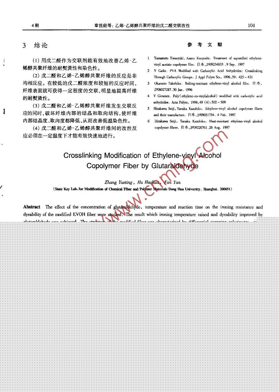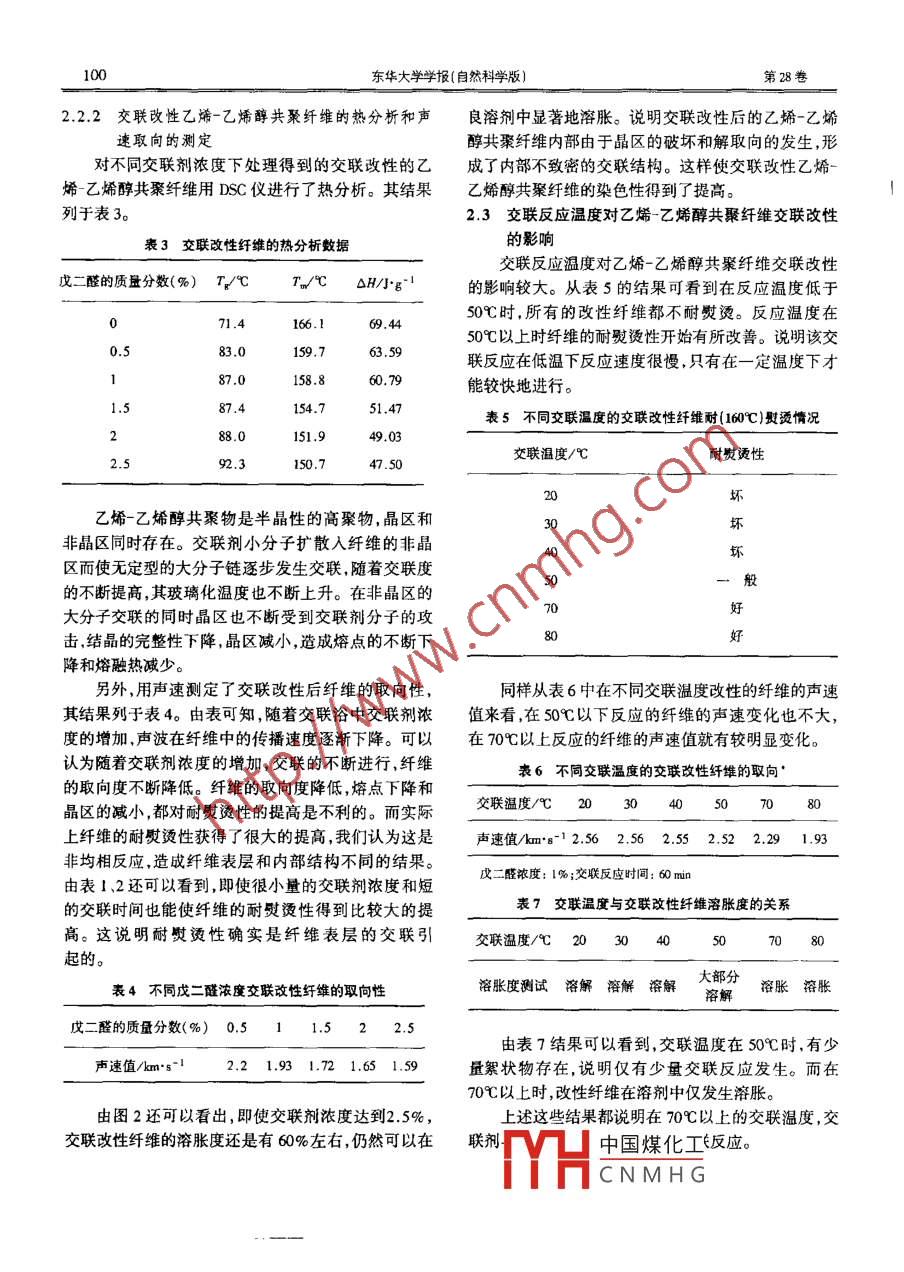 第28卷第4期東華大學(xué)學(xué)報(bào)(自然科學(xué)版)Val. 28, No.42002年8月JOURNAL OF DONG HUA UNIVERSITYAug. 2002乙烯-乙烯醇共聚纖維的戊二醛交聯(lián)改性章悅庭胡紹華樊巖(東華大學(xué)纖維材料政性國家重點(diǎn)實(shí)驗(yàn)室,上海2001)摘要通過對戊二醛的用量、交聯(lián)反應(yīng)時(shí)間和 交聯(lián)溫度對乙烯乙烯醇共聚纖維的耐熨燙性和染色性的影響的研究,認(rèn)為用戊二醛改性能有效地提高纖維的耐熨燙溫度和降低染色溫度。測定了交聯(lián)改性纖維的力學(xué)性能、聲速取向、溶脹度、熱性能,證實(shí)耐熨燙性的提高是表西交聯(lián)的結(jié)果,染色性的改進(jìn)是內(nèi)部結(jié)構(gòu)的破壞所造成。關(guān)鍵詞:己烯-乙烯醇,戊二醛,交聯(lián)中圖法分類號(hào): 0 62A用乙烯-乙烯醇共聚物紡制的纖維具有吸濕性1.2纖維紡制及 交聯(lián)改性好、放濕性好和光學(xué)透明的優(yōu)點(diǎn),但該纖維有不耐蒸在Fuji Filer MSTC - 100小型紡絲機(jī)上紡制乙烯-氣熨燙和低溫染色性差、不能進(jìn)行高溫高壓染色的缺乙烯醇共聚物初生纖維,然后把該纖維浸入所配的交點(diǎn),限制了其在服裝方面的應(yīng)用。對聚合物進(jìn)行交聯(lián)聯(lián)劑浴中進(jìn)行交聯(lián)改性。改性是提高聚合物聚玻璃化溫度( rg).提高聚合物耐1.3交聯(lián)纖維的性 能表征熱性的有效方法,國內(nèi)外研究人員對乙烯-乙烯醇共力學(xué)性能測試:用YG00IA型電子強(qiáng)力儀。拉伸聚物的交聯(lián)改性作了大量的研究(1-4]。近年,國外的速度: 60 mm/min,夾距10 mm,環(huán)境溫度: 20C。研究人員對纖維改性也作了研究[5.6]。聲速取向測定:用SYC-II型聲速儀。纖維夾距:.為了提高乙烯-乙烯醇共聚纖維的耐蒸氣熨燙性200.400 mm兩檔,環(huán)境溫度: 209C。和改善其低溫染色性、克服不耐高壓高溫染色的缺溶脹度的測定:以二甲基亞砜為溶劑。試驗(yàn)條點(diǎn)。本研究用戊二醛作為交聯(lián)改性劑,對乙烯-乙烯件: 70C ,24 h熱性能測試:用美國Perkin-Elmer DSC - 4型差示醇共聚纖維進(jìn)行非均相的交聯(lián)改性。討論了交聯(lián)液掃描量熱儀,升溫速度: 10C ●min~' ,測試氣氛:氮?dú)狻舛?、交?lián)時(shí)間對耐熨燙性和染色性的影響,同時(shí)通耐熨燙性測定:用溫控電熨斗在不同溫度對濕纖過對交聯(lián)改性纖維的熱性能、取向、溶漲性和力學(xué)性維束進(jìn)行壓燙,觀察纖維的粘連變形情況。評價(jià)標(biāo)能的測定和分析。證實(shí)了戊二醛的非均相反應(yīng)使纖準(zhǔn):好:纖維完全無粘并與收縮;一般:無粘并,手感維表面有高的交聯(lián)密度的同時(shí)降低了內(nèi)部結(jié)晶度、取向硬;差:輕度粘附;壞:完全粘并,收縮成團(tuán)。度,使乙烯~乙烯醇共聚纖維獲得了優(yōu)良的耐熨燙性和染色試驗(yàn):染色液組分:分散藍(lán)10 mg/L, HAc低溫染色性。同時(shí)明白,交聯(lián)改性對纖維的力學(xué)性能改6g/L,NaAc2g/L。取- -束一定長度纖維放人100C染變不大,使乙烯-乙烯醇共聚纖維具有服用價(jià)值。浴中染色10 min。從染浴中取出上染的纖維,在清水中洗滌除去浮色,比較色澤深淺。1實(shí)驗(yàn)部分結(jié)果與討論1.1 主要原料乙烯-乙烯醇樹脂(乙烯含量44 mol% )進(jìn)口。2.1戊二醛的交聯(lián)條件對纖維耐熨燙性 、染色性的影響戊二醛、鹽酸、二甲基亞砜等市售試劑。戊二醛可以和乙烯-乙烯醇共聚物的羥基進(jìn)行交收稿口期: 2001-05-09中國煤化工MHCNMHG4期章悅庭等:乙烯-乙烯醇共聚纖維的戊二醛交聯(lián)改性99聯(lián)反應(yīng),從而限制大分子鏈的運(yùn)動(dòng),提高共聚物的Tg, .耐熨燙性和染色性的同時(shí)勢必會(huì)改變纖維的力學(xué)性提高纖維的耐熨燙性。能。通過對纖維的強(qiáng)力的測試,發(fā)現(xiàn)交聯(lián)后纖維的強(qiáng)表1.2分別是不同戊二醛的依度和不同反應(yīng)時(shí)間力會(huì)有所提高,最大變化率在10%以下,因此,不會(huì)使對乙烯-乙烯醇共聚纖維熨燙性的影響。從表所列結(jié)服用性能有很大的改變。果可看出纖維的耐熨燙性隨戊二醛的濃度的增加和一般來說,聚合物交聯(lián)程度的增加會(huì)使強(qiáng)力提反應(yīng)時(shí)間的延長而得到提高。此外還可以明白,即使高。因此,纖維的力學(xué)性能的變化也可反映出纖維交在低的交聯(lián)劑濃度下和短的反應(yīng)時(shí)間的交聯(lián)反應(yīng)條聯(lián)程度的改變。從圖1可知,隨著交聯(lián)劑濃度的增加,件下,也可得到一定的耐熨燙的效果。斷裂強(qiáng)力是隨著戊二醛濃度的增加而提高。這說明表1不同濃度戊二難的交聯(lián) 改性纖維的耐熨燙性隨著交聯(lián)劑的濃度增加,纖維的交聯(lián)度也不斷提高。同樣,隨著交聯(lián)反應(yīng)時(shí)間的增加,纖維交聯(lián)度也提高。耐熨費(fèi)性醛( %)160心170C180C200C1. 16-1.14-壞號(hào)1.120.5好差弓1.10一般鍋. 1.081.5婦癌1.062.0.02.5戊二醛的質(zhì)最分?jǐn)?shù)(%)該纖維為術(shù)經(jīng)后拉伸的初生纖維注:反應(yīng)時(shí)間為60 min圖1交聯(lián)劑濃度 與改性纖維的強(qiáng)力關(guān)系表2不同交聯(lián)時(shí)間的纖維的耐熨燙性交聯(lián)度不是太高的交聯(lián)聚合物可以在良溶劑中耐熨燙性發(fā)生溶脹。因此,也可以用溶脹度的大小來表征交聯(lián)交聯(lián)時(shí)間/mi160度的大小。圖2為戊二醛濃