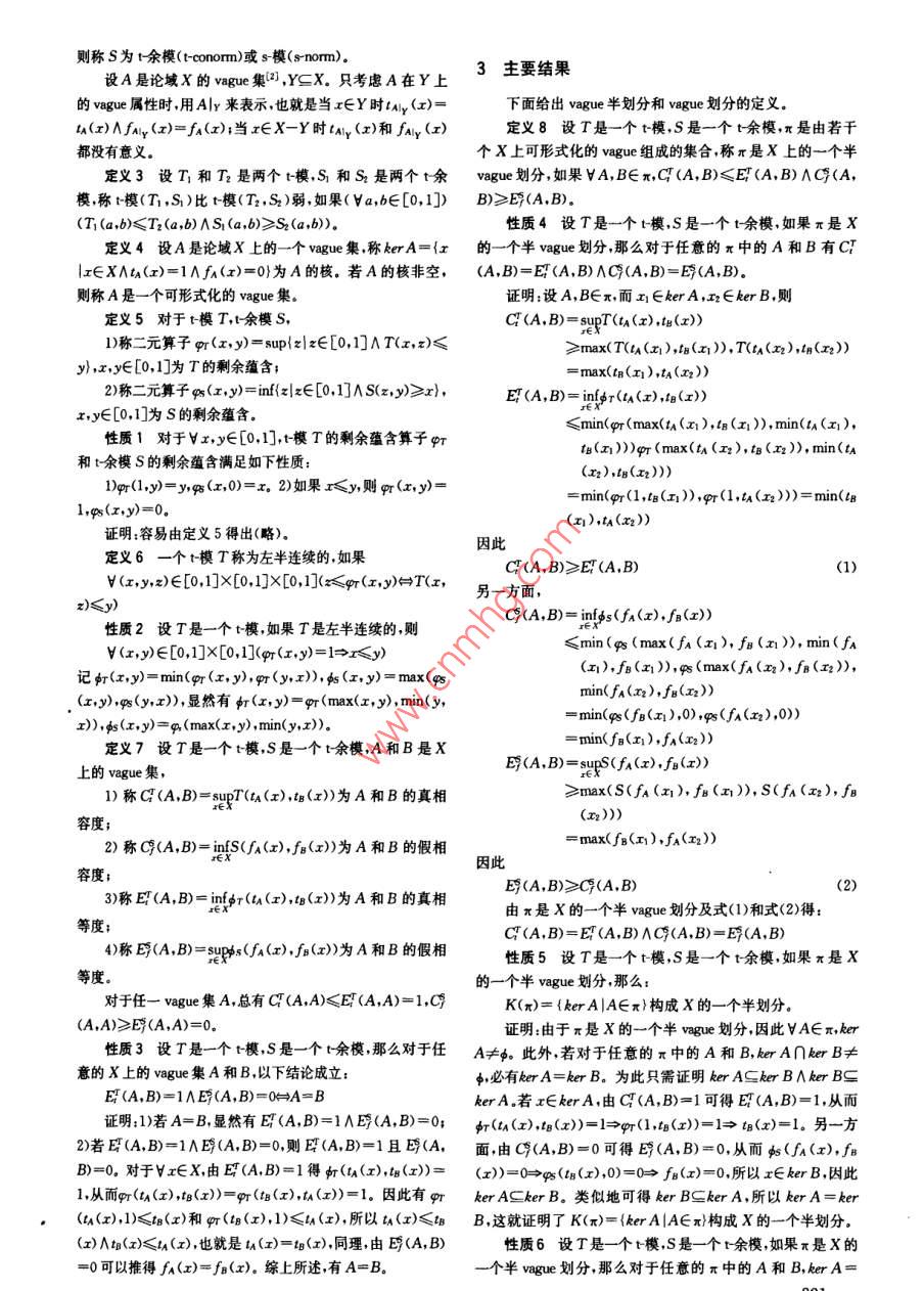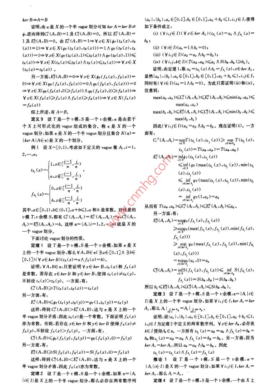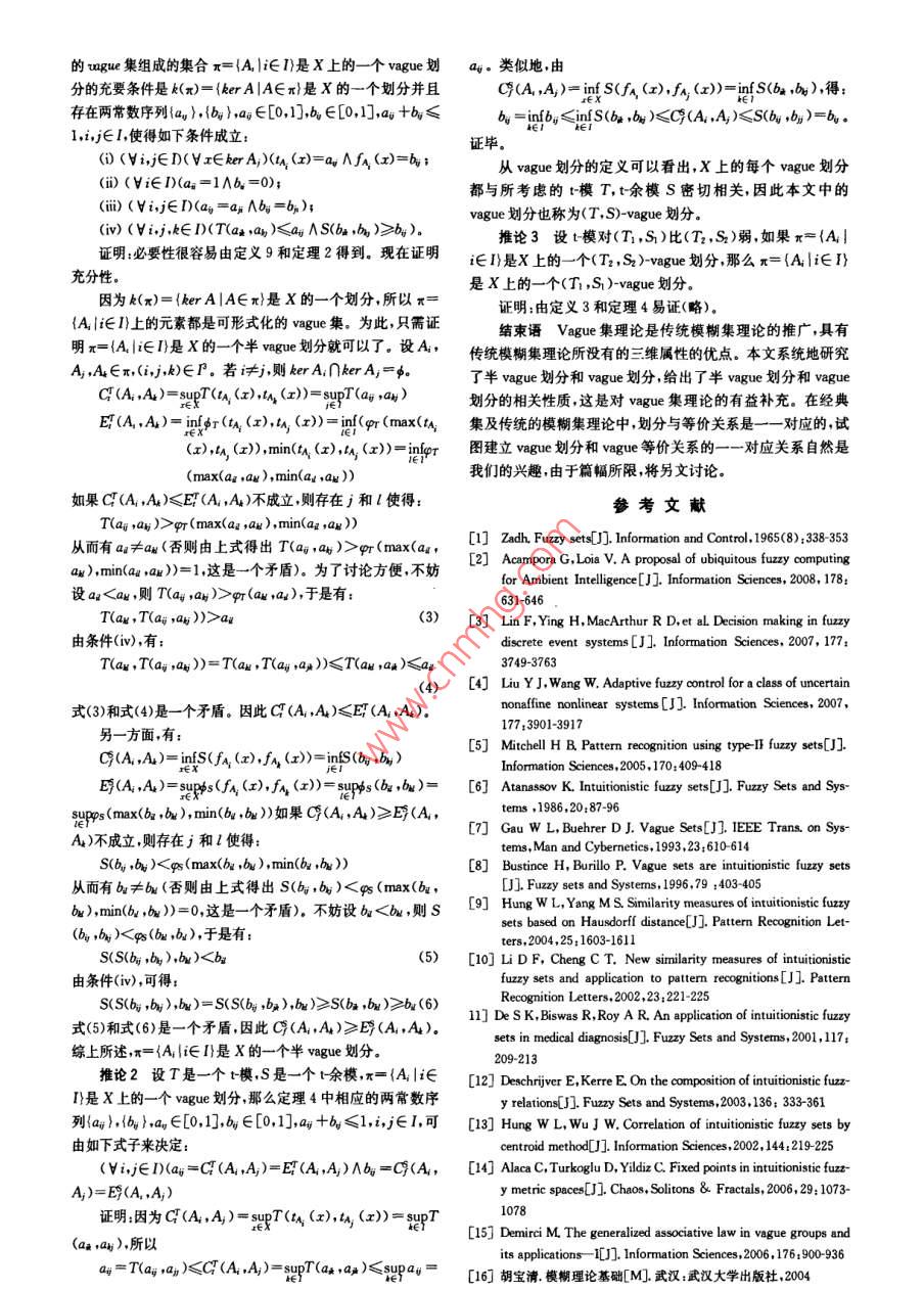 第36卷第11期計箅機科學(xué)ol.36209年11月Computer ScienceVague劃分梁家榮劉力2伍華健廣西大學(xué)計算機與電子信息學(xué)院南寧53004)(玉林師范學(xué)院數(shù)學(xué)與計算機科學(xué)系玉林5370002摘要根據(jù)vgue集具有真假隸屬度的特點,首先提出了基于t模和t余模的真相容度、假相容度、真相等度和假相等度的概念。然后合理地利用真相容度、假相容度、真相等度和假相等度提出了半 vague劃分和 vague劃分的概念,并討論了它們的性質(zhì)。關(guān)鍵詞t模,t余模,剩余蘊含,半 vague劃分, vague劃分LIANG Jia-rong LIU Li' WU Hua-jianSchool of Computer and Electronic, Guangxi University. Nanning 530004. China)Department of Mathematics and Computer Science, Yulin Normal University, Yulin 537000, China)2Abstract The concepts of degree of truth-compatibility, degree of false -compatibility degree of truthrequality, degreefalse-equality based on t-norm and t-conorm were introduced, because a vague set has the characteristic of truthmembership function and fase-membership function. Futhermore we presented the concepts of semivague partitions andvague partitions by using locically degree of truth compatibility, degree of false-compatibility degree of truthrequality,degree of false-equality, and we investigated the characters of semi-vague partitions and vague partitions.Keywords t-norm, t-conorm, Semi-vague partion, Vague partion此把經(jīng)典集合劃分理論、模糊劃分理論推廣到 vague集理論,1引言是一種很自然的想法。然而遺憾的是完整 vague劃分理論近年來,人工智能從研究內(nèi)容到研究方法都有了很大的尚未建立起來使得 vague集理論應(yīng)用到智能決策、人工智能發(fā)展研究人工智能的工具也在不斷地發(fā)展。作為處理不完及模式識別等領(lǐng)域受到了一定程度的限制。本文考慮到整和不完全信息智能系統(tǒng)的重要工具,模糊集理論自從 vague集有真假隸屬度的特點,系統(tǒng)地研究了半 vague劃分和Zaden于1965年提出后1,其理論和應(yīng)用(例如在自動控制、 vague劃分及其關(guān)系,成功地解決了 vague集理論在劃分方面模式識別智能決策)取得了巨大的成就2。在傳統(tǒng)的模糊的不足,對豐富和發(fā)展 vague集理論具有重要的學(xué)術(shù)意義集中,一個元素x與一個集合X之間的關(guān)系由一個介于[01]之間的數(shù)(x)來表示它包含了支持和反對這一對象x隸2準備工作屬于集合X的程度但無法表達既不反對也不支持這一對象定義111映射T:[0,1]×[0,1]→[0,訂],如果va,b,x隸屬于集合X的中立情況給許多實際問題(如投票模型、c,d∈[0,1]滿足條件醫(yī)療診斷和多目標決策等)的研究和處理帶來了困難。為了(1)交換律:T(a,b)=T(b,a)解決這一問題,1986年 Atanassov提出了所謂的直角模糊(2)結(jié)合律:T(T(a,b),c)=T(a,T(b,c))集。 Atanassov提出用真隸屬度t和假隸屬度f兩個量來(3)單調(diào)性:a≤c,長≤dT(a,b)≤T(c,d)描述一個對象x和一個集合X之間的隸屬關(guān)系。后來,1993(4)邊界條件:T(1,a)=a年Gau和 Buehrer定義了一個所謂的 vague集。值得指出則稱T為t模(tnom)的是, Bustince和Burl在文獻[8]中證明 vague集就是直覺定義216映射S:[0,1]×[0,1][0,1,如果va,b,c模糊集。雖然, vague集理論和應(yīng)用已取得了一定的發(fā)d∈[o,1]滿足條件展),但與經(jīng)典集合理論和傳統(tǒng)的模糊集理論相比 vague(1)交換律:S(a,b)=S(b,a)集理論還有許多不盡完善的地方例如 vague劃分的相關(guān)理(2)結(jié)合律:S(S(ab),c)=S(aS(b,c)論目前少有文獻報道。由于經(jīng)典集合劃分理論模糊劃分等(3)單調(diào)性:a≤c,≤d→S(a,b)≤S(c,d工具已在數(shù)據(jù)挖掘和決策分類中起到了極為重要的作用因(4)邊界條件:S(a,0)=a到稿日期:20081224返修日期:20090227本文受國家自然科學(xué)基金項目(60564001),教育部“新世紀優(yōu)秀人才支持計劃”專項(NCET06-0756)廣西自然科學(xué)基金項目(桂科自0832286)資助,橐家榮(1966-),男,博土,博士后教授,主要研究方向為人工智能數(shù)據(jù)挖掘模糊控制E-mail:liangir@gxu.edu.cn;劉力(1957-),男碩士教授,主要研究方向為人工智能智能控制;伍華健(1965-)男碩士教授主要研究方向為人工智能網(wǎng)絡(luò)可幕性分析則稱S為t余模( t-conom)或s模(snom)設(shè)A是論域X的 vague集(2),YsX。只考慮A在Y上3主要結(jié)果的 vague屬性時用Aly來表示,也就是當x∈Y時tAy(x)=下面給出 vague半劃分和 vague劃分的定義4(x)AfAy(x)=A(x);當xX-¥時tAy(x)和fAy(x)定義8設(shè)T是一個t模,S是一個t余模,是由若干都沒有意義個X上可形式化的 vague組成的集合,稱π是X上的一個半定義3設(shè)T和T2是兩個t模S1和S2是兩個t余 vague劃分,如果vA,B∈x,C(A,B)≤E(A,B)∧C(A,模稱t模(T1,S1)比t模(T2,S2)弱如果(Va,b∈[0,1])B)≥E(A,B)(T(ab)≤T2(a,b)∧S1(a,b)≥S2(a,b))。性質(zhì)4設(shè)T是一個t模,S是一個t余模,如果是X定義4設(shè)A是論域X上的一個 vague集稱kerA={x的一個半 vague劃分,那么對于任意的x中的A和B有Crx∈XAtA(x)=1AfA(x)=0}為A的核。若A的核非空,(A,B)=E(A,B)A(AB)=E(A,B)則稱A是一個可形式化的 vague集證明:設(shè)A,B∈x,而x1∈kerA,x2∈kerB,則定義5對于t模Tt余模S,C(A, B)=supT(tA(x),t(r))1)稱二元算子gr(x,y)=sup{zz∈[0,1]AT(x,z)≤>max(T(IA(xI), tB(xr)), T(A(x),tg(x2))y},x,y∈[0,1]為T的剩余蘊含=max(ta(r,),ta(xz))2)稱二元算子w(x,y)=mf∈[0,1AS(z,y)≥x},E(A, B)=infAr(tA(r),tB(r))xy∈[0,1]為S的剩余蘊含。S(b, bu)>b(6)Recognition Letters. 2002, 23: 221-225式(5)和式(6)是一個矛盾,因此G(A,A)≥E(A,A)11 De S K, Biswas R, Roy A R. An application of intuition