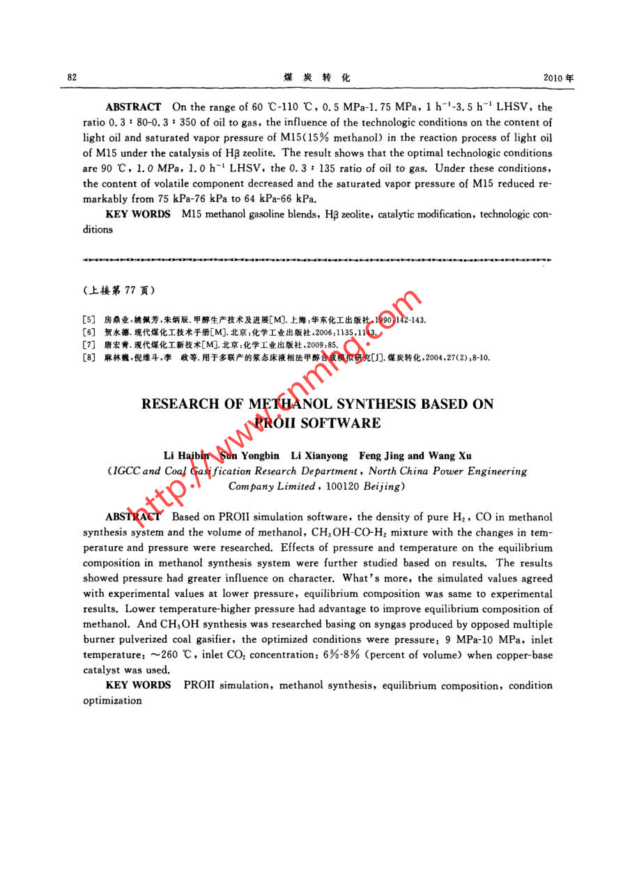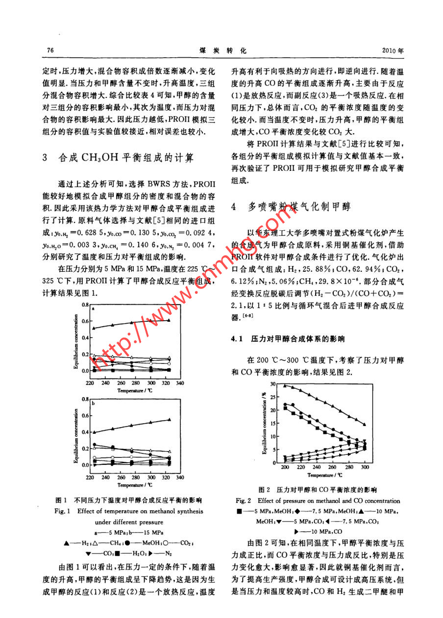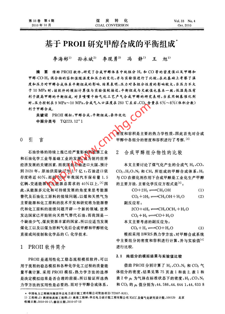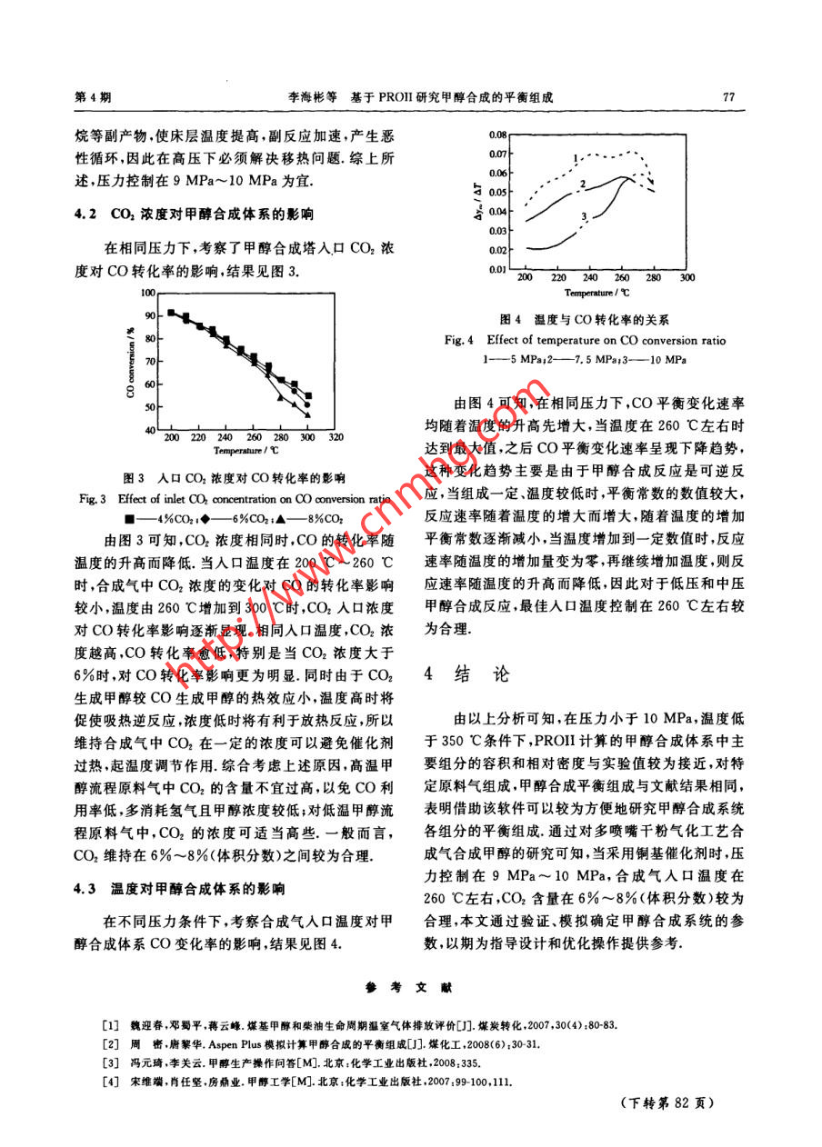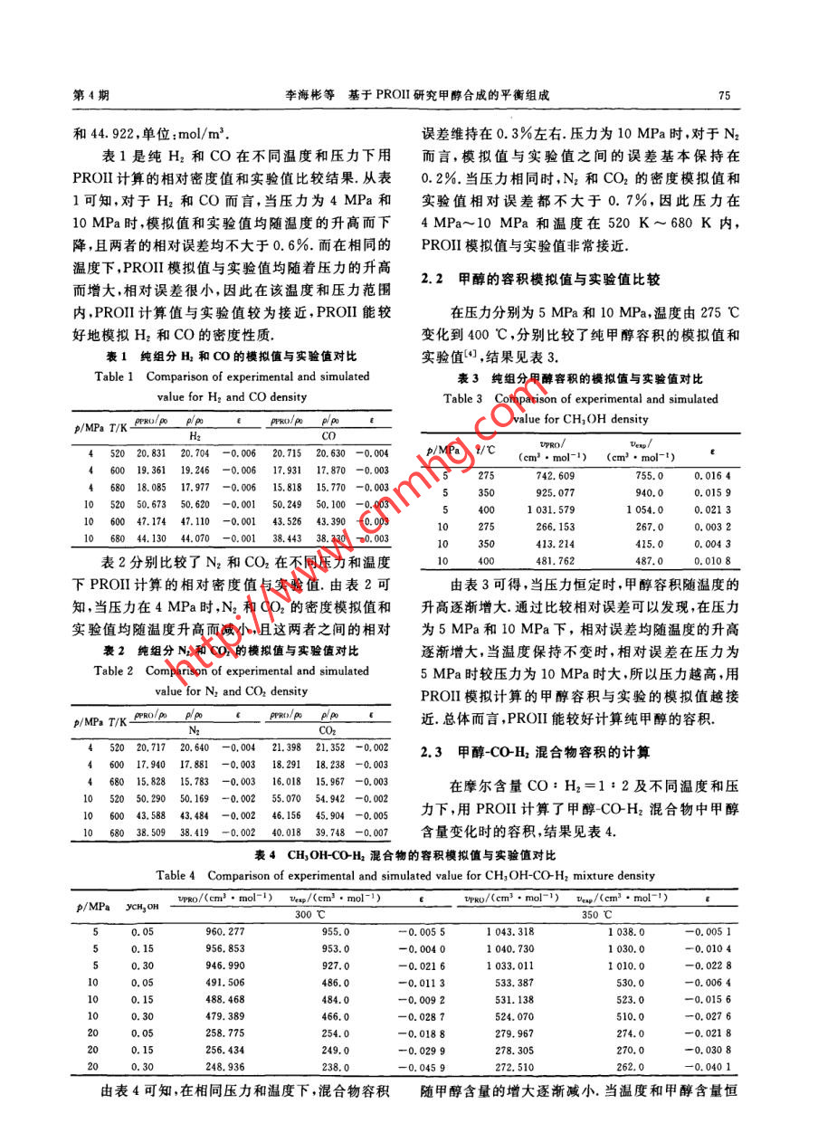 第33卷第4期煤炭轉(zhuǎn)化Vol. 33 No.42010年10月COAL. CONVERSIONOct. 2010基于PROII研究甲醇合成的平衡組成“李海彬)孫永斌3)李現(xiàn)勇3) 馮靜"王旭摘要 借助PROII 軟件,研究了合成甲醇體系中純組分H2和CO等的密度值以及甲醇和.甲醇-CO-H2混合物的容積值隨溫度和壓力的變化,并與實(shí)驗(yàn)值進(jìn)行了比較,在此基礎(chǔ)上考察了溫度和壓力對(duì)甲醇合成體系平衡組成的影響.結(jié)果表明,壓力對(duì)各組分性質(zhì)的影響較大,當(dāng)壓力不大于10 MPa時(shí),該軟件的模擬計(jì)算值與實(shí)驗(yàn)值較接近,平衡組成與文獻(xiàn)值也基本-致,低溫高壓有利于提高甲醇的平衡組成.對(duì)多噴嘴干粉氣化工藝產(chǎn)氣合成甲醇的研究表明,當(dāng)采用銅基催化劑時(shí),壓力控制在9 MPa~10 MPa,合成氣入口溫度在260 C左右,CO2含量在6%~8%(體積分?jǐn)?shù))利于甲醇合成.關(guān)鍵詞PROII 模擬,甲醇合成,平衡組成,條件優(yōu)化中圖分類號(hào)TQ223. 12+1密度和容積是主要的熱力學(xué)性質(zhì),因此首先對(duì)合成0引言甲醇中各組分的密度和容積進(jìn)行了考察. [2]石油價(jià)格的持續(xù)上漲已經(jīng)嚴(yán)重影響到能源工業(yè)2合成甲醇組分物性的比較和石油化學(xué)工業(yè)等基礎(chǔ)工業(yè)的發(fā)展,成為制約世界經(jīng)濟(jì)發(fā)展的關(guān)鍵因素.而我國(guó)是石油進(jìn)口大國(guó),預(yù)計(jì)本文主要討論了煤氣化產(chǎn)生的合成氣H2,CO,到2020年,原油供需缺口為2.7億t,石油進(jìn)口依CO2,H2O,N2和CH,所組成的甲醇合成體系,H2存度將近60%,而到2020年我國(guó)汽車保有量1.5與CO在催化劑作用下合成甲醇是工業(yè)化生產(chǎn)甲醇億輛,交通能源約占能源總需求的40%以上.因的主要方法.主要化學(xué)反應(yīng)方程式是C]:此,從能源多元化和可持續(xù)發(fā)展的角度來(lái)思考能源CO+2H, = =CH,OH(1)替代及石油化工原料的接續(xù)問(wèn)題,以煤和天然氣為CO2 +3H2 - CHOH+ H2O(2) .主要能源和化工原料的技術(shù)開(kāi)發(fā)和研究將為能源替副反應(yīng)有:代和化工原料的接續(xù)問(wèn)題開(kāi)辟一個(gè)新的領(lǐng)域.世界2CO+4H2一CHOCH3 + H2O發(fā)達(dá)國(guó)家已開(kāi)始轉(zhuǎn)向天然氣替代石油,而我國(guó)是一CO2+H2 = =CO+ H2O個(gè)缺油少氣、煤炭資源豐富的國(guó)家,所以應(yīng)適當(dāng)發(fā)展本文主要考慮的副反應(yīng)為:煤化工以及以煤為原料氣化后合成甲醇和甲醇轉(zhuǎn)化CO2+H2一CO+H2O(3)直接或間接制取化學(xué)品的C化學(xué)技術(shù).模擬采用BWRS熱力學(xué)方法,對(duì)甲醇合成系統(tǒng)中主要組分的密度和容積進(jìn)行計(jì)算,并與實(shí)驗(yàn)值(1]1 PROII軟件簡(jiǎn)介進(jìn)行比較.PROII是通用性化工穩(wěn)態(tài)流程模擬軟件,可以.2.1純組分的模擬結(jié)果與實(shí)驗(yàn)值比較用于流程的穩(wěn)態(tài)模擬和各種化學(xué)化工過(guò)程的質(zhì)量能借助PROII分別計(jì)算了H2,CO,N2和CO2氣量平衡計(jì)算.采用PROII模擬,熱力學(xué)方法的選撣體組分的密度,結(jié)果見(jiàn)第75頁(yè)表1和表2.表1和是決定模擬結(jié)果是否合理的前提,所以驗(yàn)證所選熱表2中Po為氣體在標(biāo)準(zhǔn)狀態(tài)下的密度,H2 ,CO,N2力學(xué)方法的實(shí)用性是必要的.而對(duì)于甲醇合成體系,和COr的po值分別為:44.586,44. 644 1,44. 633 8*中國(guó)電力工程顧問(wèn)集團(tuán)華北電力設(shè)計(jì)院工程有限公司資助項(xiàng)目(Y2007-A31).1)工程師;2)教授級(jí)高級(jí)工程師;3)高級(jí)工程師,華北電力設(shè)計(jì)院工程有限公司IGCC及煤氣化研究設(shè)計(jì)院,100120北京收?8期:2010-05-17;修回8期:2010-07-13第4期李海彬等基于PROII研究甲醇合成的平衡組成75和44. 922,單位: mol/m*.誤差維持在0.3%左右.壓力為10 MPa時(shí),對(duì)于N2表1是純H2和CO在不同溫度和壓力下用.而言,模擬值與實(shí)驗(yàn)值之間的誤差基本保持在PROII計(jì)算的相對(duì)密度值和實(shí)驗(yàn)值比較結(jié)果.從表0.2%.當(dāng)壓力相同時(shí),N2和CO2的密度模擬值和1可知,對(duì)于H2和CO而言,當(dāng)壓力為4 MPa和實(shí)驗(yàn)值相對(duì)誤差都不大于0.7%,因此壓力在.10MPa時(shí),模擬值和實(shí)驗(yàn)值均隨溫度的升高而下4 MPa~10 MPa和溫度在520 K~680 K內(nèi),降,且兩者的相對(duì)誤差均不大于0.6%.而在相同的PROII模擬值與實(shí)驗(yàn)值非常接近.溫度下,PROII模擬值與實(shí)驗(yàn)值均隨著壓力的升高2.2甲醇的容 積模擬值與實(shí)驗(yàn)值比較而增大,相對(duì)誤差很小,因此在該溫度和壓力范圍內(nèi),PROII計(jì)算值與實(shí)驗(yàn)值較為接近,PROII能較在壓力分別為5 MPa和10 MPa,溫度由275 C好地模擬H2和CO的密度性質(zhì).變化到400C,分別比較了純甲醇容積的模擬值和.表1純組分H;和co的模擬值與實(shí)驗(yàn)值對(duì)比實(shí)驗(yàn)值[1,結(jié)果見(jiàn)表3.Table 1 Comparison of experimental and simulated表3純組分甲醇容積的模擬值與實(shí)驗(yàn)值對(duì)比value for H。and CO densityTable 3 Comparison of experimental and simulatedp/MPa T/K-PRu/po_ p/po_PrR0/po p/povalue for CHzOH densityH2COrpRo/Vex/520 20.831 20.704-0.006 20.715 20.630-0.004p/MPa t/C(cm'●mol-1) (cm’ ●mol-1)‘600 19.361 19.246 -0.006 17.931 17.870 -0.003275742.609755.00.016 4680 18.085 17.977 -0.006 15.818 15.770 -0. 003350925. 077940.00.015910 520 50.673 50.620 -0.00 50.249 50.100 -0.003001 031. 5791 054.00.021310 6