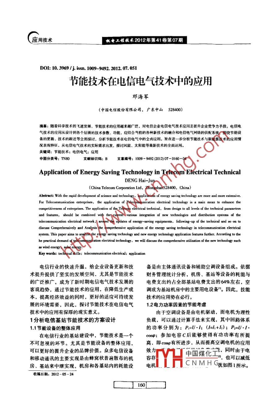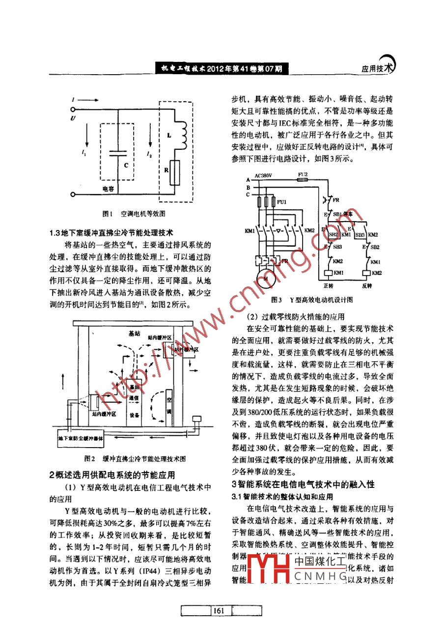 (應(yīng)用技術(shù)機(jī)電工程技術(shù)2012年第41卷第07期DOI: 10. 3969 1j. issn. 1009- -9492. 2012. 07. 051節(jié)能技術(shù)在電信電氣技術(shù)中的應(yīng)用鄧海軍(中國電信股份有限公司,廣東中山528400)摘要:隨著科學(xué)技術(shù)的飛速發(fā)展,節(jié)能技術(shù)的應(yīng)用越來越r“泛對電信企業(yè)電信電氣枝術(shù)應(yīng)用是提升企業(yè)競爭力手段。電信電氣技術(shù)的應(yīng)用從設(shè)計(jì)到各個(gè)層面的技術(shù)參數(shù)、功能,應(yīng)結(jié)合當(dāng)前的各種新技術(shù)的融合和電信電氣網(wǎng)絡(luò)的供配系統(tǒng),圍繞節(jié)能設(shè)備的更新、技術(shù)的跟進(jìn)等全面探討,分析節(jié)能技術(shù)在電信電氣中的全面應(yīng)用。旨在進(jìn)- -步分析節(jié)能技術(shù)與新能源技術(shù)的應(yīng)用情況表現(xiàn)特征,從電信電氣技術(shù)的實(shí)際需求出發(fā),探討風(fēng)能、太陽能等最新技術(shù)的全面運(yùn)用。關(guān)鍵詞:節(jié)能技術(shù);電信電氣;應(yīng)用中團(tuán)分類號: TN8O文獻(xiàn)標(biāo)識碼: B文章編號: 1009 - 9492 (2012)07 - 0160-04Application of Energy Saving Technology in Telecom Electrical TechnicalDENG Hai-Jun(China Telecom Corporain Lid, ZhongshanS28400, China)Abstract: With the rmpid developmeat of science and technology., aplications of energy saving lehenologyog are moure and more extenive.For Telecommunication enlerprisas, the application of Telecommunication electricad technology is a main mean to enhance thconmpetitiveness of enterprises. The application of thelecom eletrical technical, from design to all levels of the techrnical parametersand features, should be combined with the curent verious itegration of new technologes and distribution Bytems of thetelecommunication electrical nctwors, around the updates of energy-saving equipment, fllowing-up of the tchnical and駟四t如discus Comprehensively and Analysis the compchensive application of the energy saring technology in tecomunication eletricalsystem. This paper aims to analyze the enengy saring technology and new energy technology application features further, Acording to thehe practical demand of lelecommunication electrical technology. we will discus the comprehensive utilization of the new technology such品wind energy, solar energy.Key words: technical aill; tleomunication lectrical; aplicaion電信行業(yè)的快速升溫,給企業(yè)設(shè)備更新和技備是由主體通訊設(shè)備和輔助空調(diào)設(shè)備組成。依據(jù)術(shù)提升提供了堅(jiān)實(shí)的發(fā)展空間,尤其是節(jié)能技術(shù)財(cái)務(wù)管理統(tǒng)計(jì)分析,機(jī)房、基站等設(shè)備的耗能與的廣泛推廣,成為了新時(shí)期電信電氣技術(shù)發(fā)展的電費(fèi)支出約占全部基站電費(fèi)支出的64%左右,空客觀趨勢,通過節(jié)能技術(shù)的應(yīng)用,在降低生產(chǎn)成調(diào)成為基站機(jī)房中的主要用電設(shè)備"。因此,技能本,提高經(jīng)濟(jì)效益的同時(shí),,更好的適應(yīng)可持續(xù)發(fā)技術(shù)的應(yīng)用勢在必行。展的環(huán)境需要,因此,探討節(jié)能技術(shù)在電信電氣1.2電力功率因素的節(jié)能考慮技術(shù)中的應(yīng)用有深厚的現(xiàn)實(shí)意義。由于空調(diào)設(shè)備是由電機(jī)驅(qū)動,而電機(jī)為理性1分析電信基站節(jié)能技術(shù)的方案設(shè)計(jì)負(fù)載,可以通過計(jì)算手法來實(shí)現(xiàn),其中回路體系1.1節(jié)能設(shè)備的整體應(yīng)用的功率分別為: P:=U.1; (1=1+h); Pz=U.I.在電信行業(yè)的基站建設(shè)中,節(jié)能技術(shù)是一個(gè)cosp;參加電容C后能夠使得有功功率有所提不可忽視的環(huán)節(jié)。尤其是節(jié)能設(shè)備的整體應(yīng)用,高,即cosp有所進(jìn)步,從而提高空調(diào)電機(jī)的應(yīng)用可以更好的提升企業(yè)的品牌價(jià)值。眾多電信設(shè)備效力中國煤化二能,同時(shí)由于電和移動通訊的主要實(shí)現(xiàn)是由蜂窩狀普遍散布的機(jī)容存TYH一間.也可以減低房、基站來中繼實(shí)現(xiàn),機(jī)房和各基站內(nèi)的耗能設(shè)電機(jī).CNMHG猶如圖l所示。收稿日期: 2012-05-24160機(jī)電工程技術(shù)2012年第41卷第07期應(yīng)用技術(shù))步機(jī),具有高效節(jié)能、振動小、噪音低、起動轉(zhuǎn)矩大且可靠性能搞的優(yōu)點(diǎn),不管是功率等級還是安裝尺寸都與IEC標(biāo)準(zhǔn)完全相符,是- -種多功能性的電動機(jī),被廣泛應(yīng)用于各行各業(yè)之中。但其安裝過程中,應(yīng)做好正反轉(zhuǎn)電路的設(shè)計(jì)",具體可41。參照下圖進(jìn)行電路設(shè)計(jì),如圖3所示。AC380V112電容內(nèi)巾rul.27m圖1 空調(diào)電機(jī)等效圖時(shí)sB1件車1.3地下室緩沖直拂塵冷節(jié)能處理技術(shù)0M1 ISH2 ]xMI S3]KM42將基站的一些熱空氣,主要通過排風(fēng)系統(tǒng)的eTsB3e7SB2處理,在緩沖直拂塵的技能處理上,可以通過防7xu塵過濾等從室外直接取得。而地下緩沖散熱區(qū)的口02作用不僅具備-定的降塵作用,還可降溫。從地.M正轉(zhuǎn)反轉(zhuǎn)下抽出新冷風(fēng)進(jìn)人基站為通訊設(shè)備散熱,減少空圖3 Y 型高效電動機(jī)設(shè)計(jì)圖調(diào)的開機(jī)時(shí)間達(dá)到節(jié)能目的",如圖2所示。(2)過載零線防火措施的應(yīng)用在安全可靠性能的基礎(chǔ)上,要實(shí)現(xiàn)節(jié)能技術(shù)基站站內(nèi)嫌沖區(qū)的全面應(yīng)用,就需要做好過