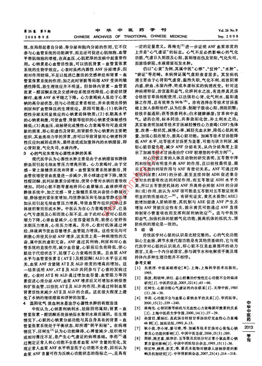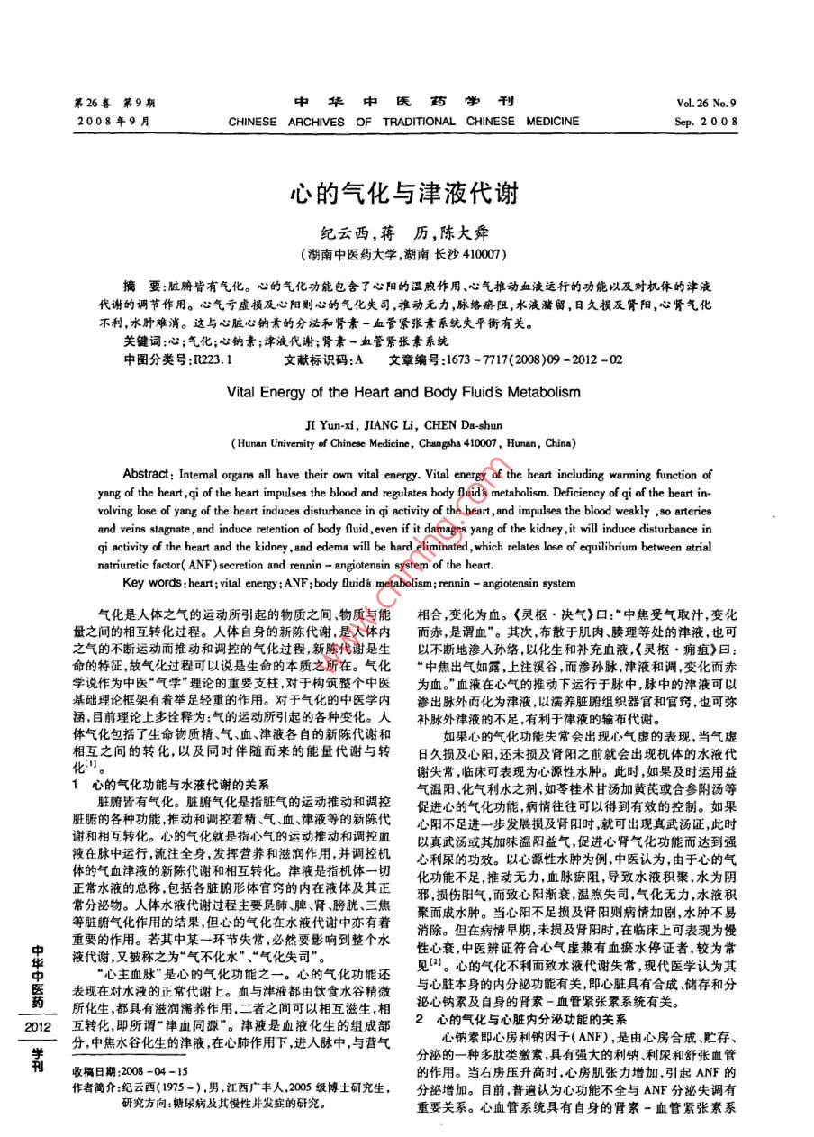 第26卷第9期中華中醫(yī)藥學(xué)刊Vol. 26 No.92008年9月CHINESE ARCHIVES OF TRADITIONAL CHINESE MEDICINESep.2008心的氣化與津液代謝紀(jì)云西,蔣歷,陳大舜(湖南中醫(yī)藥大學(xué),湖南長(zhǎng)沙410007)摘要:臟腑皆有氣化。心的氣化功能包含了心陽(yáng)的溫煦作用、心氣推動(dòng)血液運(yùn)行的功能以及對(duì)機(jī)體的津液代謝的調(diào)節(jié)作用。心氣虧虛損及心陽(yáng)則心的氣化失司,推動(dòng)無(wú)力,脈絡(luò)瘀阻,水液瀦留,日久損及腎陽(yáng),心腎氣化不利,水腫難消。這與心臟心鈉素的分泌和腎素-血管緊張素系統(tǒng)失平衡有關(guān)。.關(guān)鍵詞:心;氣化;心鈉素;津液代謝;腎素-血管緊張素系統(tǒng)中圖分類號(hào):R223.1文獻(xiàn)標(biāo)識(shí)碼:A文章編號(hào):1673 - 7717(2008)09 -2012 -02Vital Energy of the Heart and Body Fluids MetabolismJI Yun-xi, JIANG Li, CHEN Da-shun(Hunan Univenity of Chinese Medicine, Changha 410007 , Hunan, China)Abstract: Intemal organs all bave their own vital energy. Vital energy of the heart including warming function ofyang of the heart ,qi of the heart impulses the blood and regulates body fluids metabolism. Deficiency of qi of the heart in-volving lose of yang of the heart inducea distubance in qi activity of the heart, and impulses the blood weakly ,o arteriesand veins stagnate , and induce retention of body fluid ,even if it damages yang of the kidney ,it will induce disturbance inqi activity of the heart and the kidney , and edema will be hard eliminated , which relates lose of equilibrium between atrialnatriuretic factor( ANF) secretion and rennin - angiotensin system of the heart.Key words :heat; vital energy;ANF ;body Qluide metabolism; rennin - angiotensin system氣化是人體之氣的運(yùn)動(dòng)所引起的物質(zhì)之間.物質(zhì)與能相合,變化為血?!鹅`樞●決氣>日:“中焦受氣取汁,變化量之間的相互轉(zhuǎn)化過(guò)程。人體自身的新陳代謝,是人體內(nèi)而赤,是謂血”。其次,布散于肌肉、腠理等處的津液,也可之氣的不斷運(yùn)動(dòng)而推動(dòng)和調(diào)控的氣化過(guò)程,新陳代謝是生以不斷地滲人孫絡(luò),以化生和補(bǔ)充血液,《靈樞●. 癰疽》曰:命的特征,,故氣化過(guò)程可以說(shuō)是生命的本質(zhì)之所在。氣化“ 中焦出氣如露,上注溪谷,而滲孫脈,津液和調(diào),變化而赤學(xué)說(shuō)作為中醫(yī)“氣學(xué)’理論的重要支柱,對(duì)于構(gòu)筑整個(gè)中醫(yī)為血?!毖涸谛臍獾耐苿?dòng)下運(yùn)行于脈中,脈中的津液可以基礎(chǔ)理論框架有著舉足輕重的作用。對(duì)于氣化的中醫(yī)學(xué)內(nèi)滲出脈外而化為津液,以濡養(yǎng)臟腑組織器官和官竅,也可彌涵,目前理論上多詮釋為:氣的運(yùn)動(dòng)所引起的各種變化。人補(bǔ)脈外津液 的不足,有利于津液的輸布代謝。體氣化包括了生命物質(zhì)精、氣、血、津液各自的新陳代謝和如果心的氣化功能失 常會(huì)出現(xiàn)心氣虛的表現(xiàn),當(dāng)氣虛相互之間的轉(zhuǎn)化,以及同時(shí)伴隨而來(lái)的能量代謝與轉(zhuǎn)日久損及心陽(yáng),還未損及腎陽(yáng)之前就會(huì)出現(xiàn)機(jī)體的水液代謝失常,臨床可表現(xiàn)為心源性水腫。此時(shí),如果及時(shí)運(yùn)用益1心的氣化功能與水液代謝的關(guān)系氣溫陽(yáng)、化氣利水之劑,如苓桂術(shù)甘湯加黃芪或合參附湯等臟腑皆有氣化。臟腑氣化是指臟氣的運(yùn)動(dòng)推動(dòng)和調(diào)控促進(jìn)心的氣化功能,病情往往可以得到有效的控制。如果臟腑的各種功能,推動(dòng)和調(diào)控著精、氣血、津液等的新陳代心陽(yáng)不足進(jìn)-步發(fā)展損及腎陽(yáng)時(shí),就可出現(xiàn)真武湯證,此時(shí)謝和相互轉(zhuǎn)化。心的氣化就是指心氣的運(yùn)動(dòng)推動(dòng)和調(diào)控血以真武湯或其加昧溫陽(yáng)益氣,促進(jìn)心腎氣化功能而達(dá)到強(qiáng)液在脈中運(yùn)行,流注全身,發(fā)揮營(yíng)養(yǎng)和滋潤(rùn)作用,并調(diào)控機(jī)心利尿的功效。以心源性水腫為例,中醫(yī)認(rèn)為,由于心的氣體的氣血津液的新陳代謝和相互轉(zhuǎn)化。津液是指機(jī)體-切化功能不足,推動(dòng)無(wú)力,血脈瘀阻,導(dǎo)致水液積聚,水為陰正常水液的總稱,包括各臟腑形體官竅的內(nèi)在液體及其正邪,損傷陽(yáng)氣,而致心陽(yáng)漸衰,溫煦失司,氣化無(wú)力,水液積常分泌物。人體水液代謝過(guò)程主要是肺、脾、腎、膀胱、三焦聚而成水腫。當(dāng)心陽(yáng)不足損及腎陽(yáng)則病情加劇,水腫不易等臟腑氣化作用的結(jié)果,但心的氣化在水液代謝中亦有著消除。但在病情早期,未損及腎陽(yáng)時(shí),在臨床上可表現(xiàn)為慢重要的作用。若其中某-環(huán)節(jié)失常,必然要影響到整個(gè)水性心衰,中醫(yī)辨證符合心氣虛兼有血瘀水停證者,較為常液代謝,又被稱之為“氣不化水”、“氣化失司"?!靶闹?血脈”是心的氣化功能之一。心的氣化功能還見(jiàn)2。心的氣化不利而致水液代謝失常,現(xiàn)代醫(yī)學(xué)認(rèn)為其表現(xiàn)在對(duì)水液的正常代謝上。血與津液都由飲食水谷精微與心臟本身的內(nèi)分泌功能有關(guān),即心臟具有合成儲(chǔ)存和分所化生,都具有滋潤(rùn)濡養(yǎng)作用,二者之間可以相互滋生,相秘心鈉素及自身的腎素-血管緊張素系統(tǒng)有關(guān)。2012互轉(zhuǎn)化,即所謂“津血同源"。津液是血液化生的組