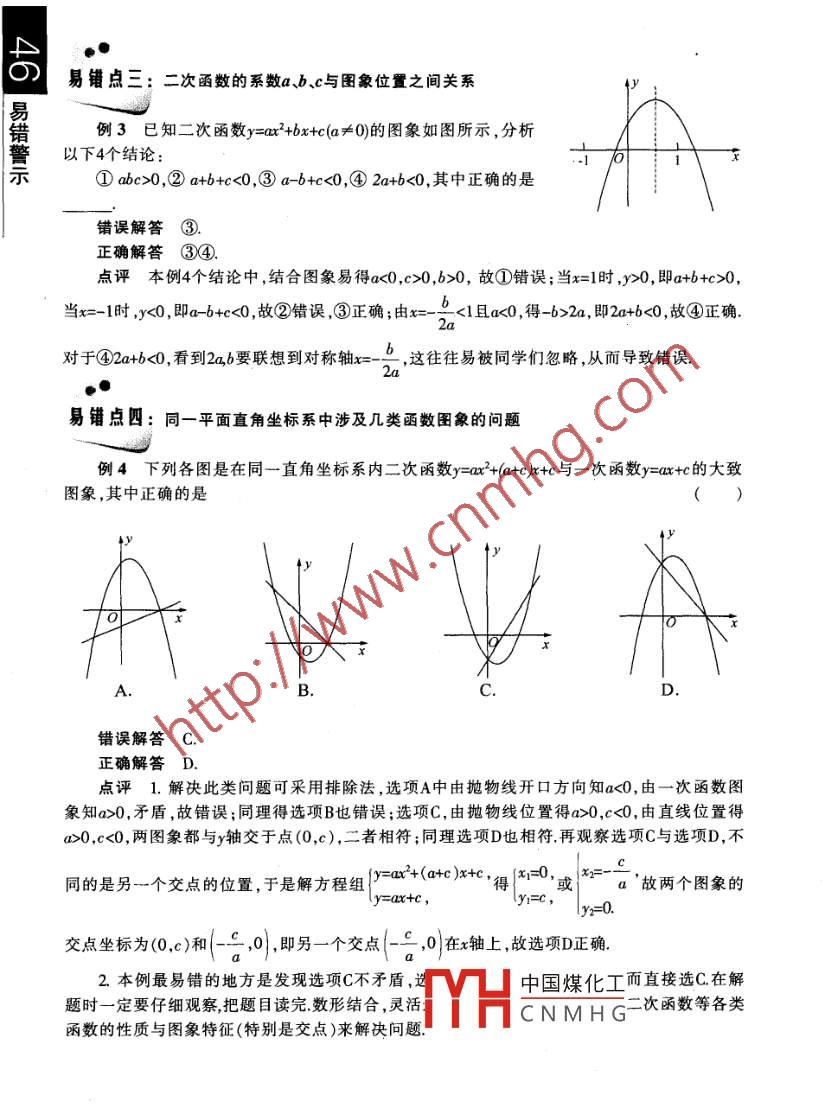 易錯(cuò)警示分析易錯(cuò)點(diǎn)露囂囂把握重南京外國語學(xué)校張學(xué)萍二次函數(shù)y=ax2+bx+c(a、b、c是常數(shù),且a≠0)是描述現(xiàn)實(shí)世界變量之間的關(guān)系的重要數(shù)學(xué)模型,其困象和性質(zhì)都比一次函數(shù)和反比例函數(shù)復(fù)雜,二次函數(shù)與一元二次方程聯(lián)系緊密,相關(guān)的計(jì)算量也較大,特別是二次函數(shù)的應(yīng)用更加廣泛和靈活多變,因此本章的學(xué)習(xí)有一定難度,同學(xué)們常常會(huì)在以下方面出現(xiàn)錯(cuò)誤易錯(cuò)點(diǎn)一:對二次函數(shù)概念的理解不到位例1函數(shù)y=(m+2x+2x-1是二次函數(shù),則m=錯(cuò)誤解答由m2-2=2,得m=±2,所以當(dāng)m=±2時(shí),函數(shù)y=(m+2x+2x-1是二次函數(shù)正確解答函數(shù)y=(m+2x+2x-1是二次函數(shù),所以m2-2=2且m+2≠0.由m2-2=2,得m=±2,由m+2≠0得m≠-2,所以m=2點(diǎn)評一般地,形如y=ax2+bx+c(a、b、c是常數(shù),且a≠0)的函數(shù)稱為二次函數(shù),其中二次項(xiàng)系數(shù)a≠0是經(jīng)??疾榈闹R點(diǎn),這是一個(gè)隱含條件,務(wù)必牢記易錯(cuò)點(diǎn)二:二次函數(shù)平移后的函數(shù)關(guān)系式易寫錯(cuò)例2將二次函數(shù)y=-x3的圖象向左平移4個(gè)單位可得函數(shù)的圖象錯(cuò)誤解答正確解答y=--(x+4)點(diǎn)評1.二次函數(shù)圖象的上下平移較簡單,二次函數(shù)y=a(x-h)2+k向上平移m個(gè)單位得y=a(x-h)+k+m,向下平移m個(gè)單位得y=a(x-h)+k-m.二次函數(shù)圖象的左右平移后的關(guān)系式易出錯(cuò),結(jié)論常常會(huì)寫反了,上例錯(cuò)解即是此類錯(cuò)誤,實(shí)際上二次函數(shù)y=ax-h)+k向左平移n個(gè)單位為y=ax-h+n)+k,向右平移n個(gè)單位為y=a(x-h-n)+k2在平移圖象時(shí),圖象上面所有點(diǎn)都作同樣的中國煤化工象平移時(shí),由它的頂點(diǎn)平移情況來進(jìn)行判斷會(huì)比較簡單如本例yCNMHG向左平移4個(gè)單位,則新的頂點(diǎn)坐標(biāo)為(-4,0),因此向左平移4個(gè)單位后的函數(shù)關(guān)系式為y=1(a+4)易錯(cuò)點(diǎn)三:二次函數(shù)的系數(shù)b與圖象位置之間關(guān)系易錯(cuò)警示例3已知二次函數(shù)y=ax2+bxc(a≠0)的圖象如圖所示,分析以下4個(gè)結(jié)論①abe>0,②a+b+c<0,③a-b+<0,④2a+b<0,其中正確的是錯(cuò)誤解答③正確解答③④.點(diǎn)評本例4個(gè)結(jié)論中,結(jié)合圖象易得a<0,c>0,b>0,故①錯(cuò)誤;當(dāng)x=1時(shí),ya+b+c>當(dāng)x=-1時(shí),y<0,即a-b+c<0,故②錯(cuò)誤,③正確;由x=-0<1且a<0,得-b>2a,即2a+b<0,故④正確對于④2a+b~0,看到2ab要聯(lián)想到對稱軸x=-b,這往往易被同學(xué)們忽略,從而導(dǎo)致錯(cuò)誤易錯(cuò)息四:同一平面直角坐標(biāo)系中涉及幾類函數(shù)圖象的問題例4下列各圖是在同一直角坐標(biāo)系內(nèi)二次函數(shù)y=ax2+(a+ckx+c與一次函數(shù)y=ax+e的大致圖象,其中正確的是錯(cuò)誤解答C.正確解答D.點(diǎn)評1.解決此類問題可采用排除法,選項(xiàng)A中由拋物線開口方向知a<0,由一次函數(shù)圖象知α>0,矛盾,故錯(cuò)誤;同理得選項(xiàng)B也錯(cuò)誤;選項(xiàng)C,由拋物線位置得a>0,c<0,由直線位置得a0,c<0,兩圖象都與y軸交于點(diǎn)(0,c),二者相符;同理選項(xiàng)D也相符再觀察選項(xiàng)C與選項(xiàng)D,不同的是另一個(gè)交點(diǎn)的位置,于是解方程組xx+(a+c)x+c得或a'故兩個(gè)圖象的y=ax+c,交點(diǎn)坐標(biāo)為O)和(-c,0,-另一個(gè)交點(diǎn),0在軸上,故選項(xiàng)D正確2本例最易錯(cuò)的地方是發(fā)現(xiàn)選項(xiàng)C不矛盾,V中國煤化工而直接選C在解題時(shí)一定要仔細(xì)觀察把題目讀完數(shù)形結(jié)合,靈活函數(shù)的性質(zhì)與圖象特征(特別是交點(diǎn))來解決問題CNMHG二次函數(shù)等各類易錯(cuò)警示易錯(cuò)點(diǎn)五:函數(shù)與方程的關(guān)系問題例5若函數(shù)y=mx2-0x+2的圖象與x軸只有一個(gè)公共點(diǎn),求m的值錯(cuò)誤解答因?yàn)楹瘮?shù)y=mx2-6x+2的圖象與x軸只有一個(gè)公共點(diǎn),所以b2-4即(-6}-4m×2=0、m=正確解答若m=0,則y=-6x+2,函數(shù)圖象與x軸只有一個(gè)公共點(diǎn)若m≠0,則y=mx2-6x+2為二次函數(shù),圖象與x軸只有一個(gè)公共點(diǎn)時(shí)b2-4ac=0,即(6}-4m×2=0,所以m=9所以,函數(shù)y=mx26x+2的圖象與軸只有一個(gè)公共點(diǎn)時(shí),m=0或m=9點(diǎn)評本例應(yīng)分類討論,容易出現(xiàn)漏掉m=0時(shí)函數(shù)為一次函數(shù)的情況避免錯(cuò)誤的方法是認(rèn)真讀題和審題.易錯(cuò)點(diǎn)六:利用二次函數(shù)求最大(小)值時(shí)忽略自變量的取值范圍例6如圖,已知邊長為4的正方形CDEF截去一角后變成五邊形 ABCDE,其中AE=2,BF=1請?jiān)贏B上求一點(diǎn)P,使矩形PNDM面積M最大錯(cuò)誤解答設(shè)點(diǎn)P到EF距離PQ=x,則PV=4-x,FG=PQ=x,GB=1-x由△BPG∽△BF得BGF所以PG=2(1-x),所以PM=4-PG=4-2(1-x)=2+2x,則矩形PNDM的面積S=PN,PM=4x)(2+2x)=-2x2+6x+8=-2x-2)+所以,當(dāng)x=3時(shí),Sn大a=正確解答上文已求出矩形PDM的面積242)+2則此二次函數(shù)圖象頂點(diǎn)為,2),而自變量取值范圍為0≤x≤1,不在其內(nèi)對稱軸左側(cè)y隨x的增大而增大,當(dāng)x=1時(shí),S有最大值所以,當(dāng)x=1時(shí),S大=12即點(diǎn)P取在B處時(shí),矩形PNDM面積最大點(diǎn)評二次函數(shù)在某部分區(qū)間上的最值不一定在頂點(diǎn)處.本例錯(cuò)解就是因?yàn)楹雎粤俗宰兞康娜≈捣秶诶枚魏瘮?shù)求最值時(shí),列出函