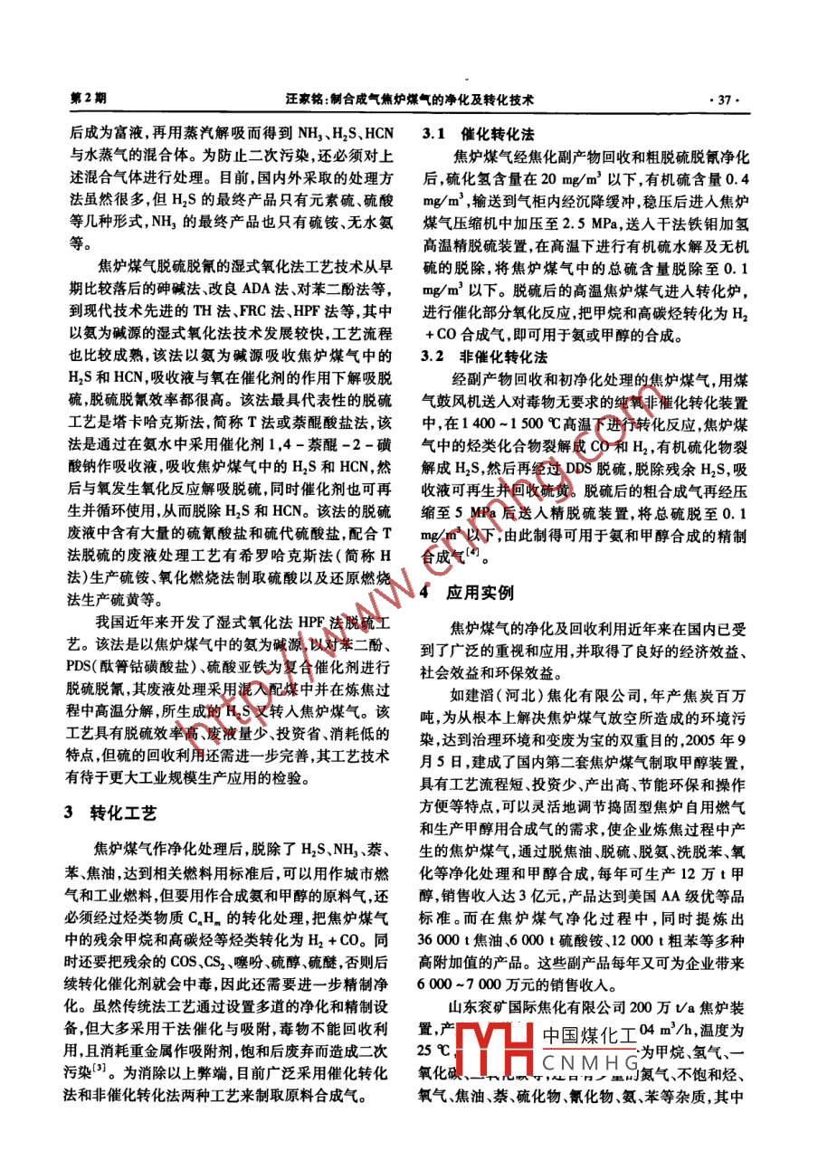 第2期汪家銘:制合成氣焦?fàn)t煤氣的凈化及轉(zhuǎn)化技術(shù)制合成氣焦?fàn)t媒氣的凈化及轉(zhuǎn)化技術(shù)汪家銘(川化集團(tuán)有限責(zé)任公司,四川成都610300)摘要:焦?fàn)t煤氣的凈化是其綜合利用的最為關(guān)健的工藝過程。本文簡逑了焦?fàn)t煤氣除焦油、除纂、洗氨、脫苯、脫硫脫氰等凈化工藝,介紹了采用催化轉(zhuǎn)化和非催化轉(zhuǎn)化制取氨和甲醇合成氣的工藝技術(shù),并用山東兗礦國際焦化有限公司焦?fàn)t煤氣凈化制取甲醇合成氣的實例來說明焦?fàn)t煤氣凈化處理工藝及其應(yīng)用。關(guān)鍵詞:焦?fàn)t煤氣;凈化;精制;合成氣中圖分類號:TQ546文獻(xiàn)標(biāo)識碼B文章編號:1003-3467(2008)02-0035-041概述2凈化技術(shù)焦?fàn)t煤氣是焦炭生產(chǎn)過程中煤炭經(jīng)高溫干餾出焦炭生產(chǎn)過程中煤炭干餾溫度為550℃,焦?fàn)t來的氣體產(chǎn)物,在煉焦產(chǎn)品中,按質(zhì)量計算,焦?fàn)t煤煤氣中有大量的H2S、COS、CS2、NH3、HCN、噻吩、硫氣占15%~18%,為全部產(chǎn)品的第二位。據(jù)統(tǒng)計,黃、硫醚、焦油、萘、苯等化學(xué)物質(zhì)。焦?fàn)t煤氣經(jīng)過凈我國現(xiàn)有鋼鐵年生產(chǎn)能力已達(dá)32億t,按煉鐵每噸化和提取回收化工產(chǎn)品后成為回爐煤氣,回爐煤氣耗焦炭L.3t計,焦炭年用量達(dá)4.16億’,煤炭煉焦的氣體組分一般為(%,以體積分?jǐn)?shù)計):H254-59,按1t煤焦產(chǎn)出焦?fàn)t煤氣320m3計,每年可產(chǎn)生焦CH423-~28,C05.5~7,CO21.5~2.5,N23~5,爐煤氣1331.2億m3,若其中一半用作燃料回收利CHn2~3,O20.3-0.7。用,其余可供開發(fā)利用的焦?fàn)t煤氣也有665.6億2.1凈化工序m3,但目前僅有不到10%的焦?fàn)t煤氣被回收用于焦?fàn)t煤氣凈化工藝技術(shù)從20世紀(jì)50~60年代城市煤氣、發(fā)電燃料和生產(chǎn)化工產(chǎn)品,大量的焦?fàn)t煤的硫銨流程和濃氨水流程開始,到逐漸采用較為先氣直接排放燃燒,每年白白燒掉的焦?fàn)t煤氣有300進(jìn)的脫硫脫氰和氨回收技術(shù),如TH法、MEA法、AS多億m3,相當(dāng)于兩個西氣東輸工程設(shè)計的年輸氣法、真空碳酸鹽法等脫硫技術(shù),Pham法濃氨氣分量造成的經(jīng)濟(jì)損失達(dá)數(shù)百億元僅山西省每年就有解等氨回收技術(shù)。近年來采用的新技術(shù)有輕質(zhì)焦油150億m3焦?fàn)t煤氣直接排放燃燒極大地浪費了寶初級洗萘磷銨溶液吸氨制取無水氨濃氨水制取碳貴的稀缺資源和能源嚴(yán)重污染了環(huán)境。酸氫銨、PDS法脫硫等。煤炭在焦?fàn)t中干餾時產(chǎn)生的混有焦油霧和水氣在具體應(yīng)用焦?fàn)t煤氣凈化工藝時,應(yīng)根據(jù)生產(chǎn)以及各種雜質(zhì)的混合氣稱為粗煤氣,又稱荒煤氣,粗企業(yè)的實際情況及后續(xù)各類煤氣用戶對煤氣質(zhì)量的煤氣必須經(jīng)煤氣凈化裝置進(jìn)行處理將其焦油霧和要求,因地制宜選取合理的凈化工藝。焦?fàn)t煤氣的水以及各種雜質(zhì)除去得到凈煤氣后,才能用作工業(yè)凈化通常由煤氣冷卻、除萘除焦煙霧、煤氣輸送洗燃料、城市煤氣,并精制處理后才能作為化學(xué)合成的氨、脫苯脫硫脫氰等7個基本工序所組成雖然在原料氣具體應(yīng)用時工藝流程有所不同,但基本上是這7個焦?fàn)t煤氣凈化是將從焦?fàn)t炭化室中產(chǎn)生的粗煤工序的先后組合的匹配氣進(jìn)行各種相應(yīng)的工藝處理,除去雜質(zhì)得到凈煤氣從整體上看,目前國內(nèi)企業(yè)的焦?fàn)t煤氣凈化技同時回收各種化學(xué)產(chǎn)品的技術(shù)。本文簡要介紹焦?fàn)t術(shù)已達(dá)到國際先進(jìn)水平,凈化后的焦?fàn)t煤氣質(zhì)量達(dá)煤氣凈化處理的工藝技術(shù)及其應(yīng)用情況。到或超過國外同譽型化廠(數(shù)據(jù)見下頁表1)。在中國煤化工收稿日期:2007-10-22CNMHG作者簡介:汪家銘(1949-),男,工程師從事大型引進(jìn)化肥裝置設(shè)備管理和維5年后叢學(xué)化⊥L科夜期刊編輯及化工情報信息工作電話:(028)83621163。河南化工36HENAN CHEMICAL INDUSTRY2008年第25卷焦?fàn)t煤氣凈化的各工序中可供采用的凈化技術(shù)如氨。噴灑式飽和器生產(chǎn)硫銨、無飽和器生產(chǎn)硫銨蒸下:①煤氣冷卻。兩段式多段冷卻、上升管氣化冷卻氨槽蒸汽射節(jié)能、濃氨氣分解。⑤脫苯。高效填料與荒煤氣顯熱利用、循環(huán)氨水余熱利用。②除萘。吸收塔與旋流板捕霧器、高效換熱設(shè)備、高效加熱輕質(zhì)焦油洗萘、蒽油除萘與再生、富油洗萘與再生。爐、高效脫苯塔。⑥脫硫脫氰。FRC法、HPF法、AS③除焦油霧。蜂窩形電捕器與熱氨水清掃、電捕器循環(huán)洗滌法、真空碳酸鹽法、代亞毛克斯法、萘醌酸絕緣箱氮封、電捕器高效高壓直流電場整流。④洗鹽法。衰1國內(nèi)外相關(guān)企業(yè)焦?fàn)t煤氣凈化后的工藝指標(biāo)企業(yè)名稱焦油NHHaSHCN萘苯日本新日鐵大分廠0.50.50.3美國Amoo廠0.050.500.2中國寶鋼一期工程0.0l~0.0.05-0.010.060.08~0.011中國寶鋼二期工程01-00.050.19中國天津煤氣二廠0.050.03-0.010.020.01-0.020.2~0.3近年來國內(nèi)開發(fā)成功的投資省技術(shù)可行、運行H1含量≤250mg/m3,HCN含量≤150mg/m3,因成本低的吸附法凈化工藝,其原理是利用多孔、高比此選用AS循環(huán)洗滌法脫除H2S和HCN就能滿足表面積的專用吸附劑和脫硫劑分層裝填使焦?fàn)t煤要求。而當(dāng)焦?fàn)t煤氣用作城市煤氣、氨用和甲醇
