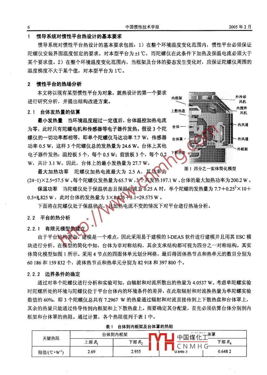 第13卷第1期中國(guó)慣性技術(shù)學(xué)報(bào)2005年2月文章編號(hào):1005-6734(2005)01-0005-05慣性平臺(tái)熱場(chǎng)分析及熱設(shè)計(jì)的改進(jìn)楊盛林,劉昱,劉玉峰(天津航海儀器研究所,天津300131)摘要:通過對(duì)某型慣性平臺(tái)的熱場(chǎng)進(jìn)行有限元分析,確定了在原設(shè)計(jì)溫度控制點(diǎn)控制范圍內(nèi)該型慣性平臺(tái)的環(huán)境溫度適應(yīng)能力。利用傳熱學(xué)理論,對(duì)平臺(tái)中的強(qiáng)化換熱進(jìn)行了簡(jiǎn)單的理論分析及計(jì)算并提出了改進(jìn)方案,以期對(duì)該型慣性平臺(tái)環(huán)境溫度適應(yīng)性的提高奠定基礎(chǔ)關(guān)鍵詞:慣性平臺(tái);溫度場(chǎng);有限元;強(qiáng)化換熱中圖分類號(hào):U6661文獻(xiàn)標(biāo)識(shí)碼:AResearch on heat Field of inertial Platformand Improvement on Heat DesignYANG Sheng-lin, LIU Yu, LIU Yu-feng( Tianjin Navigation Instrument Research Institute, Tianjin 300131, China)Abstract: The ability of inertial platform to adapt the ambient temperature within the range oftemperature control point is ascertained through the analysis of one type of inertial platform,s heatfield with finite element simulation software. In order to apply some fundamental functions upon theimprovement on the inertial platform's adaptability to environmental temperature, intensifying heatexchange is studied using heat conduction theory and improved projects are also brought forwardKey words: inertial platform; temperature field; finite element; intensifying heat exchange慣導(dǎo)系統(tǒng)的精度受很多因數(shù)的影響,其中陀螺儀的性能是最主要的影響因數(shù)。在以液浮陀螺儀為核心元件的慣導(dǎo)系統(tǒng)中,由于液浮陀螺儀自身的工作原理,要求有嚴(yán)格的溫度控制。其中包括:工作溫度穩(wěn)定性的控制以及對(duì)陀螺浮子周圍溫度梯度的控制。為了保證前者,必須確保陀螺的工作溫度在環(huán)境要求的全溫度范圍內(nèi)恒定。但在大的環(huán)境溫度范圍內(nèi)完全依靠陀螺儀自身的溫控系統(tǒng)很難達(dá)到高穩(wěn)定性的要求。為此,必須采用多級(jí)溫控方式,即加強(qiáng)慣性平臺(tái)溫控,使陀螺儀在惡劣的環(huán)境溫度變化條件下能處于較好的溫度條件(例如±1℃),然后再利用陀螺儀自身溫控系統(tǒng)達(dá)到高的溫控精度(變化小于0.01℃)。慣性平臺(tái)設(shè)計(jì)的任務(wù)之一就是針對(duì)陀螺儀對(duì)多級(jí)溫控的要求進(jìn)行有效的平臺(tái)熱設(shè)計(jì)。陀螺是一個(gè)發(fā)熱元件,而外界又是一個(gè)由低到高具有大溫度范圍的環(huán)境。因此,從溫控要求角度看,慣性平臺(tái)是一個(gè)精確的兼顧散熱和保溫的具有復(fù)雜結(jié)構(gòu)的熱系統(tǒng)。為了達(dá)到既能保溫又可散熱的要求,應(yīng)為陀螺儀提供良好的溫度界面。以往常采用試驗(yàn)及模擬計(jì)算的方法來(lái)進(jìn)行平臺(tái)的熱設(shè)計(jì),但由于平臺(tái)結(jié)構(gòu)復(fù)雜,很難保證計(jì)算的準(zhǔn)確性,使得慣性平臺(tái)的結(jié)構(gòu)熱設(shè)計(jì)難以達(dá)到要求。本文試圖從有限元方法著手,利用成熟的分析軟件對(duì)上述問題進(jìn)行探討,力求得到有益的設(shè)計(jì)指導(dǎo)中國(guó)煤化工基金項(xiàng)目:國(guó)防科技應(yīng)用、基礎(chǔ)研究項(xiàng)目CNMHG收稿日期:2004-11-27作者簡(jiǎn)介:楊盛林(1978—),男,天沖航海儀器研究所研究生,研究方向?yàn)閷?dǎo)航、制導(dǎo)與控制。國(guó)慣性技術(shù)學(xué)2005年2月1慣導(dǎo)系統(tǒng)對(duì)慣性平臺(tái)熱設(shè)計(jì)的基本要求慣導(dǎo)系統(tǒng)對(duì)慣性平臺(tái)熱設(shè)計(jì)的基本要求包括:1)在整個(gè)環(huán)境溫度變化范圍內(nèi),慣性平臺(tái)必須保證陀螺儀安裝界面溫度恒定的要求。對(duì)本型平臺(tái)為±1℃,而陀螺儀在此條件下加熱及保溫電流必須大于某個(gè)要求值。2)在整個(gè)環(huán)境溫度變化范圍內(nèi),當(dāng)框架及臺(tái)體的姿態(tài)發(fā)生變化時(shí),應(yīng)保證陀螺儀周圍的溫度梯度不大于某個(gè)值,對(duì)本型平臺(tái)為1℃。2慣性平臺(tái)的熱場(chǎng)分析本文將以現(xiàn)有某型慣性平臺(tái)為對(duì)象,就熱設(shè)計(jì)的第一個(gè)要求外冷卻進(jìn)行研究分析,并提出結(jié)構(gòu)改進(jìn)方案內(nèi)框架2.1臺(tái)體發(fā)熱量的估算上散熱盤內(nèi)攪拌最小發(fā)熱量當(dāng)環(huán)境溫度超過一定值后,臺(tái)體溫控加熱電流為零,此時(shí)只有陀螺電機(jī)和傳感器等電子器件發(fā)熱。假設(shè)3個(gè)陀臺(tái)體一內(nèi)風(fēng)道螺儀的一切功率都相等,即單個(gè)陀螺儀馬達(dá)功率77W,傳感器臺(tái)體罩-外風(fēng)道功率05W,這樣3個(gè)陀螺儀總的發(fā)熱量為246W。臺(tái)體上其他外框架電子器件發(fā)熱:溫控板5個(gè),每個(gè)05W;前放板3個(gè),每個(gè)02下散熱W,共計(jì)3.1W。因此,臺(tái)體上的最小發(fā)熱量為27.7W。最大加熱功率陀螺儀加熱電流最大為2.5A,其功率為圖1四分之一實(shí)體簡(jiǎn)化模型(24-1)×2.5=57.5W每個(gè)陀螺儀發(fā)熱量為657W,3個(gè)共發(fā)熱197W臺(tái)體的最大加熱功率為200.2W。保溫功率當(dāng)陀螺儀處于保溫狀態(tài)且保溫電流為0.25A時(shí),單個(gè)陀螺的發(fā)熱量為77+0252×10+0.5=8825W,此時(shí)臺(tái)體的發(fā)熱量為3×8825+31=29575W。下面將在陀螺儀處