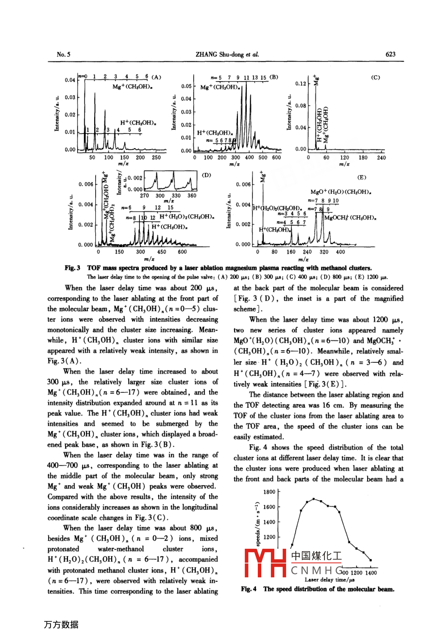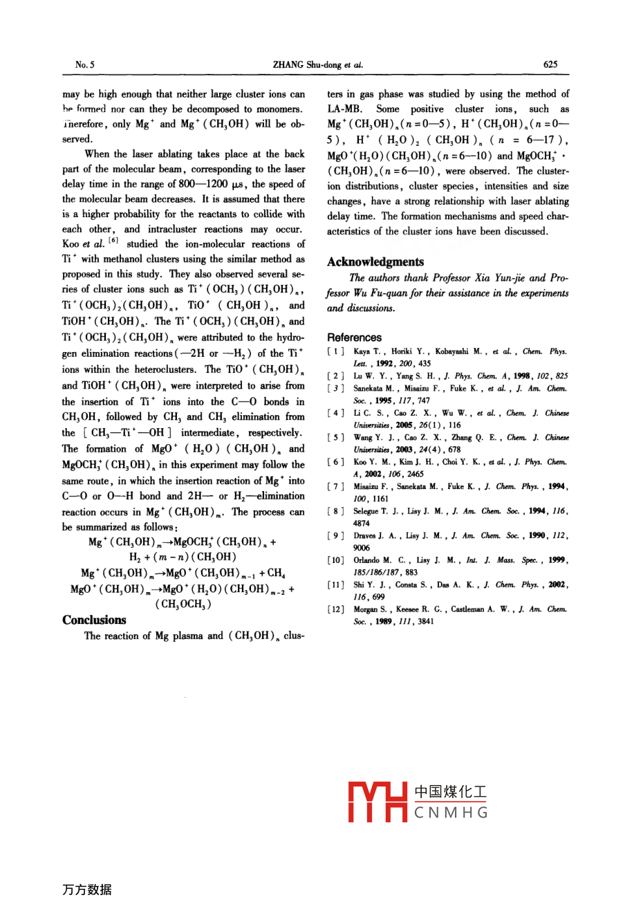 Available online at www.sciencedirect.com●CIENCE@oinect.CHEM. RES. CHINESE U.2006, 22(5), 621-625Reactions of Laser A blation-magnesium Plasmawith Methanol Clusters *ZHANG Shu-dong"" , KONG Xiang-he, ZHU Xiang-jun, WANG Yan and JIANG Su-rongCollege of Physics and Engineering, Qufu Normal University, Qufiu 273165, P. R. ChinaReceived Dec. 12, 2005The laser ablation-molecular beam( LA-MB) method is useful for studying the reactions of metal ions with molec-ular clusters. Reactions of magnesium plasma with methanol clusters were studied by using this method. A speciallydesigned reaction cell was used as a fast flow reactor operated under thermal conditions , and the reaction productswere measured with a tim-of-light( TOF) mass spectromneter. Surprisingly, several series of cluster ions with com-plex sizes and intensity distributios were obtained when the laser ablating was applied to dfferent parts of the molec~-ular beam. In the front part of the molecular beam, strong Mg* (CH,0H)。(n=0--5) and weak H* (CH,0H).(n=0- -5) cluster ions were observed with relatively small cluster sizes; in the middle part of the molecular beam,the main cluster ions were H* (CH,0H).(n=6-17) and H* (H2O)2(CH,OH)。(n=6- -17) with a relativelylarge cluster size and a weak intensity; in the back part of the molecular beam, two new series of cluster ions ,MgO* (H20)(CH,0H)。(n=6--10) and MgOCH; (CH,0H)。(n=6-10), were obtained and accompanied byweak H* (CH,0H)。(n=4- -7) and H* (H20)2 (CH,0H)。(n=3- 6). The formation mechanisms and speedcharacteristics of the cluster ions are discussed in this article.Keywords Laser ablation molecular beam; Mg plasm; Methanol cluster; Ion-molecular cluster reaction; Forma-tion mechanismArticle ID 1005-9040(2006)-05-621-05Introductiontransition metal ions with alcohols, ammonia or waterReactions of metal ions with neutral molecules ormolecular clusters'1- 6 . Fuke et al.印studied the pho-clusters produce a variety of metal complex ions andto-dissociation of Mg* (H20)。ions and reported be-other new series of cluster ions including cations andsides the evaporation of single neutral water molecules,anions. The laser ablation-molecular beam ( LA-MB )a photo-induced chemical reaction that resulted in themethod has marked its relevance in the studies on theformation of hydrated Mg* 0H ions. Lu and Yang21above-mentioned reactions. The interest in the reac-studied the reactions of alkaline-earth metal ions withtions of both ionic and neutral metal atoms with organicmethanol clusters and found two product switches: theclusters has increased dramatically in the past decade.first occurred at around n=5 from M* ( CH,OH)。toThe study of metal ion-solvent cluster reactions providesMOCH (CH,OH)m1, and the second occurred at ca.valuable information on their reactivity patterns ann= 15 from MOCH (CH20H)。1 to M*(CH,0H)transitions from a gas phase to a solution phase. Al-Selegue and Lsyl8.9] found a similar effect forthough numerous reports on the reactions of ions andM*(CH,OH)。(M = Na or Cs) clusters , which under-molecules are theoretically and experimentally availa-go an intracluster reaction in the ground electronic stateble, the studies on the reactions of molecular clustersto eliminate diethyl and forn M* (CH,OH)-2(H20).with laser ablation-metal plasmas are few.The“ mixed solvent ”product cluster intensities in-Clusters combined via van der Waals forces orcrease as a function of the cluster size but do not sur-hydrogen bonding are the ideal medium for studyingpass those of the parent M* ( CHgOH)。, suggestingthe reactions of metal ions with molecular clusters.that a full “product switch" does not occur.Most studies have been carried out for the reactions between alkali metal ions, alkaline-earth metal ions, orplesmn中國煤化工small reaction cel:YHCNMHG* Supported by the Doctoral Startup Foundation from Qufu Normnal Unuversity.* *To whom correapondence should be addressed. E mail: zhangsd2@ 126. com622CHEM. rES. CHINESE U.Vol. 22by using the LA-MB method. Abundant cluster ionsResultswere found ,whose distributions in intensity and sizeTo determine the metal ions that participate in thechange along with laser ablation in diferent parts of theion-molecular cluster reactions, the TOF mass spectramolecular beam.of magnesium ions were measured when only an Mg tar-Experimentalget was ablated by laser, and the pulse valve wasA schematic view of the apparatus is shown inclosed. By changing the delay time from the beginningFig. 1.of the ablating of laser to the high voltage emerged onGa inletthe TOF electrodes ( referred to as “HV delay time'Pulse valvehereinafter for convenience) , the Mg ions produced byPulse vaIve- -00一laser ablation plasmas with diferent flying time lengthsMetal tasget吧NHd.YAG loto the TOF detecting area were measured, as shown inFig. 2.sSiP[6噸HVpulemo1o:Glass winriow0.16「(A) 合入Skimner1MS.; 0.12 tTime soquenceIDnreor0.08 t馬HVpulse 1000VE 0.04 t1200 VFig. 1 Schematic diagram of the experimental0.00setup.456。4A small reaction cell made of Telon as a circularm/zcylinder with an inner diameter of 10 mm and a length0.12[ (B-144逞of 22 mm was fixed at the exit of the pulsed valve( Gen-; 0.08-104eral 9, with a nozzle of0. 8 mm in diameter). The fo-cused pulse laser( LAB-170, 532 nm, 10 ns, SpectraPhysics) , passed through the glass window of the reac--24tion cell and ablated on the surface of magnesium target(purity greater than 99. 9%). The target, which wasplaced 10 mm downstream from the pulsed valve, was13060driven by a step motor. The gas mixture of methanol-Fig.2 Mg ions mass spectra.helium was formed by bubbling the helium gas through(A) A tpieal mass spectrum; (B) mass spectraa methanol liquid reservoir. The methanol clusters wereat diferent HV delay time.produced by supersonic expansion of the methanol-heli-Single- and double-ionized Mg ions were ob-um gas mixture through the pulsed valve nozzle.served ,and they lasted for a period of tim
