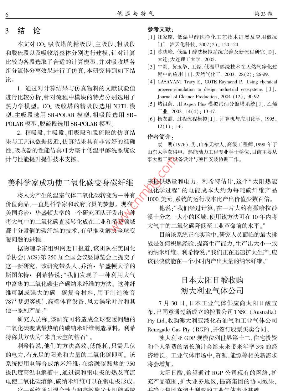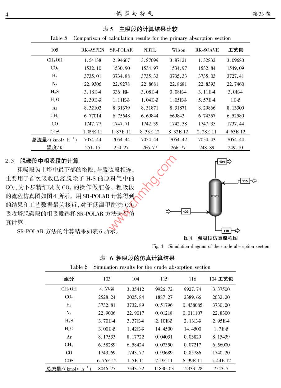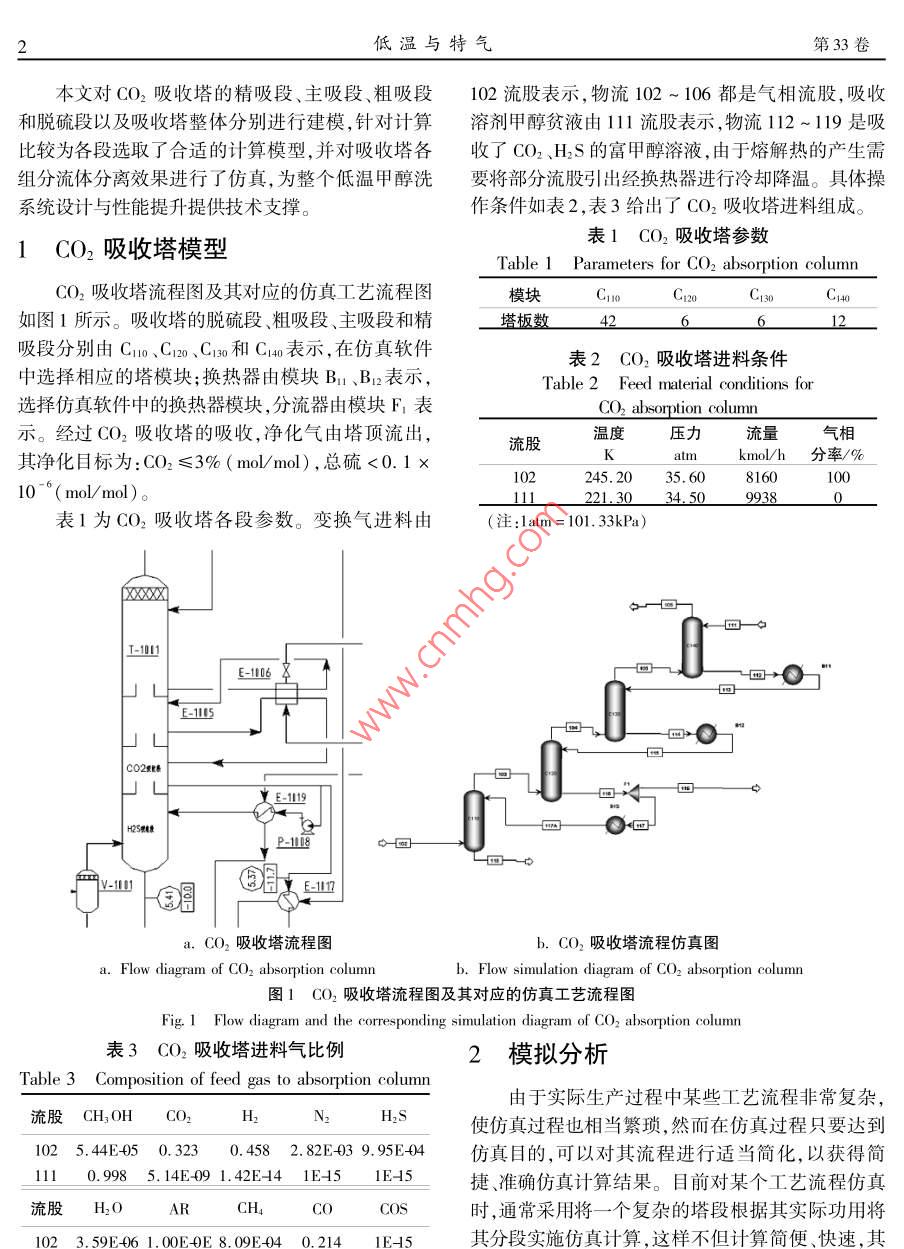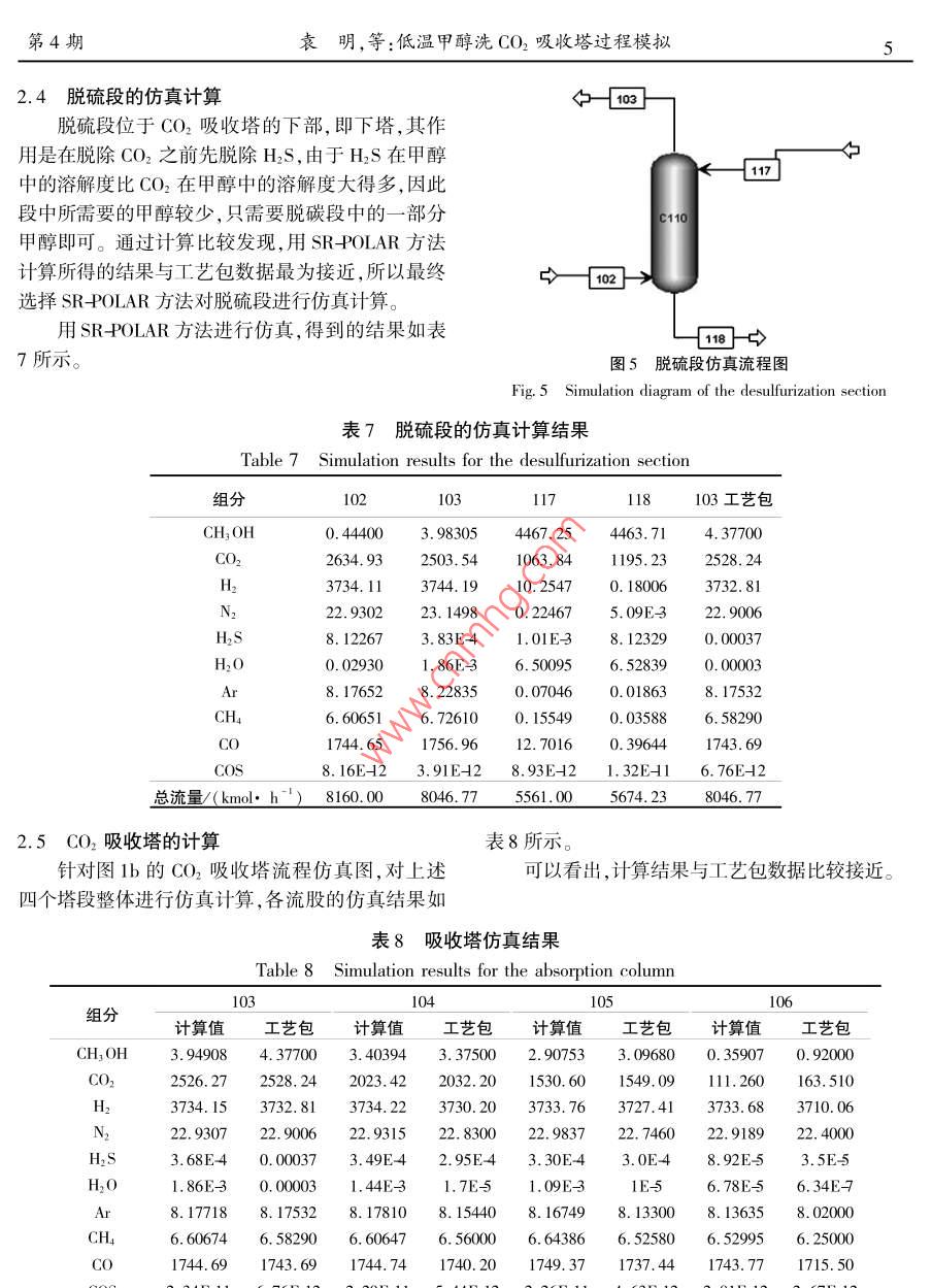 第33卷第4期低溫與特015年8月Low Temperature and Specialty GasesAug,2015工藝與設(shè)備低溫甲醇洗CO,吸收塔過程模擬袁明,張存泉2(1.山東電力建設(shè)第一工程公司,濟(jì)南250131;2.武漢理工大學(xué)能源與動力工程學(xué)院,武漢430063)摘要:CO3吸收塔是低溫甲醇洗系統(tǒng)的核心裝置之一,其性能對整個(gè)系統(tǒng)性能具有重要影響。本文對CO2吸收塔的精吸段、主吸段、粗吸段和脫硫段以及吸收塔整體分別進(jìn)行建模,針對計(jì)算比較為各段選取了合適的計(jì)算模型,并對吸收塔各組分流體分離效果進(jìn)行了仿真,為整個(gè)低溫甲醇洗系統(tǒng)設(shè)計(jì)與性能提升提供技術(shù)支撐。關(guān)鍵詞:低溫甲醇洗,CO2吸收塔,精餾吸收,模擬中圖分類號:TQ116文獻(xiàn)標(biāo)志碼:A文章編號:1007-804(2015)0400106doi:10.3969/j.isn.10077804.2015.04.001Simulation on Absorption Column Processes in Rectisol SystemYUAN Ming, ZHANG Cunquan(1. SEPCO1 Electric Power Construction Corporation, Jinan 250131, China2. Energy and Power Engineering School, Wuhan University of Technology, Wuhan 430063, China)Abstract: A carbon dioxide absorption column is one of core devices in a rectisol system, whose performances are dominantto the performances of the entire rectisol system. ASPEN PLUS software is utilized to establish models for the fine absorp-tion section, the main absorption section, the coarse absorption section and the desulfurization section as well as the entireon cumn based on comparisons of calculation results from various calculation models, respectively;the simulation analysis is carried out to the separation effects of various components in the carbon dioxide absorptioncolumn. Such simulation results may used as the technical support for improvement of design and performances of the entireKey words: rectisol process; carbon dioxide absorption column; distillation absorption; simulation analysisLinde公司和Iurg公司在20世紀(jì)50年代共同單位從上世紀(jì)0年代開始研究低溫甲醇洗工藝技開發(fā)了低溫甲醇洗系統(tǒng),以冷甲醇為吸收溶劑,利用術(shù),探索取得了一定的成果,南化硏究院在數(shù)據(jù)測定甲醇在低溫下對酸性氣體溶解度極大的優(yōu)良特性,領(lǐng)域取得了一定進(jìn)展;還有其它多個(gè)單位在熱力脫除原料氣中的酸性氣體,用于凈化多組分氣體,低學(xué)研究、工藝計(jì)算、氣液相平衡方面也取得了相關(guān)的溫甲醇洗具有良好的吸收選擇性、超強(qiáng)的吸收能力進(jìn)步3;中國寰球工程有限公司在低溫甲醇洗工藝以及超低的投入和操作費(fèi)用,因此廣泛應(yīng)用于合成仿真方面也有可喜的成績2氨、合成甲醇、合成羥基、城市煤氣、天然氣凈化等大CO2吸收塔的主要作用是吸收CO2和H2S,先型工業(yè)化裝置中12在下塔中脫除H2S,再由上塔脫除CO2,因此依據(jù)吸國內(nèi)目前有相當(dāng)多的大型煤制甲醇—二甲醚、收塔作用的不同可分為上塔(用來脫除CO2稱之為煤制合成氨等生產(chǎn)裝置,均選用了低溫甲醇洗工藝,脫碳段)及下塔(用來脫除HS稱之為脫硫段)。顯示出該工藝在國內(nèi)廣闊的應(yīng)用前景及巨大的市場CO2吸收塔中用來作為吸收液的冷甲醇來自甲醇再空間。大連理工大學(xué)、上?;ぱ芯吭旱葞讉€(gè)研究生塔流。脫碳段可分為:精吸段、主吸段、粗吸段低溫與特氣第33卷本文對CO2吸收塔的精吸段、主吸段、粗吸段102流股表示,物流102~106都是氣相流股,吸收和脫硫段以及吸收塔整體分別進(jìn)行建模,針對計(jì)算溶劑甲醇貧液由1?流股表示,物流112-119)是吸比較為各段選取了合適的計(jì)算模型,并對吸收塔各收了CO2、H2S的富甲醇溶液,由于熔解熱的產(chǎn)生需組分流體分離效果進(jìn)行了仿真,為整個(gè)低溫甲醇洗要將部分流股引岀經(jīng)換熱器進(jìn)行冷卻降溫。具體操系統(tǒng)設(shè)計(jì)與性能提升提供技術(shù)支撐。作條件如表2,表3給出了CO2吸收塔進(jìn)料組成CO2吸收塔模型表1CO2吸收塔參數(shù)Table 1 Parameters for CO2 absorption columnCO2吸收塔流程圖及其對應(yīng)的仿真工藝流程圖模塊C如圖1所示。吸收塔的脫硫段、粗吸段、主吸段和精塔板數(shù)吸段分別由C10、C120、C13和C140表示,在仿真軟件表2CO2吸收塔進(jìn)料條件中選擇相應(yīng)的塔模塊;換熱器由模塊B1、B12表示Table 2 Feed material conditions for選擇仿真軟件中的換熱器模塊,分流器由模塊F表CO absorption column示。經(jīng)過CO2吸收塔的吸收,凈化氣由塔頂流出溫度壓力流量流股氣相其凈化目標(biāo)為:CO2≤3%(mol/mol),總硫<0.1×Katm kmol/h分率/%245.2035.6010(mol/ mol表1為CO2吸收塔各段參數(shù)。變換氣進(jìn)料由(注:lam=101.33kPa)E-106E-115CQ2愛卷P-1180 feeE-111a.CO2吸收塔流程圖b.CO2吸收塔流程仿真圖a. flowf CO2 absorption columb. Flow simulation diagram of CO2 absorption column圖1CO2吸收塔流程圖及其對應(yīng)的仿真工藝流程圖Fig. 1 Flow diagram and the corresponding simulation diagram of CO2 absorption column表3CO2吸收塔進(jìn)料氣比例2模擬分析Table 3 Composition of feed gas to absorption column由于實(shí)際生產(chǎn)過程中某些工藝流程非常復(fù)雜,流股CH3OHCO2H,H,S使仿真過程也相當(dāng)繁瑣,然而在仿真過程只要達(dá)到1025:4E450.3230·4582.82E439954仿真目的,可以對其流程進(jìn)行適當(dāng)簡化,以獲得簡1110.9985.14E091.42E141E151E15捷、準(zhǔn)確仿真計(jì)算結(jié)果。日前對某個(gè)工藝流程仿真流股H2OARCOCOS時(shí),通常采用將一個(gè)復(fù)雜的塔段根據(jù