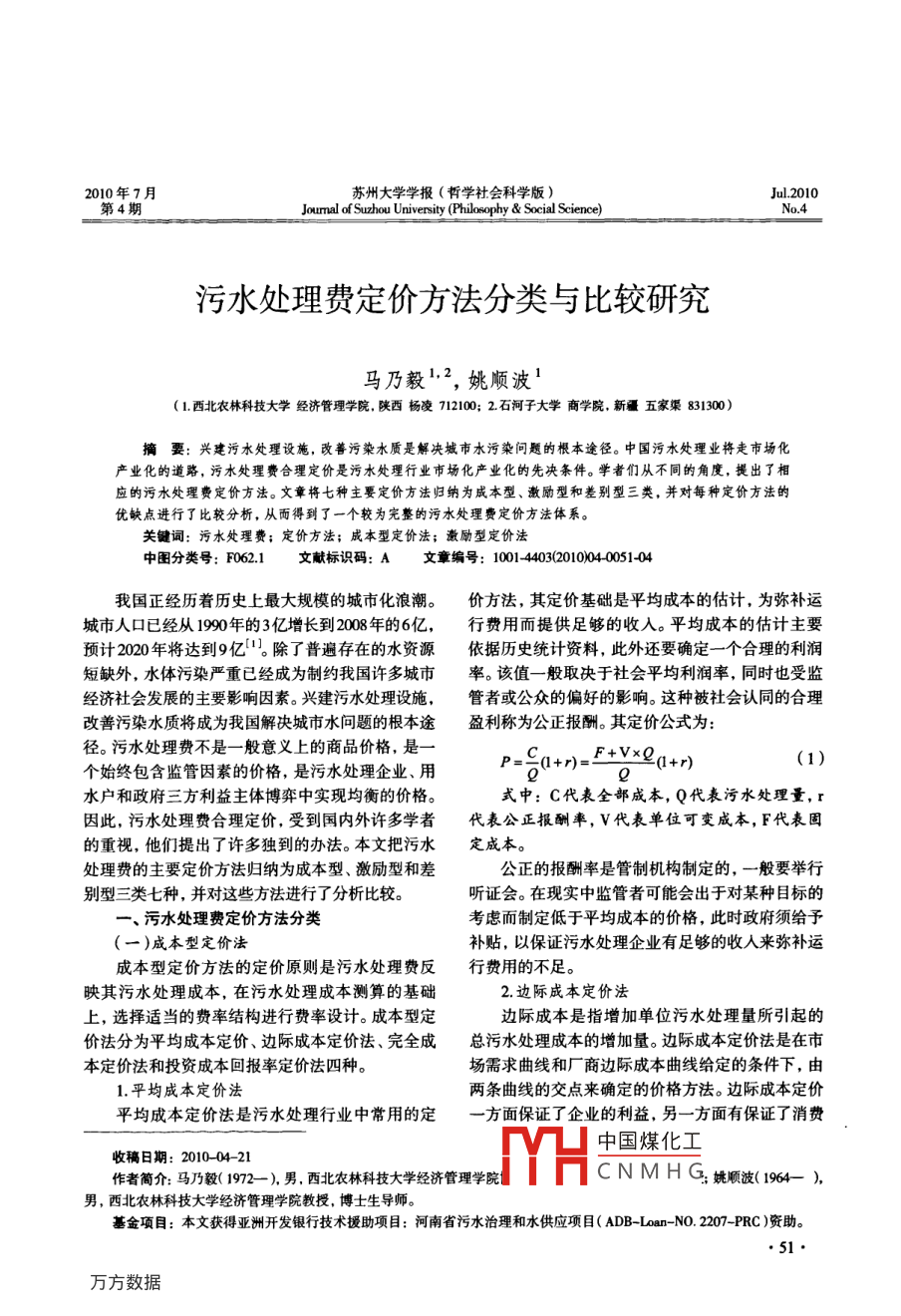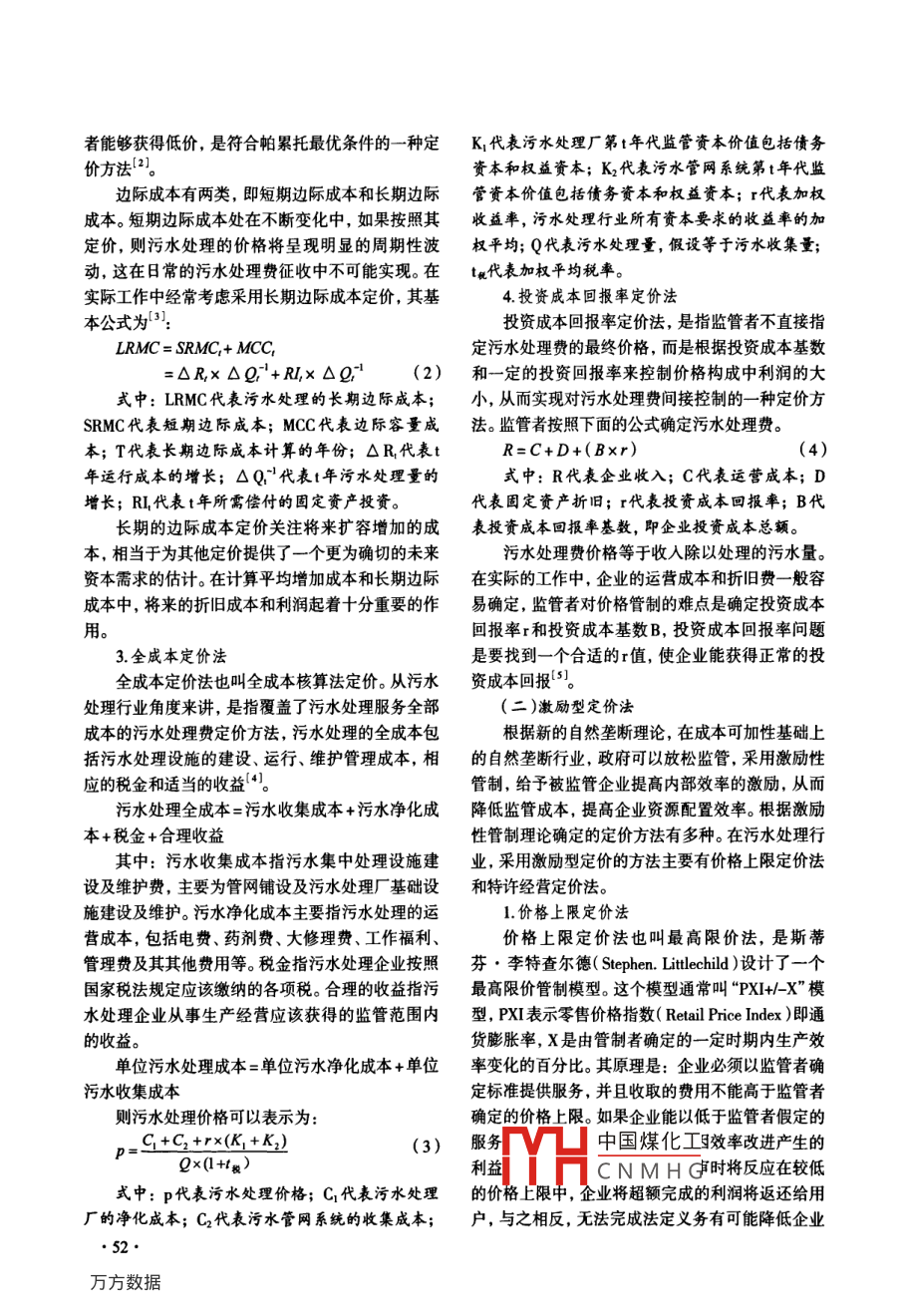 2010年7月蘇州大學(xué)學(xué)報(bào)(哲學(xué)社會(huì)科學(xué)版)Jul.2010第4期Joumal of Suzhou University (Philosophy & Social Science)No.4污水處理費(fèi)定價(jià)方法分類與比較研究馬乃毅1,2,姚順波'(1.西北農(nóng)林科技大學(xué)經(jīng)濟(jì)管理學(xué)院,陜西楊凌712100; 2.石河子大學(xué)商學(xué)院, 新疆五家渠831300)摘要:興建污水處理設(shè)施,改普污染水質(zhì)是解決城市水污染問題的根本途徑。中國污水處理業(yè)將走市場化產(chǎn)業(yè)化的道路,污水處理費(fèi)合理定價(jià)是污水處理行業(yè)市場化產(chǎn)業(yè)化的先決條件。學(xué)者們從不同的角度,提出了相應(yīng)的污水處理費(fèi)定價(jià)方法。文章將七種主要定價(jià)方法歸納為成本型、激勵(lì)型和差別型三類,并對(duì)每種定價(jià)方法的優(yōu)缺點(diǎn)進(jìn)行了比較分析,從而得到了一個(gè)較為完整的污水處理費(fèi)定價(jià)方法體系。關(guān)鍵詞:污水處理費(fèi);定價(jià)方法;成本型定價(jià)法;激勵(lì)型定價(jià)法中圖分類號(hào): F062.1文獻(xiàn)標(biāo)識(shí)碼: A文章編號(hào): 1001-4403(2010)04-0051-04我國正經(jīng)歷著歷史上最大規(guī)模的城市化浪潮。價(jià)方法,其定價(jià)基礎(chǔ)是平均成本的估計(jì),為彌補(bǔ)運(yùn)城市人口已經(jīng)從1990年的3億增長到2008年的6億,行費(fèi)用而提供足夠的收入。平均成本的估計(jì)主要預(yù)計(jì)2020年將達(dá)到9億"。除了普遍存在的水資源依據(jù)歷史統(tǒng)計(jì)資料,此外還要確定-一個(gè)合理的利潤短缺外,水體污染嚴(yán)重已經(jīng)成為制約我國許多城市率。該值-般取決于社會(huì)平均利潤率,同時(shí)也受監(jiān)經(jīng)濟(jì)社會(huì)發(fā)展的主要影響因素。興建污水處理設(shè)施,管者或公眾的偏好的影響。這種被社會(huì)認(rèn)同的合理改善污染水質(zhì)將成為我國解決城市水問題的根本途盈利稱為公正報(bào)酬。其定價(jià)公式為:徑。污水處理費(fèi)不是一般意義上的商品價(jià)格,是一P=&l+r)=- tF+VxQ(1)個(gè)始終包含監(jiān)管因素的價(jià)格,是污水處理企業(yè)、用(*2a+n)水戶和政府三方利益主體博弈中實(shí)現(xiàn)均衡的價(jià)格。式中: C代表全部成本, Q代表污水處理量,r因此,污水處理費(fèi)合理定價(jià),受到國內(nèi)外許多學(xué)者代表公正報(bào)酬率, V代表單位可變成本,F代表固的重視,他們提出了許多獨(dú)到的辦法。本文把污水定成本。處理費(fèi)的主要定價(jià)方法歸納為成本型、激勵(lì)型和差公正的報(bào)酬率是管制機(jī)構(gòu)制定的,一般要舉行別型三類七種,并對(duì)這些方法進(jìn)行了分析比較。聽證會(huì)。在現(xiàn)實(shí)中監(jiān)管者可能會(huì)出于對(duì)某種目標(biāo)的一. 污水處理費(fèi)定價(jià)方法分類考慮而制定低于平均成本的價(jià)格,此時(shí)政府須給予(一)成本型定價(jià)法補(bǔ)貼,以保證污水處理企業(yè)有足夠的收人來彌補(bǔ)運(yùn)成本型定價(jià)方法的定價(jià)原則是污水處理費(fèi)反行費(fèi)用的不足。映其污水處理成本,在污水處理成本測算的基礎(chǔ)2.邊際成本定價(jià)法上,選擇適當(dāng)?shù)馁M(fèi)率結(jié)構(gòu)進(jìn)行費(fèi)率設(shè)計(jì)。成本型定邊際成本是指增加單位污水處理量所引起的價(jià)法分為平均成本定價(jià)、邊際成本定價(jià)法、完全成總污水處理成本的增加量。邊際成本定價(jià)法是在市本定價(jià)法和投資成本回報(bào)率定價(jià)法四種。場需求曲線和廠商邊際成本曲線給定的條件下,由1.平均成本定價(jià)法兩條曲線的交點(diǎn)來確定的價(jià)格方法。邊際成本定價(jià)平均成本定價(jià)法是污水處理行業(yè)中常用的定-方面保證了企業(yè)的利益,另-方面有保證了消費(fèi)中國煤化工收稿日期: 20-04-21作者簡介:馬乃毅( 1972- ), 男.西北農(nóng)林科技大學(xué)經(jīng)濟(jì)管理學(xué)院MHCN M H G;姚順波(1964- ),男,西北農(nóng)林科技大學(xué)經(jīng)濟(jì)管理學(xué)院教授,博士生導(dǎo)師?;痦?xiàng)目:本文獲得亞洲開發(fā)銀行技術(shù)援助項(xiàng)目:河南省污水治理和水供應(yīng)項(xiàng)目( ADB-Loan -NO.2207-PRC )資助?!?1●者能夠獲得低價(jià),是符合帕累托最優(yōu)條件的- -種定K,代表污水處理廠第1年代監(jiān)管資本價(jià)值包括債務(wù)價(jià)方法[2]。資本和權(quán)益資本; K,代表污水管網(wǎng)系統(tǒng)第t年代監(jiān)邊際成本有兩類,即短期邊際成本和長期邊際管資本價(jià)值包括債務(wù)資本和權(quán)益資本; r代表加權(quán)成本。短期邊際成本處在不斷變化中,如果按照其收益率,污水處理行業(yè)所有資本要求的收益率的加定價(jià),則污水處理的價(jià)格將呈現(xiàn)明顯的周期性波權(quán)平均; Q代表污水處理量,假設(shè)等于污水收集量;動(dòng),這在日常的污水處理費(fèi)征收中不可能實(shí)現(xiàn)。在tm代表加權(quán)平 均稅率。實(shí)際工作中經(jīng)常考慮采用長期邊際成本定價(jià),其基4.投資成本回報(bào)率定價(jià)法.本公式為'31: .投資成本回報(bào)率定價(jià)法,是指監(jiān)管者不直接指LRMC = SRMC,+ MCC,定污水處理費(fèi)的最終價(jià)格,而是根據(jù)投資成本基數(shù)=OR,x OQ,'+Rl,x OQ;" (2)和一定的投資回報(bào)率來控制價(jià)格構(gòu)成中利