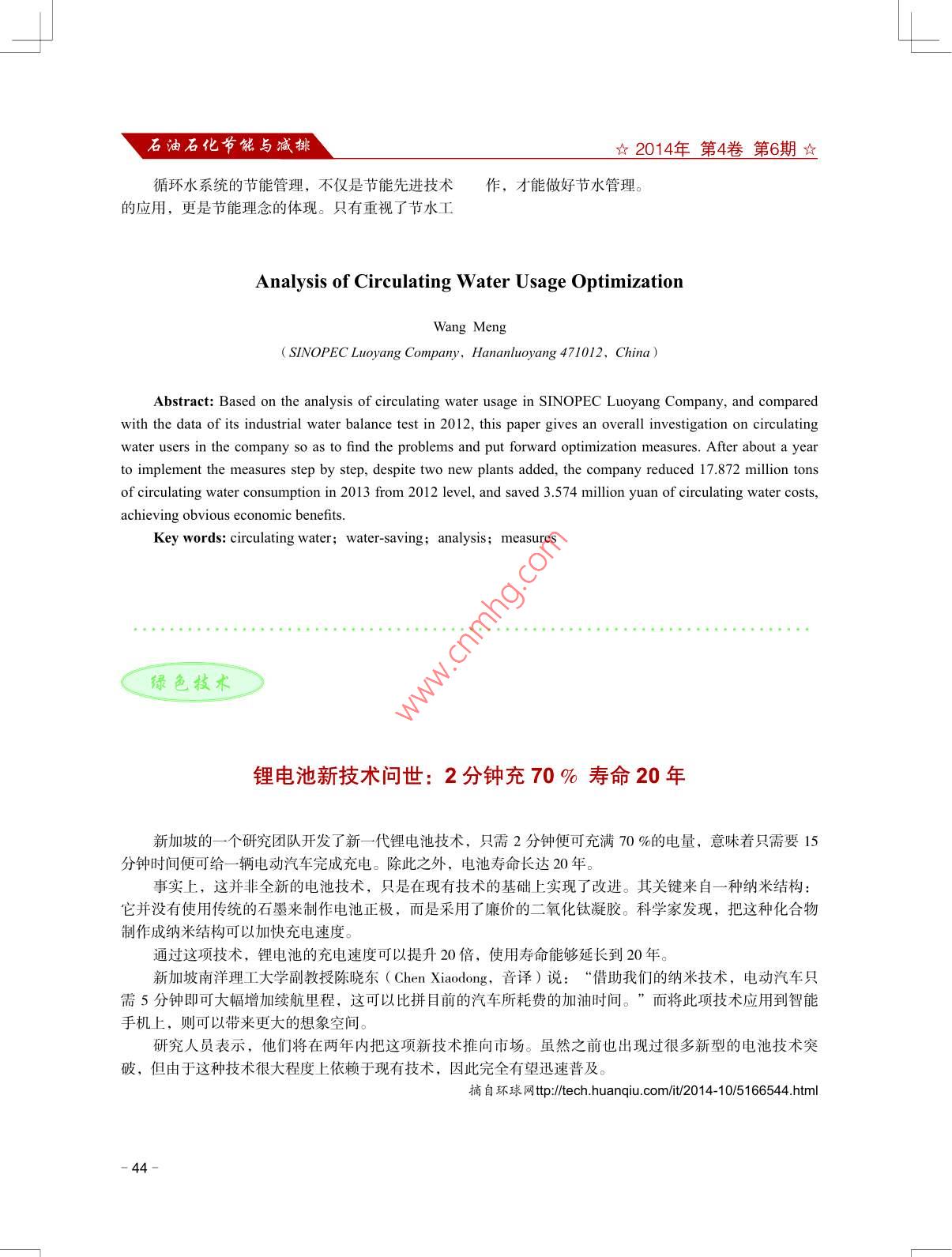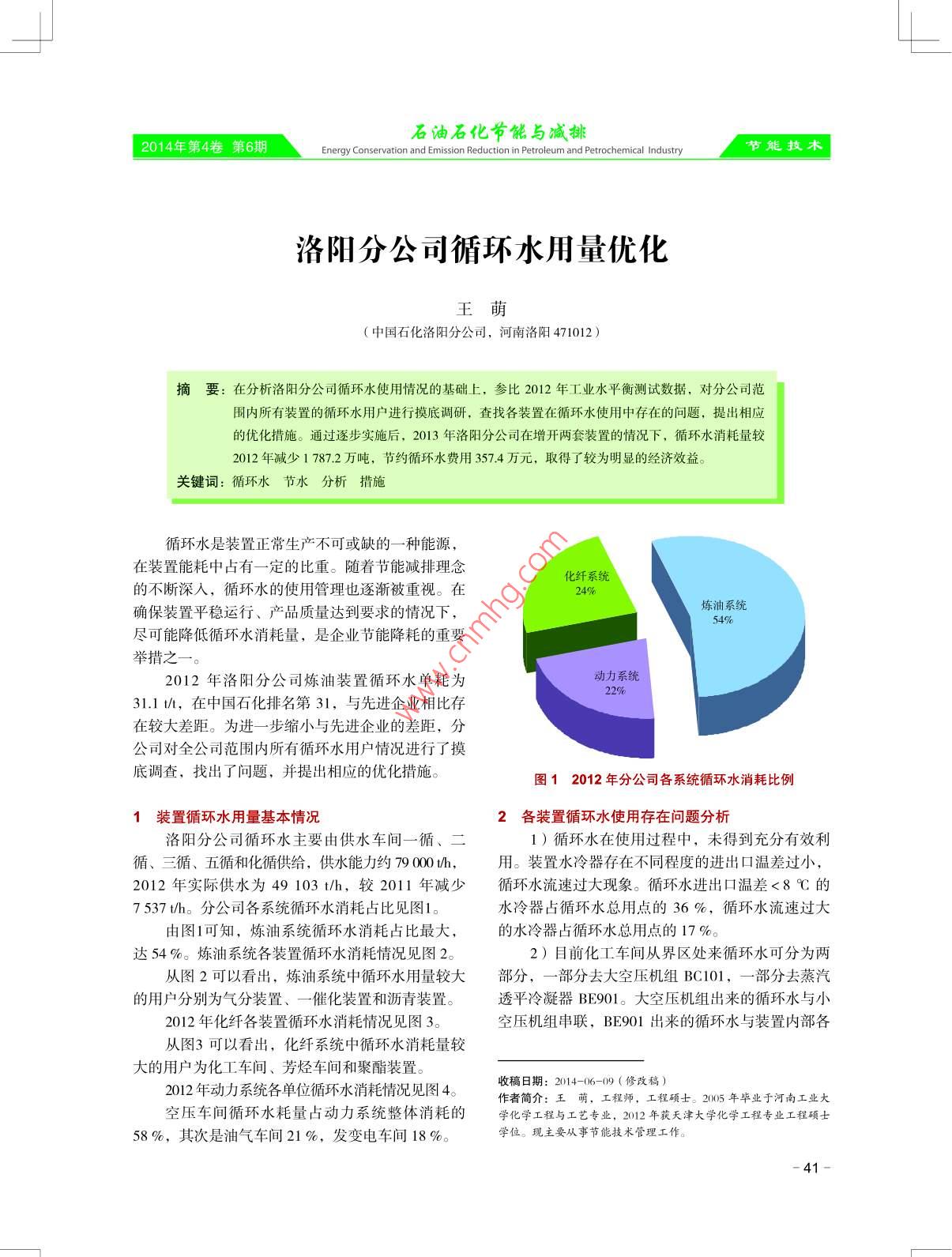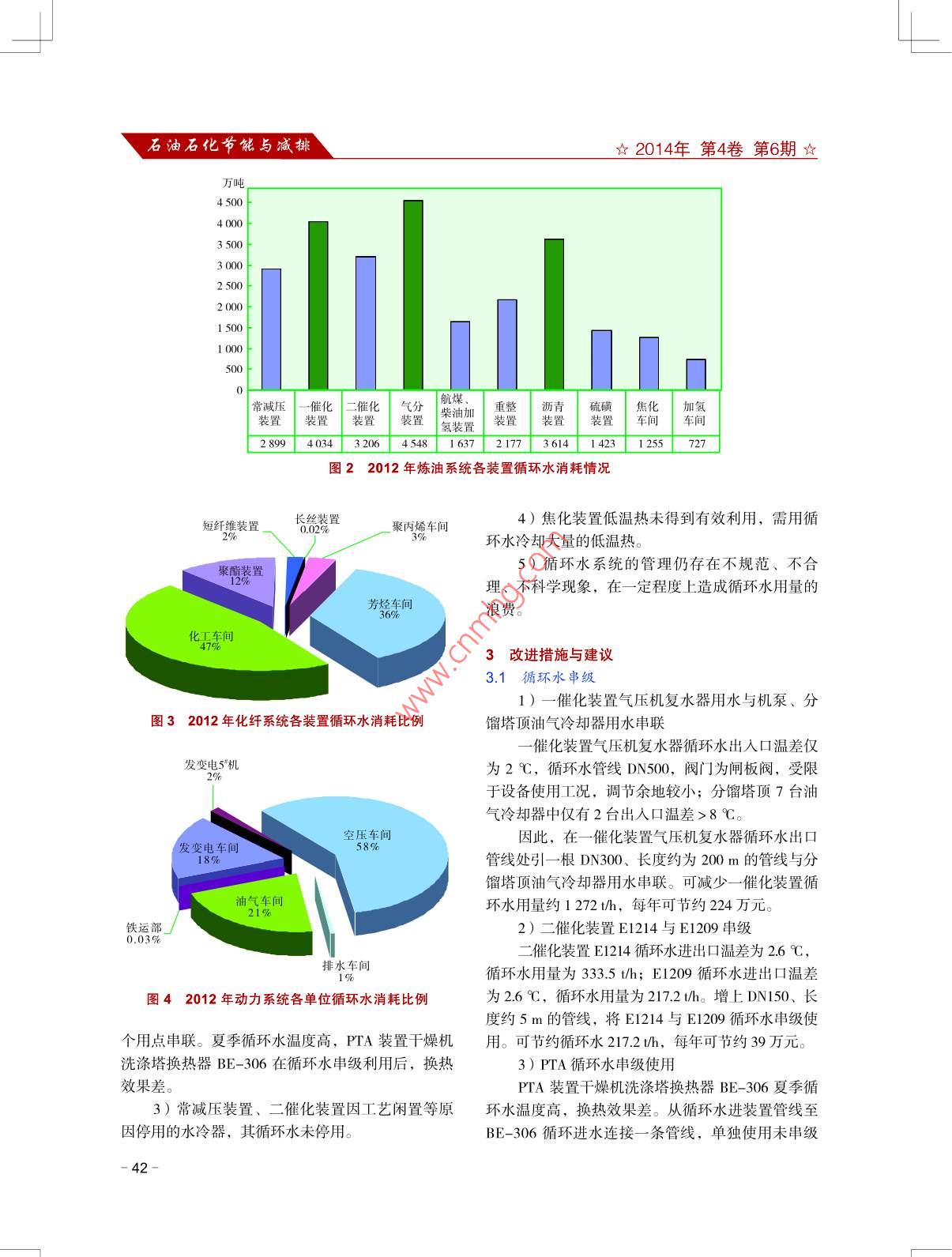 石油石化節(jié)能與減2014年第4卷第6期Energy Conservation and Emission Reduction in Petroleum and Pemical Industry節(jié)能技木洛陽分公司循環(huán)水用量?jī)?yōu)化王萌中國(guó)石化洛陽分公司,河南洛陽471012)摘要:在分析洛陽分公司循環(huán)水使用情況的基礎(chǔ)上,參比2012年工業(yè)水平衡測(cè)試數(shù)據(jù),對(duì)分公司范圍內(nèi)所有裝置的循環(huán)水用戶進(jìn)行摸底調(diào)研,查找各裝置在循環(huán)水使用中存在的問題,提出相應(yīng)的優(yōu)化措施。通過逐步實(shí)施后,2013年洛陽分公司在增開兩套裝置的情況下,循環(huán)水消耗量較012年減少1787.2萬噸,節(jié)約循環(huán)水費(fèi)用3574萬元,取得了較為明顯的經(jīng)濟(jì)效益關(guān)鍵詞:循環(huán)水節(jié)水分析措施循環(huán)水是裝置正常生產(chǎn)不可或缺的一種能源,在裝置能耗中占有一定的比重。隨著節(jié)能減排理念化纖系統(tǒng)的不斷深入,循環(huán)水的使用管理也逐漸被重視。在確保裝置平穩(wěn)運(yùn)行、產(chǎn)品質(zhì)量達(dá)到要求的情況下,煉油系統(tǒng)盡可能降低循環(huán)水消耗量,是企業(yè)節(jié)能降耗的重要舉措之2012年洛陽分公司煉油裝置循環(huán)水單耗為動(dòng)力系統(tǒng)31.1t,在中國(guó)石化排名第31,與先進(jìn)企業(yè)相比存在較大差距。為進(jìn)一步縮小與先進(jìn)企業(yè)的差距,分公司對(duì)全公司范圍內(nèi)所有循環(huán)水用戶情況進(jìn)行了摸底調(diào)查,找出了問題,并提出相應(yīng)的優(yōu)化措施。圖12012年分公司各系統(tǒng)循環(huán)水消耗比例1裝置循環(huán)水用量基本情況2各裝置循環(huán)水使用存在問題分析洛陽分公司循環(huán)水主要由供水車間一循循環(huán)水在使用過程中,未得到充分有效利循、三循、五循和化循供給,供水能力約79000h,用。裝置水冷器存在不同程度的進(jìn)出口溫差過小2012年實(shí)際供水為49103t/h,較2011年減少循環(huán)水流速過大現(xiàn)象。循環(huán)水進(jìn)出口溫差<8℃的7537th。分公司各系統(tǒng)循環(huán)水消耗占比見圖1水冷器占循環(huán)水總用點(diǎn)的36%,循環(huán)水流速過大由圖1可知,煉油系統(tǒng)循環(huán)水消耗占比最大,的水冷器占循環(huán)水總用點(diǎn)的17%達(dá)54%。煉油系統(tǒng)各裝置循環(huán)水消耗情況見圖2。2)目前化工車間從界區(qū)處來循環(huán)水可分為兩從圖2可以看出,煉油系統(tǒng)中循環(huán)水用量較大部分,一部分去大空壓機(jī)組BC101,一部分去蒸汽的用戶分別為氣分裝置、一催化裝置和瀝青裝置。透平冷凝器BE901。大空壓機(jī)組出來的循環(huán)水與小2012年化纖各裝置循環(huán)水消耗情況見圖3。空壓機(jī)組串聯(lián),BE901出來的循環(huán)水與裝置內(nèi)部各從圖3可以看出,化纖系統(tǒng)中循環(huán)水消耗量較大的用戶為化工車間、芳烴車間和聚酯裝置。2012年動(dòng)力系統(tǒng)各單位循環(huán)水消耗情況見圖4收稿日期:2014-06-09(修改稿)作者簡(jiǎn)介:王萌,工程師,工程碩士。205年畢業(yè)于河南工業(yè)大空壓車間循環(huán)水耗量占動(dòng)力系統(tǒng)整體消耗的學(xué)化學(xué)工程與工藝專業(yè),2012年獲天津大學(xué)化學(xué)工程專業(yè)工程碩士58%,其次是油氣車間21%,發(fā)變電車間18%學(xué)位?,F(xiàn)主要從事節(jié)能技術(shù)管理工作41\石油石化節(jié)能與減☆2014年第4卷第6期☆萬噸4500400035003000250015001000航煤催化二催化氣分柴油加重整硫磺加氫裝置裝置裝置氫裝置裝置裝置4034320645481637217736141423圖22012年煉油系統(tǒng)各裝置循環(huán)水消耗情況短纖維裝置絲裝置聚丙烯車間焦化裝置低溫?zé)嵛吹玫接行Ю?需用循環(huán)水冷卻大量的低溫?zé)?。聚酯裝置5)循環(huán)水系統(tǒng)的管理仍存在不規(guī)范、不合理、不科學(xué)現(xiàn)象,在一定程度上造成循環(huán)水用量的芳烴車間36%浪費(fèi)?;ぼ囬g3改進(jìn)措施與建議3.1循環(huán)水串級(jí)1)一催化裝置氣壓機(jī)復(fù)水器用水與機(jī)泵、分圖32012年化纖系統(tǒng)各裝置循環(huán)水消耗比例餾塔頂油氣冷卻器用水串聯(lián)催化裝置氣壓機(jī)復(fù)水器循環(huán)水出入口溫差僅發(fā)變電5機(jī)為2℃,循環(huán)水管線DN500,閥門為閘板閥,受限于設(shè)備使用工況,調(diào)節(jié)余地較小;分餾塔頂7臺(tái)油氣冷卻器中僅有2臺(tái)出入口溫差>8℃空壓車間發(fā)變電車間因此,在一催化裝置氣壓機(jī)復(fù)水器循環(huán)水出口18%管線處引一根DN300、長(zhǎng)度約為200m的管線與分餾塔頂油氣冷卻器用水串聯(lián)。可減少一催化裝置循油氣車間21%環(huán)水用量約1272th,每年可節(jié)約224萬元。鐵運(yùn)部2)二催化裝置E1214與E1209串級(jí)二催化裝置E214循環(huán)水進(jìn)出口溫差為26℃,排水車間循環(huán)水用量為3335th;E1209循環(huán)水進(jìn)出口溫差圖42012年動(dòng)力系統(tǒng)各單位循環(huán)水消耗比例為26℃,循環(huán)水用量為217.,2ih。增上DN150、長(zhǎng)度約5m的管線,將E1214與E1209循環(huán)水串級(jí)使個(gè)用點(diǎn)串聯(lián)。夏季循環(huán)水溫度高,PTA裝置干燥機(jī)用??晒?jié)約循環(huán)水217.2th,每年可節(jié)約39萬元洗滌塔換熱器BE-306在循環(huán)水串級(jí)利用后,換熱3)PTA循環(huán)水串級(jí)使用效果差PTA裝置干燥機(jī)洗滌塔換熱器BE-306夏季循3)常