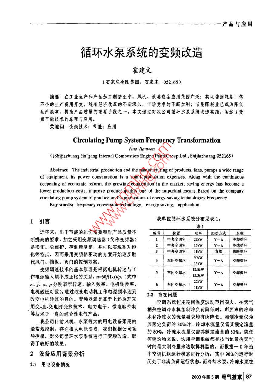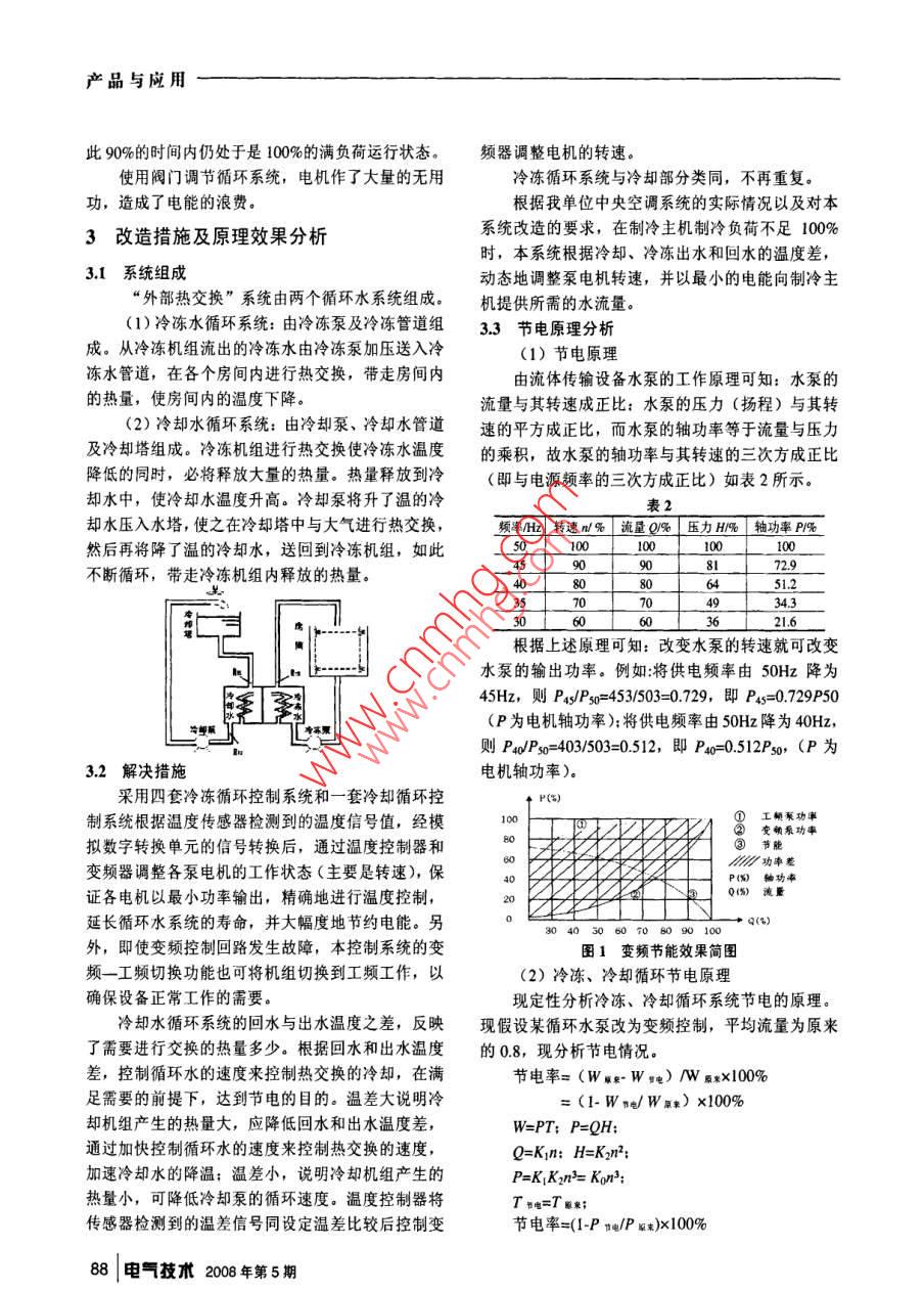 產(chǎn)品與應(yīng)用循環(huán)水泵系統(tǒng)的變頻改造霍建文(石家莊金剛集團(tuán),石家莊052165)摘要在工業(yè)生產(chǎn)和產(chǎn)品加工制造業(yè)中,風(fēng)機(jī)、泵類設(shè)備應(yīng)用范圍廣泛;其電能消耗是一筆不小的生產(chǎn)費(fèi)用開支。隨著經(jīng)濟(jì)改革的不斷深入,市場竟?fàn)幍牟粩嗉觿?節(jié)能降耗業(yè)已成為降低生產(chǎn)成本、提高產(chǎn)品質(zhì)量的重要手段之一,本文通過對我公司循環(huán)水泵系統(tǒng)改造實踐,闡述了變頻節(jié)能技朮的原理與應(yīng)用關(guān)鍵詞:變頻技術(shù);節(jié)能;應(yīng)用Circulating Pump System Frequency TransformationHuo jianwen((Shijiazhuang Jin gang Internal Combustion Engine Parts Group, Ltd, Shijiazhuang 052165Abstract The industrial production and the manufacturing of products, fans, pumps a wide rangeof equipment, its power consumption is a small production expenses. Alodeepening of economic reform, the growing competition in the market; saving energy has become acirculating pump system of practice on the application of energy-saving technologies Frequency panylower production costs, improve product quality one of the important means Based on the corKey words frequency conversion technology; energy saving; application1引言我單位循環(huán)水系統(tǒng)分布見表1。表1近年來,出于節(jié)能的迫切需要和對產(chǎn)品質(zhì)量不語號位置功率起動方式名稱斷提高的要求,加之采用變頻調(diào)速器(簡稱變頻器「中央空調(diào)室」2W「Y-△冷卻循環(huán)易操作、免維護(hù)、控制精度高,并可以實現(xiàn)高功能中央空調(diào)室1wy-△冷凍循環(huán)化等特點,因而采用變頻器驅(qū)動的方案開始逐步取中央空調(diào)室供暖循環(huán)代風(fēng)門、擋板、閥門的控制方案。車間冷卻水30w△冷卻循環(huán)15kw變頻調(diào)速技術(shù)的基本原理是根據(jù)電機(jī)轉(zhuǎn)速與工5車間冷卻水Y-△|冷卻循環(huán)作電源輸入頻率成正比的關(guān)系:m=60(1-),(式中185kWn、八、5、P分別表示轉(zhuǎn)速、輸入頻率、電機(jī)轉(zhuǎn)差率Y冷卻循環(huán)電機(jī)磁極對數(shù))通過改變電動機(jī)工作電源頻率達(dá)到22存在問題改變電機(jī)轉(zhuǎn)速的目的。變頻器就是基于上述原理采用交直交電源變換技術(shù)、電力電子、微電腦控制空調(diào)系統(tǒng)使用期間溫度波動范圍很大,在天氣等技術(shù)于一身的綜合性電氣產(chǎn)品。稍熱空調(diào)冷水機(jī)組制冷負(fù)荷降低時,所要求的冷卻水和冷凍水的流量要求均有所降低。如制冷量僅為我公司目前風(fēng)機(jī)、水泵等大的用電設(shè)備采用的其額定負(fù)荷的80%時,冷卻水流量僅需其額定流量是常規(guī)控制,存在很大電能浪費(fèi),我們根據(jù)公司領(lǐng)的80%,泠凍水流量僅需其額定流量的80%,就任導(dǎo)授權(quán),對公司循環(huán)水泵系統(tǒng)進(jìn)行了變頻改造,取何建筑物來說,選用空調(diào)系統(tǒng)都是按當(dāng)?shù)刈顭崽鞖獾昧溯^好的效果。時的最大制冷量來選取擇機(jī)型的,而根據(jù)一0年當(dāng)2設(shè)備應(yīng)用背景分析中空調(diào)機(jī)組運(yùn)行狀態(tài)進(jìn)行分析,其中90%的運(yùn)行時21用電設(shè)備情況間處于非滿負(fù)荷運(yùn)行狀態(tài)。而冷卻水泵、冷凍水泵在208年第5期電氣技術(shù)|87產(chǎn)品與應(yīng)用此90%的時間內(nèi)仍處于是100%的滿負(fù)荷運(yùn)行狀態(tài)。頻器調(diào)整電機(jī)的轉(zhuǎn)速。使用閥門調(diào)節(jié)循環(huán)系統(tǒng),電機(jī)作了大量的無用冷凍循環(huán)系統(tǒng)與冷卻部分類同,不再重復(fù)。功,造成了電能的浪費(fèi)根據(jù)我單位中央空調(diào)系統(tǒng)的實際情況以及對本3改造措施及原理效果分析系統(tǒng)改造的要求,在制冷主機(jī)制冷負(fù)荷不足100%時,本系統(tǒng)根據(jù)冷卻、冷凍出水和回水的溫度差,3.1系統(tǒng)組成動態(tài)地調(diào)整泵電機(jī)轉(zhuǎn)速,并以最小的電能向制冷主外部熱交換”系統(tǒng)由兩個循環(huán)水系統(tǒng)組成。機(jī)提供所需的水流量。(1)冷凍水循環(huán)系統(tǒng):由冷凍泵及冷凍管道組3.3節(jié)電原理分析成。從冷凍機(jī)組流出的冷凍水由冷凍泵加壓送入冷(1)節(jié)電原理凍水管道,在各個房間內(nèi)進(jìn)行熱交換,帶走房間內(nèi)由流體傳輸設(shè)備水泵的工作原理可知:水泵的的熱量,使房間內(nèi)的溫度下降。流量與其轉(zhuǎn)速成正比:水泵的壓力(揚(yáng)程)與其轉(zhuǎn)(2)冷卻水循環(huán)系統(tǒng):由冷卻泵、冷卻水管道速的平方成正比,而水泵的軸功率等于流量與壓力及冷卻塔組成。冷凍機(jī)組進(jìn)行熱交換使冷凍水溫度的乘積,故水泵的軸功率與其轉(zhuǎn)速的三次方成正比降低的同時,必將釋放大量的熱量。熱量釋放到冷(即與電源頻率的三次方成正比)如表2所示。卻水中,使冷卻水溫度升高。冷卻泵將升了溫的冷表2卻水壓入水塔,使之在冷卻塔中與大氣進(jìn)行熱交換頻率H轉(zhuǎn)速m%流量O%「壓力H%軸功率PA然后再將降了溫的冷卻水,送回到冷凍機(jī)組,如此不斷循環(huán),帶走冷凍機(jī)組內(nèi)釋放的熱量35709876根據(jù)上述原理可知:改變水泵的轉(zhuǎn)速就可改變水泵的輸出功率。例如將供電頻率由50Hz降為45Hz,則P4Ps0=453/503=0.729,即P45=0.729P50(P為電機(jī)軸功率);將供電頻率由50Hz降為40Hz則Po/Pso=403/503=0.