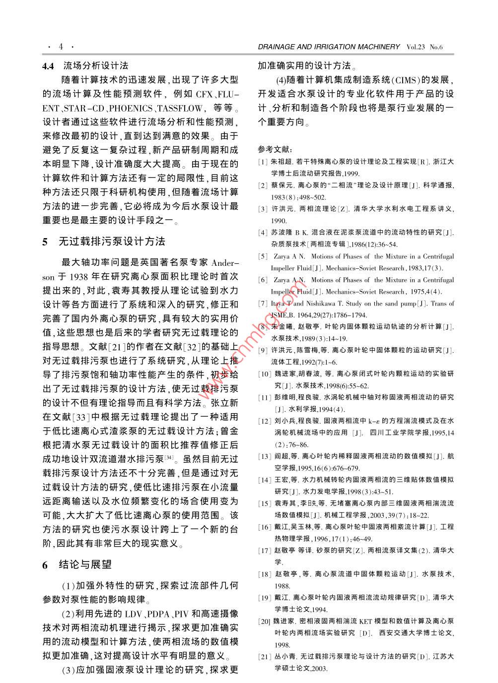 排灌機(jī)械第23卷 第6期叢小青等:污水泵的研究現(xiàn)狀與進(jìn)展1.污水泵的研究現(xiàn)狀與進(jìn)展叢小青,袁壽其,袁丹青2,陸偉剛1(1.江蘇大學(xué)流體機(jī)械工程技術(shù)中心,江蘇鎮(zhèn)江212013; 2.江蘇大學(xué)能源與動(dòng)力工程學(xué)院.江蘇鎮(zhèn)江212013),摘要:研究固液兩相流體在離心泵內(nèi)的運(yùn)動(dòng)規(guī)律、完善其設(shè)計(jì)理論和設(shè)計(jì)方法-直是設(shè)計(jì)人員十分重視的課題。針對(duì)污水泵的研究情況,分別從污水泵理論研究?jī)?nèi)特性研究、外特性研究、水力設(shè)計(jì)等幾個(gè)方面對(duì)污水泵的研究現(xiàn)狀進(jìn)行了較為詳細(xì)的闡述,指出加強(qiáng)泵內(nèi)外特性研究、探求流動(dòng)機(jī)理、開發(fā)適合水泵設(shè)計(jì)的專業(yè)化軟件用于泵產(chǎn)品的計(jì)算機(jī)集成制造(CIMS),將是泵行業(yè)發(fā)展的重要方向。關(guān)鍵詞:污水泵;兩相流;研究;現(xiàn)狀;進(jìn)展中圖分類號(hào): TH311文獻(xiàn)標(biāo)識(shí)碼: A文章編號(hào): 1005- -6254(2005)06 -001-0505理論及設(shè)計(jì)原理,即相對(duì)堵塞和相對(duì)抽吸理論:0引言當(dāng)固體速度小于水流速度時(shí)(例如在葉輪進(jìn)口),污水泵廣泛應(yīng)用于石化、礦山、冶金、電力以固相對(duì)水流產(chǎn)生相對(duì)堵塞效應(yīng);反之產(chǎn)生相對(duì)抽及城市排污等污水處理作業(yè)。隨著國(guó)民經(jīng)濟(jì)的發(fā)吸作用(例如在葉輪出口)。故而提出了兩相流水展,市場(chǎng)對(duì)污水泵的需求量日益增大。由于污水流畸變?cè)O(shè)計(jì)法并給出了畸變方程和輸運(yùn)方程[2]泵工作條件相當(dāng)惡劣,所抽送的介質(zhì)對(duì)污水泵工這個(gè)理論開創(chuàng)了固液兩相流宏觀研究的新局面。況有很大影響。因此,同清水泵相比,同樣比轉(zhuǎn)速80年代末,許洪元教授提出了固液兩相流速的污水泵效率相對(duì)較低,使用壽命較短,這將增度比理論[3],即:離心泵中兩相流動(dòng)屬于分離流加設(shè)備投資。因此,深入研究污水泵內(nèi)部流動(dòng)機(jī)動(dòng),在流道的不同部位,固體顆粒的受力不同,固理、提高污水泵效率和壽命一直是科研工作者努液兩相間的速度比發(fā)生變化,使兩相流體的濃度力的目標(biāo)。本文分別從污水泵理論研究、內(nèi)特性比隨之變化,由此導(dǎo)出了固液速度比方程,并給研究、外特性研究、水力設(shè)計(jì)等幾個(gè)方面介紹了出了葉輪幾何參數(shù)的計(jì)算公式。污水泵的研究現(xiàn)狀,并對(duì)今后的發(fā)展方向作了展2內(nèi)特性研究望。2.1泵輪內(nèi)固體顆粒運(yùn)動(dòng)規(guī)律的研究1流動(dòng)理論研究研究泵輪內(nèi)固體顆粒運(yùn)動(dòng)規(guī)律對(duì)污水泵設(shè)國(guó)內(nèi)外對(duì)固液兩相流動(dòng)理論作了很多研究,計(jì)有著重要的指導(dǎo)意義。30年前國(guó)外就有學(xué)者采但大多為管道內(nèi)的流動(dòng),對(duì)離心泵內(nèi)的流動(dòng)研究用高速攝影技術(shù)拍攝泵輪中固體顆粒運(yùn)動(dòng)軌跡,較少。在兩相流條件下,因?yàn)閼T性力不同,固液兩此后這方面的研究時(shí)有報(bào)道。蘇 波隆用高速攝影相各以不同的速度運(yùn)動(dòng)。只有根據(jù)兩相流的速度機(jī)拍攝了葉輪中顆粒分別為8~10mm的沙礫和場(chǎng)來(lái)設(shè)計(jì)泵的葉型和流道才能更有效地轉(zhuǎn)換能1~2mm的沙子的運(yùn)動(dòng)軌跡結(jié)果表明:顆粒質(zhì)量量并降低磨損。但泵內(nèi)的流態(tài)十分復(fù)雜,即使清越大,其運(yùn)動(dòng)軌跡越偏離葉片工作面4]。沙利亞分水也無(wú)法用純數(shù)學(xué)的方法求解,對(duì)于兩相流困難別于1975年和1983年利用高速攝影技術(shù)得到更大。到目前為止,還沒(méi)有建立一個(gè)公認(rèn)的數(shù)學(xué)了固體顆粒的運(yùn)動(dòng)軌跡,1975年作出的結(jié)論是顆方程式中。粒質(zhì)量越大,其運(yùn)動(dòng)軌跡越靠近葉片工作面,與70年代中期,蔡保元教授首先提出了兩相流蘇波隆結(jié)論截然相反;而1983年作出的結(jié)論和基金項(xiàng)目:江蘇省教育廳高新技術(shù)產(chǎn)業(yè)發(fā)展項(xiàng)目(JH03- 033);江蘇省教育廳六大人才資助項(xiàng)目作者簡(jiǎn)介:叢小青( 1966.6-),女,山東威海人,江蘇大學(xué)在讀博士生副研究員。DRAINAGE AND IRRIGATION MACHINERY Vol.23 No.6蘇波隆的結(jié)論相同15.1。板谷樹用高速攝像機(jī)拍攝;方法;如果顆粒相只被處理成一相的話,常常又泵輪中顆粒分別為5.19 mm .8.82 mm.12.75 mm被稱為雙流體模型。第二類是把流體當(dāng)作連續(xù)介的玻璃球的運(yùn)動(dòng)軌跡,并用Lagrange法進(jìn)行理論質(zhì),顆粒被視為離散體,在Euler 坐標(biāo)系下考察流計(jì)算,發(fā)現(xiàn)在該粒徑范圍內(nèi),質(zhì)量對(duì)運(yùn)動(dòng)軌跡幾體相的運(yùn)動(dòng),在Lagrange坐標(biāo)系下研究顆粒群的乎沒(méi)有影響[7運(yùn)動(dòng),即顆粒群軌道模型。第三類模型是液體擬國(guó)內(nèi)自20世紀(jì)80年代后期,清華大學(xué)、西顆粒模型,該模型不僅將宏觀離散顆粒當(dāng)成離散安交大、浙江大學(xué)先后開始涉及這一課題研究。相處理,還將連續(xù)的液體也采用擬顆粒性質(zhì)的流朱金曦、趙敬亭在文獻(xiàn)[8]中采用固體兩相流離體微團(tuán)來(lái)處理。