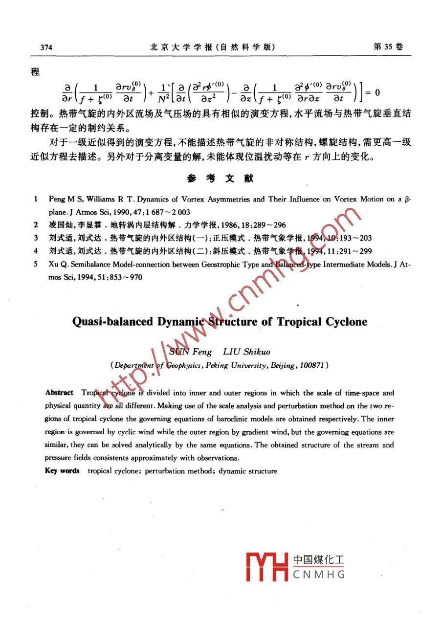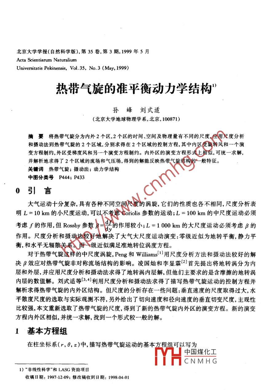 北京大學學報(自然科學版),第35卷,第3期,1999年5月Acta Scientiarum NaturaliumUniversitatis Pekinensis, Vol 35, No. 3(May, 1999)熱帶氣旋的準平衡動力學結構”孫峰劉式適北京大學地球物理學系,北京,100871)摘要將熱帶氣旋分為內(nèi)外2個區(qū),2個區(qū)的時間、空間及物理量有不同的尺度,應用尺度分析和攝動法到熱帶氣旋的2個區(qū)域,分別求得在2個區(qū)域的控制方程,其中內(nèi)區(qū)受旋轉(zhuǎn)風和一個演變方程制約,外區(qū)受梯度風和另一個演變方程制約。內(nèi)外區(qū)的演變方程形式上相似,可統(tǒng)一求解,并解析地求得了2個區(qū)域的流場和氣壓場,得到的解能反映熱帶氣旋結構的一般特征。關鑣詞熱帶氣旋;攝動法;動力學結構中圖分類號P444;P4330引言大氣運動十分復雜,具有各種不同空間尺度的渦旋,它們的性質(zhì)也各不相同,尺度分析表明L=10km的小尺度運動,可以不考慮 Coriolis參數(shù)的運動;L=100km的中尺度運動必須考慮∫的作用,但Rsy參數(shù)=出的作用較小;L=100km的大尺度運動必須考慮B的作用。尺度分析和攝動法較好地解決了大氣大尺度運動演變:零級近似為地轉(zhuǎn)平衡,靜力平衡,和水平無輻散關系。而一級近似滿足準地轉(zhuǎn)位渦度方程。對于熱帶氣旋這樣的中尺度渦旋Peng和 williamsi用尺度分析方法和攝動法較好的解決β效應對熱帶氣旋非對稱流場結構的影響。凌國燦和李顯霖(2首先提出將地轉(zhuǎn)渦分為內(nèi)層和外層,并應用尺度分析和攝動法求得了地轉(zhuǎn)渦內(nèi)層解,但他們主要求的是含摩擦的地轉(zhuǎn)渦內(nèi)層的數(shù)值解。劉式適等34利用尺度分析和攝動法求得了描寫熱帶氣旋運動的控制方程并解析求得熱帶氣旋的內(nèi)外區(qū)結構。但尺度的分析存在一些問題:垂直速度的尺度取得過大,水平散度尺度的選取與實際觀測不符,另外給出了切向速度和徑向速度的垂直切變尺度,主觀性比較強,本文重新選取了熱帶氣旋的尺度,得到了新的熱帶氣旋內(nèi)外區(qū)的演變方程。新的演變方程內(nèi)外區(qū)相似,并統(tǒng)一求解,找到一個形式較一般的解。1基本方程組在柱坐標系(r,0,z)中描寫熱帶氣旋運動的基本方程組可以寫為中國煤化工CNMHG1)“非線性科學”和LASG資助項目收稿日期:1997-1209;修改稿收到日期:199804013孫峰等:熱帶氣旋的準平衡動力學結構367OUr. vr orUa卓fvvaveatar1a(m)+19+9=08/φ8/9a/aψ8/⑨乎ataz(a2)+N2u=0。其中v、v和w分別表示徑向速度,切向速度和垂直速度。φ≡p1p0(p為靜止空氣密度p為相對于靜態(tài)大氣的氣壓偏差),∫為 Coriolis參數(shù)(設為常數(shù)),N為濕的 Brunt- Vaisala頻率,在垂直方向應用了靜力平衡,即az60為靜態(tài)大氣的位溫,0′為相對于靜態(tài)大氣的位溫偏差。另外,方程組(1)中未考慮摩擦力的作用,且絕熱方程采用濕絕熱形式。大量觀測事實表明,熱帶氣旋存在一個含臺風眼的內(nèi)區(qū)和有強烈天氣變化的外區(qū)。熱帶氣旋的內(nèi)外區(qū)的物理量的尺度結構和天氣都有很大的不同,熱帶氣旋內(nèi)區(qū)水平尺度小,邊緣切向速度達到最大,變化相對較快;外區(qū)水平尺度大,廣大地區(qū)切向速度相對較小,變化相對較慢,因而將熱帶氣旋分為內(nèi)外區(qū)分別討論。設熱帶氣旋水平尺度為L(100km),垂直尺度為D(10km),特征水平風速取為U=10m·s-1,以c(10-1)作為小參數(shù)。在熱帶氣旋內(nèi)區(qū)水平尺度可取為EL(10km),內(nèi)區(qū)的徑向速度,切向速度和垂直運動尺度各取為U,U,EDU/L,外區(qū)的徑向速度,切向速度和垂直運動尺度各取為U,eU,e2DU/L,內(nèi)外區(qū)中的特征值都取為U22內(nèi)區(qū)的攝動法首先考慮熱帶氣旋內(nèi)區(qū)的運動為使方程無量綱化,設f= fofarI v,中11r十2rI drI其中下標為1的量表示量綱為1的量。在上式中已考慮到水平散度的尺度要比構成水平散度的最大項小1個量級。將(3)式代入方程組(1),得到Ue. oUratI ar十ETura8f1ar1eLave,ve, a中國煤化工e141CNMHGaφ1中1v中i or1/ dz1az, az368北京大學學報(自然科學版)第35卷其中R=U.F,ND為 Rossby數(shù)和 Froude數(shù),在本文的尺度分析下,Ro=O(10p),F,=O(1031),對方程組(3)中的物理量作如下的攝動展開:υ,=υ+εv2+e2v+(5)w=v)+εvP2)+2w{)+…,蚱=40)+e中+c2中2)+…其中上標為(0)的量表零級近似,上標為(1)的量表一級近似,其余類推。此外,考慮了熱帶氣旋的3個速度中切向速度為最大。將(5)式代入方程組(4),可求得它的零級近似和一級近似分別為a中(0)a中1)(6)=0v.)av/1)2v0)v()r10)(1)(1)r1 a8a8(7)awrI a8 az1a+,()8)910(1)at11 ar1/az1小+a1)=0。(6)式表示零級近似滿足旋轉(zhuǎn)風關系而且軸對稱。由于v0)=0,因此au8/0=0,實際上表示的就是零級近似是水平無輻散,這是主導氣流的特征S。令()1e ar iDa1(x1v().01°)為無量綱的相對垂直渦度的零級近似,D)為無量綱的水平散度的一級近似。這樣,方程組(7)的后3式可以改寫為1)rIUrlv:,+a0D832r1510)824)arIa(9)中的第一式對r1徵商,得ar,va?sir,Dg+a821中國煤化工由方程組(9)的第2個方程和第3個方程有CNMHGr3中谷2r1℃(1)zariarId第3期孫峰等:熱帶氣旋的準平衡動力學結構3698/a3中0(8x2)ax把(11)式代入(10)式,并利用(9)的第1式,可得到a oriGarir1Uat, ar,asa/a5;()roz。(6+803araz a0az1(3(m#)e(1)avga2中1(1or10°上式左端與無關,而右端各項均為一與6無關的量(零級近似量)與另一函數(shù)(一級近似量對θ微商的乘積,由于物理量的單值性,則右端各項對a積分1周后均為零,由此得到a2∮0at1 azfat1)az11621這