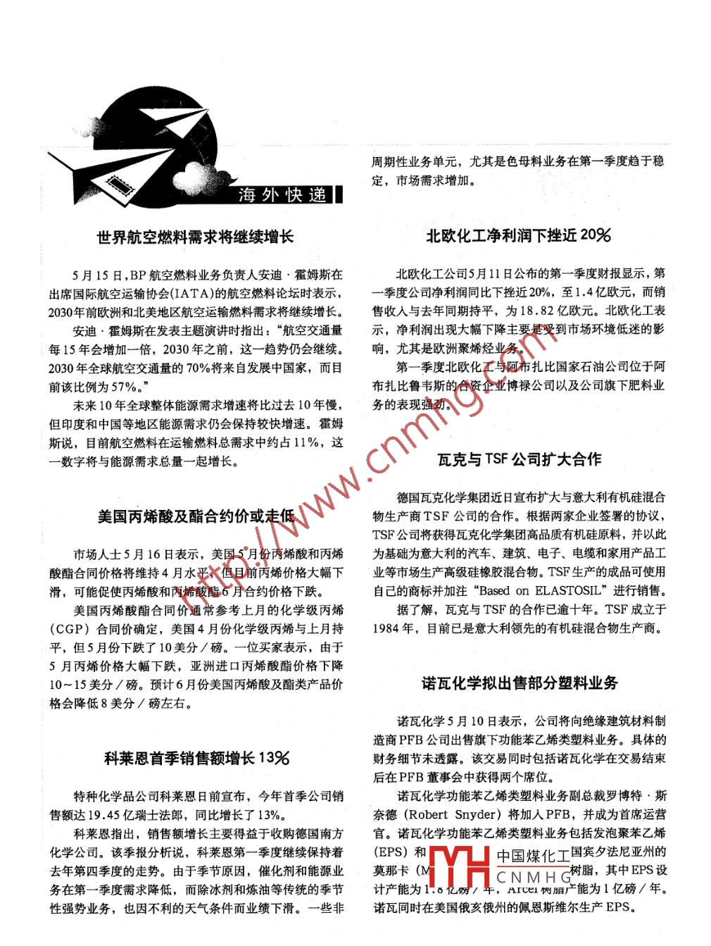 周期性業(yè)務(wù)單元,尤其是色母料業(yè)務(wù)在第一季度趨于穩(wěn)定,市場(chǎng)需求增加。海外快遞世界航空燃料需求將繼續(xù)增長(zhǎng)北歐化工凈利潤(rùn)下挫近20%5月15日,BP航空燃料業(yè)務(wù)負(fù)責(zé)人安迪·霍姆斯在北歐化工公司5月11日公布的第一季度財(cái)報(bào)顯示,第出席國(guó)際航空運(yùn)輸協(xié)會(huì)(IATA)的航空燃料論壇時(shí)表示,一季度公司凈利潤(rùn)同比下挫近20%,至1.4億歐元,而銷2030年前歐洲和北美地區(qū)航空運(yùn)輸燃料需求將繼續(xù)增長(zhǎng)。售收入與去年同期持平,為18.82億歐元。北歐化工表安迪·霍姆斯在發(fā)表主題演講時(shí)指出:“航空交通量示,凈利潤(rùn)出現(xiàn)大幅下降主要是受到市場(chǎng)環(huán)境低迷的影每15年會(huì)增加一倍,2030年之前,這一趨勢(shì)仍會(huì)繼續(xù)。響,尤其是歐洲聚烯烴業(yè)務(wù)。2030年全球航空交通量的70%將來(lái)自發(fā)展中國(guó)家,而目第一季度北歐化工與阿布扎比國(guó)家石油公司位于阿前該比例為57%?!辈荚若旐f斯的合資企業(yè)博祿公司以及公司旗下肥料業(yè)未來(lái)10年全球整體能源需求增速將比過(guò)去10年慢,務(wù)的表現(xiàn)強(qiáng)勁。但印度和中國(guó)等地區(qū)能源需求仍會(huì)保持較快增速。霍姆斯說(shuō),目前航空燃料在運(yùn)輸燃料總需求中約占11%,這一數(shù)字將與能源需求總量一起增長(zhǎng)。瓦克與TSF公司擴(kuò)大合作德國(guó)瓦克化學(xué)集團(tuán)近日宣布擴(kuò)大與意大利有機(jī)硅混合美國(guó)丙烯酸及酯合約價(jià)或走低物生產(chǎn)商TSF公司的合作。根據(jù)兩家企業(yè)簽署的協(xié)議TSF公司將獲得瓦克化學(xué)集團(tuán)高品質(zhì)有機(jī)硅原料,并以此市場(chǎng)人士5月16日表示,美國(guó)5月份丙烯酸和丙烯為基礎(chǔ)為意大利的汽車、建筑、電子、電纜和家用產(chǎn)品工酸酯合同價(jià)格將維持4月水平,但目前丙烯價(jià)格大幅下業(yè)等市場(chǎng)生產(chǎn)高級(jí)硅橡膠混合物。TSF生產(chǎn)的成品可使用滑,可能促使丙烯酸和丙烯酸酯6月合約價(jià)格下跌自己的商標(biāo)并加注“ Based on ELastoSIL”進(jìn)行銷售。美國(guó)丙烯酸酯合同價(jià)通常參考上月的化學(xué)級(jí)丙烯據(jù)了解,瓦克與TSF的合作已逾十年。TSF成立于(CGP)合同價(jià)確定,美國(guó)4月份化學(xué)級(jí)丙烯與上月持1984年,目前已是意大利領(lǐng)先的有機(jī)硅混合物生產(chǎn)商平,但5月份下跌了10美分/磅。一位買家表示,由于5月丙烯價(jià)格大幅下跌,亞洲進(jìn)口丙烯酸酯價(jià)格下降10~15美分/磅。預(yù)計(jì)6月份美國(guó)丙烯酸及酯類產(chǎn)品價(jià)諾瓦化學(xué)擬出售部分塑料業(yè)務(wù)格會(huì)降低8美分/磅左右。諾瓦化學(xué)5月10日表示,公司將向絕緣建筑材料制造商PFB公司出售旗下功能苯乙烯類塑料業(yè)務(wù)。具體的科萊恩首季銷售額增長(zhǎng)13%財(cái)務(wù)細(xì)節(jié)未透露。該交易同時(shí)包括諾瓦化學(xué)在交易結(jié)束后在PFB董事會(huì)中獲得兩個(gè)席位。特種化學(xué)品公司科萊恩日前宣布,今年首季公司銷諾瓦化學(xué)功能苯乙烯類塑料業(yè)務(wù)副總裁羅博特·斯售額達(dá)19.45億瑞士法郎,同比增長(zhǎng)了13%奈德( Robert Snyder)將加人PFB,并成為首席運(yùn)營(yíng)科萊恩指出,銷售額增長(zhǎng)主要得益于收購(gòu)德國(guó)南方官。諾瓦化學(xué)功能苯乙烯類塑料業(yè)務(wù)包括發(fā)泡聚苯乙烯化學(xué)公司。該季報(bào)分析說(shuō),科萊恩第一季度繼續(xù)保持著(EPS)和中國(guó)煤化工國(guó)賓夕法尼亞州的去年第四季度的走勢(shì)。由于季節(jié)原因,催化劑和能源業(yè)莫那卡(CNMHG樹脂,其中EP設(shè)務(wù)在第一季度需求降低,而除冰劑和煉油等傳統(tǒng)的季節(jié)計(jì)產(chǎn)能為1.6億m/年,Arce例膽廣能為1億磅/年。性強(qiáng)勢(shì)業(yè)務(wù),也因不利的天氣條件而業(yè)績(jī)下滑。一些非諾瓦同時(shí)在美國(guó)俄亥俄州的佩恩斯維爾生產(chǎn)EPS202·06中國(guó)石油和化工77