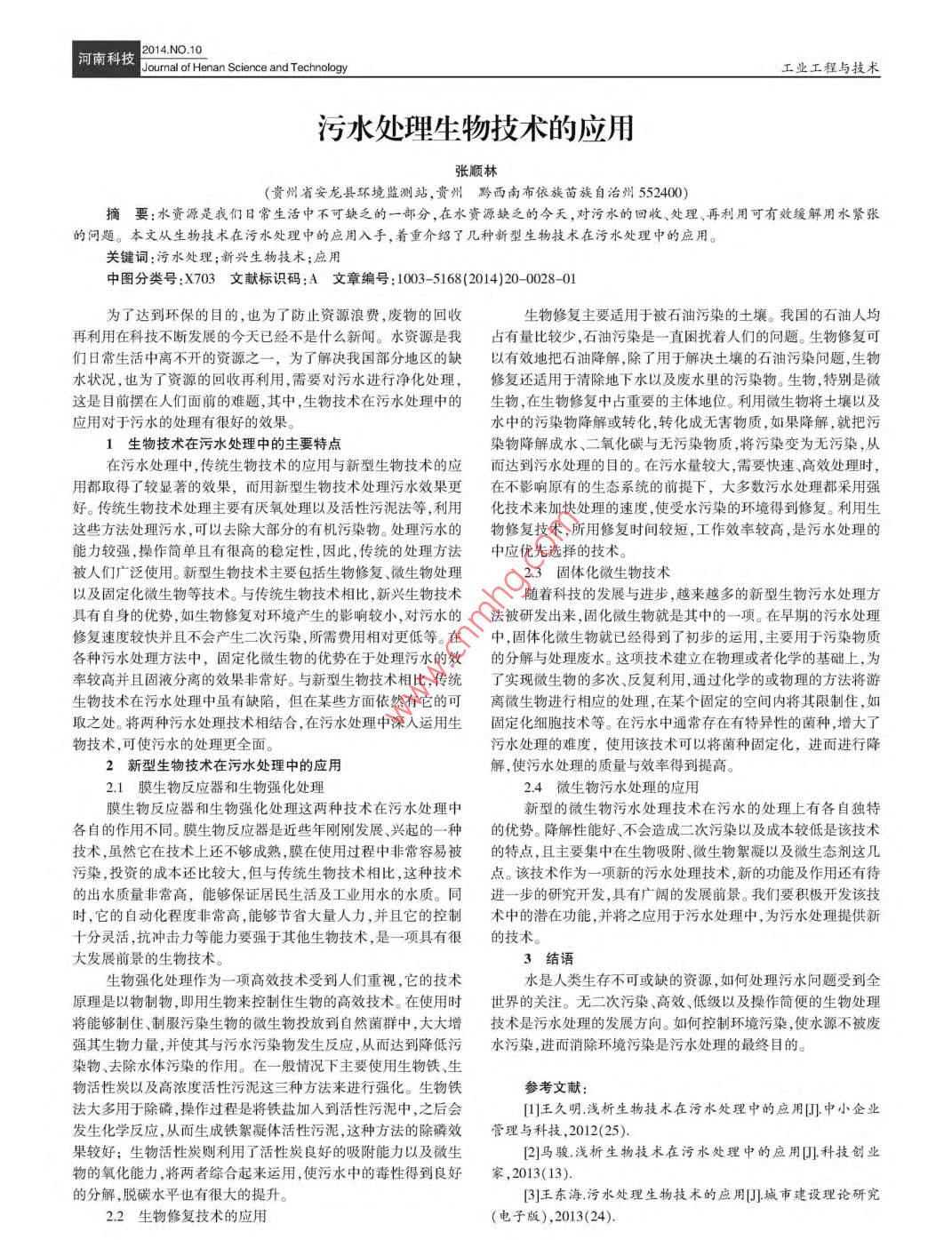 河南科技2014No10Journal of Henan Science and Technol工業(yè)工程與技術(shù)污水處理生物技術(shù)的應(yīng)用張順林(貴州省安龍縣環(huán)境監(jiān)測(cè)站,貴州黔西南布依族苗族自治州552400摘要:水資源是我們?nèi)粘I钪胁豢扇狈Φ囊徊糠?在水資源缺乏的今夭,對(duì)污水的回收、處理、再利用可有效緩解用水緊張的問(wèn)題。本文從生物技術(shù)在污水處理中的應(yīng)用入手,著重介紹了幾種新型生物技術(shù)在污水處理中的應(yīng)用。關(guān)鍵詞:污水處理;新興生物技術(shù);應(yīng)用中圖分類(lèi)號(hào):X703文獻(xiàn)標(biāo)識(shí)碼:A文章編號(hào):1003-5168(2014)20-002801為了達(dá)到環(huán)保的目的,也為了防止資源浪費(fèi),廢物的回收生物修復(fù)主要適用于被石油污染的土壤。我國(guó)的石油人均再利用在科技不斷發(fā)展的今天已經(jīng)不是什么新聞。水資源是我占有量比較少,石油污染是一直困擾著人們的問(wèn)題。生物修復(fù)可們?nèi)粘I钪须x不開(kāi)的資源之一,為了解決我國(guó)部分地區(qū)的缺以有效地把石油降解,除了用于解決土壤的石油污染問(wèn)題,生物水狀況,也為了資源的回收再利用,需要對(duì)污水進(jìn)行凈化處理,修復(fù)還適用于清除地下水以及廢水里的污染物。生物,特別是微這是目前擺在人們面前的難題,其中,生物技術(shù)在污水處理中的生物,在生物修復(fù)中占重要的主體地位。利用微生物將土壤以及應(yīng)用對(duì)于污水的處理有很好的效果水中的污染物降解或轉(zhuǎn)化,轉(zhuǎn)化成無(wú)害物質(zhì),如果降解,就把污1生物技術(shù)在污水處理中的主要特點(diǎn)染物降解成水、二氧化碳與無(wú)污染物質(zhì),將污染變?yōu)闊o(wú)污染,從在污水處理中,傳統(tǒng)生物技術(shù)的應(yīng)用與新型生物技術(shù)的應(yīng)而達(dá)到污水處理的目的。在污水量較大,需要快速、高效處理時(shí)用都取得了較顯著的效果,而用新型生物技術(shù)處理污水效果更在不影響原有的生態(tài)系統(tǒng)的前提下,大多數(shù)污水處理都采用強(qiáng)好。傳統(tǒng)生物技術(shù)處理主要有厭氧處理以及活性污泥法等,利用化技術(shù)來(lái)加快處理的速度,使受水污染的環(huán)境得到修復(fù)。利用生這些方法處理污水,可以去除大部分的有機(jī)污染物。處理污水的物修復(fù)技術(shù),所用修復(fù)時(shí)間較短,工作效率較高,是污水處理的能力較強(qiáng),操作簡(jiǎn)單且有很高的穩(wěn)定性,因此,傳統(tǒng)的處理方法中應(yīng)優(yōu)先選擇的技術(shù)被人們廣泛使用。新型生物技術(shù)主要包括生物修復(fù)、微生物處理23固體化微生物技術(shù)以及固定化微生物等技術(shù)。與傳統(tǒng)生物技術(shù)相比,新興生物技術(shù)隨著科技的發(fā)展與進(jìn)步,越來(lái)越多的新型生物污水處理方具有自身的優(yōu)勢(shì),如生物修復(fù)對(duì)環(huán)境產(chǎn)生的影響較小,對(duì)污水的法被研發(fā)出來(lái),固化微生物就是其中的一項(xiàng)。在早期的污水處理修復(fù)速度較快并且不會(huì)產(chǎn)生二次污染,所需費(fèi)用相對(duì)更低等。在中,固體化微生物就已經(jīng)得到了初步的運(yùn)用,主要用于污染物質(zhì)各種污水處理方法中,固定化微生物的優(yōu)勢(shì)在于處理污水的效的分解與處理廢水。這項(xiàng)技術(shù)建立在物理或者化學(xué)的基礎(chǔ)上,為率較高并且固液分離的效果非常好。與新型生物技術(shù)相比,傳統(tǒng)了實(shí)現(xiàn)微生物的多次、反復(fù)利用,通過(guò)化學(xué)的或物理的方法將游生物技術(shù)在污水處理中雖有缺陷,但在某些方面依然有它的可離微生物進(jìn)行相應(yīng)的處理,在某個(gè)固定的空間內(nèi)將其限制住,如取之處。將兩種污水處理技術(shù)相結(jié)合,在污水處理中深入運(yùn)用生固定化細(xì)胞技術(shù)等。在污水中通常存在有特異性的菌種,增大物技術(shù),可使污水的處理更全面污水處理的難度,使用該技術(shù)可以將菌種固定化,進(jìn)而進(jìn)行降2新型生物技術(shù)在污水處理中的應(yīng)用解,使污水處理的質(zhì)量與效率得到提高。2.1膜生物反應(yīng)器和生物強(qiáng)化處理24微生物污水處理的應(yīng)用膜生物反應(yīng)器和生物強(qiáng)化處理這兩種技術(shù)在污水處理中新型的微生物污水處理技術(shù)在污水的處理上有各自獨(dú)特各自的作用不同。膜生物反應(yīng)器是近些年剛剛發(fā)展、興起的一種的優(yōu)勢(shì)。降解性能好、不會(huì)造成二次污染以及成本較低是該技術(shù)技術(shù),雖然它在技術(shù)上還不夠成熟,膜在使用過(guò)程中非常容易被的特點(diǎn),且主要集中在生物吸附、微生物絮凝以及微生態(tài)劑這幾污染,投資的成本還比較大,但與傳統(tǒng)生物技術(shù)相比,這種技術(shù)點(diǎn)。該技術(shù)作為一項(xiàng)新的污水處理技術(shù),新的功能及作用還有待的出水質(zhì)量非常高,能夠保證居民生活及工業(yè)用水的水質(zhì)。同進(jìn)一步的研究開(kāi)發(fā),具有廣闊的發(fā)展前景。我們要積極開(kāi)發(fā)該技時(shí),它的自動(dòng)化程度非常高,能夠節(jié)省大量人力,并且它的控制術(shù)中的潛在功能,并將之應(yīng)用于污水處理中,為污水處理提供新十分靈活,抗沖擊力