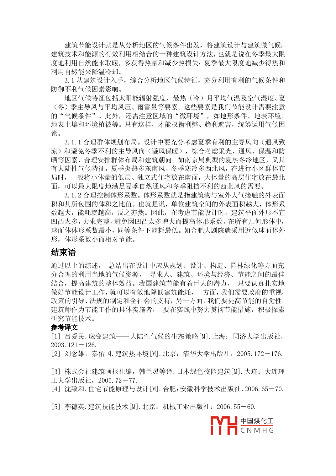 建筑的節(jié)能設計王建天津華廈建筑設計有限公司天津300384摘要:建筑節(jié)能是實施能源、環(huán)境、社會可持續(xù)發(fā)展戰(zhàn)略的重要組成部分,也是國際社會建筑走可持續(xù)發(fā)展之路的基本取向。我國已頒布的建筑節(jié)能標準及某些地區(qū)的施工圖節(jié)能審査要點,針對我國不同地域的氣候環(huán)境和建筑特點,重點介紹了建筑能耗的構成和節(jié)能的基本途徑,提供了相關的節(jié)能設計依據(jù)、技術和方法關鍵詞:建筑設計節(jié)能方法Abstract: the energy conservation of the building is implementing energy environment, andsocial sustainable development strategy important constituent, is also the internationacommunity building the way of sustainable development of the basic orientation. China haspromulgated building energy efficiency standards and some areas of construction energyconservation review points in view of the different regional climate environment andconstruction characteristics, this paper introduces the structure of the building energyconsumption and energy saving of the basic way, providing relevant energy saving design basis,techniques and methodsKeywords: architectural design energy saving method中圖分類號:TE8文獻標識碼:A文章編號引言建筑作為人工自然產(chǎn)品,是人類自身應變自然環(huán)境氣候的一種延伸手段。建筑發(fā)揮著氣候“過濾器”的角色,通過利用和防御自然界各種氣候因素,為人類創(chuàng)造出良好的室內(nèi)氣候條件。我國古代的傳統(tǒng)民居,如北京的四合院、西南的吊腳樓、陜北的窯洞、閩南的土樓等,雖然建筑形式和材料各不相同,但都是長期氣候選擇和建筑不斷應變的結果。隨著現(xiàn)代技術水平的提高,人類有時過分地依賴人工設備技術力量,以期實現(xiàn)更高的室內(nèi)熱舒適度要求,結果導致高能耗和自然生態(tài)的破壞。我國是能源短缺的國家,但建筑能耗卻是同等氣候條件下發(fā)達國家的2?3倍。高能耗不利于建筑可持續(xù)性發(fā)展,需要我們重新硏究節(jié)能設計策略,充分挖掘建筑節(jié)能的潛能、節(jié)能設計包含的幾個方面節(jié)能型住宅是指在保證住宅功能和舒適度的前提下,按既定目標減少能源消耗,并且盡可能對資源循環(huán)利用,實現(xiàn)資源節(jié)約的住宅,節(jié)能住宅包含以下幾個方面建筑與環(huán)境是一個相互依賴共存的關系,一個合理的選址和適宜的外部環(huán)境對建筑的節(jié)能具有事半功倍的效果,應根據(jù)地方氣候特點,地制官,建群的規(guī)劃布置和建筑物的平面布置有利于自然通風,增加中國煤化央建CNMHG筑的通風、防熱等問題。建筑物單體設計應控制體形系數(shù),研究資料表明,體形系數(shù)每增加0.01,耗熱量指標約增加2.5%,一般控制在0.30以下,控制體形系數(shù)的方法有:減少建筑面寬,加大建筑進深;增加建筑物的層數(shù);加大建筑物的長度或增加組合;建筑體型不易變化過多1.2綠化的利用。在屋頂種植植物,利用植物的光和作用,可以大大降低屋頂?shù)氖彝饩C合溫度,資料顯示,種植屋面的內(nèi)表面溫度比其他普通屋面低2.8℃7.7℃,但在屋面種植植物也應考慮技術問題,包括荷載、排水、防水等,現(xiàn)在都已有成熟的技術和經(jīng)驗,屋頂綠化分為覆土栽培和無土栽培兩種,覆土栽培覆土層0.5m厚為宜,相應增加3KN/m2-15KN/m2:無土栽培技術,日本某公司已開發(fā)岀表面生長植物的混凝土,特別適用于建筑墻壁和屋頂綠化。1.3太陽能的利用。太陽能既環(huán)保又方便安全,太陽能的利用有兩種方式:被動式太陽能建筑和主動式太陽能建筑,被動式太陽能建筑指在向陽面采用陽光的儲備熱質(zhì)來吸收儲備熱量來進行的一種方式,此系統(tǒng)中需要研究光電系統(tǒng),造價過高,不適于大批使用1.4合適的建筑材料能夠提高建筑維護結構的保溫隔熱性能。我國在“九五”計劃和2010年發(fā)展規(guī)劃中對建筑節(jié)能提出了新要求,要求實施建筑節(jié)能65%的目標,因此良好的建筑材料是十分必要的。維護結構的材料布置分外側(cè)和內(nèi)側(cè),在寒冷地區(qū)的同一氣候條件下,由于材料層次布置不同所取得的保溫效果也不盡相同,為防止墻體內(nèi)產(chǎn)生冷凝水,保溫層設在外側(cè)更好些,外墻外保溫的優(yōu)勢包括:提高主體結構的使用壽命,減少長期的維修費用;降低建筑造價,增加房屋使用面積;基本消除“熱橋”的影響,外保溫即可防止“熱橋”部位產(chǎn)生結露,又可消除“熱橋”造成的熱損失,改善墻體熱工性能;便于對建筑進行裝修改造。建筑外維護結構主要包括屋頂2、節(jié)能設計當中存在的問題2.1節(jié)能設計基準概念模糊作為節(jié)能設計標準的節(jié)能50%目標,不是對于具體的建筑的一個精確節(jié)能效果參數(shù),而是對當前建筑平均水平的一個總體節(jié)能效果。所以在具體的建筑上提節(jié)能50%或者節(jié)能65%的提法是不科學的,而且南方也不應在個別建筑上片面地追求節(jié)能的高指標。由于當前的節(jié)能設計標準是按照節(jié)能50%的目標設定的所以達到標準即是達到節(jié)能50%的社會平均水平,所以如果所有建筑都這么做,社會上的建筑總體上也就達到了50%的節(jié)能目標。2.2規(guī)劃和建筑方案的節(jié)能設計未受到足夠的重視近年來,國家推動建筑節(jié)能工作的力度較大,規(guī)劃設計人員對建筑節(jié)能知識的接受