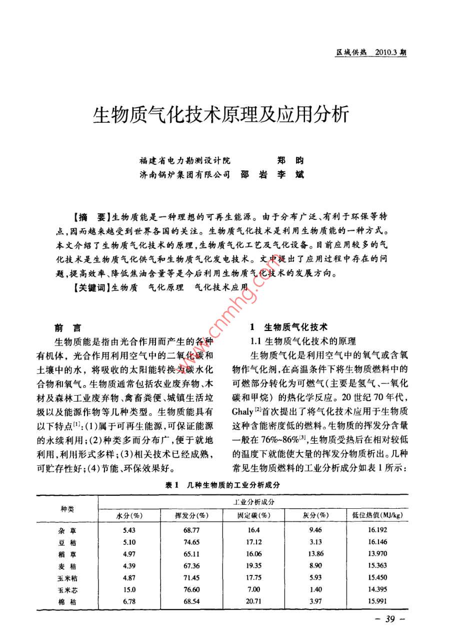 區(qū)域供熱2010.3期生物質(zhì)氣化技術(shù)原理及應(yīng)用分析福建省電力勘測設(shè)計院鄭昀濟南鍋爐集團有限公司邵巖李斌【摘要】生物質(zhì)能是一種理想的可再生能源。由于分布廣泛、有利于環(huán)保等特點,因而越來越受到世界各國的關(guān)注。生物質(zhì)氣化技術(shù)是利用生物質(zhì)能的一種方式。本文介紹了生物質(zhì)氣化技術(shù)的原理,生物質(zhì)氣化工藝及氣化設(shè)備目前應(yīng)用較多的氣化技術(shù)是生物質(zhì)氣化供氣和生物質(zhì)氣化發(fā)電技術(shù)文中提出了應(yīng)用過程中存在的問題,提高效率、降低焦油含量等是今后利用生物質(zhì)氣化技術(shù)的發(fā)展方向。【關(guān)鍵詞】生物質(zhì)氣化原理氣化技術(shù)應(yīng)用前言1生物質(zhì)氣化技術(shù)生物質(zhì)能是指由光合作用而產(chǎn)生的各種1.1生物質(zhì)氣化技術(shù)的原理有機體,光合作用利用空氣中的二氧化碳和生物質(zhì)氣化是利用空氣中的氧氣或含氧土壤中的水,將吸收的太陽能轉(zhuǎn)換為碳水化物作氣化劑在高溫條件下將生物質(zhì)燃料中的合物和氧氣。生物質(zhì)通常包括農(nóng)業(yè)廢棄物、可燃部分轉(zhuǎn)化為可燃?xì)?主要是氫氣、一氧化材及森林工業(yè)廢棄物、禽畜糞便、城鎮(zhèn)生活垃碳和甲烷)的熱化學(xué)反應(yīng)。20世紀(jì)70年代,圾以及能源作物等幾種類型。生物質(zhì)能具有 Ghaly首次提出了將氣化技術(shù)應(yīng)用于生物質(zhì)以下特點:(1)屬于可再生能源,可保證能源這種含能密度低的燃料。生物質(zhì)的揮發(fā)分含量的永續(xù)利用;(2)種類多而分布廣,便于就地一般在76%86%生物質(zhì)受熱后在相對較低利用,利用形式多樣;(3)相關(guān)技術(shù)已經(jīng)成熟的溫度下就能使大量的揮發(fā)分物質(zhì)析出。幾種可貯存性好;(4)節(jié)能、環(huán)保效果好。常見生物質(zhì)燃料的工業(yè)分析成分如表1所示:表1幾種生物質(zhì)的工業(yè)分析成分工業(yè)分析成分種類水分(%)揮發(fā)分(%)固定碳(%)灰分(%)低位熱值(MJ/kg)雜草54368.7716.49.4616.192豆秸5.106574.617.123.1316.146稻草4.9765.1116.0613.8613.970麥4.3967.3619.358.9015.363玉米秸4.8771.4517.755.9315.450玉米芯15.076.607.001.4014.395棉秸6.7868.5420.713.9715.99139區(qū)域供熱2010.3期為了提供反應(yīng)的熱力學(xué)條件,氣化過程的空氣發(fā)生反應(yīng),同時釋放大量的熱以支持需要供給空氣或氧氣,使原料發(fā)生部分燃燒。生物干燥、熱解和后續(xù)的還原反應(yīng),溫度可達(dá)盡可能將能量保留在反應(yīng)后得到的可燃?xì)獾?000~1200℃中,氣化后的產(chǎn)物含有H2、CO及低分子的(4)還原過程還原過程沒有氧氣存在,CHn等可燃性氣體。整個過程可分為:干燥、氧化層中的燃燒產(chǎn)物及水蒸氣與還原層中木熱解、氧化和還原。炭發(fā)生反應(yīng),生成氫氣和一氧化碳等。這些氣(1)干燥過程生物質(zhì)進入氣化爐后,在體和揮發(fā)分組成了可燃?xì)怏w,完成了固體生熱量的作用下,析出表面水分。在200~300℃物質(zhì)向氣體燃料的轉(zhuǎn)化過程。時為主要干燥階段。1.2氣化工藝(2)熱解反應(yīng)當(dāng)溫度升高到300℃以上生物質(zhì)氣化有多種形式,如果按氣化介質(zhì)時開始進行熱解反應(yīng)。在300~400℃時,生物可以分為使用氣化介質(zhì)和不使用氣化兩種,前質(zhì)就可以釋放出70%左右的揮發(fā)組分,而煤者又可以細(xì)分為空氣氣化、氧氣氣化、水蒸氣要到800℃才能釋放出大約30%的揮發(fā)分熱氣化、氫氣氣化等,后者有熱分解氣化。不同氣解反應(yīng)析出揮發(fā)分主要包括水蒸氣、氫氣、化技術(shù)所得到的熱值不同,因而應(yīng)用領(lǐng)域也有氧化碳、甲烷、焦油及其他碳?xì)浠衔?。所不?。如表2所示為不同氣化工藝技術(shù)產(chǎn)(3)氧化反應(yīng)熱解的剩余木炭與引入生可燃性氣體的熱值及其主要的用途。表2不同氣化工藝技術(shù)的用途氣化技術(shù)可燃?xì)怏w熱值(標(biāo)準(zhǔn)狀態(tài))(kJ/m3)用途空氣氣化5440~7322鍋爐、干燥、動力氧氣氣化10878~18200區(qū)域管網(wǎng)、合成燃料水蒸氣氣化10920~18900區(qū)域管網(wǎng)、合成燃料氫氣氣化22260-26040工藝熱源、管網(wǎng)熱分解氣化10878-15000燃料與發(fā)電、制造汽油與酒精的原料1.3氣化設(shè)備上吸式固定床氣化爐氣化爐是生物質(zhì)氣化反應(yīng)的主要設(shè)備。按氣化爐的運行方式不同,可以分為固定床、固定床氣化爐下吸式固定床氣化爐流化床和旋轉(zhuǎn)床三種類型4。國內(nèi)目前生物質(zhì)下吸式固定床氣化爐氣化過程所采用的氣化爐主要為固定床氣化生物質(zhì)氣化爐鼓泡床氣化爐爐和流化床氣化爐。固定床氣化爐和流化床氣化爐又有多種不同的形式,其各種類型如流化床氣化爐循環(huán)流化床氣化爐圖1所示。雙流化床氣化爐1.3.1固定床氣化爐35攜帶床氣化爐固定床氣化爐是一種傳統(tǒng)的氣化反應(yīng)圖1生物質(zhì)氣化爐的分類爐,其運行溫度大約為1000℃。固定床氣化爐化。其主要優(yōu)點是產(chǎn)出氣在經(jīng)過裂解層和干可以分為上吸式、下吸式和橫吸式氣化爐。燥層時,將其攜帶的熱量傳遞給物料,用于物上吸式氣化爐中,生物質(zhì)原料由爐頂加料的裂解和干燥,同時降低自身的溫度,使?fàn)t入,氣化劑由爐底部進氣口加入,氣體流動的子的熱效