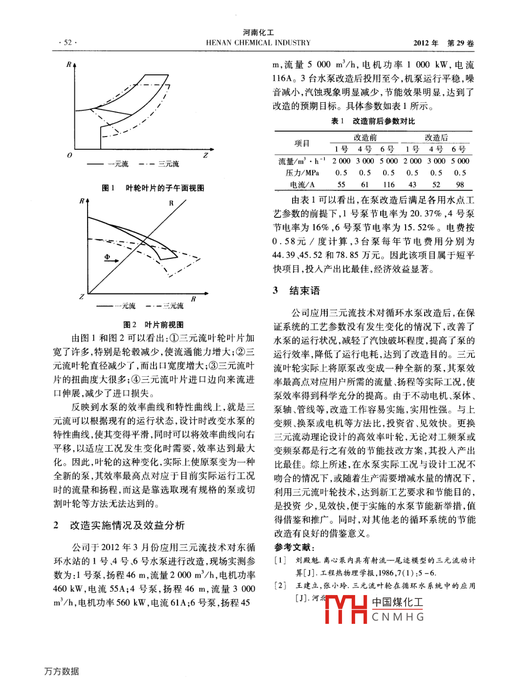 第12期(上)苗興東:三元流技術(shù)在循環(huán)水泵上的應(yīng)用三元流技術(shù)在循環(huán)水泵上的應(yīng)用苗興東(中國石油遼河石化分公司,遼寧盤錦124022)摘要:遼河石化公司循環(huán)水泵的葉輪是在二元流理論基礎(chǔ)上設(shè)計(jì)制造的,該理論并不完善,導(dǎo)致泵的實(shí)際運(yùn)行工況偏離最優(yōu)工況,同時(shí)存在不同程度的汽蝕現(xiàn)象,致使水泵運(yùn)行效率較低。為此,公司應(yīng)用三元流技術(shù)對(duì)水泵的葉輪進(jìn)行改造,通過三元“射流一尾跡”流動(dòng)定量分析,對(duì)葉片的進(jìn)出安放角、葉片數(shù)、扭曲葉片各截面形狀等方面進(jìn)行優(yōu)化設(shè)計(jì),改善葉輪內(nèi)流體的流動(dòng)狀態(tài),減少進(jìn)口沖擊和岀口尾跡脫流程度。通過對(duì)比改造前后的實(shí)際運(yùn)行情況,機(jī)泵運(yùn)行平穩(wěn),噪音減小,汽蝕現(xiàn)象明顯減少,節(jié)電率達(dá)到15%~20%,提高了水泵效率,實(shí)現(xiàn)了節(jié)能降耗。關(guān)鍵詞:水泵;葉輪;三元流;節(jié)能;降耗中圖分類號(hào):TQ050.3文獻(xiàn)標(biāo)識(shí)碼:B文章編號(hào):1003-3467(2012)23-0051-02司決定采用三元流技術(shù)對(duì)循環(huán)水泵進(jìn)行技術(shù)改造。0前言在能源日趨緊張的今天,在國家“十二五”規(guī)劃1三元流技術(shù)改造原理分析的要求下,節(jié)能降耗成為當(dāng)今的主流,而廣泛應(yīng)用于1.1三元流技術(shù)原理工農(nóng)業(yè)生產(chǎn)等社會(huì)生活各個(gè)領(lǐng)域的離心泵,其每年吳仲華院士于20世紀(jì)50年代就提出了三元流電耗占全國總電耗的21%以上,因此離心泵的節(jié)能理論。該理論將葉輪內(nèi)部的三元立體空間無限分問題就引起了人們的關(guān)注,各種節(jié)能措施也越來越割,通過對(duì)葉輪流道內(nèi)的各工作點(diǎn)的分析,建立起完受到人們的重視。如何提高離心泵的運(yùn)行效率,實(shí)整、真實(shí)的葉輪內(nèi)流動(dòng)的數(shù)學(xué)模型。劉殿魁于80現(xiàn)系統(tǒng)的最優(yōu)化運(yùn)行成為用戶的主要研究對(duì)象。隨年代提出了“射流一尾跡”模型,通過三元“射流著三元流動(dòng)理論逐步成熟,以及該技術(shù)在實(shí)際應(yīng)用尾跡”流動(dòng)計(jì)算,對(duì)因流體黏性和泵體內(nèi)部壓力梯中的廣泛推廣,泵的效率得到了極大提高,與傳統(tǒng)的度引起的流體流動(dòng)狀態(tài)進(jìn)行定量分析,利用三元流元流、二元流技術(shù)相比,泵節(jié)電率可達(dá)到15%動(dòng)理論來求解泵葉輪內(nèi)的流速分布,進(jìn)而得出水泵20%葉輪優(yōu)化設(shè)計(jì)的方法,根據(jù)葉輪內(nèi)部流動(dòng)特性的要目前,遼河石化公司東循環(huán)水場有6臺(tái)離心式求,對(duì)葉片的進(jìn)出安放角、葉片數(shù)、扭曲葉片各截面水泵,設(shè)備位號(hào)為1~6號(hào),并聯(lián)于全封閉式循環(huán)水形狀等要素進(jìn)行優(yōu)化,改善葉輪內(nèi)流體的流動(dòng)狀態(tài),系統(tǒng),母管制運(yùn)行,循環(huán)水泵均是采用傳統(tǒng)的二元流從而避免葉片工作面的流動(dòng)分離,減少流動(dòng)損失,提理論設(shè)計(jì)制造的泵型,已運(yùn)行10年以上,通過現(xiàn)場高葉輪的工作效率,最終達(dá)到提高水泵效率、節(jié)能降測算,水泵運(yùn)行效率較低。由于水泵的運(yùn)行效率與耗的目的。該方法特點(diǎn)主要有:①保留電機(jī)、泵殼泵體內(nèi)部流體流動(dòng)狀況是密不可分的,而傳統(tǒng)的二體、進(jìn)岀水管路等現(xiàn)有水泵系統(tǒng);②可根據(jù)系統(tǒng)實(shí)際元流理論不能準(zhǔn)確地反映泵體內(nèi)液體的真實(shí)流動(dòng)狀情況進(jìn)行設(shè)計(jì),達(dá)到“量體裁衣”的目的;③工期短、態(tài),因此受泵的設(shè)計(jì)制造水平和現(xiàn)場運(yùn)行工況變化效率高、見效快的影響,水泵實(shí)際運(yùn)行工況點(diǎn)嚴(yán)重偏離其高效區(qū),造1.2三元流葉輪與傳統(tǒng)葉輪的比較成水泵效率低,能耗高。而通常采用的車削葉輪、更三元流葉輪與傳統(tǒng)葉輪除安裝尺寸相同外,其換新泵或者安裝變頻器等辦法都有較大的局限性,葉片形狀發(fā)TYHE中國煤化工圖2所示(2)。不能從根本上解決低效率、能耗高的問題。為此,公CNIMH G收稿日期:2012-11-04作者簡介:苗興東(1978-)男,碩士學(xué)位,工程師,從事工藝管理工作,E-mlil;miaoxd]978@yahoo.com,cn河南化工52HENAN CHEMICAL INDUSTRY2012年第29卷m,流量5000m3/h,電機(jī)功率1000kW,電流116A。3臺(tái)水泵改造后投用至今,機(jī)泵運(yùn)行平穩(wěn),噪音減小,汽蝕現(xiàn)象明顯減少,節(jié)能效果明顯,達(dá)到了改造的預(yù)期目標(biāo)。具體參數(shù)如表1所示表1改造前后參數(shù)對(duì)比改造前改造后項(xiàng)目1號(hào)4號(hào)6號(hào)1號(hào)4號(hào)6號(hào)元流一一三元流流量/m3·h1200030005000200030005000壓力/MPa0.50.50.50.50.50.5圖1葉輪葉片的子午面視圖電流/A55611164352由表1可以看出,在泵改造后滿足各用水點(diǎn)工藝參數(shù)的前提下,1號(hào)泵節(jié)電率為20.37%,4號(hào)泵節(jié)電率為16%,6號(hào)泵節(jié)電率為15.52%。電費(fèi)按0.58元/度計(jì)算,3臺(tái)泵每年節(jié)電費(fèi)用分別為44.3945.52和78.85萬元。因此該項(xiàng)目屬于短平快項(xiàng)目,投入產(chǎn)出比最佳,經(jīng)濟(jì)效益顯著。3結(jié)