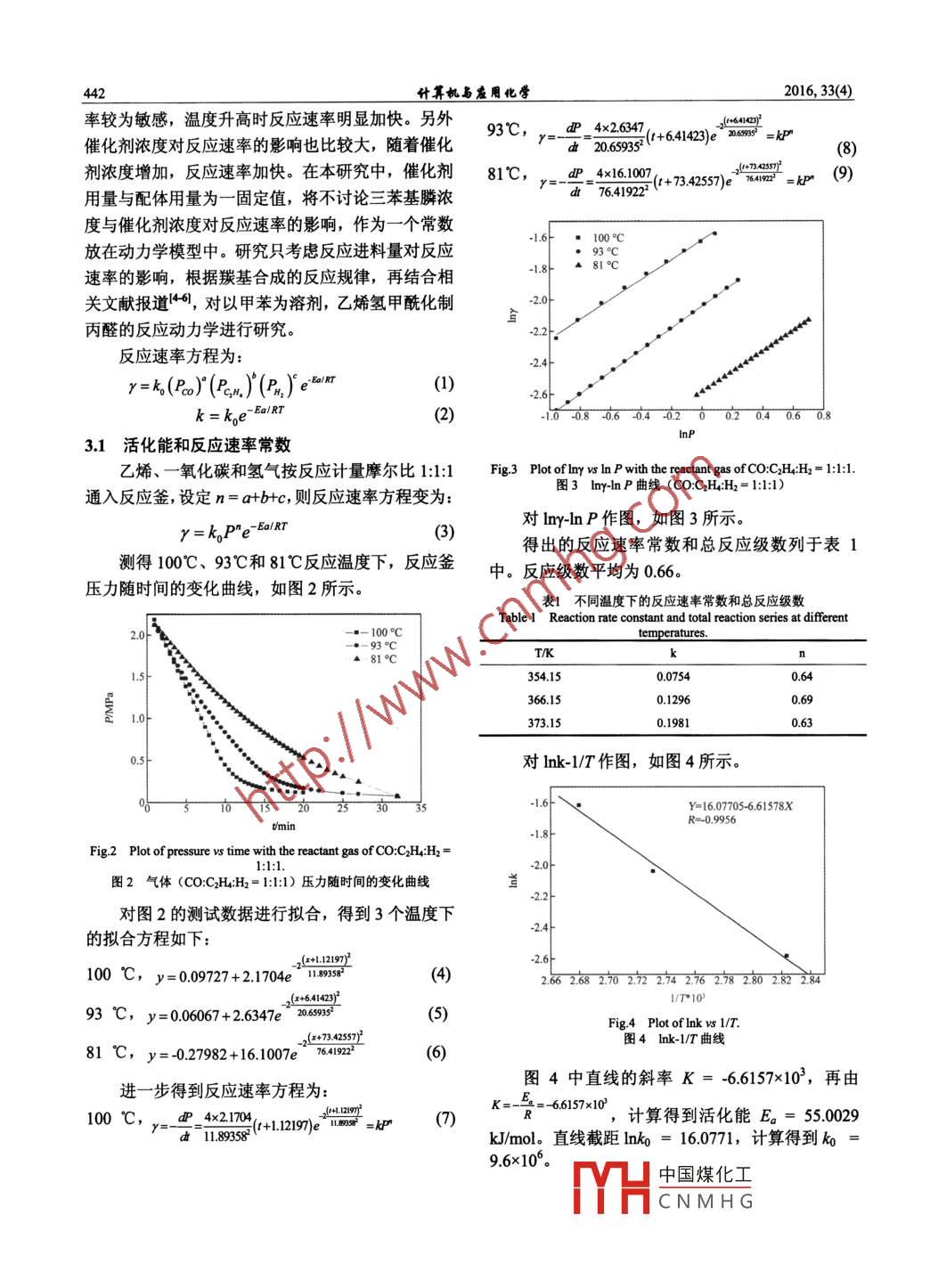 第33卷第4期計(jì)算機(jī)與發(fā)用化骨2016年4月28日Computers and applied chapril 22如4乙烯氫甲?;瘎恿W(xué)研究楊普,王玲,刁琰琰,李春山,王蕾(中國科學(xué)院過程工程研究所,離子液體清潔過程北京市重點(diǎn)實(shí)驗(yàn)室多相復(fù)雜系統(tǒng)國家重點(diǎn)實(shí)驗(yàn)室,北京,100190)摘要:固定甲苯、催化劑及配體用量,對乙烯在甲苯溶劑中的氫甲?;磻?yīng)動力學(xué)進(jìn)行了研究。以反應(yīng)計(jì)量比為11:1的乙烯一氧化碳和氫氣為反應(yīng)混合氣,測定了100℃、93℃和81℃下反應(yīng)壓力隨時(shí)間的變化曲線,通過動力學(xué)方程求解獲得了3種氣體總的反應(yīng)級數(shù)、反應(yīng)速率常數(shù)和活化能,得到反應(yīng)的活化能為550kJ/mo。進(jìn)一步通過一氧化碳和氫氣過量,得到了乙烯的反應(yīng)級數(shù)。然后通過氫氣過量,得到了乙烯和一氧化碳的總反應(yīng)級數(shù),隨后即計(jì)算得到了一氧化碳和氫氣各自的反應(yīng)級數(shù),表明一氧化碳分壓高會抑制反應(yīng)速率,而增加乙烯和氫氣分壓對反應(yīng)速率有促進(jìn)作用。關(guān)鍵詞:乙烯;氫甲?;?動力學(xué)中圖分類號:TQ0159;TP3919;06-39文獻(xiàn)標(biāo)識碼:A文章編號:10014160(2016)044414Dol:10.16866/j.com.appchem2016040121引言2實(shí)驗(yàn)部分氫甲?;磻?yīng)是烯烴與一氧化碳和氫氣反應(yīng)銠膦催化劑為實(shí)驗(yàn)室自制,甲苯溶劑和三苯基生成醛,進(jìn)一步可生產(chǎn)醇、酸等重要的化學(xué)品,用膦為國藥化學(xué)試劑有限公司生產(chǎn)。乙烯、一氧化碳于藥品、香料、聚合單體等的生產(chǎn)。其中低碳烯烴從北京兆格氣體科技有限公司購買,氫氣從北京市均相氫甲?;呀?jīng)被廣泛工業(yè)化應(yīng)用3北溫氣體制造廠購買。乙烯氫甲?;磻?yīng)得到丙醛,一般使用銠或鈷反應(yīng)裝置示意圖如圖1所示。將適量催化劑、配位化合物作為催化劑,其中銠催化劑使用壓力配體及10mL甲苯置入高壓反應(yīng)釜,密閉抽真空至低,得到更為廣泛的應(yīng)用。催化反應(yīng)時(shí),原料氣通0085MPa以上,關(guān)閉閥門5,停止抽真空。通入入含ppm級催化劑和配體的溶液中進(jìn)行反應(yīng),一般定比例原料氣至一定的壓力后,關(guān)閉進(jìn)氣閥門停溶劑使用甲苯、丙醛及丙醛縮聚物等。反應(yīng)的TOF止進(jìn)氣。開始加熱,攪拌。記錄壓力隨時(shí)間的變化??稍?0000h以上,反應(yīng)壓力在2MPa左右,反應(yīng)壓力表選擇性接近100%,少量副產(chǎn)物為乙烷、丙酸、丙混醛縮聚物等。在催化劑、配體和溶劑量固定的條件質(zhì)量流量計(jì)壓力傳感器下,可以通過調(diào)節(jié)乙烯、一氧化碳和氫氣的比例對反應(yīng)速率進(jìn)行調(diào)控,從而配合反應(yīng)工藝設(shè)計(jì)和調(diào)控。因此反應(yīng)動力學(xué)研究對于反應(yīng)工藝的模型建立oFH和設(shè)計(jì)等具有重要意義g本研究設(shè)計(jì)建立了間歇式乙烯氫甲?;磻?yīng)Fig 1 Schematic overview of the ethylene hydroformylation kinetics動力學(xué)測定裝置,在該實(shí)驗(yàn)裝置上,以甲苯為溶劑,test setup對原料氣體分壓對乙烯氫甲酰化反應(yīng)速率的影響圖1氫甲?;磻?yīng)裝置示意圖進(jìn)行了研究,通過對實(shí)驗(yàn)數(shù)據(jù)進(jìn)行分析、擬合和計(jì)3動力學(xué)方程算,獲得了乙烯氫甲?;磻?yīng)速度的宏觀動力學(xué)模通過前期的實(shí)驗(yàn)數(shù)據(jù)可知,反應(yīng)溫度對反應(yīng)速型。收稿日期:201601-18;修回日期:201603-24基金項(xiàng)目:國家自然科學(xué)基金資助項(xiàng)目(21476239);中國科學(xué)院戰(zhàn)略性先導(dǎo)科技專項(xiàng)(XDA中國煤化工作者簡介:楊普(1982-),男,寧夏人,碩士研究生,Ema:py@ Ipeac cn聯(lián)系人:刁琰琰(1982-),女,山東人,博土,副研究員,碩土生導(dǎo)師,Emai: yydiaod@ipemyhCNMHG442針?biāo)惴珡U用化2016,334)率較為敏感,溫度升高時(shí)反應(yīng)速率明顯加快。另外催化劑濃度對反應(yīng)速率的影響也比較大,隨著催化d2065931(+64142) De 2069252-p93℃,y==4×267(8)劑濃度增加,反應(yīng)速率加快。在本研究中,催化劑81℃dP4x16.10072(t+734255)e=EP(9)用量與配體用量為一固定值,將不討論三苯基膦濃d7641922度與催化劑濃度對反應(yīng)速率的影響,作為一個常數(shù)100°C放在動力學(xué)模型中。研究只考慮反應(yīng)進(jìn)料量對反應(yīng)速率的影響,根據(jù)羰基合成的反應(yīng)規(guī)律,再結(jié)合相8l°關(guān)文獻(xiàn)報(bào)道,對以甲苯為溶劑,乙烯氫甲?;?2.0丙醛的反應(yīng)動力學(xué)進(jìn)行研究。反應(yīng)速率方程為y=ko(Po)(PH, (PR,)k= koe31活化能和反應(yīng)速率常數(shù)乙烯、一氧化碳和氫氣按反應(yīng)計(jì)量摩爾比1:1:1Fg3 Plot of lmy vs In P with the reactant gas of CO: C2H4: H2=111圖3 Imy-ln P曲線(COC2HH2=1:1:1)通入反應(yīng)釜,設(shè)定n=a+b+c,則反應(yīng)速率方程變?yōu)?對 Imy-In P作圖,如圖3所示。r=koPe得出的反應(yīng)速率常數(shù)和總反應(yīng)級數(shù)列于表1測得100℃、93℃和81℃反應(yīng)溫度下,反應(yīng)釜中。反應(yīng)級數(shù)平均為06壓力隨時(shí)間的變化曲線,如圖2所示。表1不同溫度下的反應(yīng)速率常數(shù)和總反應(yīng)級數(shù)Table 1 Reaction rate constant and total reaction series at different2.0-100°354.1500754064366.150.1296069373.150.1981063對hnk-1T作圖,如圖4所示。Y=1607705-661578Xt/mint