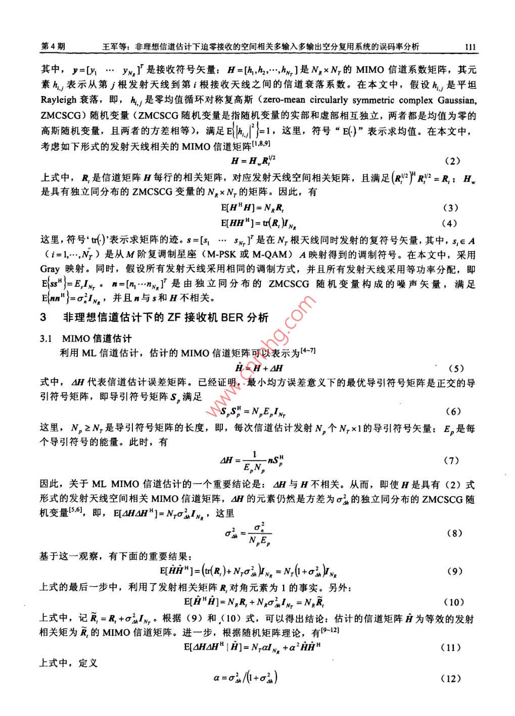 非理想信道估計(jì)下迫零接收的空間相關(guān)多輸入多輸出空分復(fù)用系統(tǒng)的誤碼率分析