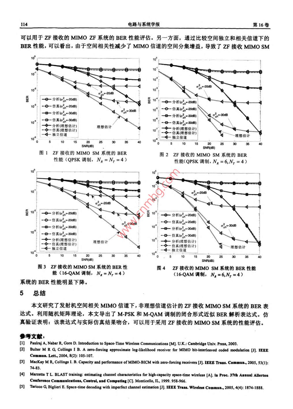第16卷第4期電路與系統(tǒng)學(xué)報(bào)Vol 16 No 42011年8月JOURNAL OF CIRCUITS AND SYSTEMSAugust, 2011文章編號(hào):1007-0249(2011)040110-06非理想信道估計(jì)下迫零接收的空間相關(guān)多輸入多輸出空分復(fù)用系統(tǒng)的誤碼率分析王軍*,陳肖虎,李少謙電子科技大學(xué)通信抗干擾技術(shù)國家級(jí)重點(diǎn)實(shí)驗(yàn)室,四川成都611731)摘要,分析了非理想信道估計(jì)和發(fā)射空間相關(guān)信道下,采用迫零接收的多輸入多輸出空分復(fù)用無線通信系統(tǒng)的誤碼率性能。基于隨機(jī)矩陣?yán)碚?導(dǎo)出了閉合形式的MPSK和MQAM誤碼率近似解析表達(dá)式,并通過仿真驗(yàn)證了表達(dá)式的有效性。所獲得的表達(dá)式形式簡單、便于數(shù)值計(jì)算,可以用于系統(tǒng)性能評(píng)估。關(guān)鍵詞:多輸入多輸出;空分復(fù)用;信道估計(jì)誤差;誤碼率中圖分類號(hào):TN92文獻(xiàn)標(biāo)識(shí)碼:A引言無線多輸入多輸出( multiple- input multiple- output,MIMo)空分復(fù)用( spatial multiplexing,SM)系統(tǒng)中,迫零(zero- forcing,ZF)接收機(jī)由于具有結(jié)構(gòu)簡單、復(fù)雜度低,并且可以解藕空間發(fā)射數(shù)據(jù)流之間干擾的特性,得到了廣泛應(yīng)用山-3在實(shí)際的無線MIMO通信系統(tǒng)中,ZF接收機(jī)需要利用信道估計(jì)獲取MIMO信道衰落系數(shù)矩陣進(jìn)行信號(hào)檢測。目前,廣泛應(yīng)用的MIMO信道估計(jì)方法是基于導(dǎo)引符號(hào)(或訓(xùn)練序列)進(jìn)行的信道估計(jì),如:最大似然( maximum likelihood,ML)估計(jì)或最小均方誤差( mInimum mean square error,MMSE)估計(jì)46。這些信道估計(jì)方法均不可避免地會(huì)引入估計(jì)誤差,從而導(dǎo)致ZF接收機(jī)性能下降。為此,有必要分析實(shí)際非理想信道估計(jì)下 MIMO SM系統(tǒng)的誤碼率(bit- error-rate,BER)性能。針對(duì)空間獨(dú)立的 MIMO SM系統(tǒng),文獻(xiàn)[門推導(dǎo)了非理想信道估計(jì)下的MPSK和MQAM的BER表達(dá)式。但實(shí)際的MIMO通信系統(tǒng)通常會(huì)面臨信道空間相關(guān)性的影響8,因此需要進(jìn)一步分析在空間相關(guān)MIMo信道下、非理想信道估計(jì)的ZF接收機(jī)的BER性能。對(duì)于理想信道估計(jì)下的相關(guān)MIMOSM系統(tǒng),文獻(xiàn)[8]分析了ZF接收機(jī)的BER性能和容量,但文獻(xiàn)[8]沒有考慮信道估計(jì)誤差的影響。本文基于文獻(xiàn)[7,8]的結(jié)果,進(jìn)一步推導(dǎo)了相關(guān)MIMO信道、非理想信道估計(jì)下,采用ZF接收機(jī)的 MIMO SM系統(tǒng)的BER性能。推導(dǎo)得出了簡潔、易于計(jì)算的MPSK和MQAM的閉合形式的近似BER解析表達(dá)式,并通過計(jì)算機(jī)仿真進(jìn)行了驗(yàn)證。本文剩余部分安排如下:第2部分給出系統(tǒng)模型:第3部分分析非理想信道估計(jì)、空間相關(guān)的MIMO SM系統(tǒng)的ZF接收機(jī)BER性能;第4部分通過計(jì)算機(jī)仿真對(duì)推導(dǎo)得到的BER表達(dá)式進(jìn)行驗(yàn)證;第5部分是全文的總結(jié)。2系統(tǒng)模型個(gè)具有N根發(fā)射天線和N(M2≥N)根接收天線的 MIMO SM系統(tǒng)可以用下式描述Hs收稿日期,2009-07-27修訂日期:2009-09-24薔金項(xiàng)目,自然科學(xué)基金資助項(xiàng)目(61071102);中央高?;究蒲袠I(yè)務(wù)費(fèi)專項(xiàng)資金資助(ZYGX2009X002):國家級(jí)重點(diǎn)實(shí)驗(yàn)室基金(9140C0202061004),“863”項(xiàng)目(2009AA012002、2009A011801);國家基礎(chǔ)科研項(xiàng)目(A1420080150);“新代寬帶無線移動(dòng)通信網(wǎng)”重大專項(xiàng)課題(2009zX03007-004,2009zX03005-002,2009zX03005004,2009ZX03004001,2010ZX03006002):國家重點(diǎn)基礎(chǔ)研究發(fā)展計(jì)劃(973計(jì)劃)課題(2009cB320405)#通信作者,Junwang@uestc.edu.cn第4期王軍等:非理想信道估計(jì)下迫零接收的空間相關(guān)多輸入多輸出空分復(fù)用系統(tǒng)的誤碼率分析1其中,y=[1…y,是接收符號(hào)矢量:H=[h,,…,h]是NXN的MIMo信道系數(shù)矩陣,其元素b表示從第j根發(fā)射天線到第i根接收天線之間的信道衰落系數(shù)。在本文中,假設(shè)是平坦Rayleigh衰落,即,λ/是零均值循環(huán)對(duì)稱復(fù)高斯( zero-mean circularly symmetric complex Gaussian,ZMCSCG)隨機(jī)變量( ZMCSCG隨機(jī)變量是指隨機(jī)變量的實(shí)部和虛部相互獨(dú)立,兩者都是均值為零的高斯隨機(jī)變量,且兩者的方差相等),滿足E}=1,這里,符號(hào)“B)”表示求均值,在本文中,考慮如下形式的發(fā)射天線相關(guān)的MIMO信道矩陣1.sH=R上式中,R是信道矩陣H每行的相關(guān)矩陣,對(duì)應(yīng)發(fā)射天線空間相關(guān)矩陣,且滿足(z2yR2=R;H是具有獨(dú)立同分布的 ZMCSCG變量的NaxN的矩陣。因此,有E[HH]=NRREH"]=叫(Rn(4)這里,符號(hào)表示求矩陣的跡。=;…sM,是在N根天線同時(shí)發(fā)射的復(fù)符號(hào)矢量,其中,s,∈A(i=1,…,Nr)是從M階復(fù)調(diào)制星座(MPSK或MQAM)A映射得到的調(diào)制符號(hào)。在本文中,采用Gray映射。同時(shí),假設(shè)所有發(fā)射天線采用相同的調(diào)制方式,并且所有發(fā)射天線采用等功率分配,即Es“}=Exn=[n…m,y是由獨(dú)立同分布的 ZMCSCG隨機(jī)變量構(gòu)成的噪聲矢量,滿足E{m"}=o2l并且n與s和H不相關(guān)3非理想信道估計(jì)下的ZF接收機(jī)BER分析3.1MIMo信道估計(jì)利用ML信道估計(jì),估計(jì)的MIMO信道矩陣可以表示為47H=H+4H(5)式中,妞H代表信道估計(jì)誤差矩