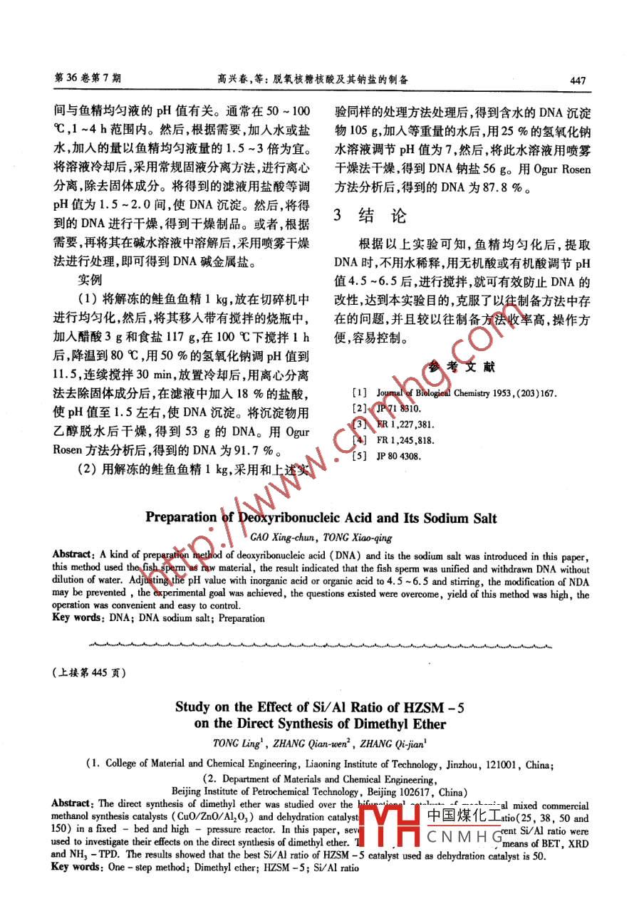 第36卷第7期遼寧化工Vol 36. No. 72007年7月Liaoning Chemical IndustryJuly, 2007不同硅鋁比HZSM-5分子篩對(duì)合成氣一步法制二甲醚的影響佟玲,張謙溫2,張啟儉,(1.遼寧工學(xué)院材料與化學(xué)工程學(xué)院,遼寧錦州12001;2.北京石油化工學(xué)院化學(xué)工程系,北京102617)要:采用固定床高壓反應(yīng)裝置,以工業(yè)用(CuO/ZnO/A12O3)作為甲醇合成催化劑,四種不同硅鋁比(硅鋁比為253850和150)的HZSM-5作為甲醇脫水催化劑,二者機(jī)械混合制備出一步法合成二甲醚雙功能催化劑??疾炝舜呋瘎┲忻撍M分(HZSM-5分子篩)的硅鋁比對(duì)二甲醚合成反應(yīng)的影響,并通過(guò)BET、XRD和NH2-TPD等手段對(duì)催化劑進(jìn)行表征。結(jié)果表明,一步法合成二甲醚催化劑中脫水組分HZSM-5的最佳的硅鋁比為50。關(guān)鍵詞:一步法;DME;HZSM-5;硅鋁比中圖分類號(hào):TQ223.24文獻(xiàn)標(biāo)識(shí)碼:A文章編號(hào):1004-0935(2007)07-0443-04二甲醚(DME)是一種無(wú)色、有輕微醚香味的℃)不相匹配,從而導(dǎo)致雙功能催化劑的催化性惰性氣體,具有優(yōu)良的燃燒性能,無(wú)腐蝕性、無(wú)致能降低,為此人們對(duì)各種分子篩尤其是HZSM癌性,在醫(yī)藥、農(nóng)藥等精細(xì)化工中間體、氣霧劑、制都進(jìn)行了廣泛的研究。冷劑和燃料等方面都有應(yīng)用近年來(lái)其制備過(guò)程1實(shí)驗(yàn)部分受到廣泛的關(guān)注合成氣一步法合成二甲醚是目前最受關(guān)注的1.1催化劑的制備方法,是由甲醇合成與甲醇脫水和水氣變換反應(yīng)甲醇合成催化劑直接采用南化研究院生產(chǎn)的耦合得到,反應(yīng)式如下2:銅基催化劑C207,脫水催化劑為不同硅鋁比(252H2+CO—CH3OH△H=-90.4k/mol(1)38,50,150)的HZSM-5分子篩,采用機(jī)械混合法2cH2OH→cH2OCH2+H2O△H=-23.4k/mdl將二者混合,即將兩種活性組分按一定比例混合后研磨均勻,壓片、破碎,取20~40目備用。C0+H20一CO2+H2△H=-4.9m(3)1.2催化劑性能測(cè)試步法合成DME由于反應(yīng)系統(tǒng)內(nèi)同時(shí)存在二甲醚合成是在固定床反應(yīng)器中進(jìn)行的,催甲醇合成和甲醇脫水兩類反應(yīng),打破了單純甲醇化劑裝量為1.0g,催化劑兩端填充石英棉。以合成過(guò)程中存在的熱力學(xué)平衡限制從而可有效高純氮?dú)鉃槎栊韵♂寶怏w配成含H2體積分?jǐn)?shù)5地降低操作壓力和提高CO的單程轉(zhuǎn)化率。合成%的還原氣,在2h內(nèi)升溫到300℃,還原4h。DME的催化劑也是由甲醇合成和甲醇脫水兩種還原結(jié)束后切入原料氣進(jìn)行反應(yīng),其中原料氣的催化劑活性組分復(fù)配而成。甲醇合成工藝上比較成分包括24%C0,65%H2,8%CO2,3%Ar成熟對(duì)其催化劑研究的也很多,多采用Cu基催為內(nèi)標(biāo)氣體在分析中使用。采用cC9890A型氣化劑;甲醇脫水的催化劑一般為固體酸催化相色譜儀進(jìn)行在線分析,以TDX-01色譜柱分析劑如y-Al2O3、HSM-56-7、Y型分子Ar,c田抽汕松洲器(TCD)檢測(cè)篩”等,由于y-Al2O3的最佳活性溫度(約中國(guó)煤化工300℃)與銅基催化劑的最佳活性溫度(約250CNMHG上研寬生遼寧化工2007年7月采用 Porapak-Q色譜柱分析甲醇、二甲醚及烴硅鋁比的HZSM-5分子篩峰型具有較好的一致類,用氫火焰離子檢測(cè)器(FID)檢測(cè)性,但在20=12.6、15.6、21.7、26.1等處的峰型13催化劑的表征有差異。這是由于硅鋁比不同,改變了分子篩的1.3.1比表面積測(cè)定(BET)骨架結(jié)構(gòu),造成XRD譜圖的差異。催化劑比表面積的測(cè)定在 Quantachrome公司的 Autosorb-1-MP上進(jìn)行,采用靜態(tài)容量法Si/Al=l50N2作吸附質(zhì),吸附溫度為液氮溫度,測(cè)定比表面Si/Al=50積及孔體積。1.3.2X射線衍射分析(XRDSi/Al=38XRD在 SHIMADZU公司XRD-7000型X射Si/Al=25線衍射儀(Cu靶Ka射線源)上進(jìn)行,x射線管工作條件:管壓40kV催化劑的制備、管流30mA,掃描速度3(deg/min),掃描范圍5°~80°。20/deg1.3.3程序升溫脫附分析(NH3-TPD)本文中主要采用NH3-TPD法測(cè)定Al2O3、圖1不同硅鋁比HZSM-5的XRD譜圖分子篩樣品的酸性。取目數(shù)為20-40目的樣品2.3不同硅鋁比HZSM-5的NH3-TPD分析0.20g,將樣品置于內(nèi)徑為6mm的反應(yīng)管中,以圖2為不同硅鋁比HZSM-5分子篩的NH3氮?dú)鉃檩d氣(流速30mL/min)升溫至500℃,原-TPD譜圖。位恒溫1h后,降至80℃,切換氨氣。在100℃下吸氨0.5h,以氮?dú)獯祾?.5h后再程序升溫至si/A1=150600℃(升溫速5℃/min),熱導(dǎo)池檢測(cè),記錄譜Si/Al=50圖Si/A1=382結(jié)果與討論2.1硅鋁比對(duì)比表面積、孔體積的影響Si/Al=25不同硅鋁比的HZSM-5分子篩的比表面積和孔體積的數(shù)據(jù)見表1。表1硅鋁比對(duì)比表面及孔體積的影響溫度/℃硅鋁比比表面積(m2·g-1)孔體積/(cm3·g-1)圖2不同硅鋁比HZSM-5的NH3-TPD譜圖352.50.2880.230HZSM-5分子篩上有兩個(gè)NH3脫附峰(分50268.90.174269.4別記為A峰和B峰),說(shuō)明其表面存在兩種不同強(qiáng)度的酸性位,A峰的NH3脫附溫度較低,峰溫可以看出,硅鋁比的增加使HSM-5分子篩約為200℃,代表催化劑的較弱酸位,B峰的NH3的比表面積和孔體積逐漸減小,當(dāng)硅鋁比為150脫附溫度較高峰溫約為400℃代表催化劑的較時(shí),其比表面積和孔體積又比硅鋁比為50時(shí)略有強(qiáng)酸位。通過(guò)積分對(duì)A峰和B峰的峰面積可以回升。得到在催化劑不同酸中心上NH3的相對(duì)脫附量2.2不同硅鋁比的HZSM-5的XRD分析將中國(guó)煤化工處理結(jié)果列于表1圖1為不同硅鋁比的HZSM-5的XRD譜中CNMHG同一催化劑而言,圖