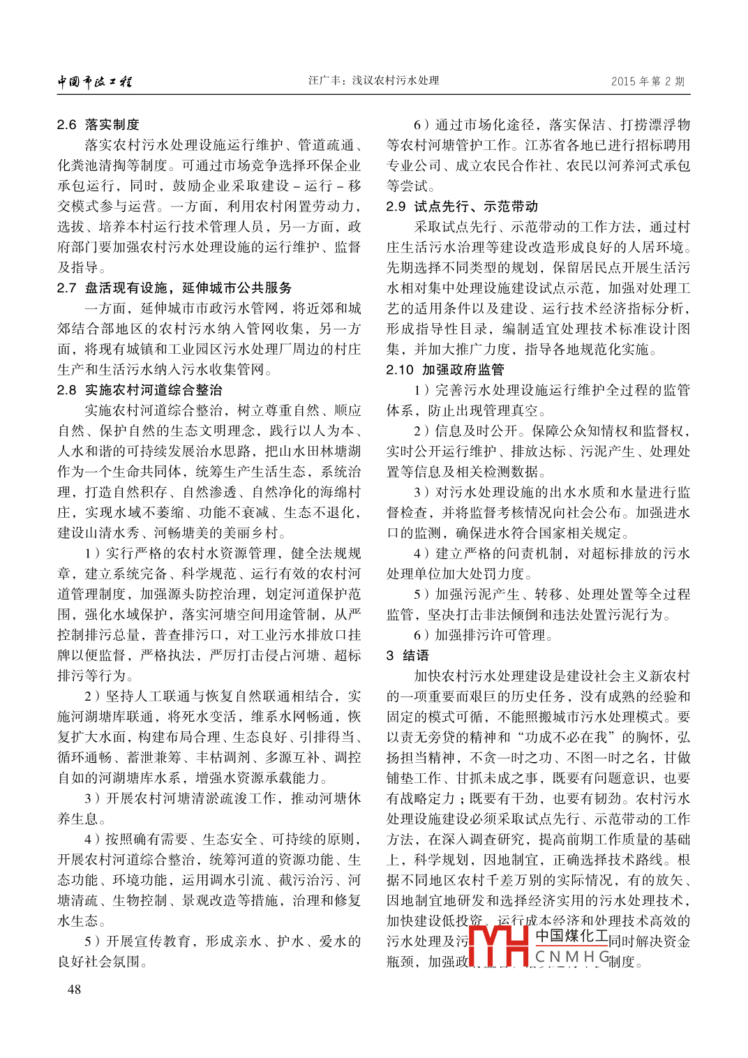 第2期(總第178期)中囝市改工程N(yùn)o.2 (Serial No.178)2015年4月CHINA MUNICIPAL ENGINEERINGApr. 2015D0l:10.3969/isn.1004- 4655.2015.02.016淺議農(nóng)村污水處理汪廣豐(南京市住房和城鄉(xiāng)建設(shè)委員會,南京210024 )摘要:通過分析當(dāng)前農(nóng)村水環(huán)境污水處理的現(xiàn)狀和問題,提出因地制宜解決農(nóng)村污水處理問題的對策。農(nóng)村污水處理設(shè)施建設(shè)不能照搬城市污水處理模式,必須適應(yīng)農(nóng)村污水量小、分散的特點(diǎn),正確選擇技術(shù)路線,根據(jù)不同地區(qū)農(nóng)村千差萬別的實(shí)際情況,有的放矢、因地制宜地研發(fā)和選擇經(jīng)濟(jì)實(shí)用的污水處理技術(shù)。關(guān)鍵詞:污水處理;農(nóng)村;技術(shù)路線中圖分類號: X703文獻(xiàn)標(biāo)志碼: A文章編號: 1004- -4655 ( 2015) 02- -0045-041現(xiàn)狀概述染的水源用于灌溉,還會導(dǎo)致農(nóng)產(chǎn)品的污染。農(nóng)業(yè)面建設(shè)社會主義新農(nóng)村是黨中央提出的重大歷史源污染是我國江河湖海污染的重要來源之- - 。全國任務(wù),生產(chǎn)發(fā)展、生活富裕、鄉(xiāng)風(fēng)文明、村容整主要水污染物排放量有40%來自農(nóng)業(yè)污染源,其中,潔、管理民主是新農(nóng)村建設(shè)的目標(biāo)。良好的生態(tài)環(huán)化學(xué)需氧量占總排放量的43.7%,總氮、總磷占排放境是新農(nóng)村建設(shè)的基礎(chǔ),是最公平的公共產(chǎn)品,是總量的57.2%和67.4%。最普惠的民生福祉。水環(huán)境是生態(tài)環(huán)境的核心組成“十一五”以來,國家加大水污染防治力度,部分,建設(shè)美麗鄉(xiāng)村的關(guān)鍵在水。隨著工業(yè)化、城許多省做到每個縣都有污水處理廠,工業(yè)點(diǎn)源也有市化、農(nóng)業(yè)現(xiàn)代化、新型城鎮(zhèn)化的快速發(fā)展,農(nóng)村污水處理設(shè)施,但農(nóng)村污水處理成為短板。有的地生態(tài)環(huán)境和人居環(huán)境面臨新的問題,要真正實(shí)現(xiàn)看方重視不夠,有的地方雖然重視,但工藝選擇不切得見清山綠水、留得住鄉(xiāng)愁,就必須解決好農(nóng)村污合當(dāng)?shù)貙?shí)際,花錢不少,項(xiàng)目運(yùn)行效果不佳,成為.水處理問題。2014年12月,習(xí)近平總書記在江蘇擺設(shè)。有的地方新農(nóng)村建設(shè)及污水處理缺乏統(tǒng)籌規(guī)考察時指出,解決好廁所問題在新農(nóng)村建設(shè)中具有劃,或雖有規(guī)劃但形同虛設(shè)。有的地方僅進(jìn)行村莊標(biāo)志性意義,要因地制宜做好廁所下水道管網(wǎng)建設(shè)及河道景觀改造,沒有截污,后續(xù)管理養(yǎng)護(hù)不落實(shí)。和農(nóng)村污水處理,不斷提高農(nóng)民生活質(zhì)量。部分基層干部推進(jìn)農(nóng)村生活污染治理的重要性和緊隨著現(xiàn)代化的推進(jìn),農(nóng)村河道斷流、湖塘萎縮、迫性認(rèn)識不到位,再加上工作面廣以及需要投人大水資源短缺、水生態(tài)惡化、水環(huán)境污染等問題日益突量的人力、物力、財(cái)力并建立長效管理機(jī)制,存在出,制約農(nóng)村經(jīng)濟(jì)社會可持續(xù)發(fā)展。農(nóng)村生產(chǎn)和生活畏難情緒或等、靠、要思想;部分農(nóng)民群眾受不良污水不斷增加,而大部分農(nóng)村地區(qū)尚沒有完整系統(tǒng)的傳統(tǒng)習(xí)慣和經(jīng)濟(jì)、文化落后的影響,環(huán)境保護(hù)和衛(wèi)生活和生產(chǎn)污水收集管網(wǎng)與污水處理廠,生活污水直生安全意識不強(qiáng),臟、亂、差的現(xiàn)象仍較為普遍。接排放。工業(yè)園區(qū)和居民生活區(qū)混雜,污水處理設(shè)施村莊數(shù)量多,規(guī)模小,分布散,村莊中農(nóng)民居不完善,運(yùn)行不良,處理效果不佳,工業(yè)污水未經(jīng)處住分散,污水點(diǎn)多、面廣,地形復(fù)雜,單戶污水量小,理達(dá)標(biāo)而直接排放。畜禽養(yǎng)殖污水基本不處理。生活濃度較低,水質(zhì)波動性大,污水排放規(guī)律性強(qiáng),峰垃圾隨意傾倒人河,嚴(yán)重污染農(nóng)村水資源,最終污染.值明顯,建設(shè)統(tǒng)--污水收集管網(wǎng)困難,管網(wǎng)投資高,江河湖泊等流域性區(qū)域性水源,包括城鎮(zhèn)水源。被污占地空間大,污泥出路難尋,施工不便,無后續(xù)運(yùn)行維護(hù)技術(shù)力量。有的農(nóng)村山地多、河塘多,建設(shè)收稿日期: 2015-01-14作者簡介:汪廣豐(1966-),男,工程師,學(xué)士,主要從難度更大。農(nóng)中國煤化工治理建設(shè)運(yùn)行事市政工程技術(shù)和管理。經(jīng)費(fèi)缺口較大MHCNMH G45中閱市波工程汪廣豐:淺議農(nóng)村污水處理2015年第2期農(nóng)村污水處理工作面廣量大,沒有成熟的經(jīng)驗(yàn)2)提高規(guī)劃的前瞻性。不僅定性,而且定量,和固定的模式可循,就像當(dāng)年推進(jìn)農(nóng)村自來水改造既有剛性,也有柔性,有可操作性,遠(yuǎn)、中、近期-樣,必須千方百計(jì)地謀劃,有條不紊地實(shí)施,薪規(guī)劃相結(jié)合。從規(guī)劃做起防止重復(fù)建設(shè),不能讓今火相傳地推進(jìn)。農(nóng)村污水處理設(shè)施建設(shè)必須適應(yīng)農(nóng)天做的規(guī)劃成為明天發(fā)展的障礙。要避免填河造地,村污水量小、分散的特點(diǎn),不能照搬城市污水處理防止水面消失,明河變暗渠,原來流動互通的水系模式。變成支離破碎的污水溝。從源頭上按