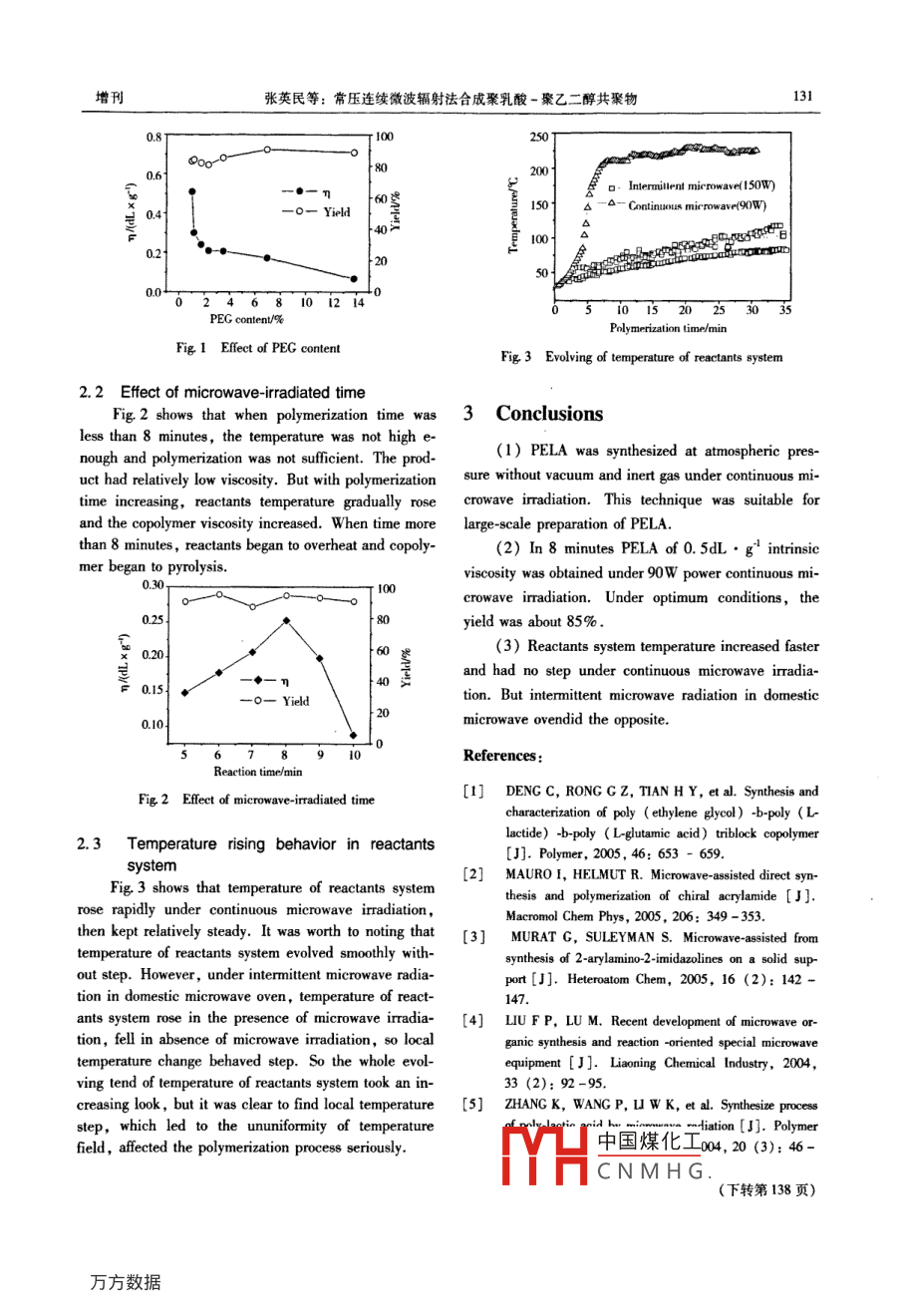 第46卷增刊中山大學(xué)學(xué)報( 自然科學(xué)版)VoL. 46 Sup.2007年6月ACTA SCIENTIARUM NATURALIUM UNIVERSITATIS SUNYATSENIJun.2007Continuous Microwave-Irradiated Synthesis of Poly(D,L-Lactide ) -co-Poly ( Ethylene Glycol )Copolymer Under AtmosphereZHANG Ying-min, WANG Peng, LI Yue, LEI Haifen, JIAO Chun-yan, HAN Ning( Research Center for Green Chemistry and Technology ,School of Municipal andEnvironmental Engineering, Harbin Institute of Technology, Harbin 150090, China)Abstract: Poly (D, L-lactide) -co-poly ( ethylene gycol) copolymer ( PELA) of Intrinsic viscosity0. 51 dL●g"'had been preparedunder continuous microwae-iradiation power of 90 W for 8 min at atmosphere. Effects of poly ( ethylene glycol) ( PEG) content,polymerization time on intrinsic viscosity and yield of PELA had been discussed. Furthermore, temperature rising behavior in reactantssystem was studied through copolymerization under continuous microwave oven and domestic microwave oven. The results showed thattemperature of reactants system evolved smoothly without step under continuous microwave iradiation, which occurred under intermit-tent microwave iradiation in domestic microwave oven.Key words: continuous microwave imadiation; polylactide; poly ( ethylene glycol) ; copolymerCLC number: TQ316. 6*1Document code; AArticle ID: 0529-6579 (2007) SI 0130-03Poly (D, L-lactide) -co-poly ( ethylene glycol)(Sn (Oct)2) was used as catalyst. PEG1000 and tet-( PELA), obtained through copolymerizing PEG intorahydrofuran (THF) were analytically pure.Poly (lactie acid) (PLA) chains, has not only the.2 Procedureproperties of PLA homopolymery , but also hydrophilici-3g DLLA and PEG - 1000 in a certain proportionty, toughness,flexibility and so on which are not avail-were weighed into a 50mL beaker, Sn( 0ct)2(0. 40% )able in PLA homopolymery'.as catalyst then the beaker was placed on the heating-Microwave technology for organic synthesis reac-medium and was irradiated under microwave power oftion has been reported[2-3]Nowadays most research 90W for minutes.of organic synthesis reaction are still concentrated 0.3 Measurementsthe domestic microwave ovens'”. Because microwaveIntrinsic viscosity of PELA was measured with anis intermittently irradiated, reaction temperature rises atUbbelohde viscometer in THF at 379C. IR spectrahe presence of microwave irradiation and drops at the , were recorded on a Nicolet - 670FT-IR apparatus.' Habsence of it during reaction. Such a heating way is ad-NMR spectra of polymer were recorded with a Brukerverse to reaction. Moreover, power adjustment of do-AC-P200MHz apparatus.mestic microwave oven is limited for several intervalsand can't meet the actual requirement. In this paper ,2 Results and discussioncontinuous microwave oven was used ( 2450MHz),2.1 Effect of PEG contentpower output of which was continuous without intermit-In the Fig 1, when PEG content was 1%,PELAtence and overcome the shortcomings of domestic micro-with maximum intrinsic viscosity of 0.51dL●g~' waswave imadiation.synthesized. It was considered that with PEG content1 Experimentalincreasing, chain transfer rate increased, which resul-ted in the halt of the chain growing, thus lowered co-1.1 Materialspolymer viscosity.The synthesis and purification of D, L-lactictide(DLLA) was according to ref [5]. Stannous octoate中國煤化工MHCNMHG收稿日期: 200701-10基金項目:哈爾濱市科技攻關(guān)資助項目(2005AA4CS112)作者簡介:張英民(1976年生),男,博士生;通訊聯(lián)系人:王鵬; E mail: pwang73@ hit edu. en增刊張英民等:常壓連續(xù)微波輻射法合成聚乳酸-聚乙二醇共聚物1310.8廠丁10025080200.6 |Inermillent microwave(t50W)150 1Continuous mircrowave(90W).4--0- Yield1000.2個-205(00724681012140 35PEG content/%Polymerizaion time/minFig 1 Effect of PEG contentFig 3 Evolving of temperature of reactants system2.2 Effect of microwave-irradiated timeFig 2 shows that when polymerization time was 3 Conclusionsless than 8 minutes, the temperature was not high e-(1) PELA was synthesized at atmospheric pres-nough and polymerization was not sufficient. The prod-uct had rlatively low viscosity. But with polymerizaion sure without vacum and inert gas under continuous mi-time increasing, reactants temperature gradually rose crowave iradiation. This technique was suitable forand the copolymer viscosity increased. When time more large-scale preparation of PELA.than 8 minutes , reactants began to overheat and copoly-(2) In 8 minutes PELA of 0.5dL●g' intrinsicmer began to pyrolysis.viscosity was obtained under 90W power continuous mi-crowave iradiation. Under optimum conditions, the0.25t8yield was about 85% .(3) Reactants system temperature increased faster”0.2t6and had no step under continuous microwave iradia-40占0.15{ ◆tion. But intermittent microwave radiation in domestict20.10microwave ovendid the opposite.5678910References:Reaction time/min[1] DENG C, RONG C z, TIAN H Y, et al. Synthesis andFig2 Elect of microwave-irradiated timecharaceriaion of poly ( ethylene gycol) -b-poly (Llactide) -b-poly ( Lglutamie acid) triblock copolymer2.3 Temperature rising behavior in reactants[J]. Polymer, 2005, 46: 653 - 659system[2] MAURO I, HELMUT R. Microwave asted direct syn-Fig.3 shows that temperature of reactants systemthesis and polymerization of chiral acrylamide [ J].rose rapidly under continuous microwave irradiation,Macromol Chem Phys, 2005, 206: 349 -353.then kept relatively steady. It was worth to noting that[3] MURAT C, SULEYMAN s. Microwave asited from ;temperature of reactants system evolved smoothly with-synthesis of 2-arylamino-2-imidazolines on a solid sup-out step. However ,under intermittent microwave radia-port [J]. Heteroatom Chem, 2005, 16 (2): 142 -tion in domestic microwave oven, temperature of react-147ants system rose in the presence of microwave irradia-[4] LIUFP, LU M. Recent development of microwave or-tion, fell in absence of microwave irradiation, so loca