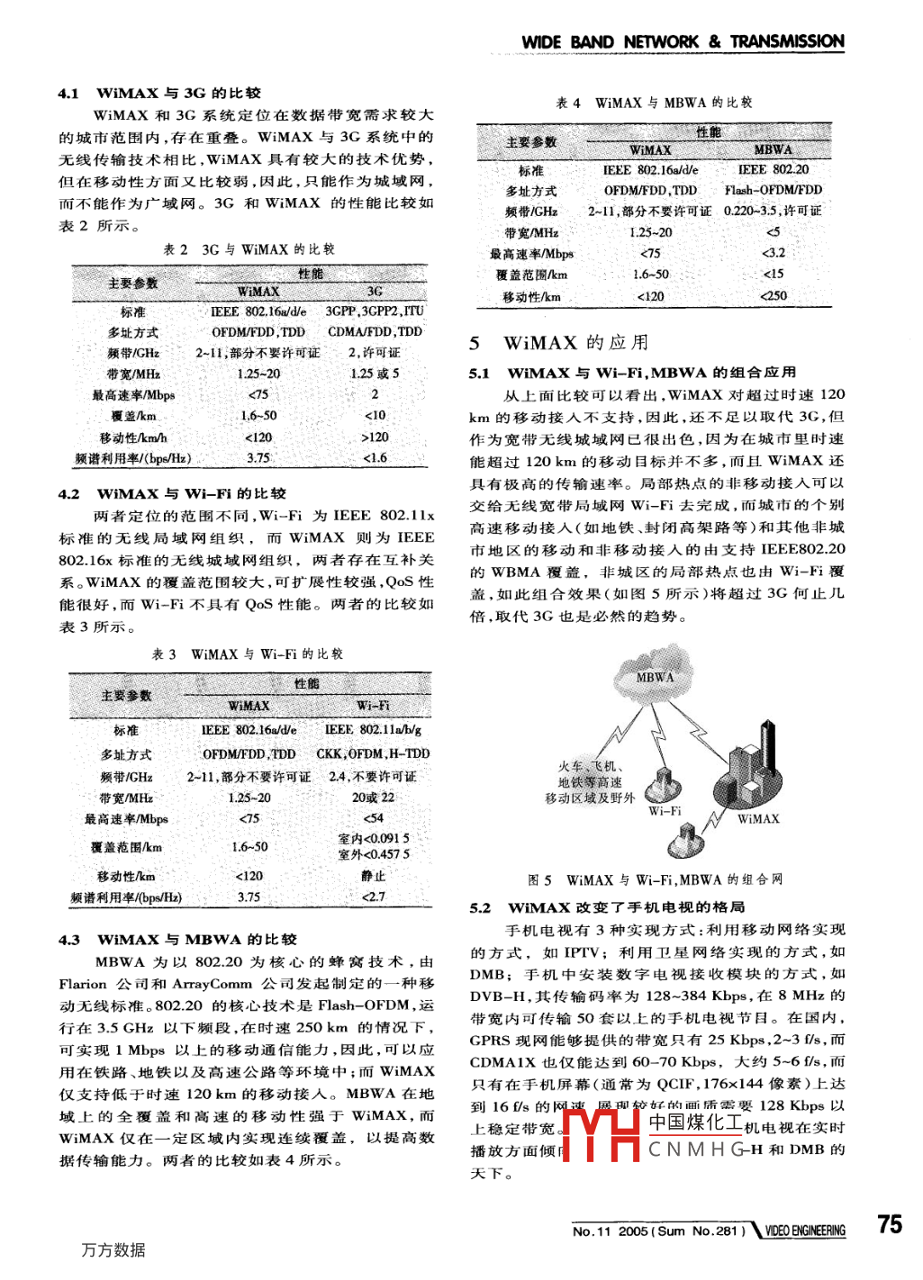 WIDE BAND NETWORK TRANSMISSION文章編號:1002-8692(2005)11-0073-04WMAX技術(shù)及應(yīng)用·綜述曹宇輝,鄭偉,王匡(浙江大學(xué)信息與電子工程學(xué)系,浙江杭州31027)【摘要】介紹了 WiMAX協(xié)議的歷史及優(yōu)勢,描述了其物理層和MAC層,把它與3C,Wi-Fi及MBWA進行了比較,闡述了WMAX和Wi-Fi及MBWA的一種組網(wǎng)模式,敘述了 WiMAX在未來無線寬帶網(wǎng)絡(luò)中的定位及在手機電視中的應(yīng)用?!娟P(guān)鍵詞】全球微波接入互操作性;無線保真;第三代移動通信技術(shù);移動寬帶無線接入;IEEE80216標(biāo)準(zhǔn);手機電視【中圖分類號】TN9136【文獻標(biāo)識碼】AWiMAX Technology and Its ApplicationCAO Yu-hui, ZHENG Wei, WANG Kuang(Department of information Science and Electronic Engineering, Zhejiang University, Hangzhou 310027, Chin[Abstract] This paper discussed the history and advantage of WiMAX standard, and presented the key technologies in thephysical layer and MAC layer for WiMAX standards. According to the comparison of WiMAX, 3G, Wi-Fi and MBWA sys-tems, there is a mode for WiMAX to evolve into a worldwide network. The application of WiMAX is depictured in the endKey words] WiMAX; Wi-Fi; 3G; MBWA; IEEE802. 16; Mobile TV引言75Mbps;目前,IEEE又對已通過的IEEE802162004進行擴展,正準(zhǔn)備推出IEEE802.16e,增加了全球微波接入互操作性“ Worldwide Interop對移動終端的支持ability for Microwave Access, WiMAX",是基宇22 WIMAX的優(yōu)勢IEEE802.16標(biāo)準(zhǔn)的寬帶無線接人城域網(wǎng)( Broad成本低,投資風(fēng)險較小;高容量,更長的傳輸距band Wireless Access Metropolitan Area Network離;完善的Qo機制;更好的安全性。技術(shù)。 WiMAX能夠提供雙向互聯(lián)網(wǎng)接入服務(wù),速率高達每秒75Mbps,該技術(shù)能夠在50km范圍內(nèi)進3 WiMAX的主要技術(shù)特點行數(shù)據(jù)傳輸,覆蓋半徑達1.6km。 WIMAX能應(yīng)用于WIMAX的優(yōu)勢主要由其技術(shù)特點決定。定義很多領(lǐng)域,包括“最后1000m”接入、熱點、蜂窩回的參考模型如圖1所示。業(yè)部將3.5GHz(3400-3430MHz,3500~3530MHz)和58GHz(5725-5850MHz)兩個頻帶劃為無線寬帶城域網(wǎng)接入的專用頻帶。2004年6月, INTELASA Server(s)經(jīng)和大連、成都簽署協(xié)議,在這兩個城市部WiMAX無線城域網(wǎng)(即IEEE802.16a)MSSBS2 WiMAX的發(fā)展歷程和優(yōu)勢圖1 WiMAX參考模型2.1 WIMAX發(fā)展歷程IEEE802.16標(biāo)準(zhǔn)最初于2001年12月獲得批WiMAX網(wǎng)絡(luò)由移動用戶臺(MSS)、基站(BS)、認準(zhǔn),使用的頻率范圍為10~66GHz,支持在視距證和業(yè)務(wù)授權(quán)服務(wù)器(ASA)組成。其中ASA服務(wù)器(Los)范圍內(nèi)執(zhí)照許可和免執(zhí)照許可頻段的通信;就是人們常說的提供認證、授權(quán)和計費等功能的2003年1月,IEEE對802.16進行了修改,推出的協(xié)AAA服務(wù)器。議稱為802.16a,使用2~1GHz的頻率范圍,支持31協(xié)議結(jié)構(gòu)非視距( NLOS)通信,引進了OFDM等多項技術(shù);WIMAX的協(xié)議結(jié)構(gòu)(也是其空中接口規(guī)范)主2004年6月推出的IEEE802.16d(即IEEE要由物理層和MAC層組成。MAC層又分成了380216REVd)是對802.16a標(biāo)準(zhǔn)的進一步完善和補子層:特定服務(wù)匯聚子層( Service Specific Con充,增強了設(shè)備的互操作性,習(xí)慣上稱為 Ieee vergence St中國煤化工( Common Part80216-2004,它支持15-20MH多種信道帶寬劃 Sublayer)和CNMH Ger)。其協(xié)議棧分方式,采用20MHz帶寬時,單信道容量最高可達模型如圖2所示。N.12565mN281)\m073寬帶網(wǎng)絡(luò)與傳輸3.2物理層置不同的QoS參數(shù),包括速率、延時等指標(biāo)。終端可高層WiMAX根據(jù)QoS和業(yè)務(wù)的傳輸參數(shù)發(fā)出帶寬請求特定服務(wù)匯聚子層物理層的空中WiMAX MAC層由高到低劃分為3個子層:AAC共用部分子層(MAC層接口技術(shù)有1)特定服務(wù)匯聚子層保密子層(PSWirelessMAN提供與更高層的接口,如與ATM、以太網(wǎng)和物理層(PHY)Wi-Fi的接口,通過使用不同的會聚方式更好地與圖2協(xié)議棧模型MAN OFDM上層協(xié)議匹配。WirelessMAN2)公共部分子層OFDMA和 WirelesshUman。其中: WHUMAN并不能執(zhí)行MAC層的核心功能,包括系統(tǒng)接人、帶寬算一種獨立的接口方式,而是在免許可頻段采用以分配、打包、分幀、自動重發(fā)和Qos等。上3種技術(shù)中的一種; WirelessMAN_SCa果用單載3)安全子層波自適應(yīng)調(diào)制,上行鏈路采用TDMA方式,下行鏈執(zhí)行鑒權(quán)、加密、密鑰交換等與安全有關(guān)的功路使用廣播方式進行1點對多點的信號傳輸,基站能。給BS內(nèi)所有的SS發(fā)射TDM信號,目標(biāo)S檢測4 WIMAX與3G,W-Fi,MBWA的比較到是自己的時隙就啟動,開始接收信號; Wireless-MAN_OFDM為采用256個子載波的OFDM調(diào)制技從寬帶無線接入標(biāo)準(zhǔn)本身講 WIMAX,3G,Wi術(shù),上行接入采用TDMA+ OFDMA,下行采用TDMF各有自已的覆蓋范圍。WMAX主要用于寬帶無方式; WirelessMAN_ OFDMA為采用2048個子載波線城域網(wǎng);WiF主要用于寬帶無線局域網(wǎng);只有的OFDM調(diào)制技術(shù),上下行都采用TDMA+ OFDMA MBWA與3G同為寬帶無線廣域網(wǎng),但MBWA的傳方式。IEEE80216系統(tǒng)可工作在頻分雙工(FDD)輸容量更大。各種技術(shù)標(biāo)準(zhǔn)之間的關(guān)系如圖3和圖或時分雙工(TDD)方式。FDD需要成對的頻率,TDD則不需要,而且可以靈活地實現(xiàn)上下行帶寬動態(tài)調(diào)整。 WirelessMAN OFDM和 Wireless-覆MAN OFDMA的各參數(shù)比較如表1所示。BMA 802.16a表1 WirelessM