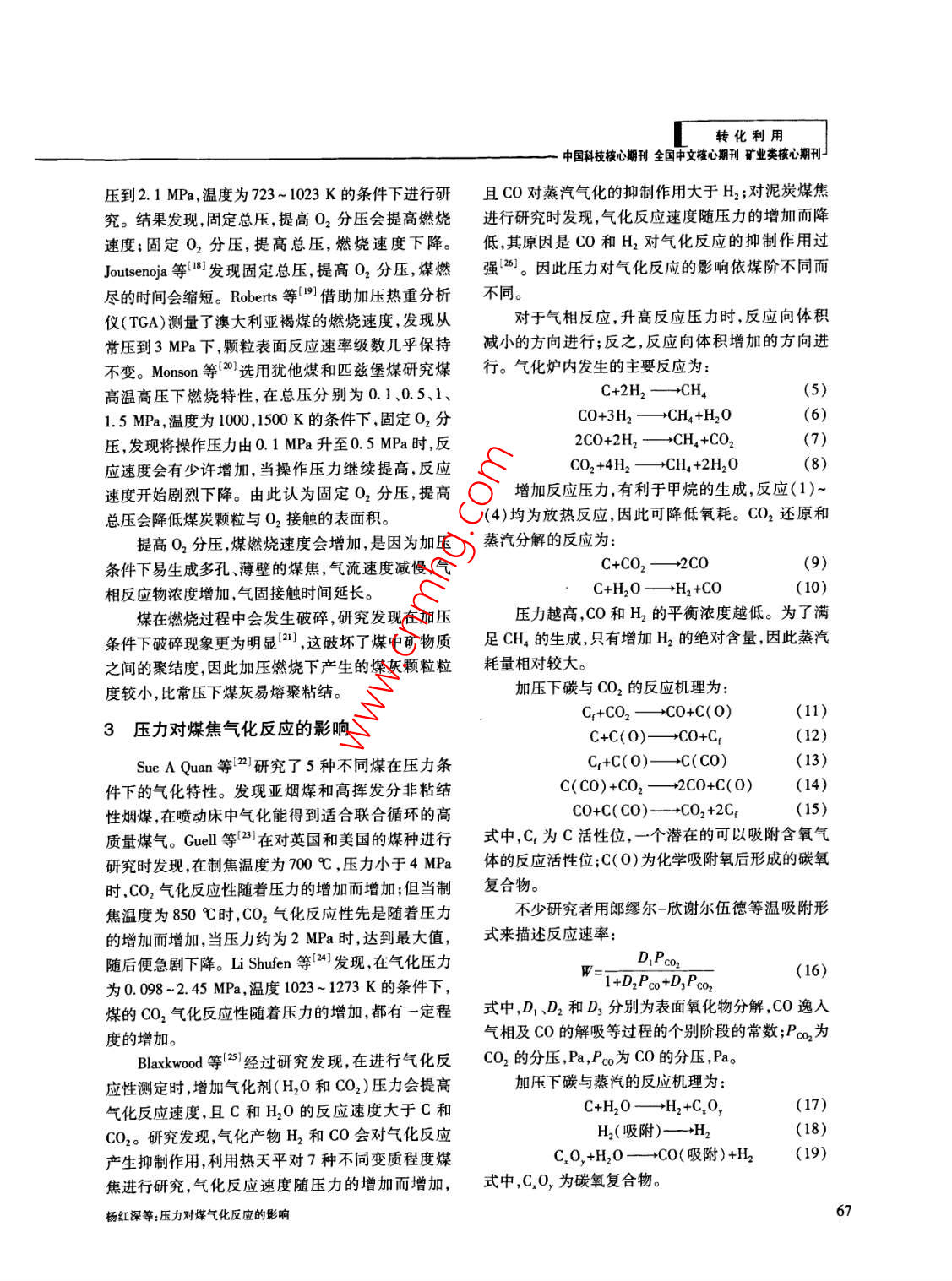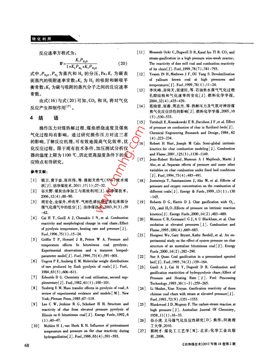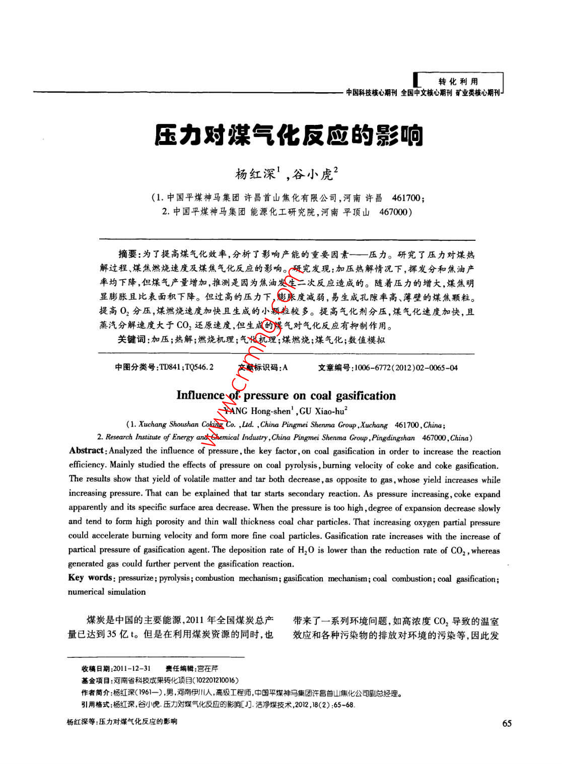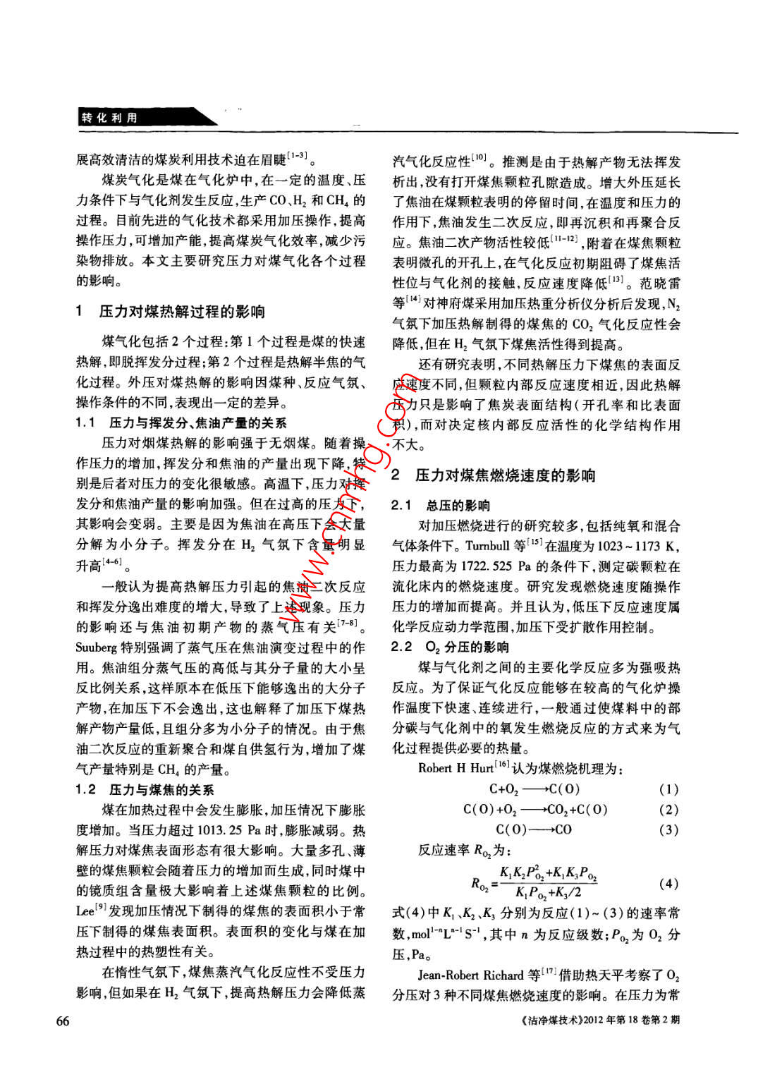 轉(zhuǎn)化利用: 中國(guó)科技核心期刊全國(guó)中文核心期刊礦業(yè)類(lèi)核心期刊J壓力對(duì)煤氣化反應(yīng)的影響楊紅深' ,谷小虎2(1.中國(guó)平煤神馬集團(tuán)許昌首山焦化有限公司,河南許昌461700;2.中國(guó)平煤神馬集團(tuán)能源化工研究院,河南平頂山467000)摘要:為了提高煤氣化效率,分析了影響產(chǎn)能的重要因素--壓力。 研究了壓力對(duì)煤熱解過(guò)程、煤焦燃燒速度及煤焦氣化反應(yīng)的影響。研究發(fā)現(xiàn):加壓熱解情況下,揮發(fā)分和焦油產(chǎn)率均下降,但煤氣產(chǎn)量增加,推測(cè)是因?yàn)榻褂桶l(fā)生二次反應(yīng)造成的。隨著壓力的增大,煤焦明顯膨脹且比表面積下降。但過(guò)高的壓力下,膨脹度減弱,易生成孔隙率高、薄壁的煤焦顆粒。提高O2分壓,煤燃燒速度加快且生成的小顆粒較多。提高氣化劑分壓,煤氣化速度加快,且蒸汽分解速度大于CO2還原速度,但生成的煤氣對(duì)氣化反應(yīng)有抑制作用。關(guān)鍵詞:加壓;熱解;燃燒機(jī)理;氣化機(jī)理;煤燃燒;煤氣化;數(shù)值模擬中圖分類(lèi)號(hào):TD841 ;TQ546.2文獻(xiàn)標(biāo)識(shí)碼:A文章編號(hào):1006-6772(2012)02 -0065-04Influence of pressure on coal gasificationYANG Hong shen' ,GU Xiao-hu2(1. Xuchang Shoushan Coking Co. ,Ltd. ,China Pingmei Shenma Group ,Xuchang 461700 , China;2. Research Institute of Energy and Chemical Industry , China Pingmei Shenma Group ,Pingdingshan 467000 ,China)Abstract: Analyzed the influence of pressure , the key factor , on coal gasification in order to increase the reactionefficiency. Mainly studied the effects of pressure on coal pyrolysis , burning velocity of coke and coke gasification.The results show that yield of volatile matter and tar both decrease , as opposite to gas , whose yield increases whileincreasing pressure. That can be explained that tar starts secondary reaction. As pressure increasing, coke expandapparently and its specific surface area decrease. When the pressure is too high,degree of expansion decrease slowlyand tend to form high porosity and thin wall thickness coal char particles. That increasing oxygen partial pressurecould accelerate burming velocity and form more fine coal particles. Gasification rate increases with the increase ofpartical pressure of gasification agent. The deposition rate of H20 is lower than the reduction rate of CO2 , whereasgenerated gas could further pervent the gasification reaction.Key words: pressurize; pyrolysis; combustion mechanism; gasification mechanism; coal combustion; coal gasification;numerical simulation煤炭是中國(guó)的主要能源,2011年全國(guó)煤炭總*帶來(lái)了一 系列環(huán)境問(wèn)題,如高濃度CO2導(dǎo)致的溫室量已達(dá)到35億t。但是在利用煤炭資源的同時(shí),也效應(yīng) 和各種污染物的排放對(duì)環(huán)境的污染等,因此發(fā)收稿日期:2011-12-31責(zé)任編輯:宮在芹基金項(xiàng)目:河南省科技成果轉(zhuǎn)化項(xiàng)目(102201210016)作者簡(jiǎn)介:楊紅深(1961-) .男,河南伊川人,高級(jí)工程師,中國(guó)平煤神馬集團(tuán)許昌首山集化公司副總經(jīng)理。引用格式:楊紅深,谷小虎壓力對(duì)煤氣化反應(yīng)的影響[J].潔凈煤技術(shù),2012 ,18(2) :65-68.楊紅深等:壓力對(duì)煤氣化反應(yīng)的影響55轉(zhuǎn)化利用展高效清潔的煤炭利用技術(shù)迫在眉睫[1-3]。汽氣化反應(yīng)性[10]。推測(cè)是由于熱解產(chǎn)物無(wú)法揮發(fā)煤炭氣化是煤在氣化爐中,在一定的溫度、壓析出,沒(méi)有打開(kāi)煤焦顆粒孔隙造成。增大外壓延長(zhǎng)力條件下與氣化劑發(fā)生反應(yīng),生產(chǎn)CO、H2和CH的了焦油在煤顆粒表明的停留時(shí)間,在溫度和壓力的過(guò)程。目前先進(jìn)的氣化技術(shù)都采用加壓操作,提高作用下,焦油發(fā)生二次反應(yīng),即再沉積和再聚合反.操作壓力,可增加產(chǎn)能,提高煤炭氣化效率,減少污應(yīng)。焦油二次產(chǎn)物活性較低(11-11 ,附著在煤焦顆粒染物排放。本文主要研究壓力對(duì)煤氣化各個(gè)過(guò)程表明微孔的開(kāi)孔上,在氣化反應(yīng)初期阻礙了煤焦活的影響。性位與氣化劑的接觸,反應(yīng)速度降低川)。范曉雷等[4)對(duì)神府煤采用加壓熱重分析儀分析后發(fā)現(xiàn),N2.1壓 力對(duì)煤熱解過(guò)程的影響氣氛下加壓熱解制得的煤焦的CO2氣化反應(yīng)性會(huì)煤氣化包括2個(gè)過(guò)程:第1個(gè)過(guò)程是煤的快速降低,但在H2氣氛下煤焦活性得到提高。熱解,即脫揮發(fā)分過(guò)程;第2個(gè)過(guò)程是熱解半焦的氣還有研究表明,不同熱解壓力下煤焦的表面反化過(guò)程。外壓對(duì)煤熱解的影響因煤種、反應(yīng)氣氛、應(yīng)速度不同,但顆粒內(nèi)部反應(yīng)速度相近,因此熱解操作條件的不同,表現(xiàn)出一定的差異。壓力只是影響了焦炭表面結(jié)構(gòu)(開(kāi)孔率和比表面1.1壓力 與揮發(fā)分、焦油產(chǎn)量的關(guān)系積),而對(duì)決定核內(nèi)部反應(yīng)活性的化學(xué)結(jié)構(gòu)作用壓力對(duì)煙煤熱解的影響強(qiáng)于無(wú)煙煤。隨著操不大。作壓力的增加,揮發(fā)分和焦油的產(chǎn)量出現(xiàn)下降,特2壓力對(duì)煤焦 燃燒速度的影響別是后者對(duì)壓力的變化很敏感。高溫下,壓力對(duì)揮發(fā)分和焦油產(chǎn)量的影響加強(qiáng)。但在過(guò)高的壓力下,2.1 總壓的影響其影響會(huì)變?nèi)?。主要是因?yàn)榻褂驮诟邏合聲?huì)大量對(duì)加壓燃燒進(jìn)行