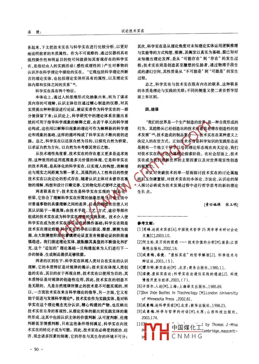 試論技術(shù)實(shí)在漆_ 捷:漆捷(太原理工大學(xué)法學(xué)系,山西太原030024)摘要:技術(shù)實(shí)在通過兩種形式表現(xiàn)出來:一種是由 技術(shù)創(chuàng)造的實(shí)物形態(tài)的實(shí)在,即人工產(chǎn)品,是科學(xué)實(shí)在的物化形式;另一種是由技術(shù)創(chuàng)造的功能意義的實(shí)在,虛擬實(shí)在是此類實(shí)在的代表。技術(shù)實(shí)在的內(nèi)涵通過三個(gè)層次展開:展現(xiàn)、顯現(xiàn)、呈現(xiàn)。關(guān)鍵詞:技術(shù);實(shí)在;技術(shù)實(shí)在;科學(xué)實(shí)在中團(tuán)分類號(hào):C970.7文獻(xiàn)標(biāo)識(shí)碼:A文章編號(hào):1000- -2987( 2004 )05-0048-03技術(shù)的密集介人社會(huì)生活引發(fā)的沖擊引起各方學(xué)者的義,是殊相、具體的;“實(shí)在”另一層涵義是指“真實(shí)" ,這是強(qiáng)烈關(guān)注。在此背最下,隨著以技術(shù)載體的實(shí)物形態(tài)不斷增拋開物質(zhì)具體屬性談到其本質(zhì)的方面,它相對(duì)于“虛幻" 、多,“技術(shù)實(shí)在”做為- -個(gè)專門術(shù)語呈現(xiàn)出來。2002年10月“錯(cuò)覺”而盲,是作為共相的抽象的存在,這里“實(shí)在”的內(nèi)15日-20日,由《中國(guó)社會(huì)科學(xué)>雜志社和浙大人文學(xué)院聯(lián)涵不是被感知而是被推導(dǎo)出的,是構(gòu)成前一種實(shí)在意義的基合主辦的“當(dāng)代科技革命與哲學(xué)創(chuàng)新”學(xué)術(shù)研討會(huì)上,山西礎(chǔ),是“元實(shí)在"。這種本源性超越了感性具體的現(xiàn)實(shí)性存大學(xué)科技所成素梅教授在其會(huì)議論文中首次提出“技術(shù)實(shí)在在”這一概念,得到當(dāng)時(shí)與會(huì)學(xué)者普遍關(guān)注;《哲學(xué)研究》技術(shù)意義的實(shí)在至少有兩種類型:一種是由技術(shù)創(chuàng)造的2004年3期,中國(guó)青年政治學(xué)院肖峰教授從技術(shù)本體論視實(shí)物形態(tài)的實(shí)在,即人工產(chǎn)品,是科學(xué)實(shí)在的物化形式;另-角,以“論技術(shù)實(shí)在"為題分析了這一概念!。以上述理論為種是由技術(shù)創(chuàng)造的功能意義的實(shí)在,虛擬實(shí)在是此類實(shí)在的基礎(chǔ),本文擬從認(rèn)識(shí)論,本體論,方法論及語義學(xué)角度對(duì)“技代表。其發(fā)展過程是從虛擬實(shí)在到擴(kuò)展實(shí)在,所謂擴(kuò)展實(shí)在術(shù)實(shí)在”做進(jìn)- -步理論探究。是指把虛擬實(shí)在轉(zhuǎn)化為自然實(shí)在叫。綜_上所述,“技術(shù)實(shí)在”則是利用認(rèn)知主體主觀能動(dòng)性,-、技術(shù)實(shí)在的內(nèi)涵使用現(xiàn)有人工自然技術(shù),運(yùn)用客觀規(guī)律對(duì)自在實(shí)在進(jìn)行利用、分類篩選、改造、創(chuàng)制而獲得的大腦思維的物質(zhì)產(chǎn)品的綜合。技術(shù)是人類發(fā)明品質(zhì)的外在表現(xiàn),通常在兩種涵義上使是對(duì)天然自然和人工自然的改造。用,一種指將技術(shù)看成是實(shí)現(xiàn)某種目的的手段,它以實(shí)物形技術(shù)實(shí)在的內(nèi)涵通過三個(gè)層次展開:展現(xiàn)、顯現(xiàn)、呈現(xiàn)。態(tài)表現(xiàn)自身,稱為“手段說" ;另一種指將其視作-種過程,展現(xiàn)是通過技術(shù)手段檢測(cè)發(fā)現(xiàn)關(guān)于物體是否存在的屬性說以非實(shí)物的形態(tài)表現(xiàn)出來。其本質(zhì)特點(diǎn)在于為實(shí)現(xiàn)預(yù)期的后明,為直接感知,通過技術(shù)手段展現(xiàn):從滿足衣食住行所需的果而重復(fù)進(jìn)行的優(yōu)化操作,可稱為“活動(dòng)說”四。普通技術(shù)制品(如日常用品)到藝術(shù)的技術(shù)化制品(如人造實(shí)在首先是指“存在”,它不同于人本主義、非理性主義假山、彩繪、雕塑、文學(xué)作品)高級(jí)層次則包括虛擬人體,航天拋棄康德的“現(xiàn)象”以人的內(nèi)省經(jīng)驗(yàn)所獲得的“心理要素”飛機(jī),人造探測(cè)衛(wèi)星等等。.這類技術(shù)實(shí)在的共同特點(diǎn)是:實(shí)來取代自在之物而被稱為的“實(shí)在" ,而是指客觀的存在物,體、可感知,滿足人基本的物質(zhì)和精神需求;一方 面,它是人的感官感知到的物體,這種承認(rèn)為認(rèn)識(shí)主體顯現(xiàn)經(jīng)由行為或作用表示出來.為間接感知,通過技術(shù)所感知的物質(zhì)的實(shí)在性是- - 切物質(zhì)的共同特征,是表征任何手段顯現(xiàn):通過技術(shù)手段間接而規(guī)律性地顯示自身存在:科事物的真實(shí)屬性;另一方面,它指處于自在自然與人工自然學(xué)家可以通過對(duì)電子運(yùn)動(dòng)軌跡方向及使用效果感知電子存的交集,是利用自然規(guī)律實(shí)現(xiàn)自在之物的技術(shù)化制品。給人在;中醫(yī)觀察人體的“望切聞問”,這種以功能表象為主的觀以具體時(shí)空、位置、形狀線條、重量等量化參數(shù)的“實(shí)在"涵察方法的中心不在人體的形態(tài)、結(jié)構(gòu),而在于表現(xiàn)于外的生中國(guó)煤化工收稿日期:2004-03-23|YHCNMHG作者簡(jiǎn)介:漆捷(1972-),男,江西南 昌人,太原理工大學(xué)法學(xué)系,研究方向?yàn)榧夹g(shù)哲學(xué)?!裾軐W(xué)與思維科學(xué).晉陽(yáng)學(xué)刊2004年第5期理病理機(jī)能表象,其目的就是要搜集關(guān)于疾病和病人的“原它間接表現(xiàn)出對(duì)科學(xué)理論