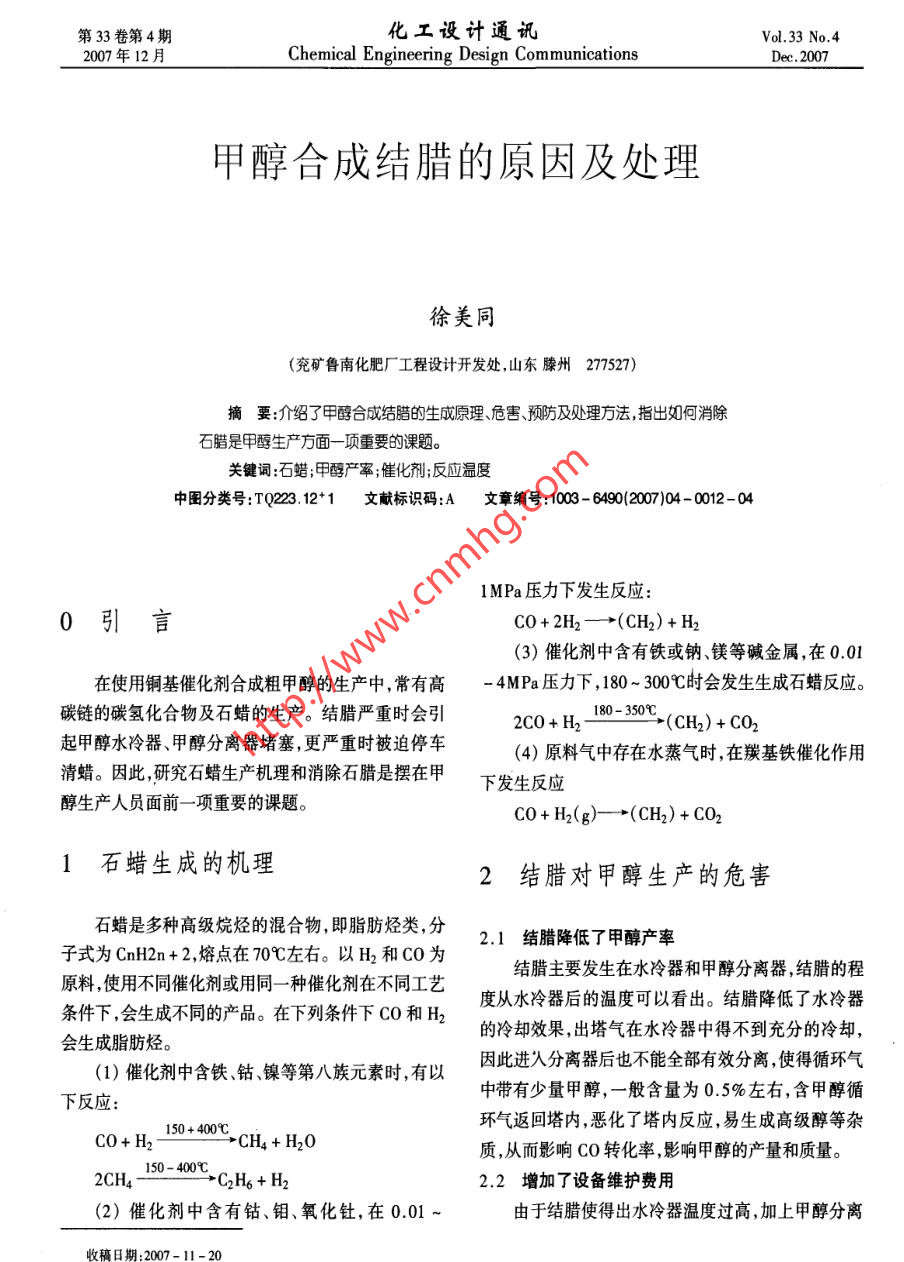 第33卷第4期化工設(shè)計(jì)通訊Vol.33 No.42007年12月Chemical Engineering Design CommunicationsDec.2007甲醇合成結(jié)臘的原因及處理徐美同(兗礦魯南化肥廠工程設(shè)計(jì)開發(fā)處山東滕州277527)摘要:介紹了甲醇合成結(jié)臘的生成原理 、危害預(yù)防及處理方法,指出如何消除石臘是甲醇生產(chǎn)方面一項(xiàng)重要的課題。關(guān)鍵詞:石蠟;甲醇產(chǎn)率;催化劑;反應(yīng)溫度中圖分類號(hào):TQ223.12*1文獻(xiàn)標(biāo)識(shí)碼:A文章編號(hào):1003 - 6490(2007)04- 0012-041MPa壓力下發(fā)生反應(yīng):0引言CO+2H2-→(CH2)+ H2(3)催化劑中含有鐵或鈉、鎂等堿金屬,在0.01在使用銅基催化劑合成粗甲醇的生產(chǎn)中,常有高- 4MPa壓力下,180~ 300C時(shí)會(huì)發(fā)生生成石蠟反應(yīng)。碳鏈的碳?xì)浠衔锛笆灥纳a(chǎn)。結(jié)臘嚴(yán)重時(shí)會(huì)引180- 350C2C0+ H2 :(CH2) + CO2 .起甲醇水冷器、甲醇分離器堵塞,更嚴(yán)重時(shí)被迫停車(4)原料氣中存在水蒸氣時(shí),在羰基鐵催化作用清蠟。因此,研究石蠟生產(chǎn)機(jī)理和消除石臘是擺在甲下發(fā)生反應(yīng)醇生產(chǎn)人員面前一項(xiàng)重要的課題。CO+ H2(g)-→(CH2) + CO21石蠟生成的機(jī)理2結(jié)臘對(duì)甲醇生產(chǎn)的危害石蠟是多種高級(jí)烷烴的混合物,即脂肪烴類,分2.1結(jié)臘降低了甲醇產(chǎn)率子式為CnH2n+ 2,熔點(diǎn)在70C左右。以H2和CO為結(jié)臘主要發(fā)生在水冷器和甲醇分離器,結(jié)臘的程原料,使用不同催化劑或用同一種催化劑在不同工藝度從水冷器后的溫度可以看出。結(jié)臘降低了水冷器.條件下,會(huì)生成不同的產(chǎn)品。在下列條件下CO和H2的冷卻效果,出塔氣在水冷器中得不到充分的冷卻,會(huì)生成脂肪烴。(1)催化劑中含鐵、鈷、鎳等第八族元素時(shí),有以因此進(jìn)入分離器后也不能全部有效分離,使得循環(huán)氣中帶有少量甲醇,一般含量為0.5%左右,含甲醇循下反應(yīng):環(huán)氣返回塔內(nèi),惡化了塔內(nèi)反應(yīng),易生成高級(jí)醇等雜CO+ H2150+ 400C,>CH4 + H20質(zhì),從而影響CO轉(zhuǎn)化率,影響甲醇的產(chǎn)量和質(zhì)量。150- 4002CH4→CH6+ H22.2增加了 設(shè)備維護(hù)費(fèi)用(2)催化劑中含有鈷、鉬、氧化釷,在0.01 ~由于結(jié)臘使得出水冷器溫度過(guò)高,加上甲醇分離收稿日期:2007-11-20傷壽箐數(shù)籍美同(1971- ),男,山東滕州人,工程師,主要從事化工工程設(shè)計(jì)及研究開發(fā)工作。聯(lián)系電話:0632 - 2362712第4期徐美同:甲醇合成結(jié)臘的原因及處理13器效果差,氣液分離不好,液體甲醇被帶人壓縮機(jī)循壓力越高,空速越大越容易使合成反應(yīng)向生成脂肪烴環(huán)段,產(chǎn)生液擊,減少了壓縮機(jī)的使用壽命,增加了設(shè)的方向進(jìn)行,生成烴類的碳鏈也就越長(zhǎng)結(jié)臘的幾率備維修費(fèi)用。也就越大。2.3嚴(yán)重時(shí)被迫停車4)頻繁的開停車也是造成結(jié)臘的一個(gè)原因。開結(jié)臘嚴(yán)重時(shí)被迫停車,造成產(chǎn)品損失和維修費(fèi)用車 投料階段合成塔反應(yīng)溫度還未達(dá)到正常操作溫度,增加。反應(yīng)氣通過(guò)合成塔低溫反應(yīng)區(qū)易產(chǎn)生結(jié)臘。停車階段,系統(tǒng)置換不徹底,未置換凈的CO、H23甲醇合成結(jié)蠟的原因通過(guò)合成塔低溫反應(yīng)區(qū)也易產(chǎn)生石蠟。為此我們要求停車置換要快要徹底。1)與鐵及第八族元素的存在有關(guān)。甲醇生成的設(shè)備大都是碳鋼,甲醇生產(chǎn)時(shí)常有少量甲酸及其它有4結(jié)臘的預(yù)防及處理機(jī)酸產(chǎn)生,使設(shè)備產(chǎn)生腐蝕,腐蝕后的鐵質(zhì)與原料氣中CO反應(yīng)生成羰基鐵Fe(CO)s,帶人催化劑表面,由于結(jié)臘的緣故,我廠循環(huán)氣中甲醇含量約在使催化劑具備生成脂肪烴的條件。從實(shí)踐得出,催化0.5%左右,初步估算年損失甲醇應(yīng)在1 800t左右,損劑運(yùn)行時(shí)間越長(zhǎng),鐵在催化劑上的積累就越多,高級(jí)失可謂觸目驚心。.烷烴生成量隨之增加。預(yù)防工作要做到以下幾點(diǎn):2)與合成反應(yīng)溫度有關(guān)1)原始開車前要進(jìn)行徹底吹掃,盡量不使鐵質(zhì)進(jìn)我廠使用的NC306型低壓甲醇合成催化劑由人催化劑層;Cu0、Zn0、Al2O3、Na0等組成。銅基催化劑中Al、2)正常開車要盡量避開易結(jié)臘的低溫區(qū)(范圍Na等在- -定溫度 、壓力下會(huì)促進(jìn)CO與H2反應(yīng)生成185 ~ 215C),停車置換要徹底,CO + C02<0.5%;石蠟。實(shí)踐證明:在甲醇生成過(guò)程中合成塔床層溫度3)嚴(yán)格控制好壓力及空速,空速一般控制在控制的太低,使人塔氣在低于催化劑正?;钚詼囟鹊? 000~ 10 000h-'。情況下進(jìn)入催化劑層,生成的粗甲醇中就會(huì)含有大量結(jié)臘比較嚴(yán)重時(shí),我們通常利用系統(tǒng)短停的機(jī)會(huì)石蠟。經(jīng)過(guò)幾年的摸索操作,合成塔床層溫度在185進(jìn)行除蠟。在水冷器殼程的上水管處加一蒸汽管,先~ 215C結(jié)臘現(xiàn)象比較嚴(yán)重。因此在生產(chǎn)過(guò)程中應(yīng)盡把水冷器上回水閥關(guān)死,然后通人蒸汽,管程內(nèi)壁附量避開這- -溫度區(qū)。著的臘受熱熔化流出,從而達(dá)到除蠟的目的,俗稱“煮3)與合成反應(yīng)的壓力及空速有關(guān)蠟”,煮蠟后的水冷器又恢復(fù)到以前的冷卻效果。煮烴類生成的反應(yīng)是一個(g