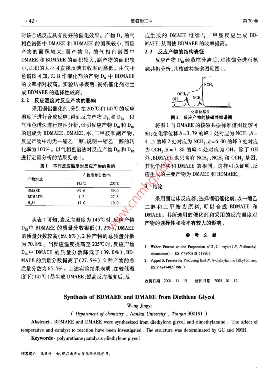 2005年第20卷第1期聚氨酯工業(yè)2005.Vo1.20no.1 POLYURETHANE INDUSTRY·41·技術(shù)交流一縮乙二醇法合成 BDMAEE和 DMAEE王婧(南開大學(xué)化學(xué)學(xué)院天津300191)摘要:以一縮乙二醇和二甲胺為原料合成了催化劑雙(二甲胺基乙基)醚( BDMAEE)和二甲胺基乙氧基乙醇(DMAEE)。實驗研究了催化劑和溫度對反應(yīng)的影響,表征了反應(yīng)產(chǎn)物的化學(xué)結(jié)構(gòu)。關(guān)鍵詞:聚氨酯;催化劑;一縮乙二醇雙(二甲胺基乙基)醚( BDMAEE)和二甲胺基 DMAEE。乙氧基乙醇( DMAEE)是重要的聚氨酯催化劑。一縮乙二醇法具有原料易得價廉、工藝簡單、收 BDMAEE是常用的發(fā)泡型催化劑,具有催化發(fā)泡反率高的優(yōu)點。本實驗對該方法進行了初步研究。應(yīng)活性高、選擇性強的特點,常用于軟質(zhì)大塊泡沫及1實驗部分高回彈泡沫的生產(chǎn)。20世紀(jì)80年代末,國內(nèi)以二甲基乙醇胺為主要原料,開發(fā) BDMAEE的生產(chǎn)技1.1原料和試劑術(shù)并已實現(xiàn)工業(yè)化生產(chǎn)。 DMAEE的催化發(fā)泡反應(yīng)一縮乙二醇,化學(xué)純,鄭州化學(xué)試劑三廠;二甲活性較高,而且氣味低,其分子中含有的一個羥基可胺,工業(yè)級,太原化工廠;氫氣,工業(yè)級;催化劑A,銅以與異氰酸酯反應(yīng),屬非遷移性催化劑,所得低揮發(fā)鎳催化劑,自制;催化劑B,銅鋁催化劑,自制。性聚氨酯制品沒有氣味,常用于汽車內(nèi)飾件硬質(zhì)聚1.2實驗裝置氨酯泡沫和噴涂泡沫的生產(chǎn)。 BDMAEE的合成方固定床反應(yīng)器,反應(yīng)器內(nèi)徑為26mm,高度為法有二胺基乙醚法、二甲基乙醇胺法2和一縮乙1100mm。二醇法等。其中,二甲基乙醇胺法的工藝較成熟1.3反應(yīng)原理一縮乙二醇法是以一縮乙二醇和二甲胺為原料,在一縮乙二醇法合成 BDMAEE和 DMAEE的主催化劑作用下,經(jīng)脫水反應(yīng),合成出 BDMAEE和反應(yīng)為: HOCH,CH,, CH,OH (CH, ); (CH, ) NCH, CH,0CH, CH N( CH)2+(CH) CH, CH,,+副反應(yīng)為: HOCH, CH,OCH, CH+1.4分析儀器mL/min、一縮乙二醇流量為2g/min。收集其反應(yīng)氣相色譜分析采用103型氣相色譜儀,H-NMR產(chǎn)物用氣相色譜儀(GC)進行分析。測定采用X-300T-NMR核磁共振儀。1.5實驗操作2結(jié)果與討論反應(yīng)器通氮氣置換后,加熱升溫至100℃,用2.1催化劑對反應(yīng)的影響N2、H2的混合氣體還原催化劑,同時繼續(xù)升溫至分別采用銅鎳催化劑(A)和銅鋁催化劑(B),205℃;待無水淋出后,繼續(xù)還原30min。連續(xù)加入進行一縮乙二醇法合成反應(yīng)得到產(chǎn)物DA和DB。用一縮乙二醇和二甲胺進行反應(yīng),其反應(yīng)條件為溫度氣相色譜法對其進行定性分析,證明反應(yīng)產(chǎn)物D為205℃、H2流量為60mL/min、二甲胺流量為20和DB中均無一縮乙二醇,由此可見催化劑A和B42聚氨酯工業(yè)第20卷對該合成反應(yīng)具有良好的催化效果。產(chǎn)物DA的氣應(yīng)生成的 DMAEE繼續(xù)與二甲胺反應(yīng)生成BD相色譜圖中 DMAEE和 BDMAEE的面積較小,而副MAEE,從而使 BDMAEE的收率提高。產(chǎn)物的面積較大;而產(chǎn)物DB的氣相色譜圖中2.3反應(yīng)產(chǎn)物的結(jié)構(gòu)表征 DMAEE和 BDMAEE的面積較大,副產(chǎn)物的面積較反應(yīng)產(chǎn)物D經(jīng)蒸餾分離后,對該餾分進行核小,面積的大小可直接反映其收率的高低。由氣相磁共振分析,其核磁共振譜圖見圖1色譜圖可知,以B作催化劑的產(chǎn)物DB中 BDMAEE的收率相對較高。實驗結(jié)果表明,銅鋁催化劑對生 NCH,成 BDMAEE的選擇性較高。 OCH2.2反應(yīng)溫度對反應(yīng)產(chǎn)物的影響 OH NCH2采用銅鋁催化劑,分別在205℃和145℃的反應(yīng)化學(xué)位移溫度下進行合成反應(yīng),得到反應(yīng)產(chǎn)物DB和D。以圖1反應(yīng)產(chǎn)物的核磁共振譜圖氣相色譜法進行定性分析,證明反應(yīng)產(chǎn)物DB和D將圖1與 DMAEE的核磁共振標(biāo)準(zhǔn)譜圖比較可的組成為 BDMAEE、 DMAEE、水、二甲胺和副產(chǎn)物,知:在化學(xué)位移8=3.79的峰1處對應(yīng)為NCH3,8=反應(yīng)產(chǎn)物中均無一縮乙二醇,說明一縮乙二醇的轉(zhuǎn)4.15的峰2處對應(yīng)為NCH2,8=6.00的峰3處對應(yīng)化率為100%以氣相色譜法對反應(yīng)產(chǎn)物DB和D為OCH2,8=7.80的峰4處對應(yīng)為OH。除了OH進行定量分析的結(jié)果見表1。外, BDMAEE也只含有NCH3、NCH2和OCH2基團,表1不同反應(yīng)溫度對反應(yīng)產(chǎn)物的影響其化學(xué)位移和 DMAEE的相同。這樣可以證明,反產(chǎn)物質(zhì)量分?jǐn)?shù)/%應(yīng)生成的主要產(chǎn)物為 DMAEE和 BDMAEE。產(chǎn)物組成145℃205℃3結(jié)論 DMAEE69.639.0 BDMAEE1027.5H20采用固定床反應(yīng)器,選擇銅鋁催化劑,以一縮乙17.19.0二醇和二甲胺為原料,可以合成 BDMAEE和 DMAEE。其所選用的催化劑和采用的反應(yīng)溫度對從表1可知,當(dāng)反應(yīng)溫度為145℃時,反應(yīng)產(chǎn)物產(chǎn)物的選擇性和收率有較大的影響。D中 BDMAEE的質(zhì)量分?jǐn)?shù)很低(1.2%), DMAEE的質(zhì)量分?jǐn)?shù)較高(69.6%),2種產(chǎn)物的總質(zhì)量分?jǐn)?shù)參考文獻為70.8%。當(dāng)反應(yīng)溫度提高至205℃時,反應(yīng)產(chǎn)物 Weber Process on the Preparation ofsDB中 DMAEE的質(zhì)量分?jǐn)?shù)降低了(39.0%)bd-ethanamine).up4940818(1990MAEE的質(zhì)量分?jǐn)?shù)提高了(27.5%),2種產(chǎn)物的總2 Poppel. Process for Producing Bis N-dialkylamino alkyl Ethers質(zhì)量分?jǐn)?shù)為65.5%。上述實驗結(ji