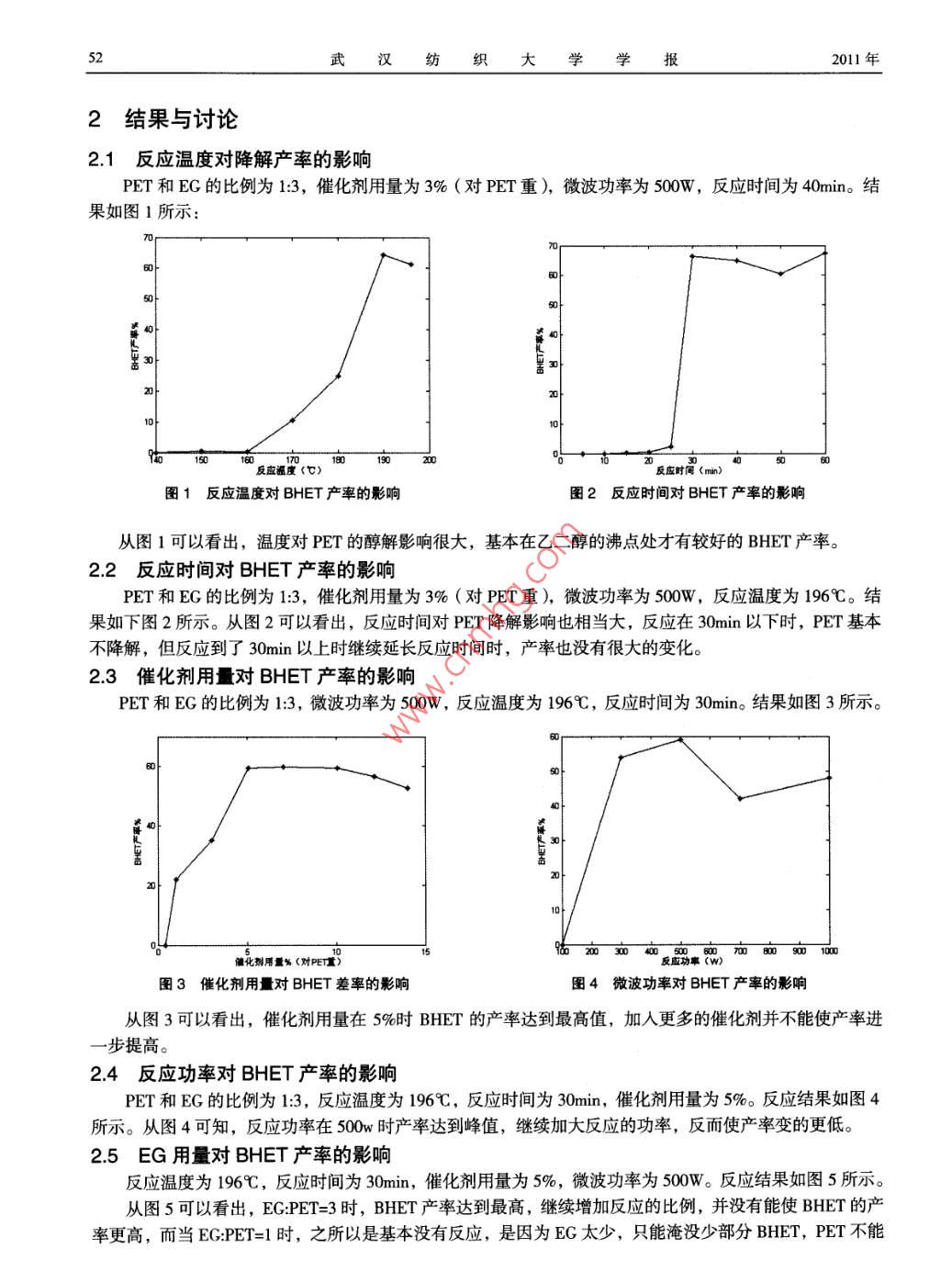 第24卷第6期武漢紡織大學(xué)學(xué)報VoL 24 No 62011年12月JOURNAL OF WUHAN TEXTILE UNIVERSITYDec.2011廢棄PET瓶的微波促乙二醇降解施川,張露露,楊鋒(武漢紡織大學(xué)化學(xué)與化工學(xué)院,湖北武漢430073)摘要:PET做為一種常用的塑料制品,已經(jīng)使用了很多年,在為人類生產(chǎn)生活提供便利的同時也產(chǎn)生了環(huán)境污染。通過徼波降解PET具有效率髙、時間短、產(chǎn)率髙的特點(diǎn),本文通過微波研究乙二醇的降解,并得出最佳反應(yīng)條關(guān)鍵詞:微波;廢棄PET;醇解中圖分類號:TQ3179文獻(xiàn)標(biāo)識碼:A文章編號:1009-51602011)06-0051-04聚對苯二甲酸乙二醇酯(PET)是由對苯二甲酸和乙二醇酯聚合的產(chǎn)物。由于其具有優(yōu)良的性能,廣泛的用于紡織、餐飲、電器等產(chǎn)業(yè)中。由于人們生活水平不斷提高,對PT的需求也越來越大,PET的使用呈逐漸上升的趨勢。截止2005年,全世界的PET中產(chǎn)量達(dá)到了4091kt。我國PET生產(chǎn)能力和產(chǎn)量也大幅度增長,截止2005年已達(dá)到12530kt。PET的應(yīng)用范圍也在逐漸擴(kuò)展,越來越多的取代傳統(tǒng)的玻璃、陶瓷、鋼鐵等材料。廢棄的PET雖說對人體無毒無害,但是其在自然界中降解周期太長,再加上大量的使用,對環(huán)境造成了巨大的破壞和資源浪費(fèi)。廢棄PET的回收和再利用受到重視,一般的都是采取較為簡單的方法:融化后再吹瓶、填埋或者直接燃燒。對廢棄PET的處理化學(xué)方法有明顯的優(yōu)勢。而且比物理方法有經(jīng)濟(jì)上的優(yōu)勢。常用的方法有:水解法、醇解法。但是水解法要求溫度和和壓力比較高,而且一般催化劑都是強(qiáng)酸或者強(qiáng)堿,對環(huán)境會進(jìn)一步污染。醇解法的反應(yīng)條件較水解法溫和,但是現(xiàn)在用乙二醇(EG)降解的產(chǎn)物對本二甲酸乙二醇酯(BHET)難以得到利用,一般都是先經(jīng)過水解生產(chǎn)對苯二甲酸(TPA)再加以利用。1實(shí)驗(yàn)部分11原料及儀器廢棄PET瓶(武漢可口可樂飲料有限公司生產(chǎn)的 Ice dew冰露飲用純凈水瓶),清洗,破碎成1cm*1cm的片狀物,干燥后使用。乙二醇,分析醇,國藥集團(tuán)化學(xué)試劑有限公司醋酸鋅,分析純,國藥集團(tuán)化學(xué)試劑有限公司上海新儀MAS-I微波反應(yīng)器。美國尼高力公司 mpact420傅立葉紅外光譜儀。AGILENT1100高效液相色譜儀。12實(shí)驗(yàn)方法將剪好的PET碎片放入圓底燒瓶中,加入乙二醇及乙酸鋅,開始反應(yīng)。反應(yīng)完后將燒瓶取出,加人沸水,抽濾。將濾液靜置24小時后再過濾,得到BHET的產(chǎn)物。反應(yīng)方程式如下HOCH2CH,OH一HoH2CH2C-oCo一cHCH2H武漢紡織大學(xué)學(xué)報2011年2結(jié)果與討論21反應(yīng)溫度對降解產(chǎn)率的影響PET和EG的比例為13,催化劑用量為3%(對PET重),微波功率為500W,反應(yīng)時間為40min。結(jié)果如圖1所示反應(yīng)祖度(℃)反應(yīng)時間(mn)圖1反應(yīng)溫度對BHET產(chǎn)率的影響圖2反應(yīng)時間對BHET產(chǎn)率的影響從圖1可以看出,溫度對PET的醇解影響很大,基本在乙二醇的沸點(diǎn)處才有較好的BHET產(chǎn)率22反應(yīng)時間對BHET產(chǎn)率的影響PET和EG的比例為13,催化劑用量為3%(對PET重),微波功率為500W,反應(yīng)溫度為196℃。結(jié)果如下圖2所示。從圖2可以看出,反應(yīng)時間對PET降解影響也相當(dāng)大,反應(yīng)在30min以下時,PET基本不降解,但反應(yīng)到了30min以上時繼續(xù)延長反應(yīng)時間時,產(chǎn)率也沒有很大的變化。23催化劑用量對BHET產(chǎn)率的影響PET和EG的比例為1:3,微波功率為500W,反應(yīng)溫度為196℃,反應(yīng)時間為30mn。結(jié)果如圖3所示。催化劑用量%(對P)圖3催化劑用量對BHET差率的影響圖4微波功率對BHET產(chǎn)率的影響從圖3可以看出,催化劑用量在5%時BHET的產(chǎn)率達(dá)到最高值,加入更多的催化劑并不能使產(chǎn)率進(jìn)一步提高。24反應(yīng)功率對BHET產(chǎn)率的影響PET和EG的比例為1:3,反應(yīng)溫度為196℃,反應(yīng)時間為30mn,催化劑用量為5%。反應(yīng)結(jié)果如圖4所示。從圖4可知,反應(yīng)功率在500w時產(chǎn)率達(dá)到峰值,繼續(xù)加大反應(yīng)的功率,反而使產(chǎn)率變的更低。2.5EG用量對BHET產(chǎn)率的影響反應(yīng)溫度為196℃,反應(yīng)時間為30min,催化劑用量為5%,微波功率為500W。反應(yīng)結(jié)果如圖5所示。從圖5可以看出,EG:PET=3時,BHET產(chǎn)率達(dá)到最高,繼續(xù)增加反應(yīng)的比例,并沒有能使BHET的產(chǎn)率更高,而當(dāng)EG:PET=1時,之所以是基本沒有反應(yīng),是因?yàn)镋G太少,只能淹沒少部分BHET,PET不能第6期施川,等:廢棄PET瓶的微波促乙二醇降解和EG接觸發(fā)生反應(yīng)。3反應(yīng)產(chǎn)物的表征3.1紅外光譜紅外光譜如圖6所示。3500EG PETWavenumber(cm圖5EG用量對BHET產(chǎn)率的影響圖6產(chǎn)物的紅外光譜檢測由上圖紅外光譜在330處有一個吸收峰存在M,表面物質(zhì)中可能存在游離的羥基,在1715cm附近的吸收峰,表明有碳氧雙鍵的存在,而在1500cm處存在一個弱的吸收峰,表面苯環(huán)存在,而在1715cm和1300cm附近都有吸收峰存在,表面此物質(zhì)結(jié)構(gòu)中含有酯的結(jié)構(gòu)。32BHET單體含量的測定以及高效液相色譜測定3.21樣品平均摩爾質(zhì)量的求取原理以BHET為例子,端羥基滴定的反應(yīng)基本原理如下(1)HOCH CH2-0-OC-C6H4-C0-0-CH2 CH2 OH +2 CH2 C0-0-C