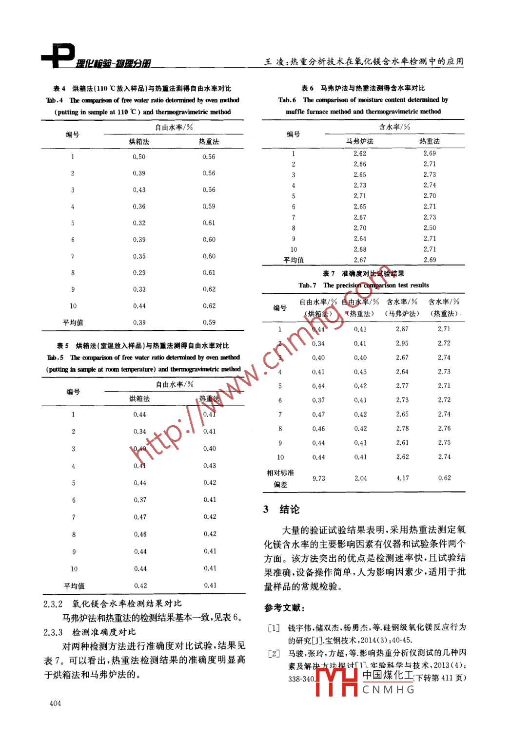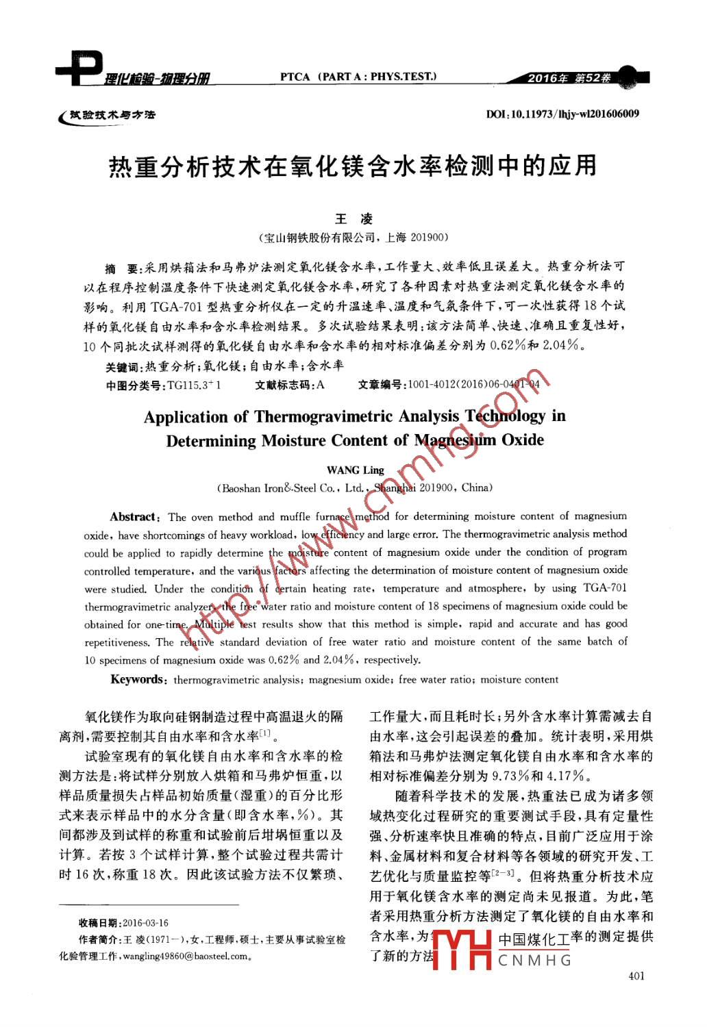 理化酸徹理分皿PTCA (PART A: PHYS.TEST)2016年第52技術(shù)與方ol:10.11973/lhyw201606009熱重分析技術(shù)在氧化鎂含水率檢測中的應(yīng)用王凌(寶山鋼鐵股份有限公司,上海201900摘要:采用烘箱法和馬弗爐法測定氧化鎂含水率,工作量大、效率低且誤差大。熱重分析法可以在程序控制溫度條件下快速測定氧化鎂含水率,研究了各種因素對熱重法測定氧化鎂含水率的影響。利用TGA-701型熱重分析儀在一定的升溫速率、溫度和氣氛條件下,可一次性獲得18個試樣的氧化鎂自由水率和含水率檢測結(jié)釆。多次試驗(yàn)結(jié)果表明:該方法簡單、快速、準(zhǔn)確且重復(fù)性好,10個同批次試樣測得的氧化鎂自由水率和含水率的相對標(biāo)準(zhǔn)偏差分別為0.62%和2.04%關(guān)鍵詞:熱重分析;氧化鎂;自由水率;含水率中圖分類號:TG15.3-1文獻(xiàn)標(biāo)志碼:A文章編號:1001-4012(2016)060401-04Application of Thermogravimetric Analysis Technology inDetermining Moisture Content of Magnesium OxideWANG Ling(Baoshan Iron&Steel Co., Ltd, Shanghai 201900, China)Abstract: The oven method and muffle furnace method for determining moisture content of magnesiumoxide, have shortcomings of heavy workload, low efficiency and large error. The thermogravimetric analysis methodcould be applied to rapidly determine the moisture content of magnesium oxide under the condition of programcontrolled temperature, and the various factors affecting the determination of moisture content of magnesium oxidewere studied. Under the condition of certain heating rate, temperature and atmosphere, by using TGA-701thermogravimetric analyzer. the free water ratio and moisture content of 18 specimens of magnesium oxide could beobtained for one-time. Multiple test results show that this method is simple, rapid and accurate and has goodrepetitiveness. The relative standard deviation of free water ratio and moisture content of the same batch of10 specimens of magnesium oxide was 0.62% and 2.04%, respectively.Keywords: thermogravimetric analysis; magnesium oxide; free water ratio; moisture content氧化鎂作為取向硅鋼制造過程中高溫退火的隔工作量大,而且耗時長;另外含水率計算需減去自離劑,需要控制其自由水率和含水率由水率,這會引起誤差的疊加。統(tǒng)計表明,采用烘試驗(yàn)室現(xiàn)有的氧化鎂自由水率和含水率的檢箱法和馬弗爐法測定氧化鎂自由水率和含水率的測方法是:將試樣分別放入烘箱和馬弗爐恒重,以相對標(biāo)準(zhǔn)偏差分別為9.73%和4.17%。樣品質(zhì)量損失占樣品初始質(zhì)量(濕重)的百分比形隨著科學(xué)技術(shù)的發(fā)展,熱重法已成為諸多領(lǐng)式來表示樣品中的水分含量(即含水率,%)。其域熱變化過程研究的重要測試手段,具有定量性間都涉及到試樣的稱重和試驗(yàn)前后坩堝恒重以及強(qiáng)、分析速率快且準(zhǔn)確的特點(diǎn),目前廣泛應(yīng)用于涂計算。若按3個試樣計算,整個試驗(yàn)過程共需計料、金屬材料和復(fù)合材料等各領(lǐng)域的研究開發(fā)、工時16次,稱重18次。因此該試驗(yàn)方法不僅繁瑣、藝優(yōu)化與質(zhì)量監(jiān)控等2-31。但將熱重分析技術(shù)應(yīng)用于氧化鎂含水率的測定尚未見報道。為此,筆收稿日期:201603-16者采用熱重分析方法測定了氧化鎂的自由水率和作者簡介:王凌(191-)女工程師碩士主要從事試驗(yàn)室檢含水率,為中國煤化工率的測定提供化驗(yàn)管理工作,wangling9860@baosteel.com了新的方HCNMHG401理化驗(yàn)物分皿王凌:熱重分析技術(shù)在氧化鎂含水率檢測中的應(yīng)用2.1.2對流的影響1試驗(yàn)原理與試驗(yàn)方法爐溫的升高會使?fàn)t內(nèi)試樣周圍的氣體各點(diǎn)處的1.1試驗(yàn)原理溫度不均勻,導(dǎo)致較重氣體向下移動,其形成的氣流物質(zhì)受熱蒸發(fā)的“水分”,并不是單純意義上的會沖擊試樣支持器組件,產(chǎn)生表觀增重現(xiàn)象;較輕氣“水”,它包含該固體(液體)物質(zhì)本身或者附著在固體向上移動,其形成的氣流會把試樣支持器向上托,體表面(液體中)所有的揮發(fā)物質(zhì)?!昂嫦浞ā焙汀榜R產(chǎn)生表觀失重現(xiàn)象。弗爐法”,是將樣品烘于(灼燒)前后的質(zhì)量差作為樣可通過選擇爐膛的尺寸和爐內(nèi)氣氛與流量,來品水分含量的分析方法。消除對流的影響。TGA701型熱重分析儀爐膛空釆用熱重分析法測定氧化鎂自由水率和含水間足夠大,有效消除了對流的影響率,是在一定的程序控制溫度下測定氧化鎂樣品(濕2.1.3揮發(fā)物冷凝的影響量)的質(zhì)量隨溫度的變化關(guān)系。該方法與“烘箱法”被檢測物質(zhì)在熱重分析儀中受熱時,逸出的揮及“馬弗爐法”相比,其操作較為簡單。但熱重分析發(fā)物有可能在低溫區(qū)冷凝,會使測定的失重量偏低,法對于程序升溫速率加熱時間、樣品質(zhì)量和氣氛等造成檢測結(jié)果不準(zhǔn)確。設(shè)備參數(shù)的選擇,卻是非常復(fù)雜的。TGA-701型熱重分析儀可消除或減少冷凝的1.2試驗(yàn)方法影響,試樣坩堝完全處在耐熱屏蔽的容器中,水平式使用TGA-701型熱重分析儀進(jìn)行試驗(yàn),試驗(yàn)的熱天平和選擇合適的凈化氣體流量,可將冷凝的用坩堝為剛玉坩堝,載氣為高純氮?dú)?氮?dú)怏w積分?jǐn)?shù)影響降至很小為99.9%)。試驗(yàn)用氧化鎂樣品為硅鋼生產(chǎn)工藝中22試驗(yàn)條件的影響各退火機(jī)組上鋼帶表面的氧化鎂涂層粉末2.2.1自由水率測定溫度的設(shè)定試驗(yàn)過程如下:參照GB/T6284-200