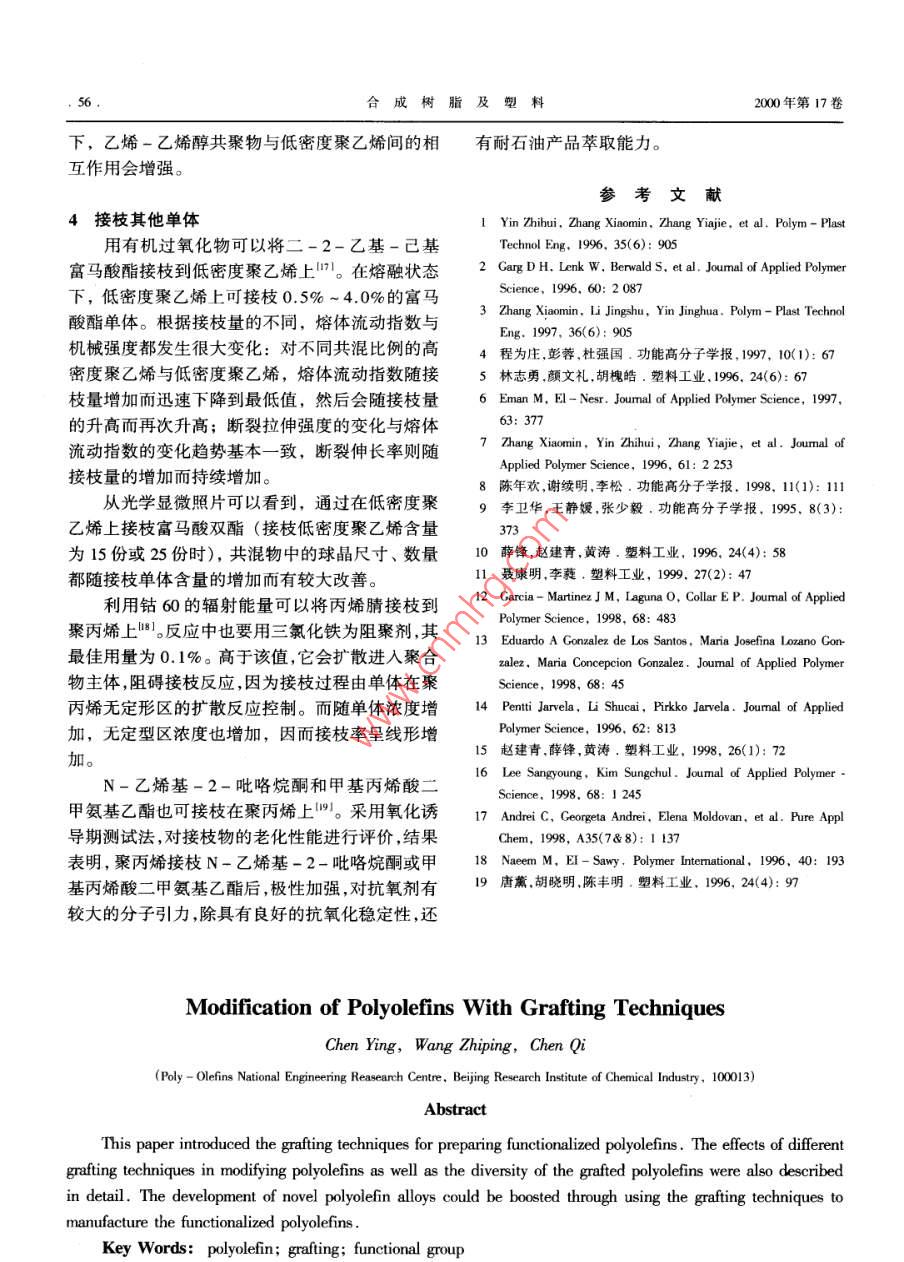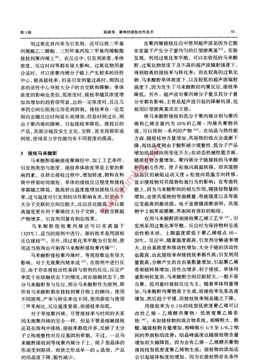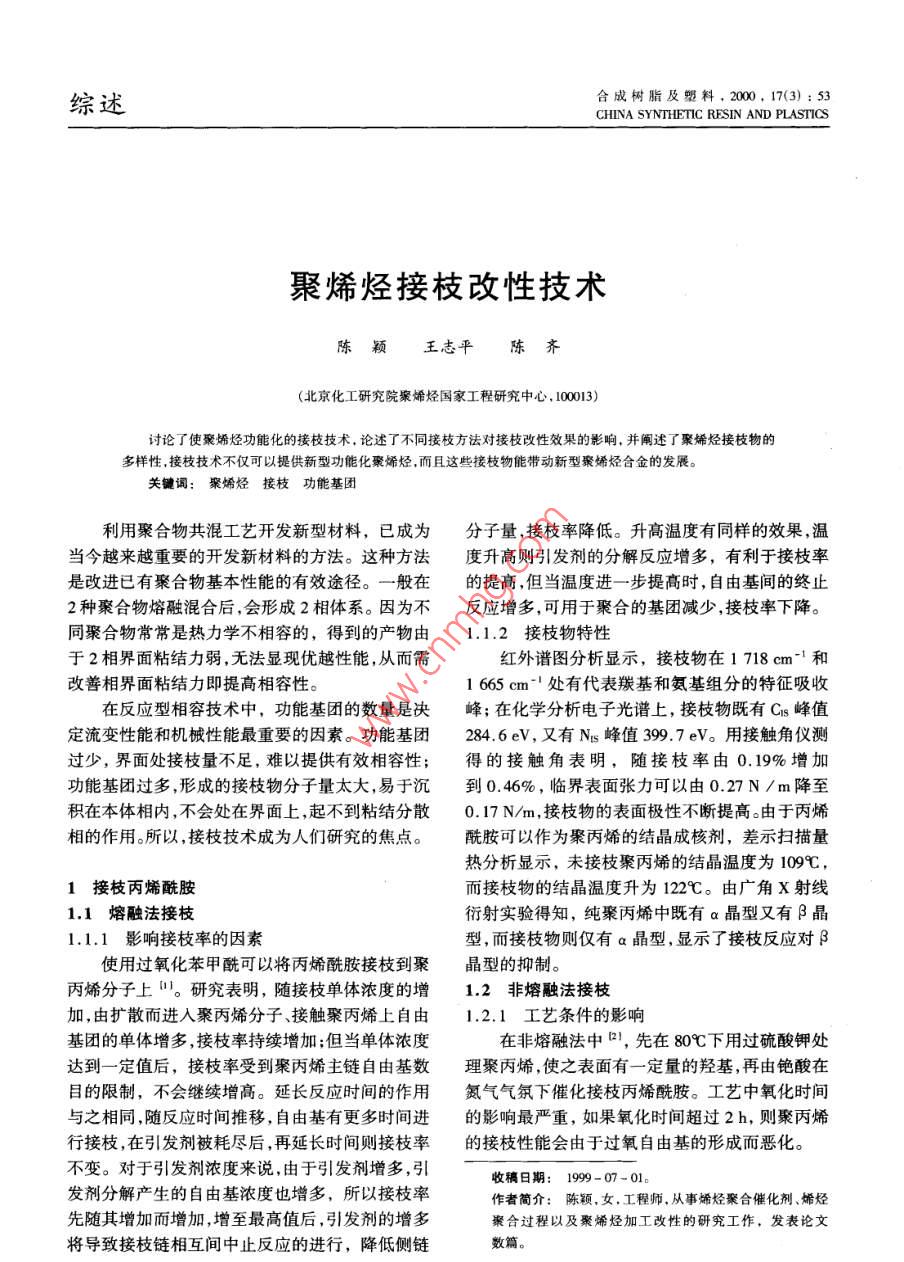 綜述合成樹脂及塑料,2000,17(3) : 53.CHINA SYNHETIC RESIN AND PLASTICS聚烯烴接枝改性技術(shù)陳穎王志平陳齊(北京化工研究院案烯烴國家工程研究中心.10013)討論了使聚烯烴功能化的接枝技術(shù),論述了不同接枝方法對接枝改性效果的影響,并闡述了聚烯烴接枝物的多樣性,接枝技術(shù)不僅可以提供新型功能化聚烯烴,而且這些接枝物能帶動新型聚烯烴合金的發(fā)展。關(guān)鍵詞:聚烯烴接枝功能基團利用聚合物共混工藝開發(fā)新型材料,已成為分子量,接枝率降低。升高溫度有同樣的效果,溫當今越來越重要的開發(fā)新材料的方法。這種方法度升高則引發(fā)劑的分解反應(yīng)增多,有利于接枝率是改進已有聚合物基本性能的有效途徑。- -般在的提高,但當溫度進--步提高時,自由基間的終止2種聚合物熔融混合后,會形成2相體系。因為不反應(yīng)增多,可用于聚合的基團減少,接枝率下降。同聚合物常常是熱力學(xué)不相容的,得到的產(chǎn)物由1.1.2 接枝物特性于2相界面粘結(jié)力弱,無法顯現(xiàn)優(yōu)越性能,從而需紅外譜圖分析顯示,接枝物在1 718 cm-1和改善相界面粘結(jié)力即提高相容性。1665cm-'處有代表羰基和氨基組分的特征吸收在反應(yīng)型相容技術(shù)中,功能基團的數(shù)量是決峰;在化學(xué)分析電子光譜上,接枝物既有Cis峰值定流變性能和機械性能最重要的因素。功能基團284. 6eV,又有Ns峰值399.7 eV。用接觸角儀測過少,界面處接枝量不足,難以提供有效相容性;得 的接觸角表明,隨接枝率由0.19% 增加功能基團過多,形成的接枝物分子量太大,易于沉到0. 46%,臨界表面張力可以由0.27N /m降至積在本體相內(nèi),不會處在界面上,起不到粘結(jié)分散0.17N/m,接枝物的表面極性不斷提高。由于丙烯相的作用。所以,接枝技術(shù)成為人們研究的焦點。酰胺可以作為聚丙烯的結(jié)晶成核劑,差示掃描量熱分析顯示,未接枝聚丙烯的結(jié)晶溫度為109C,1接枝丙烯酰胺而接枝物的結(jié)晶溫度升為122C。由廣角X射線1.1 熔融法接枝衍射實驗得知,純聚丙烯中既有a晶型又有β晶1.1.1 影響接枝率的因素型,而接枝物則僅有a晶型,顯示了接枝反應(yīng)對β使用過氧化苯甲??梢詫⒈0方又Φ骄劬偷囊种?。丙烯分子上"。研究表明,隨接枝單體濃度的增1.2非熔融法接枝加,由擴散而進人聚丙烯分子、接觸聚丙烯上自由1.2.1 工藝條件的影響基團的單體增多,接枝率持續(xù)增加;但當單體濃度在非熔融法中(2), 先在809下用過硫酸鉀處達到- -定值后,接枝率受到聚丙烯主鏈自由基數(shù)理聚丙烯,使之表面有一定量的羥基,再由銫酸在目的限制,不會繼續(xù)增高。延長反應(yīng)時間的作用氮氣氣氛下催化接枝丙烯酰胺。工藝中氧化時間與之相同,隨反應(yīng)時間推移,自由基有更多時間進的影響最嚴重,如果氧化時間超過2 h,則聚丙烯行接枝,在引發(fā)劑被耗盡后,再延長時間則接枝率的接枝性能會由于過氧自由基的形成而惡化。不變。對于引發(fā)劑濃度來說,由于引發(fā)劑增多,引收稿日期: 1999-07- 01。發(fā)劑分解產(chǎn)生的自由基濃度也增多,所以接枝率作者簡介:陳穎, 女,工程師.從事烯烴聚合催化劑、姍烴先隨其增加而增加,增至最高值后,引發(fā)劑的增多聚合過程以及聚烯烴加工改性的研究工作,發(fā)表論文將導(dǎo)致接枝鏈相互間中止反應(yīng)的進行,降低側(cè)鏈數(shù)篇。..54.合成樹脂及塑料2000年第17卷1.2.2接枝物特性率最高可達10%。接枝率隨反應(yīng)溫度升高而升研究表明,未接枝物只有對應(yīng)于Crs的結(jié)合能高。但溫度再升高會導(dǎo)致引發(fā)劑分解速度過快,285.00 eV和少量對應(yīng)于氧的峰值;而對于接枝改自由基濃度增大,分解產(chǎn)生的自由基易發(fā)生轉(zhuǎn)移、性的聚丙烯,既有對應(yīng)于Cis的結(jié)合能,又有對應(yīng),終止等反應(yīng),同時丙烯酸的自聚速度增大,引起接于氧和氮的結(jié)合能Os和Nis,新出現(xiàn)的氮發(fā)射峰枝率下降。引發(fā)劑、單體用量對反應(yīng)的影響與溫應(yīng)為所用氮氣和接枝物產(chǎn)生的。接枝物對應(yīng)Cs度類似,引發(fā)劑、單體量過少,自由基濃度不足,接的發(fā)射峰可以分為幾個部分:有峰值為285. 00 eV枝率低;引發(fā)劑、單體量過多,促進了單體自聚,接的C-一H鍵和C一C鍵;有峰值為286.20eV的枝率也會下降。隨反應(yīng)時間的延長,接枝點增多、C- -0H鍵或分子內(nèi)及分子間C- 0H相互作用生成接枝鏈增長,接枝率也會出現(xiàn)極大值,但過度延長的C- -0 -C鍵;有峰值為287. 64 eV的羰基組分結(jié)時間,因為反應(yīng)物濃度降低,接枝率不會增加。合能;還有峰值為288. 53 eV的酰胺功能基團。采2.2接枝丙烯酸酯用此法的接枝率可達5%,接枝物可以用水濕潤。用丙酮對聚丙烯進行處理后,放人由甲醇、庚接枝物的紅外譜圖分析顯示,在1 559 cm-1處出現(xiàn)烷、甲基丙烯酸甲酯構(gòu)成的溶液中,以三氯化鐵為了羧基基團,在1 664 cm-'處有代表酰胺功能基團阻聚劑,用鈷60進行處理,可以形成接枝聚丙的特征吸收峰。烯l61。在甲醇與庚烷之比為2: 3時,聚丙烯受到溶劑作用溶脹程度最高,并且由于甲醇不易溶解2接枝丙烯酸及丙烯酸酯聚甲基丙烯酸甲酯,還可以加速接枝共聚合過程;2.1接枝丙烯酸在三氯化鐵濃度低于0.02%時,接枝率達最佳在過氧化苯甲酰存在條件下B), 可以將丙烯值,之后則由于均聚反應(yīng),而