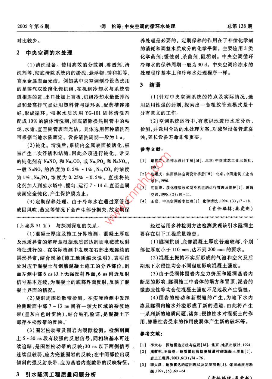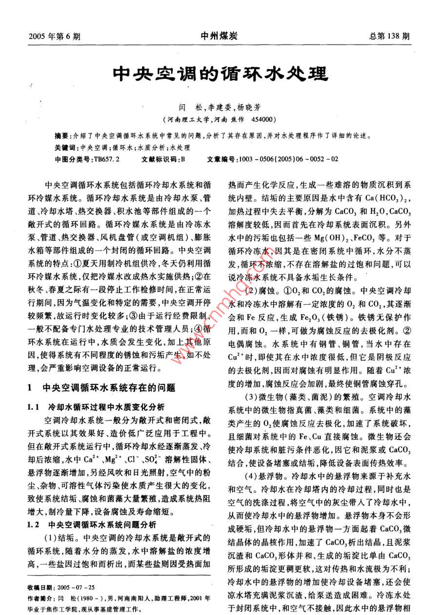 2005年第6期中州煤炭總第138期中央變調(diào)的循環(huán)水處理閆松,李建委,楊曉芳(河南理工大學(xué),河南焦作454000)摘要:介紹了中夾空調(diào)循環(huán)水系統(tǒng)中常見的問題,分析了其存在原因,并對水處理程序作了詳細(xì)的論述關(guān)鍵詞:中央空調(diào);循環(huán)水;水質(zhì)分析;水處理中圖分類號:TB6572文獻(xiàn)標(biāo)識碼:B文章編號:1003-0506(2005)06-0052-02中央空調(diào)循環(huán)水系統(tǒng)包括循環(huán)冷卻水系統(tǒng)和循熱而產(chǎn)生化學(xué)反應(yīng),生成一些難溶的物質(zhì)沉積到系環(huán)冷媒水系統(tǒng)。循環(huán)冷卻水系統(tǒng)是由冷卻水泵、管統(tǒng)內(nèi)壁。結(jié)垢的主要原因是水中含有Ca(HCO3)2,道、冷卻水塔熱交換器、積水池等部件組成的一個(gè)加熱過程中失去平衡,分解為CaCO3和H2O,CaCO敞開式的循環(huán)回路。循環(huán)冷媒水系統(tǒng)是由冷凍水溶解度較低,因而首先在冷卻系統(tǒng)表面沉積。另外泵、管道、熱交換器、風(fēng)機(jī)盤管(或空調(diào)機(jī)組)、膨脹水中的污垢也包括一些Mg(OH)2、FeCO3等。對于水箱等部件組成的一個(gè)封閉的循環(huán)回路。中央空調(diào)循環(huán)冷凍水,因其是在密閉系統(tǒng)中循環(huán),水分不蒸系統(tǒng)的特點(diǎn):①夏天用制冷機(jī)組供冷,冬天仍利用循發(fā),循環(huán)不濃縮,不存在溶解鹽的過飽和問題,可以環(huán)冷媒水系統(tǒng),僅把冷媒水改成熱水實(shí)施供熱;②在說冷凍水系統(tǒng)不具備水垢生長條件。秋冬、春夏之際有一段停止工作檢修時(shí)間,在正常運(yùn)(2)腐蝕。①O2和CO2的腐蝕。中央空調(diào)冷卻行期間,因?yàn)闅鉁刈兓吞囟ǖ男枰?中央空調(diào)開停水和冷凍水中溶解有一定濃度的O2和CO2,其逐漸較頻繁故運(yùn)行時(shí)變化較多;③由于運(yùn)行經(jīng)費(fèi)限制,會和Fe反應(yīng),生成Fe2O3(鐵銹)。鐵銹無保護(hù)作一般不配備專門水處理專業(yè)的技術(shù)管理人員;④循用,而和O2一樣,可做為腐蝕反應(yīng)的去極化劑。②環(huán)水系統(tǒng)在運(yùn)行中,水質(zhì)會發(fā)生變化,加上其他原電偶腐蝕。水系統(tǒng)中有鋼管、銅管,當(dāng)水中存在因使得系統(tǒng)有不同程度的銹蝕和污垢產(chǎn)生如不處Cu2時(shí),即使其在水中濃度很低,但它是陰極反應(yīng)理,會嚴(yán)重影響空調(diào)設(shè)備的正常運(yùn)行。的去極化劑,因而對腐蝕有明顯作用。隨著Cu2濃1中央空調(diào)循環(huán)水系統(tǒng)存在的問題度的增加,腐蝕反應(yīng)會加劇,最終使銅管腐蝕穿孔。(3)微生物(藻類、菌泥)的繁殖??照{(diào)冷卻水1.1冷卻水循環(huán)過程中水質(zhì)變化分析系統(tǒng)中的微生物指真菌、藻類和細(xì)菌。系統(tǒng)中的藻空調(diào)冷卻水系統(tǒng)一般分為敞開式和密閉式敞類產(chǎn)生的O2使腐蝕反應(yīng)去極化,加速了系統(tǒng)破壞,開式系統(tǒng)以其效果好造價(jià)低廣泛應(yīng)用于工程中。且細(xì)菌對系統(tǒng)中的Fe、Cu直接腐蝕。微生物還會但在敞開式系統(tǒng)運(yùn)行中,循環(huán)冷卻水經(jīng)逐漸蒸發(fā)冷使冷卻系統(tǒng)和臟污條件惡化,因它和泥漿或CaCo卻后濃縮,水中Ca、Mg”、C、S0溶解性固體、結(jié)合,使設(shè)備堵塞或結(jié)垢,降低設(shè)備表面?zhèn)鳠嵝?。懸浮物逐漸增加,另經(jīng)風(fēng)吹和日光照射,空氣中的粉(4)懸浮物。冷卻水中的懸浮物來源于補(bǔ)充水塵、雜物、可溶性氣體污染使水質(zhì)產(chǎn)生很大的變化,和空氣。冷卻水在冷卻塔內(nèi)的冷卻過程同時(shí)也是致使系統(tǒng)結(jié)垢腐蝕和菌藻大量繁殖,造成系統(tǒng)熱阻空氣的洗滌過程,將空氣中的灰塵帶入了冷卻水中,增大,制冷量下降,設(shè)備腐蝕及壽命縮短。從而使冷卻水中的懸浮物增加。懸浮物本身不會形1.2中央空調(diào)循環(huán)水系統(tǒng)問題分析成硬垢,但冷卻水中的懸浮物一方面起著CaCO3微(1)結(jié)垢。中央空調(diào)的冷卻水系統(tǒng)是敞開式的結(jié)晶體的晶核作用,加速了CaCO3析出結(jié)晶,且泥漿循環(huán)系統(tǒng),隨著水分的蒸發(fā),水中溶解鹽的濃度增沉渣和CaCO3形體并和,生成的垢淀比單由CaCO高,一些鹽因過飽和而析出,而某些鹽則因受熱面加所形成的垢淀更稠更軟,這對傳熱和水流極為不利收稿日期:2005-07-25冷卻水中的懸浮物的增加使冷卻設(shè)備堵塞,還會使作者簡介:閆松(1980-),男,河南南陽人,助理工程師,200年涼水塔充滿泥漿沉渣,給泵送造成困難。冷凍水處畢業(yè)于焦作工學(xué)院,現(xiàn)從事基建管理工作于封閉系統(tǒng)中,和空氣不接觸,因此水中的懸浮物相2005年第6期閆松等:中央空調(diào)的循環(huán)水處理總第138期對比較少。養(yǎng)處理是必要的。定期保養(yǎng)的作用在于補(bǔ)償化學(xué)劑2中央空調(diào)的水處理的消耗和調(diào)整水質(zhì)成分的化學(xué)平衡。主要位用3類化學(xué)藥劑:緩蝕劑、殺菌劑、阻垢劑。中央空調(diào)循環(huán)(1)清洗設(shè)備。使用高效的分散劑滲透劑、清冷卻水的保養(yǎng)周期一般為30d。中央空調(diào)冷凍水的洗劑等,徹底清除系統(tǒng)內(nèi)的淤泥懸浮物銹和垢等,處理程序基本上和冷卻水處理程序一樣直至金屬表面光潔。例如某中央空調(diào)制冷設(shè)備選用的是蒸汽雙效溴化鋰機(jī)組,在機(jī)組冷卻水與系統(tǒng