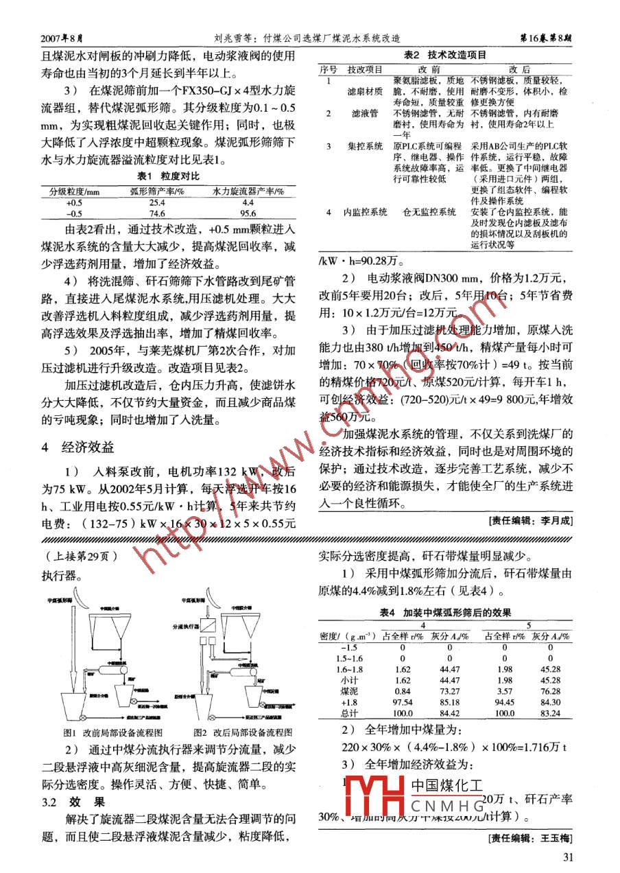 煤總第94期付煤公司選煤廠煤泥水系統(tǒng)改造劉兆雪,徐偉同,袁季文,邵珠華(棗礦集團(tuán)付村煤業(yè)公司,山東微山277605)摘要:介紹付煤公司選煤廠煤泥水系統(tǒng)。通過(guò)技術(shù)改造,有效解決了原系統(tǒng)存在的問(wèn)題,提高了原煤處理能力,取得了良好的社會(huì)效益和經(jīng)濟(jì)效益。關(guān)鍵詞:煤泥水管路堵塞;技術(shù)改造;經(jīng)濟(jì)效益中圖分類(lèi)號(hào): TD946.21文獻(xiàn)標(biāo)識(shí)碼: B文章編號(hào): 1005 - 2798 ( 2007 ) 08 - 0030- 02付煤公司選煤廠,2001年投產(chǎn),原設(shè)計(jì)能力癱瘓, 嚴(yán)重制約生產(chǎn)。120萬(wàn)t。2005年, 由粗精煤重介改為原煤全重介系2)因漿液閥閘板開(kāi)度小, 管內(nèi)壓力大,煤泥.統(tǒng),人洗能力達(dá)240萬(wàn)t。采用跳汰一浮選和重介- -顆粒流速加快,閘板的直口處被顆粒沖刷磨損,浮浮選聯(lián)合流程。選后產(chǎn)品主要有: 1*精煤,灰分選人料流量得不到控制,使精礦池液位升高,浮選As<8%,為優(yōu)質(zhì)煉焦煤,供本省及南方各大鋼廠、焦被迫停車(chē);等精礦池液位下降浮選才能開(kāi)車(chē)?;瘡S等,還遠(yuǎn)銷(xiāo)日本、韓國(guó)等。3)煤泥水 系統(tǒng)內(nèi)超顆粒原因是:煤泥弧形篩篩孔是0.75 mm,經(jīng)長(zhǎng)時(shí)間磨損,篩孔增大;同1煤泥水 系統(tǒng)存在的問(wèn)題時(shí),洗混篩、矸石篩篩板漏料,隨篩下水直接進(jìn)入1)煤泥水系統(tǒng)采用濃縮浮選, 浮選人料管路煤泥濃縮機(jī)內(nèi)。是D425 mm的鋼管,經(jīng)常發(fā)生煤泥堵塞現(xiàn)象,造成對(duì)洗混篩、矸石篩篩下物取樣進(jìn)行篩分試驗(yàn)和煤泥水系統(tǒng)癱瘓,嚴(yán)重制約生產(chǎn)?;曳只?yàn)。發(fā)現(xiàn),對(duì)于洗混篩下物,粒度>0.5 mm2)電 動(dòng)漿液閥閘板磨損嚴(yán)重,每3個(gè)月需更占3.2%,其灰分29.35%;矸石篩 下物,粒度>0.5 mm換一次。占4.12%,灰分49.35%,二者都為高灰物質(zhì)。進(jìn)入3)浮選人料中+0.5 mm物料占30%以上。浮選系統(tǒng)后,對(duì)管道、浮選機(jī)葉輪及定子磨損嚴(yán)4)加壓過(guò)濾機(jī)電氣設(shè)備配置較低,機(jī)械故障重,同時(shí)也影響浮選人料的礦化效果。率高,倉(cāng)內(nèi)壓力低,濾餅水分較高;濾餅脫落率較4)加壓過(guò)濾機(jī)采用聚氨脂濾板,質(zhì)地脆,不低,處理能力低。耐磨,質(zhì)量較重。濾液管采用不銹鋼濾管,使用壽5)空氣壓縮機(jī)的壓力低,且故障率較高。命僅一年。因?yàn)V板不耐磨,長(zhǎng)時(shí)間使用出現(xiàn)較大孔洞,對(duì)濾布損害大,造成嚴(yán)重跑風(fēng);又因?yàn)V液管固2原因分析定在主軸上,磨漏后不易發(fā)現(xiàn),也造成嚴(yán)重跑風(fēng)。1)浮選人料泵是: 200Lz- -700、 Q=512 m'/h,5) L5.5- -55/4.5型空氣壓縮機(jī)為曲柄連桿機(jī)H=47.5m,電機(jī)P=132 kW。浮選機(jī)為XJX- -TA12構(gòu),兩級(jí)壓縮,壓縮空氣壓力低,閥件損壞率高。型,兩組,每組小時(shí)處理煤泥水能力為360 m',而加3改造方案及效果壓過(guò)濾機(jī)處理精礦(按300 g/L計(jì)算)能力為77.37m'。開(kāi)兩臺(tái)浮選機(jī),按泵的最大流量512 m'/h、1)首 先考慮煤泥水人料泵的揚(yáng)程及流量選浮選抽出率75%計(jì),浮出的精礦量為512 m'/hx擇。 浮選機(jī)在主廠房標(biāo)高17.8 m處。根據(jù)加壓過(guò)濾0.75=384 m'h。這與加壓過(guò)濾機(jī)的處理能力相差太機(jī)的浮選機(jī)處理能力計(jì)算,2002年, 將人料泵改造大。因此,為保證浮出的煤泥量與排出的干煤泥量100LZ- -45J型,流量180 m'/h,揚(yáng)程39 m,電機(jī)功率相平衡,浮選司機(jī)只能靠關(guān)小浮選人料閥門(mén)來(lái)控制75 kW。經(jīng)過(guò)幾年使用,人料管路從沒(méi)有發(fā)生堵塞浮出的精礦量。由于泵的揚(yáng)程為47.5 m,閥門(mén)被關(guān)現(xiàn)象,且浮選也達(dá)到最佳效果。小后,管道內(nèi)壓力增高,部分顆粒沉積于管道底中國(guó)煤化工變,使管道內(nèi)壓力層,煤泥水管路漸漸被煤泥堵塞,造成煤泥水系統(tǒng)大大MHCNMHG度也可隨意調(diào)節(jié),收稿日期: 2007-07-1630作者簡(jiǎn)介:劉兆雪(1968-),男,山東成武人,工程師,現(xiàn)在選煤廠從事技術(shù)管理工作。2007年8月劉兆雪等:付煤公司選煤廠煤泥水系統(tǒng)改造第16寒第8期且煤泥水對(duì)閘板的沖刷力降低,電動(dòng)漿液閥的使用表2技術(shù)改造項(xiàng)目壽命也由當(dāng)初的3個(gè)月延長(zhǎng)到半年以上。序號(hào)技改項(xiàng)目改前改后聚氨脂濾板,質(zhì)地不銹鋼濾板,質(zhì)量較輕,3) 在煤泥篩前加一-個(gè)FX350- -CJ x 4型水力旋濾扇材質(zhì)脆, 不耐磨,使用耐磨不變形,體積小,檢壽命短,質(zhì)量較重修更換方便流器組,替代煤泥弧形篩。其分級(jí)粒度為0.1 ~ 0.5濾液管不銹鋼濾管, 無(wú)耐不銹鋼濾管,內(nèi)有耐磨mm,為實(shí)現(xiàn)粗煤泥回收起關(guān)鍵作用;同時(shí),也極磨村,使用壽命為村, 使用壽命2年以上大降低了入浮濃度中超顆粒現(xiàn)象。煤泥弧形篩篩下3 集控系統(tǒng)原PIC系統(tǒng)可編程 采用AB公司生產(chǎn)的PLC軟水與水力旋流器溢流粒度對(duì)比見(jiàn)表1。序、繼電器、操作件系統(tǒng),運(yùn)行平穩(wěn),故障系統(tǒng)故障率高,運(yùn)率低。更換了中間繼電器表1 粒度對(duì)比行可靠性較低(采用進(jìn)口元件)兩組,分級(jí)粒度/mm弧形篩產(chǎn)率/% .水力旋流器產(chǎn)率/%更換了組態(tài)軟