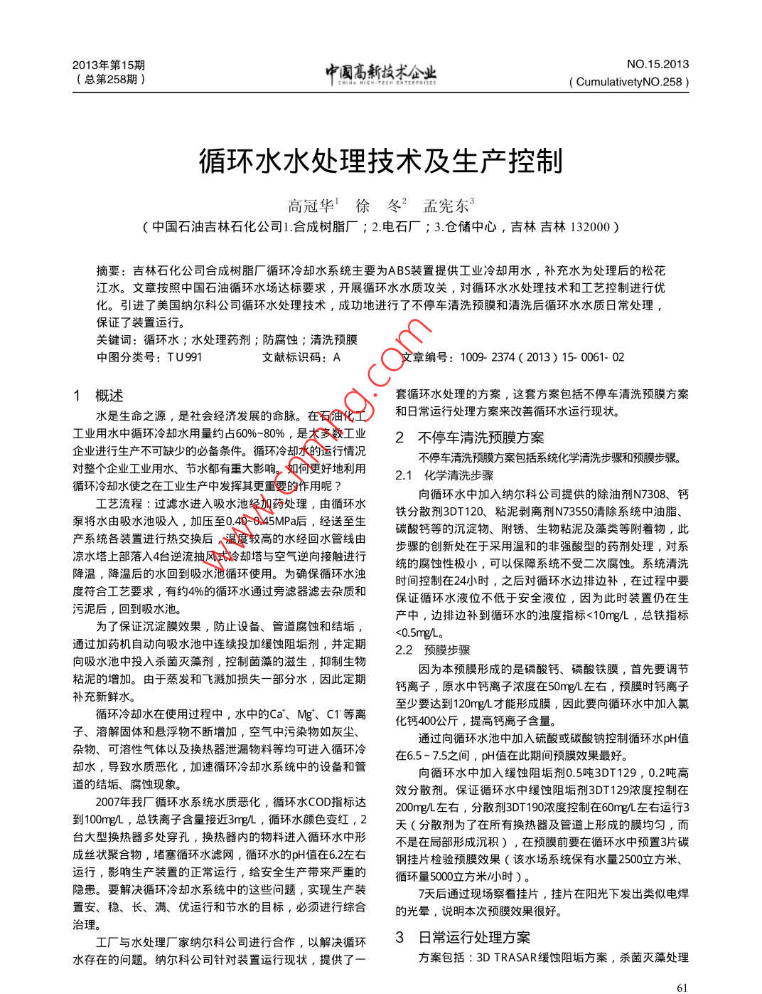 NO.15.20132013年第15期中國(guó)高新技術(shù)企業(yè)( CumulativetyNO.258 )(總第258期)循環(huán)水水處理技術(shù)及生產(chǎn)控制高冠華'徐冬2孟憲東(中國(guó)石油吉林石化公司1.合成樹(shù)脂廠;2電石廠;3.倉(cāng)儲(chǔ)中心,吉林吉林132000)摘要:吉林石化公司合成樹(shù)脂廠循環(huán)冷卻水系統(tǒng)主要為ABS裝置提供工業(yè)冷卻用水,補(bǔ)充水為處理后的松花江水。文章按照中國(guó)石油循環(huán)水場(chǎng)達(dá)標(biāo)要求,開(kāi)展循環(huán)水水質(zhì)攻關(guān),對(duì)循環(huán)水水處理技術(shù)和工藝控制進(jìn)行優(yōu)化。引進(jìn)了美國(guó)納爾科公司循環(huán)水處理技術(shù),成功地進(jìn)行了不停車清洗預(yù)膜和清洗后循環(huán)水水質(zhì)日常處理,保證了裝置運(yùn)行。關(guān)鍵詞:循環(huán)水;水處理藥劑;防腐蝕;清洗預(yù)膜中圖分類號(hào): TU991文獻(xiàn)標(biāo)識(shí)碼: A文章編號(hào): 1009- 2374( 2013) 15- 0061- 02套循環(huán)水處理的方案,這套方案包括不停車清洗預(yù)膜方案1概述水是生命之源,是社會(huì)經(jīng)濟(jì)發(fā)展的命脈。在石油化工和日常運(yùn)行處理方案來(lái)改善循環(huán)水運(yùn)行現(xiàn)狀。工業(yè)用水中循環(huán)冷卻水用量約占60%- 80%6 ,是大多數(shù)工業(yè)2不停車清洗預(yù)膜方案企業(yè)進(jìn)行生產(chǎn)不可缺少的必備條件。循環(huán)冷卻水的運(yùn)行情況不停車清洗預(yù)膜方案包括系統(tǒng)化學(xué)清洗步驟和預(yù)膜步驟。對(duì)整個(gè)企業(yè)工業(yè)用水、節(jié)水都有重大影響。如何更好地利用2.1 化學(xué)清洗步驟循環(huán)冷卻水使之在工業(yè)生產(chǎn)中發(fā)揮其更重要的作用呢?向循環(huán)水中加入納爾科公司提供的除油劑N7308、鈣工藝流程:過(guò)濾水進(jìn)入吸水池經(jīng)加藥處理,由循環(huán)水鐵分散劑3DT120、粘泥剝離劑N73550清除系統(tǒng)中油脂、泵將水由吸水池吸入,加壓至0.40-0.45MPa后,經(jīng)送至生碳酸鈣等的沉淀物、附銹、生物粘泥及藻類等附著物,此產(chǎn)系統(tǒng)各裝置進(jìn)行熱交換后,溫度較高的水經(jīng)回水管線由步驟的創(chuàng)新處在于采用溫和的非強(qiáng)酸型的藥劑處理, 對(duì)系涼水塔上部落入4臺(tái)逆流抽風(fēng)式冷卻塔與空氣逆向接觸進(jìn)行統(tǒng)的腐蝕性極小,可以保障系統(tǒng)不受二次腐蝕。系統(tǒng)清洗降溫,降溫后的水回到吸水池循環(huán)使用。為確保循環(huán)水濁時(shí)間控制在24小時(shí),之后對(duì)循環(huán)水邊排邊補(bǔ),在過(guò)程中要度符合工藝要求,有約4%的循環(huán)水通過(guò)旁濾器濾去雜質(zhì)和保證循環(huán)水液位不低于安全液位,因?yàn)榇藭r(shí)裝置仍在生污泥后,回到吸水池。產(chǎn)中,邊排邊補(bǔ)到循環(huán)水的濁度指標(biāo)<10mg/L ,總鐵指標(biāo)為了保證沉淀膜效果,防止設(shè)備、管道腐蝕和結(jié)垢,<0.5mg/L。通過(guò)加藥機(jī)自動(dòng)向吸水池中連續(xù)投加緩蝕阻垢劑,并定期2.2預(yù)膜步驟向吸水池中投入殺菌滅藻劑,控制菌藻的滋生,抑制生物因?yàn)楸绢A(yù)膜形成的是磷酸鈣、磷酸鐵膜,首先要調(diào)節(jié)粘泥的增加。由于蒸發(fā)和飛濺加損失一部分水 ,因此定期鈣離子,原水中鈣離子濃度在50mg/L左右,預(yù)膜時(shí)鈣離子補(bǔ)充新鮮水。循環(huán)冷卻水在使用過(guò)程中,水中的Ca*、Mg、 C1等離至少要達(dá)到120mg/才能形成膜,因此要向循環(huán)水中加入氯化鈣400公斤,提高鈣離子含量。子、 溶解固體和懸浮物不斷增加,空氣中污染物如灰塵、通過(guò)向循環(huán)水池中加入硫酸或碳酸鈉控制循環(huán)水pH值雜物、可溶性氣體以及換熱器泄漏物料等均可進(jìn)入循環(huán)冷在6.5~ 7.5之間, pH值在此期間預(yù)膜效果最好。卻水,導(dǎo)致水質(zhì)惡化,加速循環(huán)冷卻水系統(tǒng)中的設(shè)備和管向循環(huán)水中加入緩蝕阻垢劑0.5噸3DT129 , 0.2噸高道的結(jié)垢、腐蝕現(xiàn)象。效分散劑。保證循環(huán)水中緩蝕阻垢劑3DT129濃度控制在2007年我廠循環(huán)水系統(tǒng)水質(zhì)惡化,循環(huán)水COD指標(biāo)達(dá)200mg/L左右,分散劑3DT190濃度控制在60mg/L左右運(yùn)行3到100mg/L ,總鐵離子含量接近3mg/L ,循環(huán)水顏色變紅,2天(分散劑為了在所有換熱器及管道上形成的膜均勻,而臺(tái)大型換熱器多處穿孔,換熱器內(nèi)的物料進(jìn)入循環(huán)水中形不是在局部形成沉積) ,在預(yù)膜前要在循環(huán)水中預(yù)置3片碳成絲狀聚合物,堵塞循環(huán)水濾網(wǎng),循環(huán)水的pH值在6.2左右鋼掛片檢驗(yàn)預(yù)膜效果(該水場(chǎng)系統(tǒng)保有水量2500立方米、運(yùn)行,影響生產(chǎn)裝置的正常運(yùn)行,給安全生產(chǎn)帶來(lái)嚴(yán)重的循環(huán)量5000立方米/小時(shí))。.隱患。要解決循環(huán)冷卻水系統(tǒng)中的這些問(wèn)題,實(shí)現(xiàn)生產(chǎn)裝7天后通過(guò)現(xiàn)場(chǎng)察看掛片,掛片在陽(yáng)光下發(fā)出類似電焊置安、穩(wěn)、長(zhǎng)、滿、優(yōu)運(yùn)行和節(jié)水的目標(biāo),必須進(jìn)行綜合的光暈,說(shuō)明本次預(yù)膜效果很好。治理。工廠與水處理廠家納爾科公司進(jìn)行合作,以解決循環(huán)3日常運(yùn)行處理方案水存在的問(wèn)題。納爾科公司針對(duì)裝置運(yùn)行現(xiàn)狀,提供了