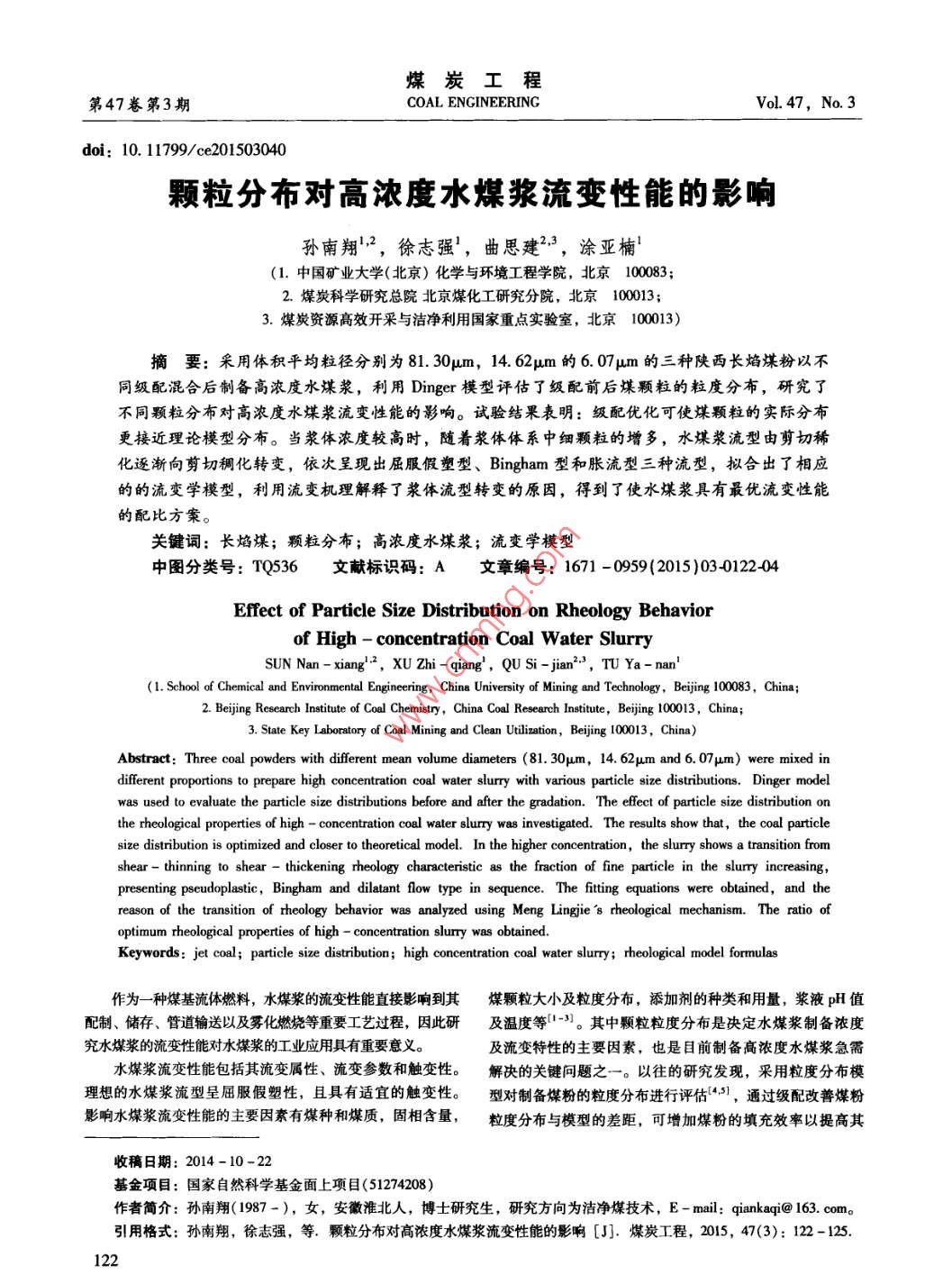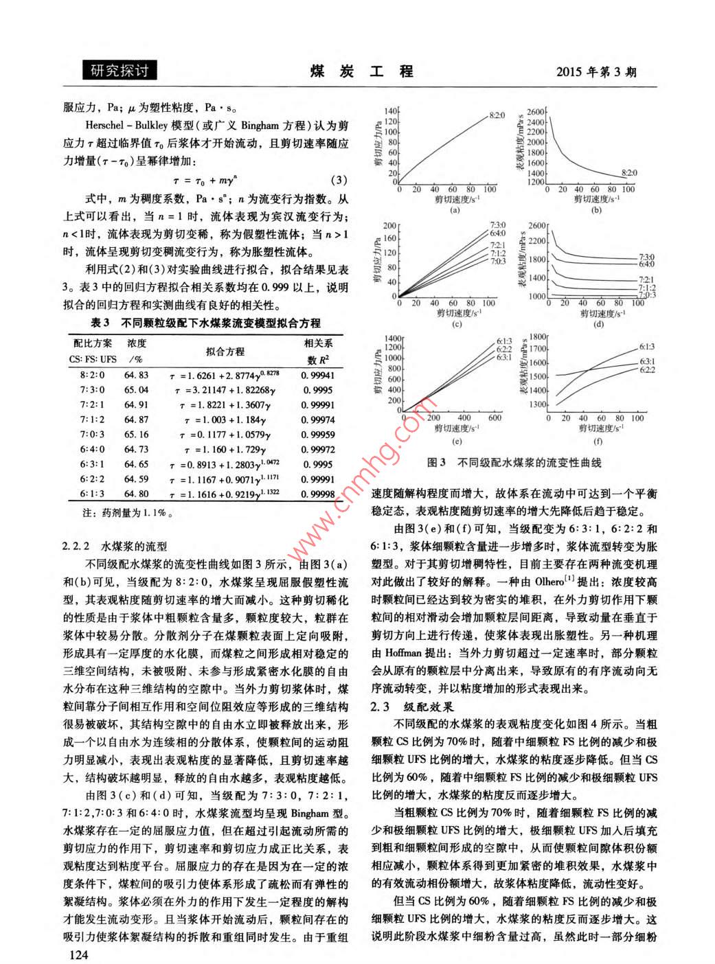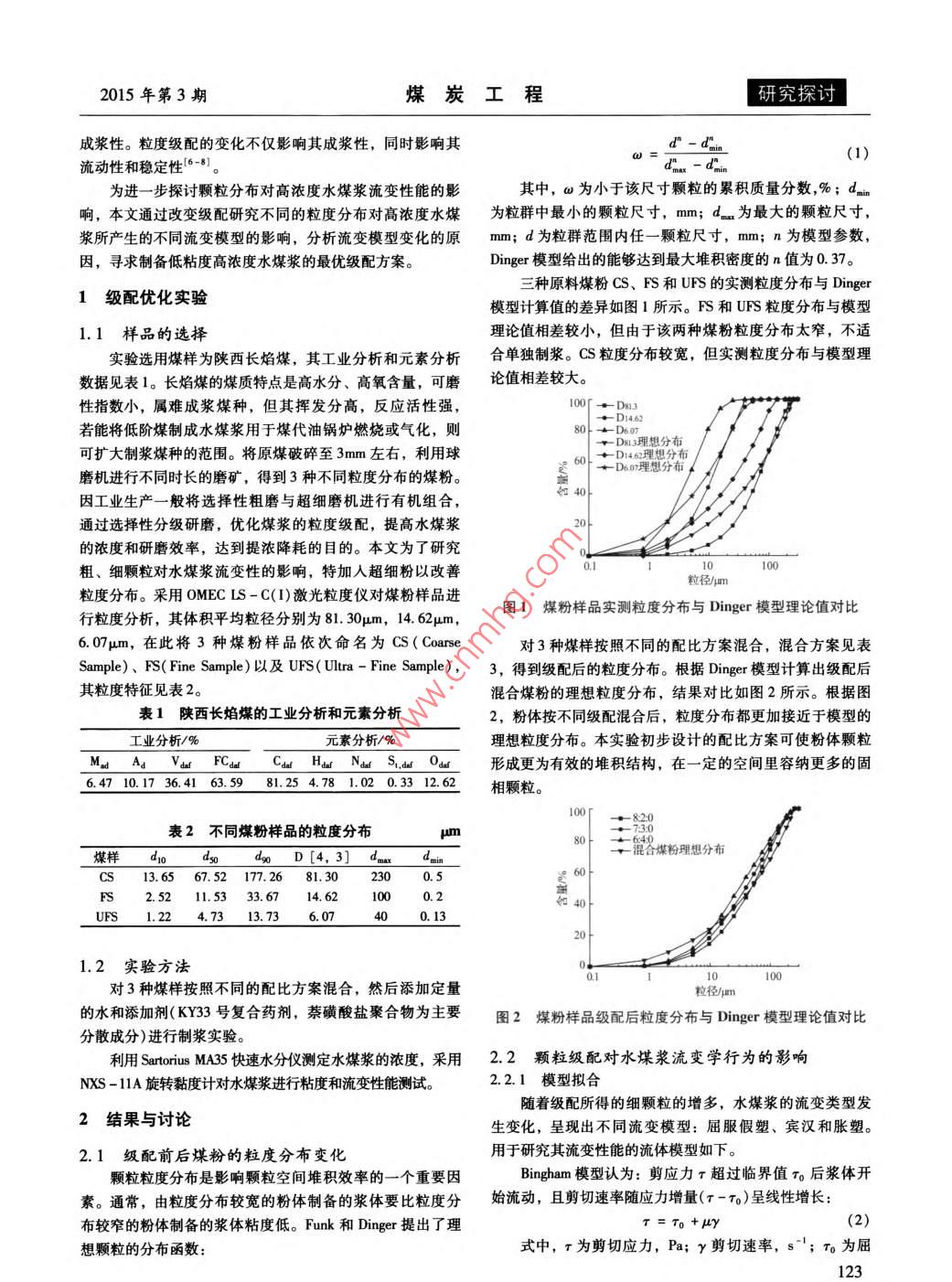 煤炭工程第47卷第3期COAL ENGINEERINGVol. 47. No. 3doi:10.11799/ce201503040顆粒分布對高濃度水煤漿流變性能的影響孫南翔2,徐志強',曲思建2,涂亞楠(1.中國礦業(yè)大學(北京)化學與環(huán)境工程學院,北京100083;2.煤炭科學研究總院北京煤化工研究分院,北京100013;3.煤炭資源高效開采與潔凈利用國家重點實驗室,北京100013)摘要:采用體積平均粒徑分別為81.30μm,14.62μm的6.07m的三種陜西長焰煤粉以不同級配混合后制備高濃度水煤漿,利用 Dinger模型評估了級配前后煤顆粒的粒度分布,研究了不同顆粒分布對高濃度水煤漿流變性能的影響。試驗結(jié)果表明:級配優(yōu)化可使煤顆粒的實際分布更接近理論模型分布。當漿體濃度較高時,隨著漿體體系中細顆粒的增多,水煤漿流型由剪切稀化逐漸向剪切稠化轉(zhuǎn)變,依次呈現(xiàn)出屈服假塑型、 Bingham型和脹流型三種流型,擬合出了相應(yīng)的的流變學模型,利用流變杋理解釋了漿體流型轉(zhuǎn)變的原因,得到了使水煤漿具有最優(yōu)流變性能的配比方案。關(guān)鍵詞:長焰煤;顆粒分布;高濃度水煤漿;流變學模型中圖分類號:TQ536文獻標識碼:A文章編號:1671-0959(2015)03012204Effect of Particle Size distribution on rheology Behaviorof High-concentration Coal Water SlurrySUN Nan-xiang, XU Zhi-qiang, QU Si-jian", TU Ya-nan(1. School of Chemical and Environmental Engineering, China University of Mining and Technology, Beijing 100083, China2. Beijing Research Institute of Coal Chemistry, China Coal Research Institute, Beijing 100013, China;3. State Key Laboratory of Coal Mining and Clean Utilization, Beijing 100013, China)Abstract: Three coal powders with different mean volume diameters(81 30um, 14. 62um and 6. 07um) were mixed indifferent proportions to prepare high concentration coal water slurry with various particle size distributions. Dinger modelwas used to evaluate the particle size distributions before and after the gradation. The effect of particle size distributionthe rheological properties of high-concentration coal water slurry was investigated. The results show that, the coal particlesize distribution is optimized and closer to theoretical model. In the higher concentration, the slurry shows a transition fromshear-thinning to shear -thickening rheology characteristic as the fraction of fine particle in the slurry increasingpresenting pseudoplastic, Bingham and dilatant flow type in sequence. The fitting equations were obtained, and thereason of the transition of theology behavior was analyzed using Meng Lingiie's rheological mechanism. The ratio ofoptimum rheological properties of high-concentration slurry was obtained.Keywords: jet coal; particle size distribution; high concentration coal water slurry; rheological model formulas作為一種煤基流體燃料,水煤漿的流變性能直接影響到其煤顆粒大小及粒度分布,添加劑的種類和用量,漿液pH值配制、儲存、管道輸送以及霧化燃燒等重要工藝過程,因此研及溫度等-3。其中顆粒粒度分布是決定水煤漿制備濃度究水煤漿的流變性能對水煤漿的工業(yè)應(yīng)用具有重要意義。及流變特性的主要因素,也是目前制備高濃度水煤漿急需水煤漿流變性能包括其流變屬性、流變參數(shù)和觸變性。解決的關(guān)鍵問題之一。以往的研究發(fā)現(xiàn),采用粒度分布模理想的水煤漿流型呈屈服假塑性,且具有適宜的觸變性。型對制備煤粉的粒度分布進行評估,通過級配改善煤粉影響水煤漿流變性能的主要因素有煤種和煤質(zhì),固相含量,粒度分布與模型的差距,可增加煤粉的填充效率以提高其收稿日期:2014-10-22基金項目:國家自然科學基金面上項目(51274208)作者簡介:孫南翔(1987-),女,安徽淮北人,博士研究生,研究方向為潔凈煤技術(shù),E-ml:qiankaqic@163.com。引用格式:孫南翔,徐志強,等.顆粒分布對高濃度水煤漿流變性能的影響[J].煤炭工程,2015,47(3)122015年第3期煤炭工程研究探討成漿性。粒度級配的變化不僅影響其成漿性,同時影響其流動性和穩(wěn)定性681。(1)為進一步探討顆粒分布對高濃度水煤漿流變性能的影其中,ω為小于該尺寸顆粒的累積質(zhì)量分數(shù),%;dn響,本文通過改變級配研究不同的粒度分布對高濃度水煤為粒群中最小的顆粒尺寸,mm;d為最大的顆粒尺寸,漿所產(chǎn)生的不同流變模型的影響,分析流變模型變化的原mm;d為粒群范圍內(nèi)任一顆粒尺寸,mm;n為模型參數(shù),因,尋求制備低粘度高濃度水煤漿的最優(yōu)級配方案。Dinger模型給出的能夠達到最大堆積密度的n值為0.37。三種原料煤粉CS、FS和UFS的實測粒度分布與Dng1級配優(yōu)化實驗?zāi)P陀嬎阒档牟町惾鐖D1所示。FS和UFS粒度分布與模型1.1樣品的選擇理論值相差較小,但由于該兩種煤粉粒度分布太窄,不適實驗選用煤樣為陜西長焰煤,其工業(yè)分析和元素分析合單獨制漿。CS粒度分布較寬,但實測粒度分布與模型理數(shù)據(jù)見表1。長焰煤的煤質(zhì)特點是高水分、高氧含量,可磨論值相差較大性指數(shù)小,屬難成漿煤種,但其揮發(fā)分高,反應(yīng)活性強若能將低階煤制成水煤漿用于煤代油鍋爐燃燒或氣化,則80D607D8理想分布可擴大制漿煤種的范圍。將原煤破碎至3mm左右,利用球→D1462理想分布+D607理想分布磨機進行不同時長的磨礦,得到3種不同粒度分布的煤粉因工業(yè)生產(chǎn)一般將選擇性粗磨與超細磨機進行有機組合,通過選擇性分級研磨,優(yōu)化煤漿的粒度級配,提高水煤漿的濃度和研磨效率,達到提濃降耗的目的。本文為了研究粗、細顆粒對水煤漿流變性